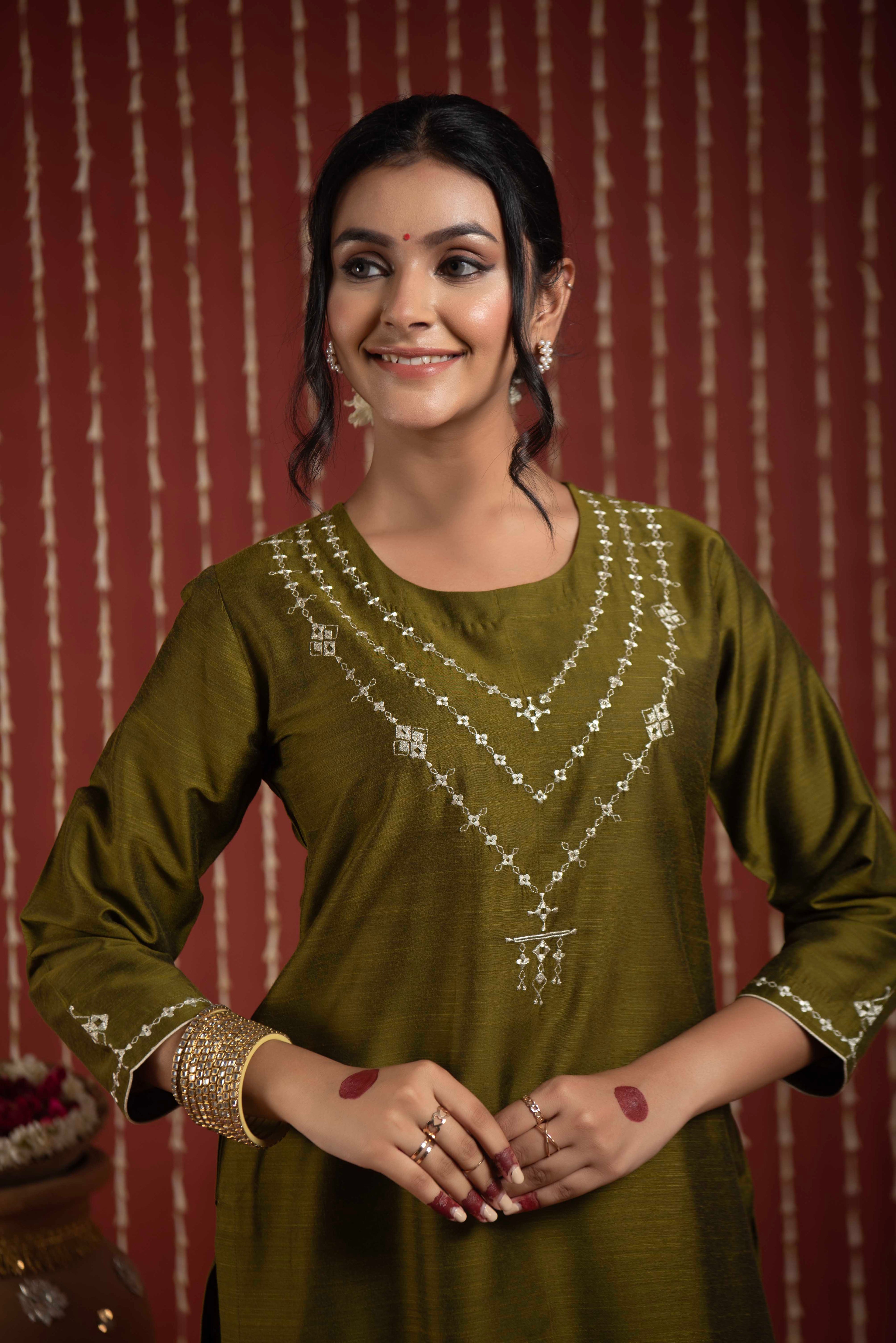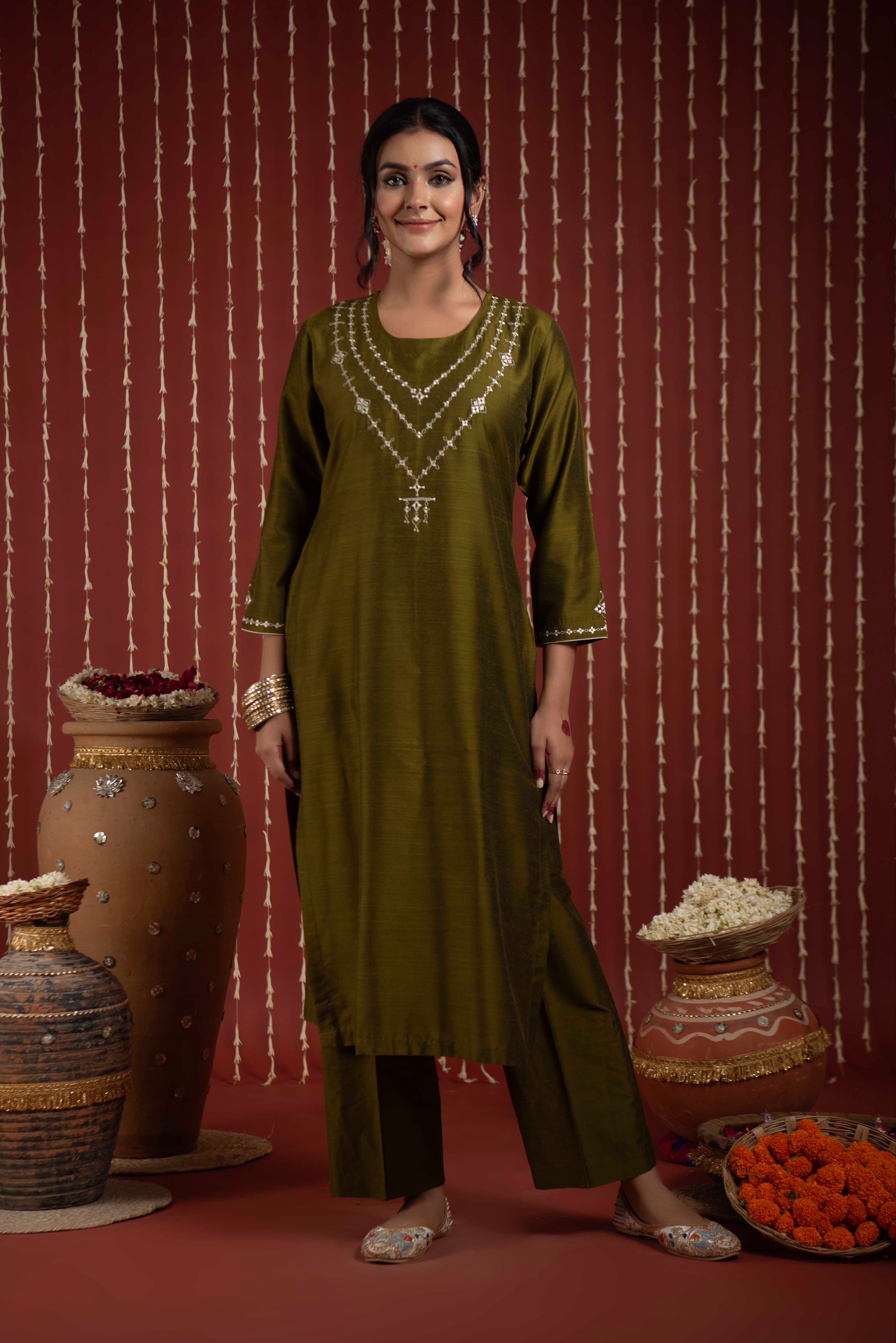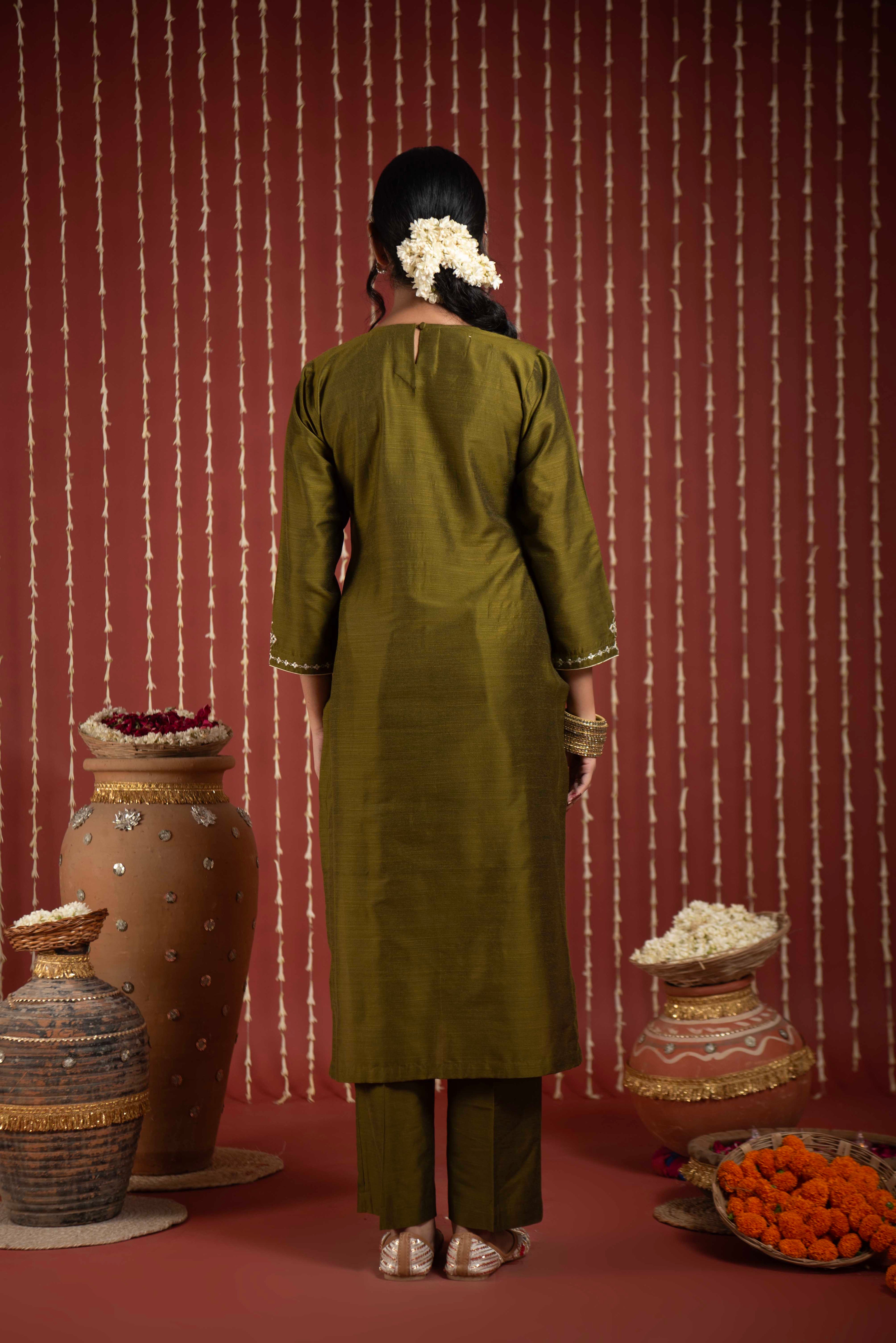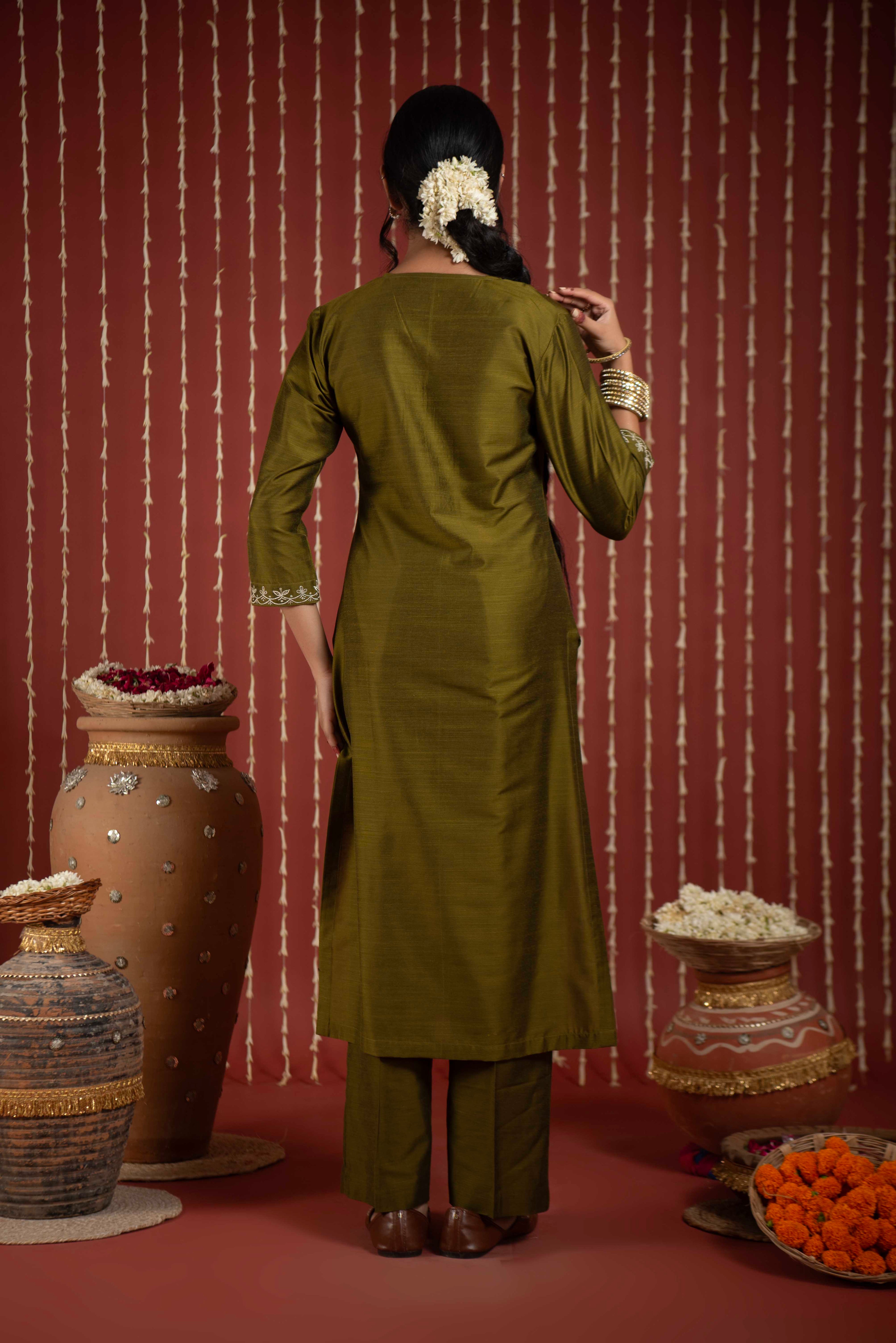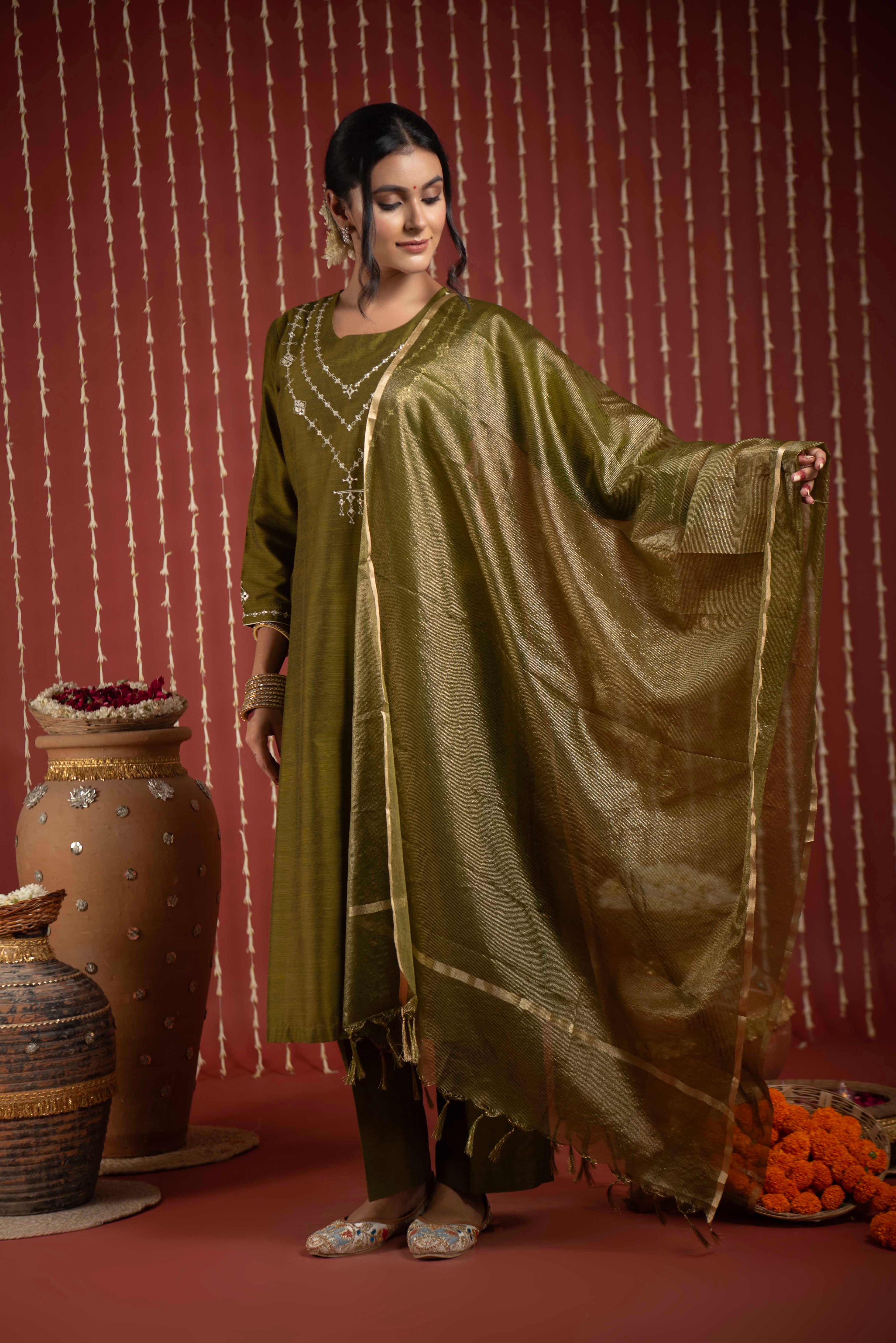 Green Cotton Silk Zari Work A-Line Kurta Set Regular Fit