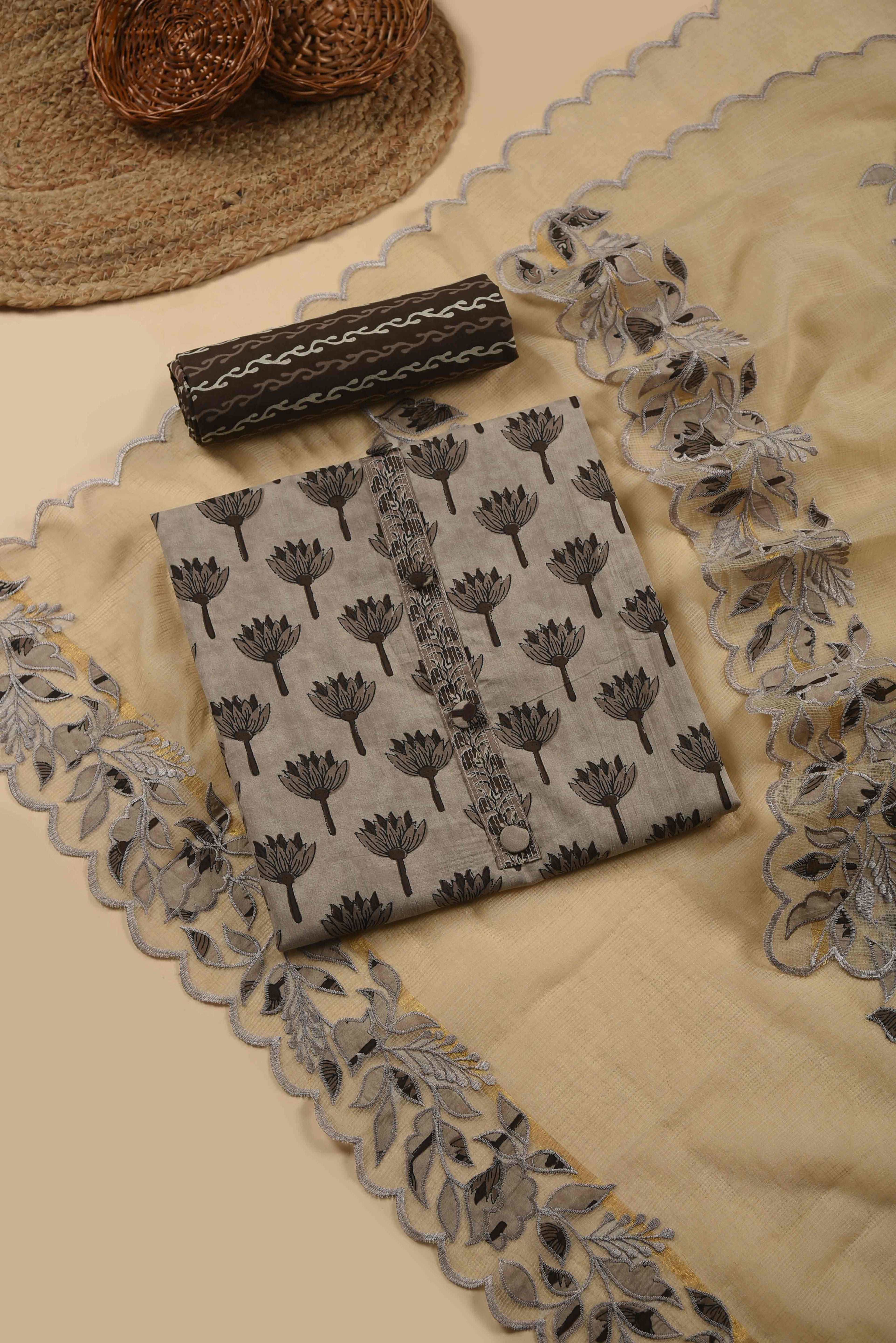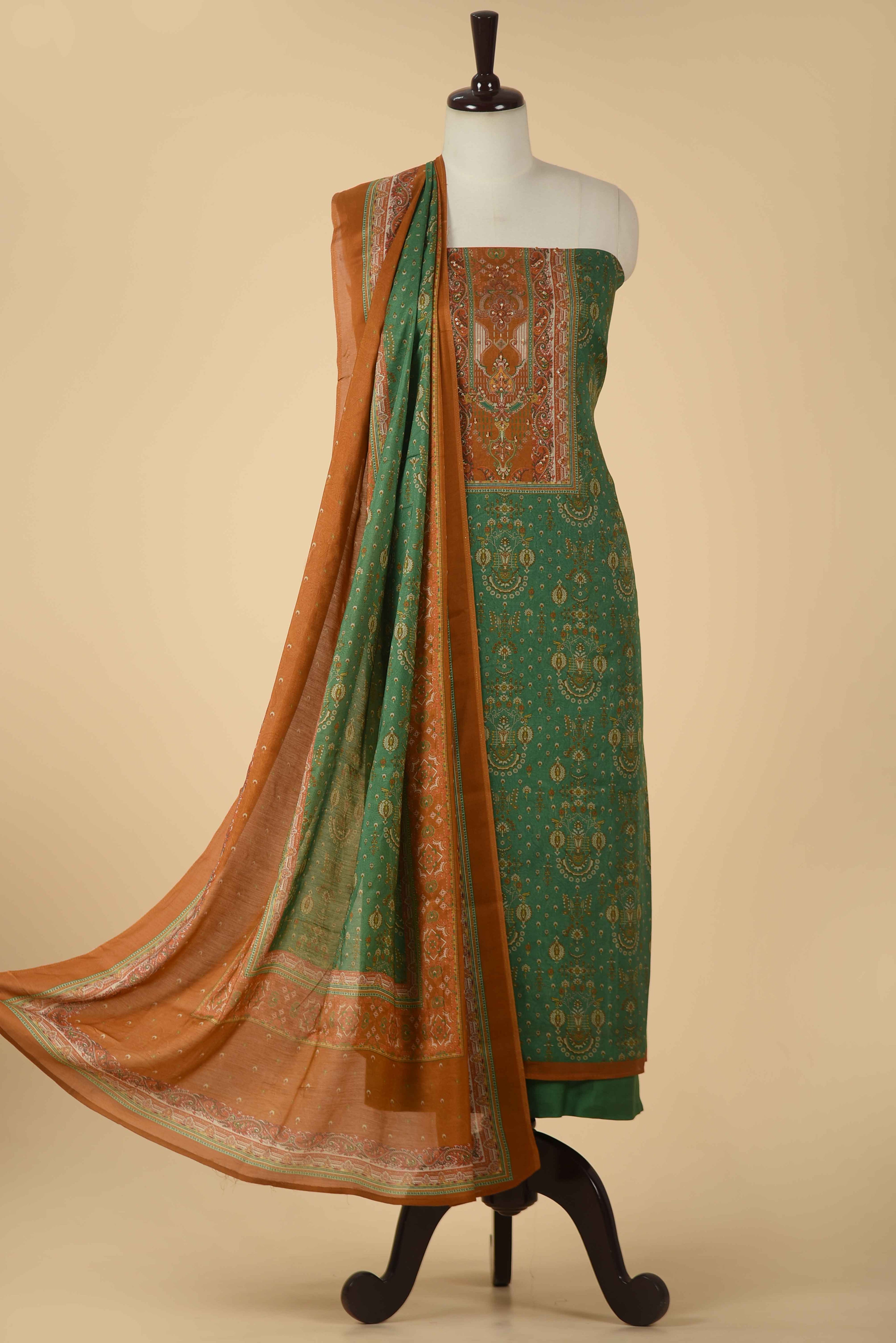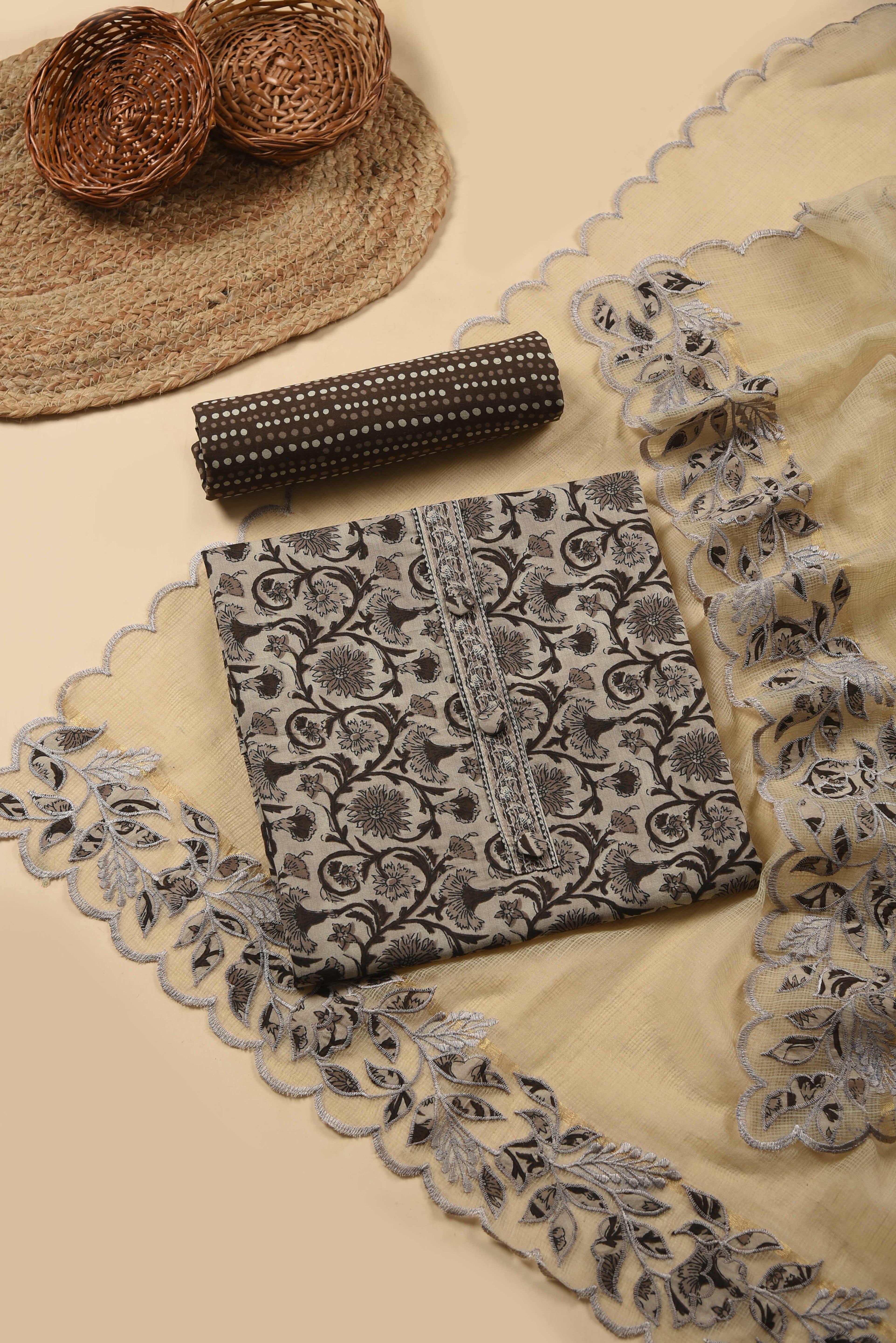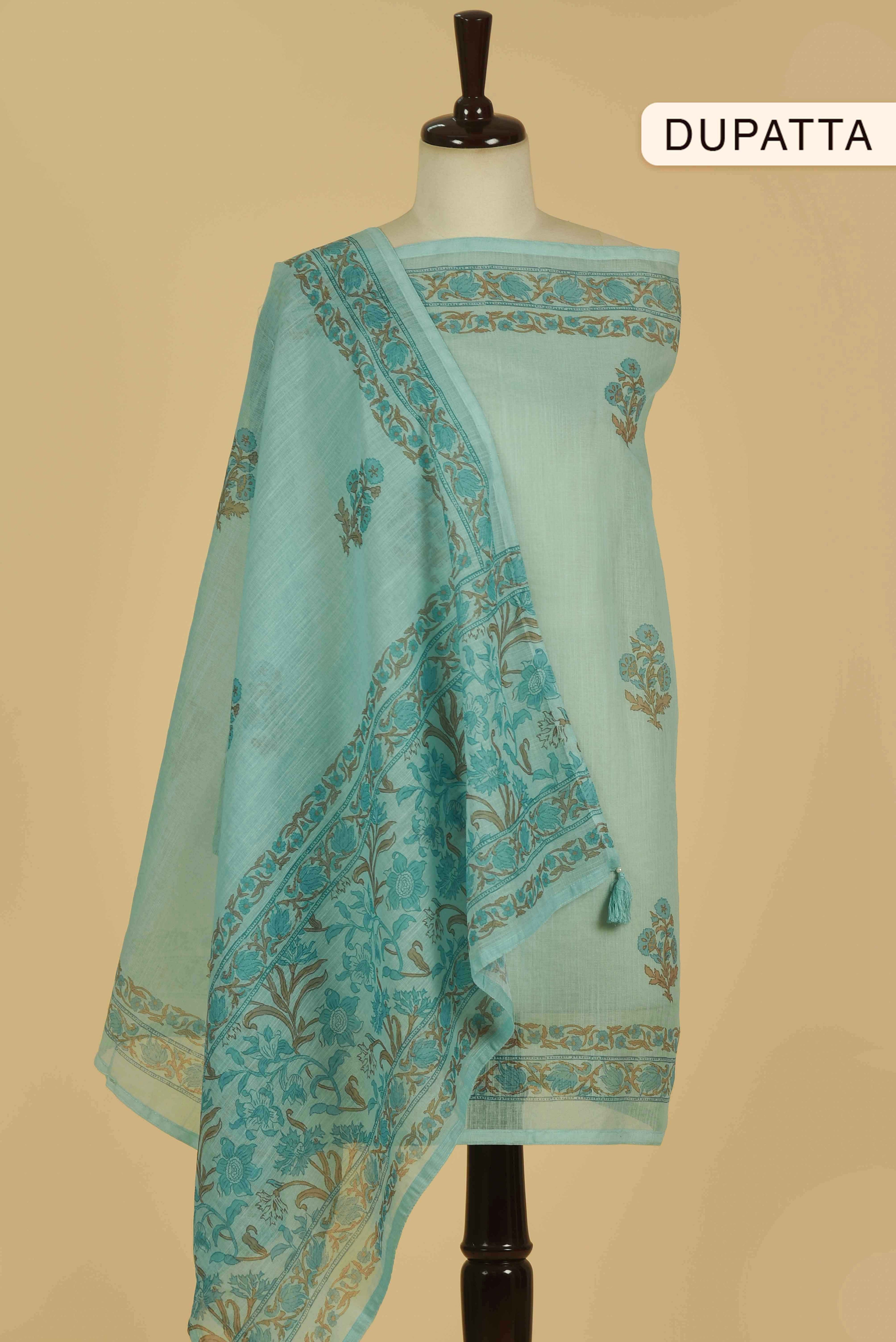 Black With Green Kota Hand Block Printed Unstitched Suit Fabric Set With Kota Hand Block Printed Dupatta