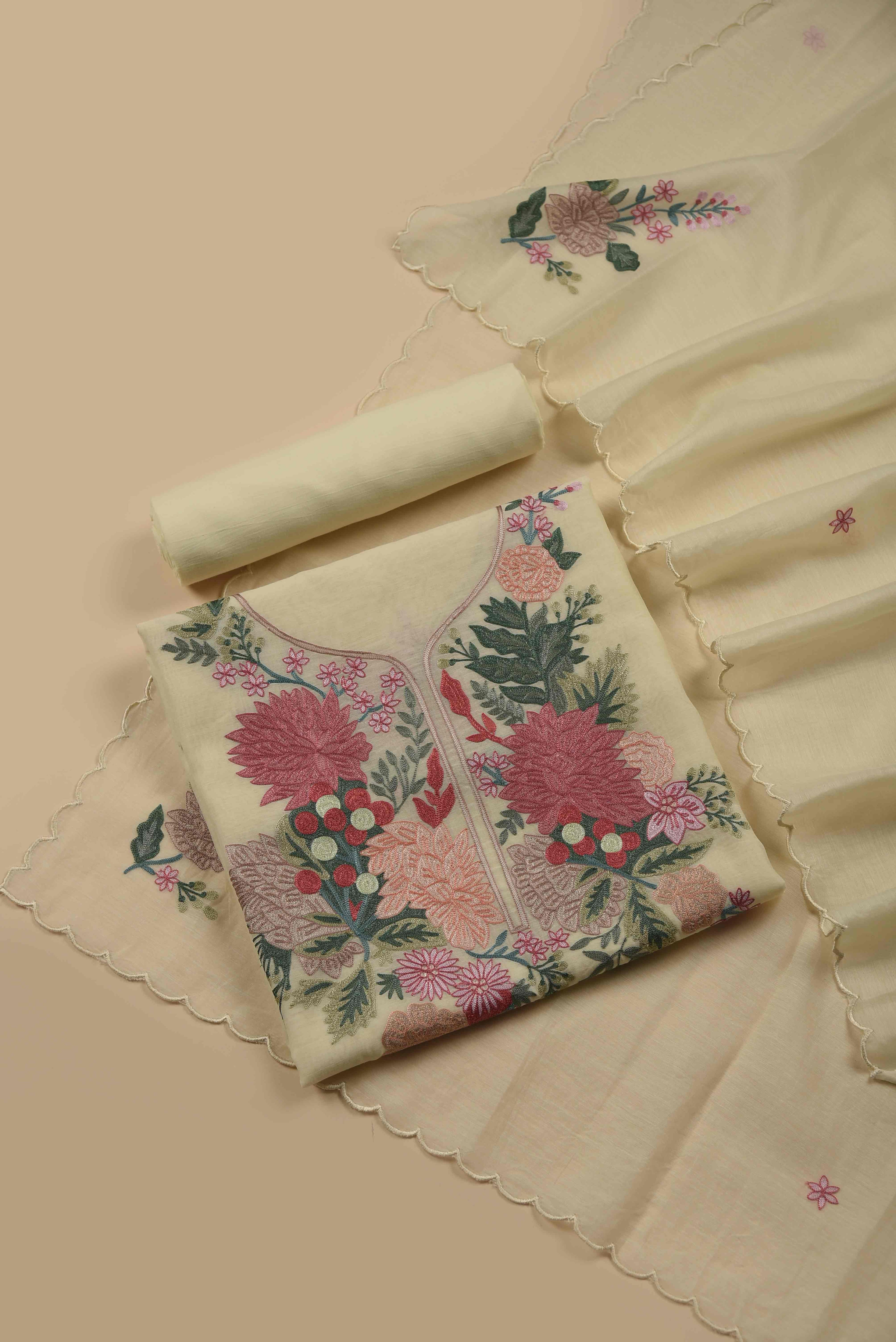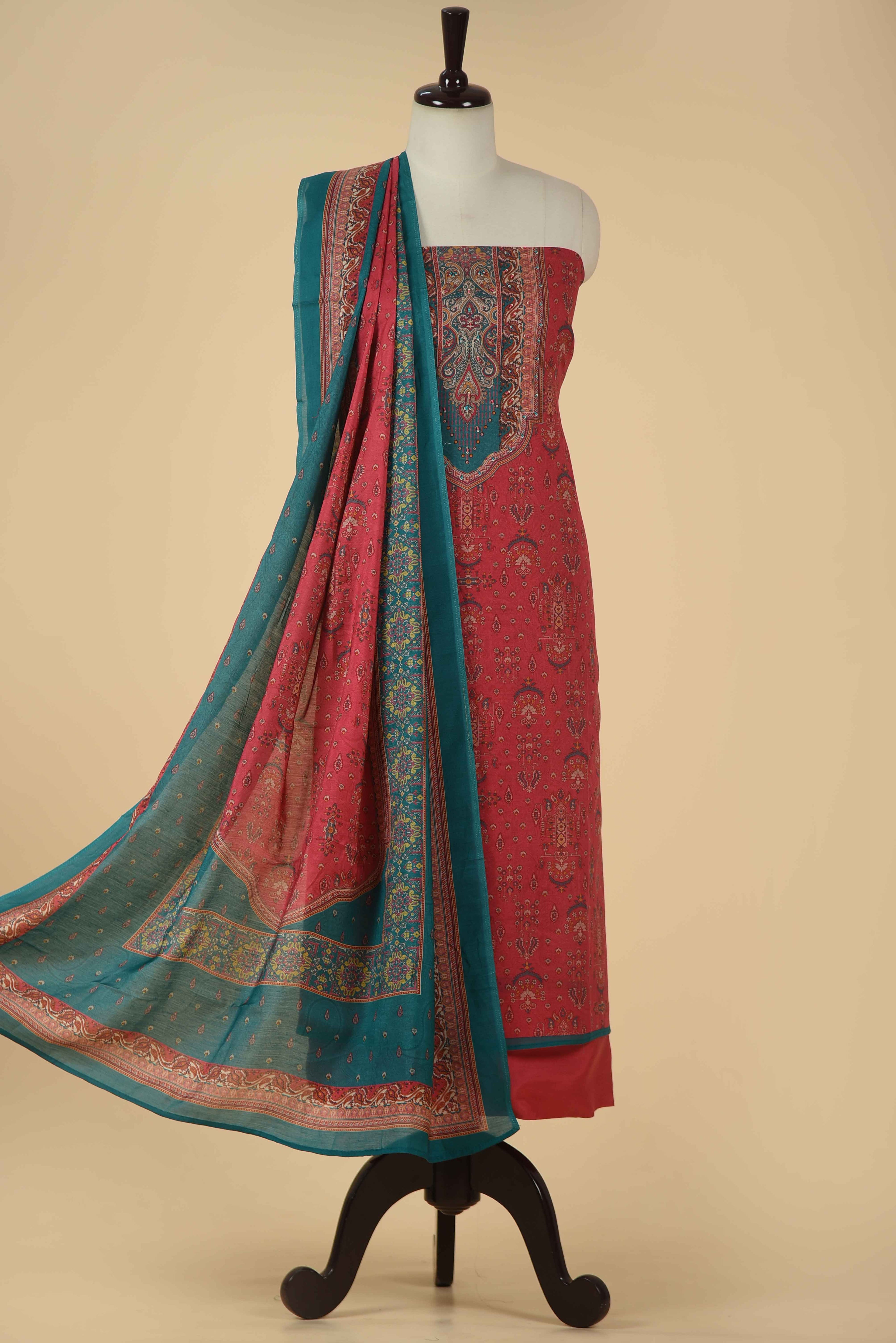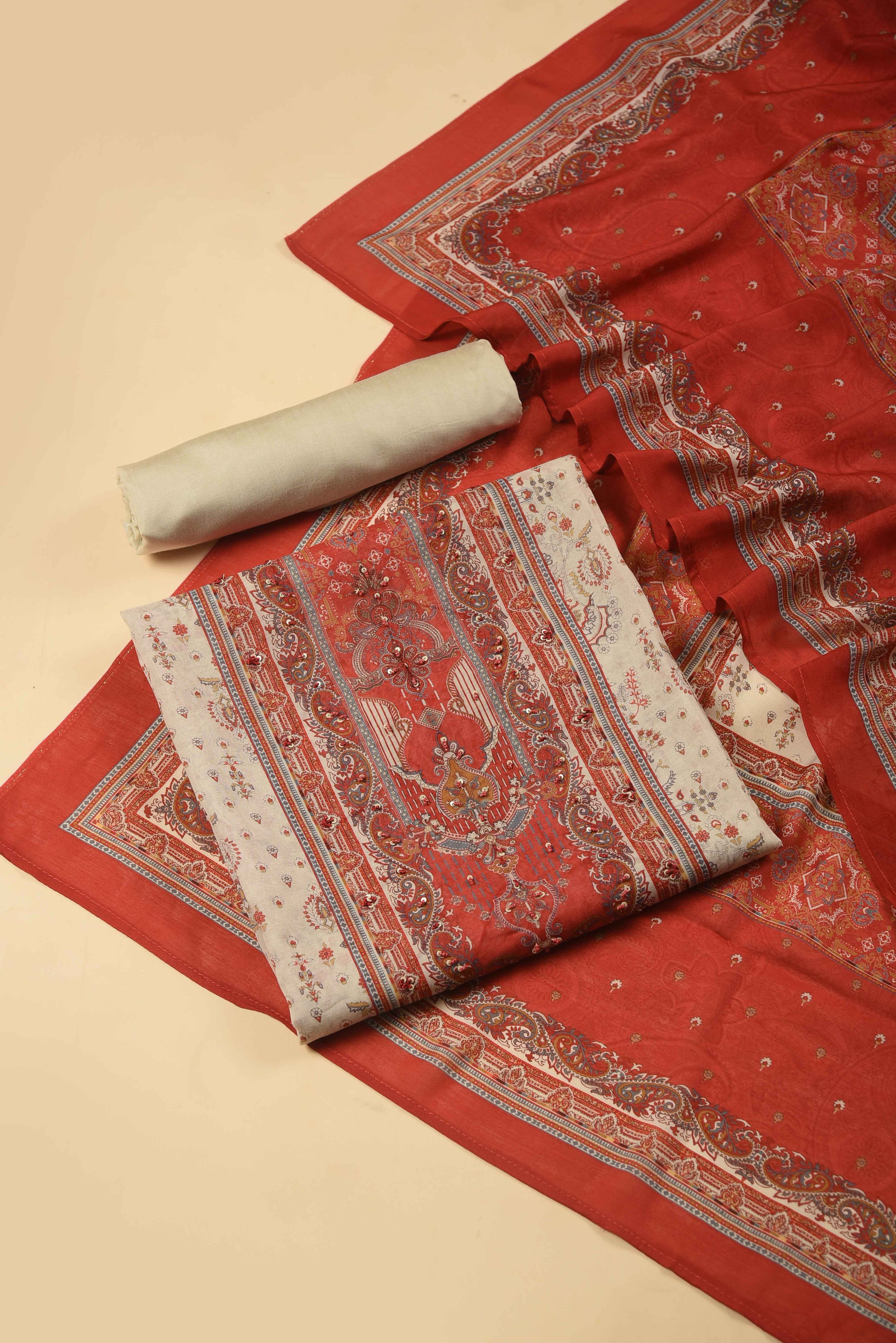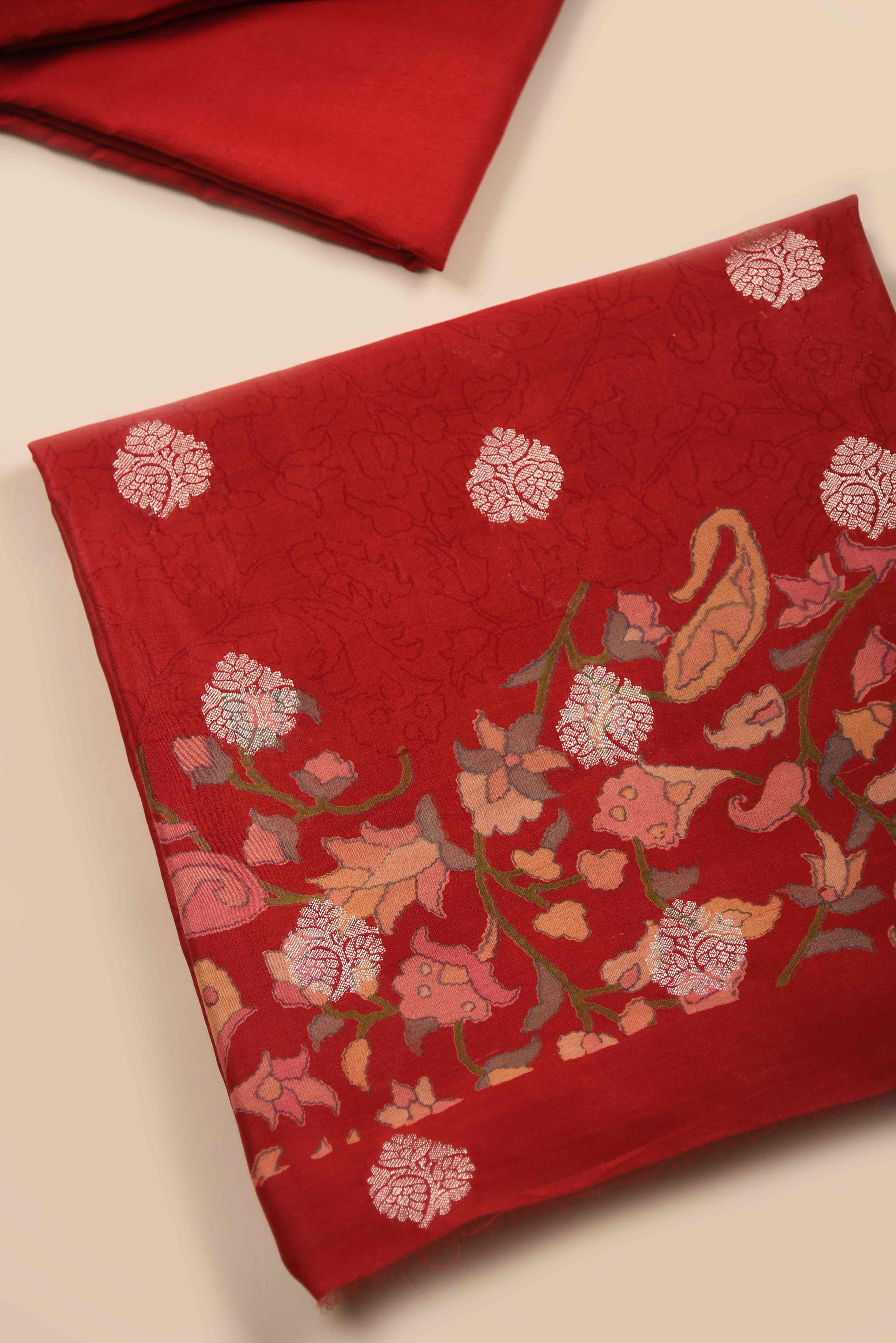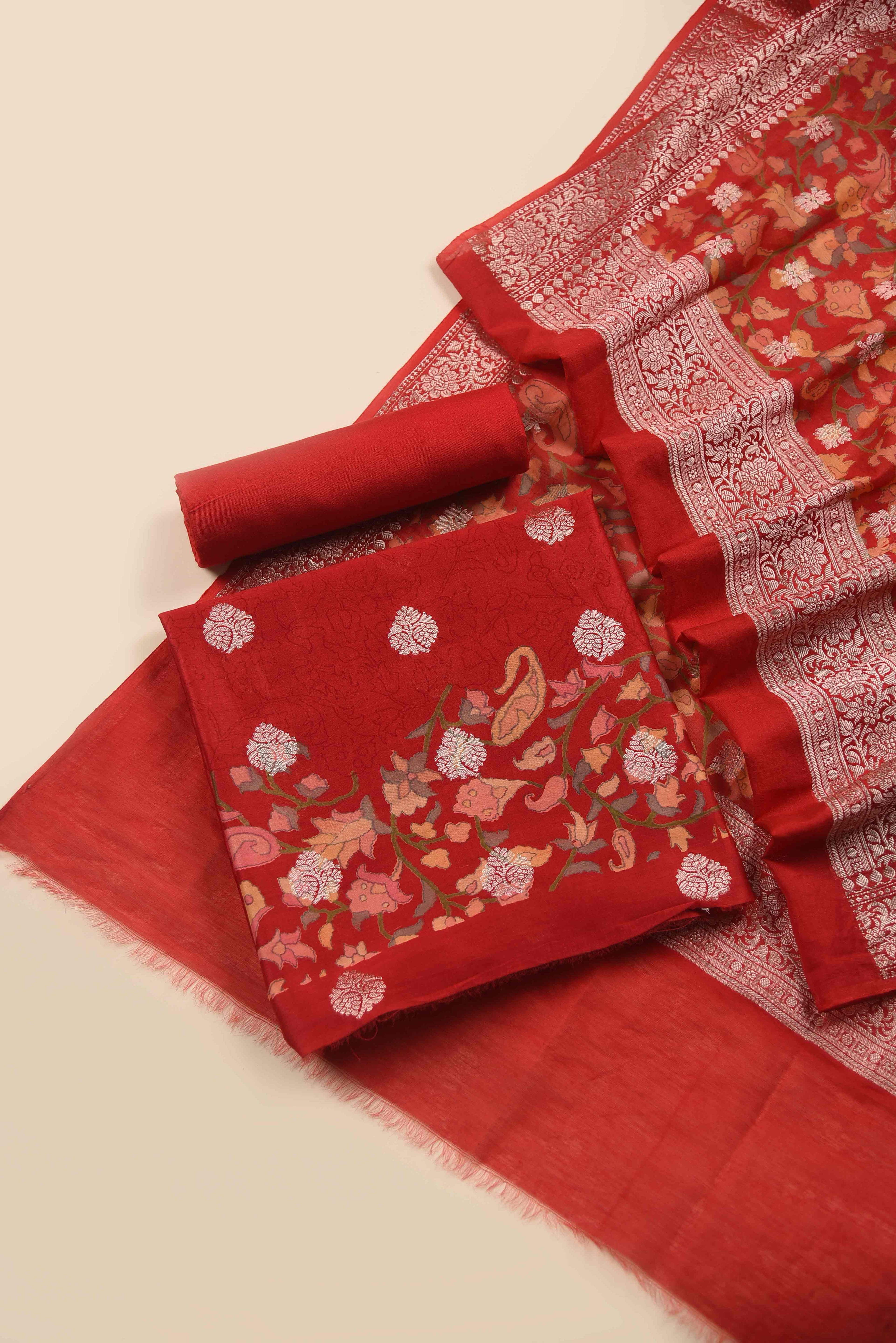 Red Mul chanderi Embroidered Unstitched Suit Fabric Set With Mul Chanderi Embroidered Dupatta