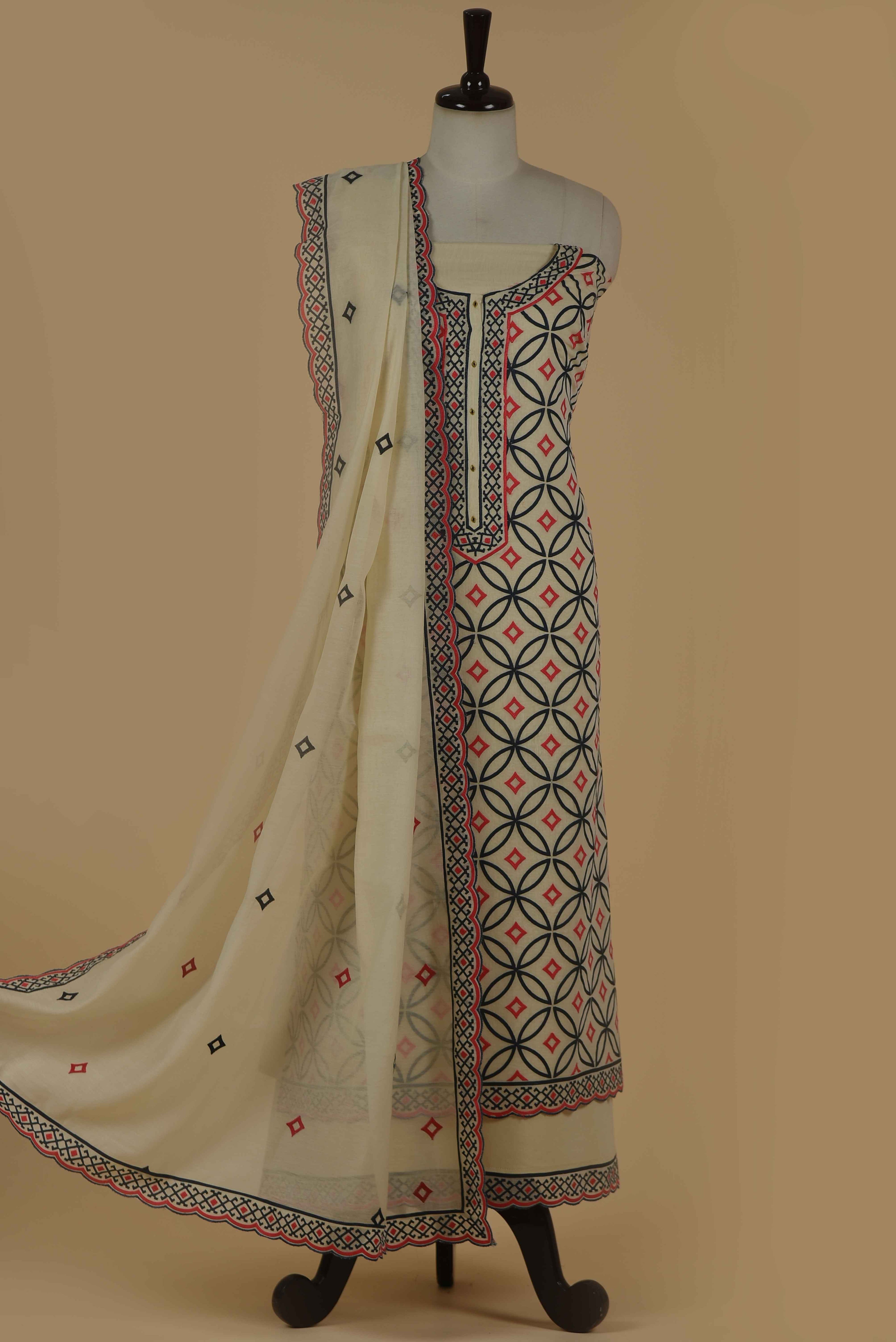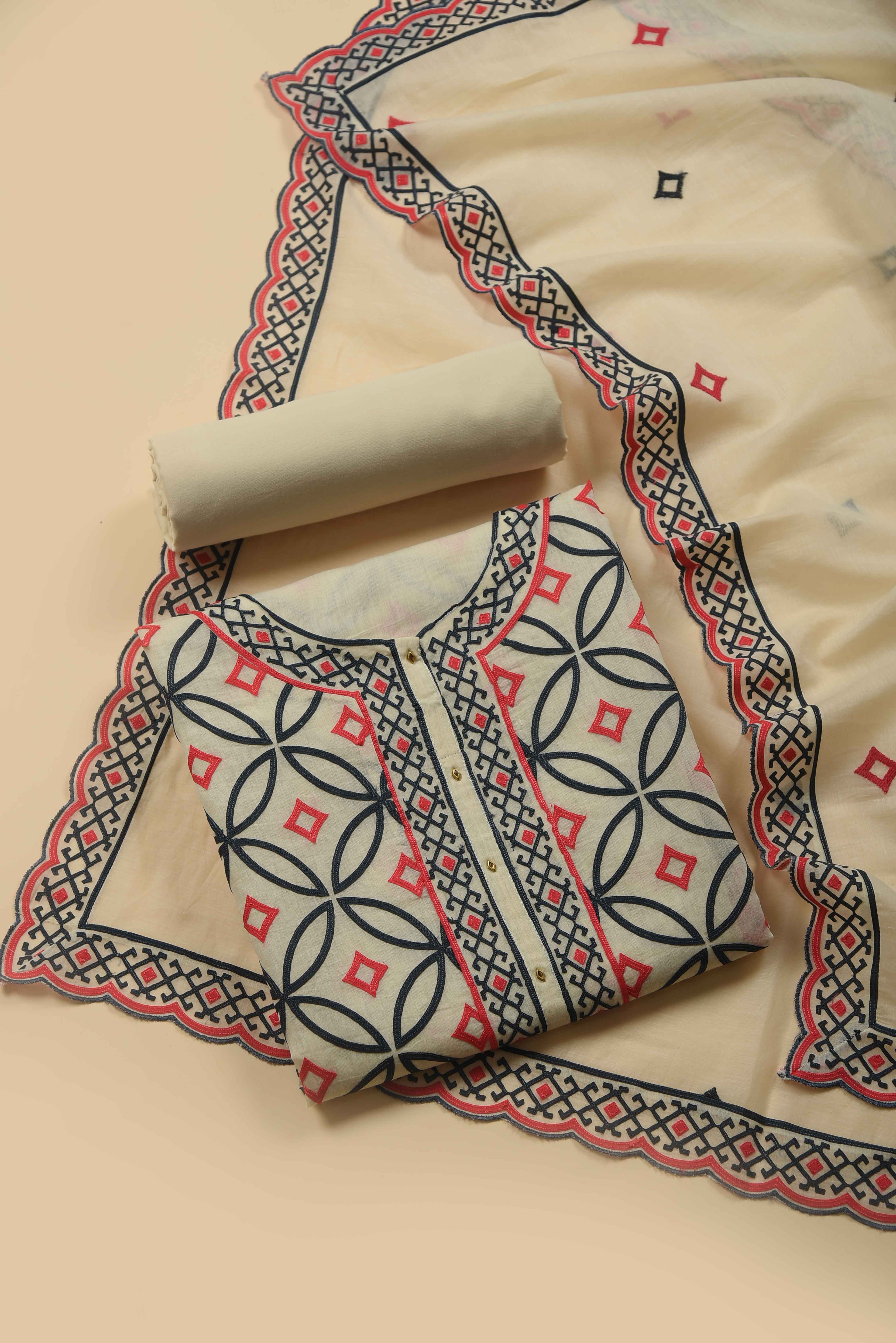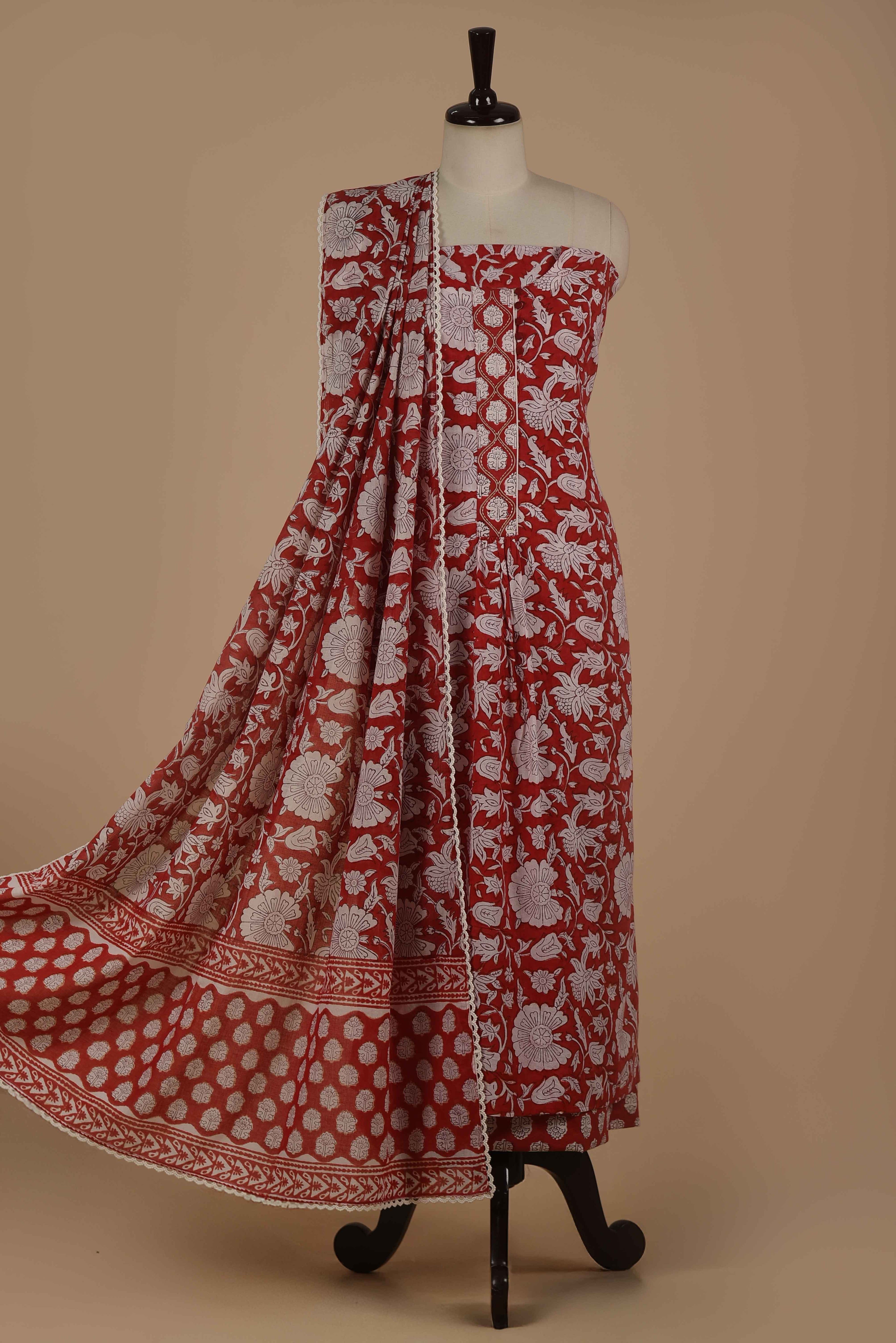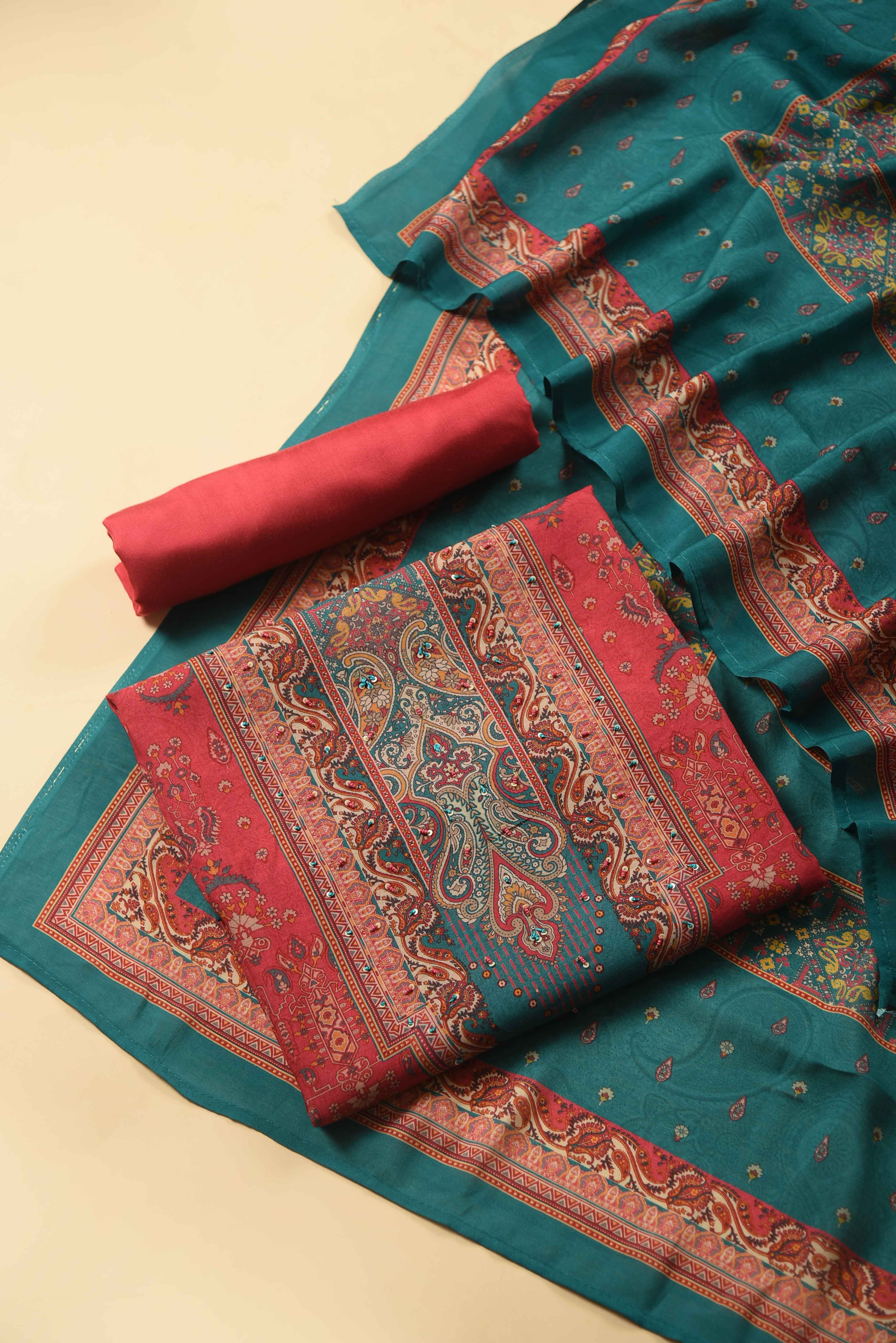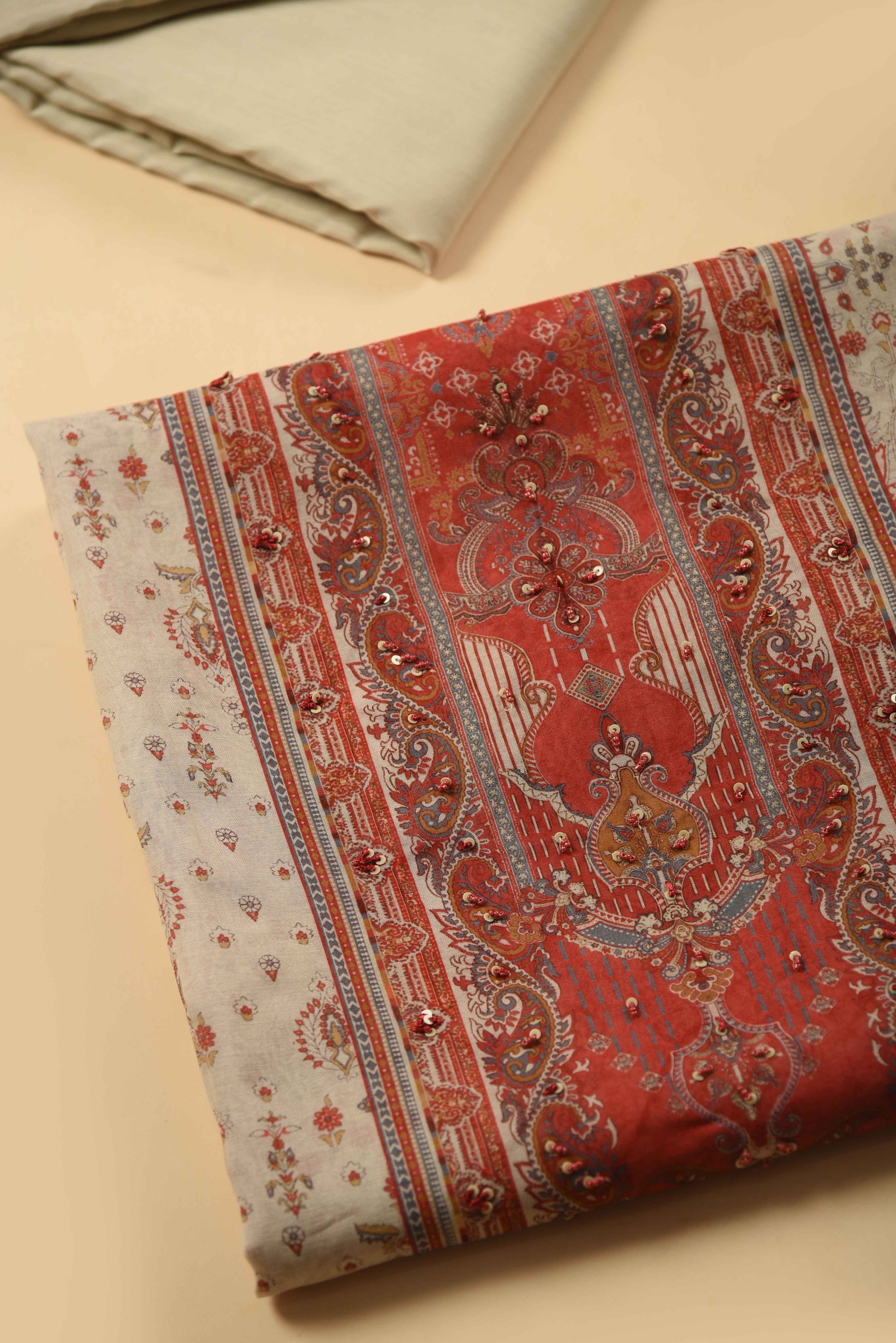 Red Mul chanderi Embroidered Unstitched Suit Fabric Set With Mul Chanderi Embroidered Dupatta