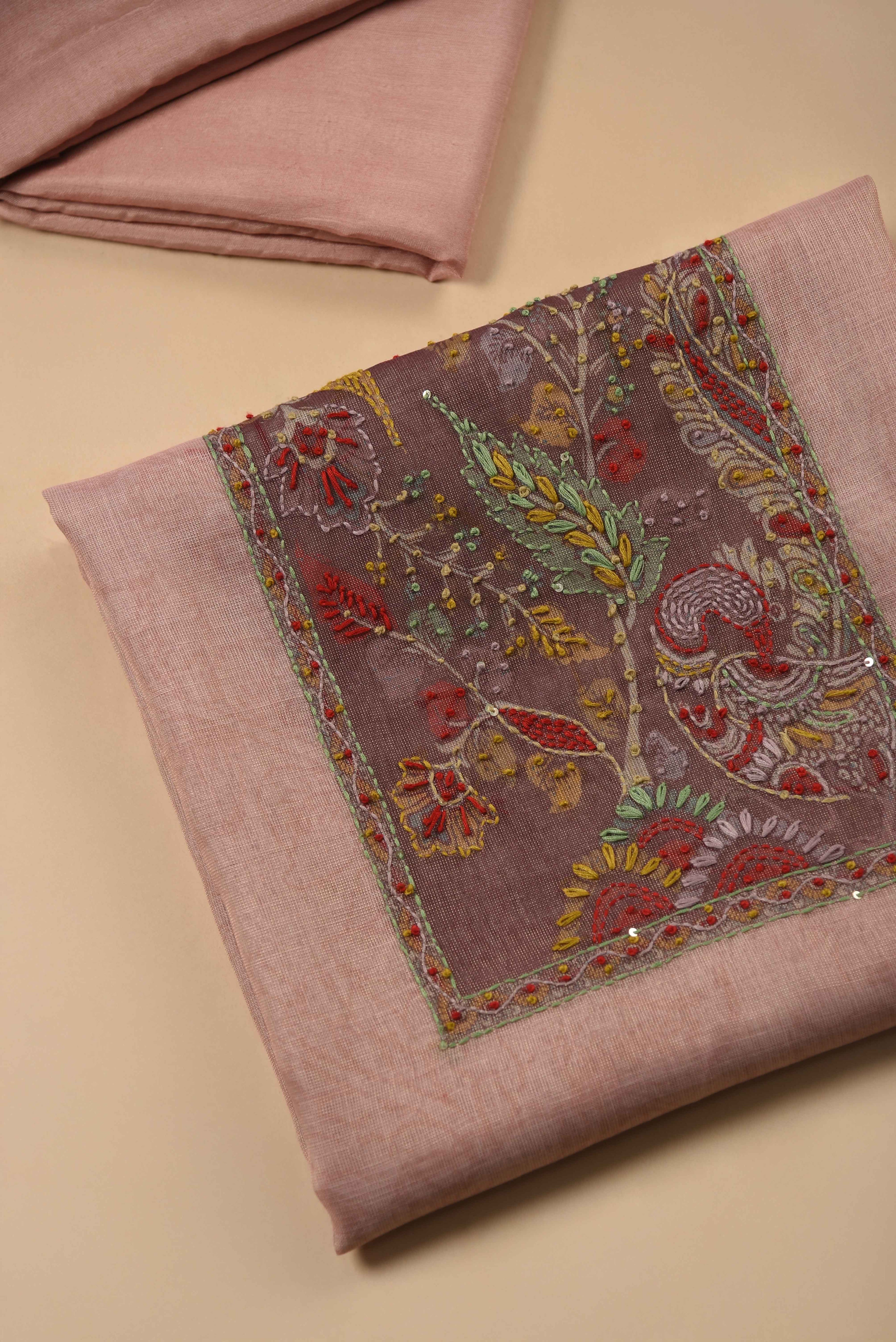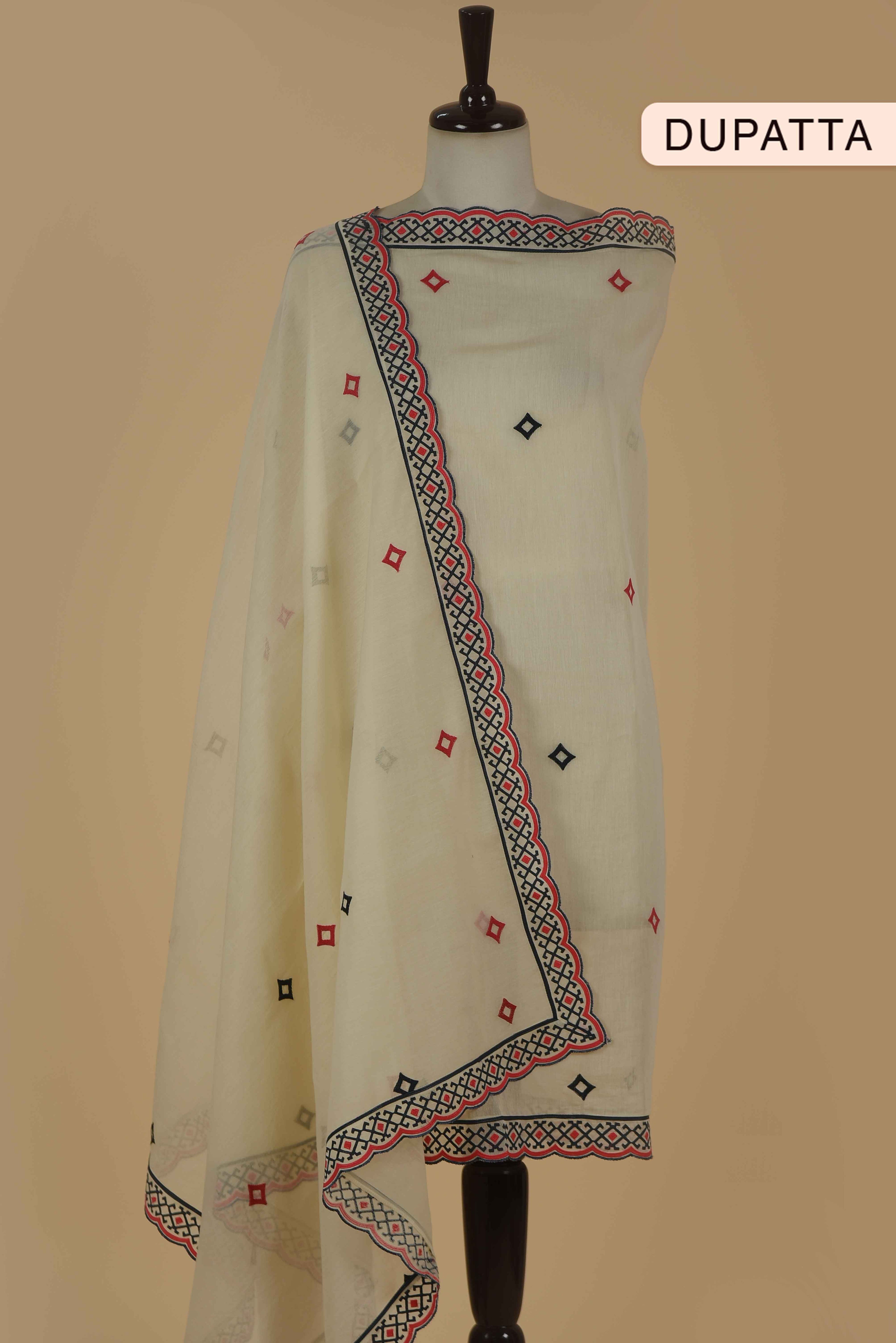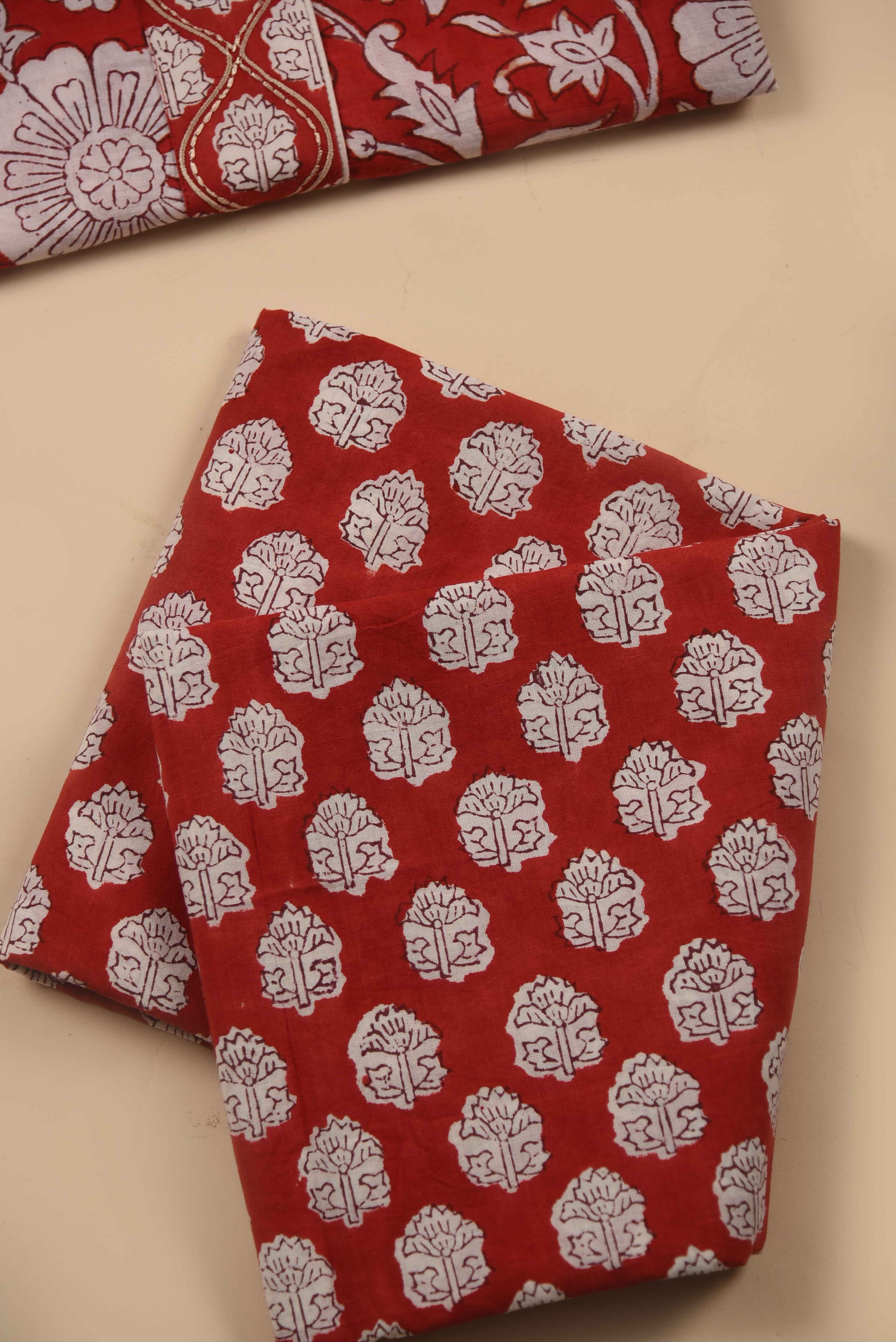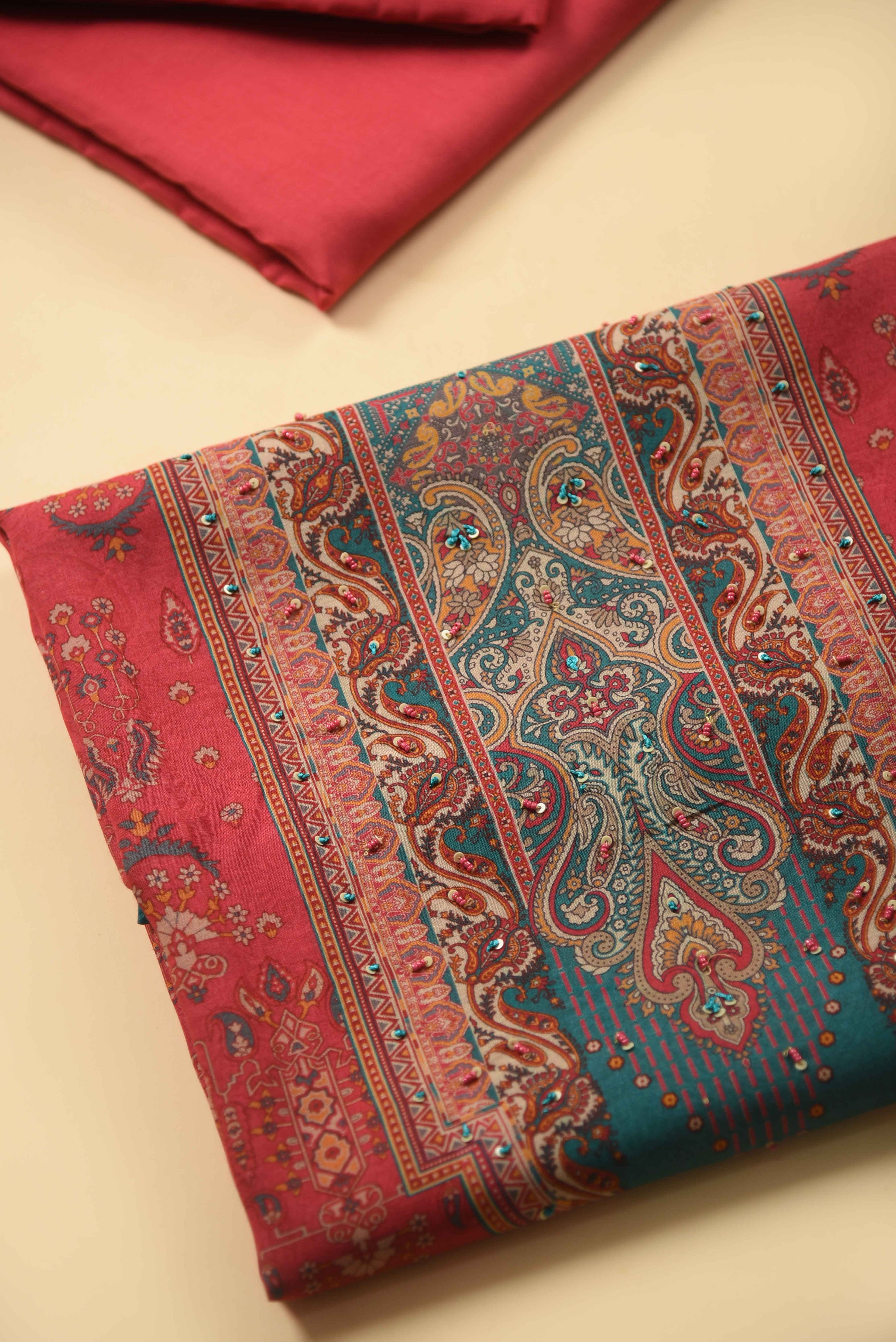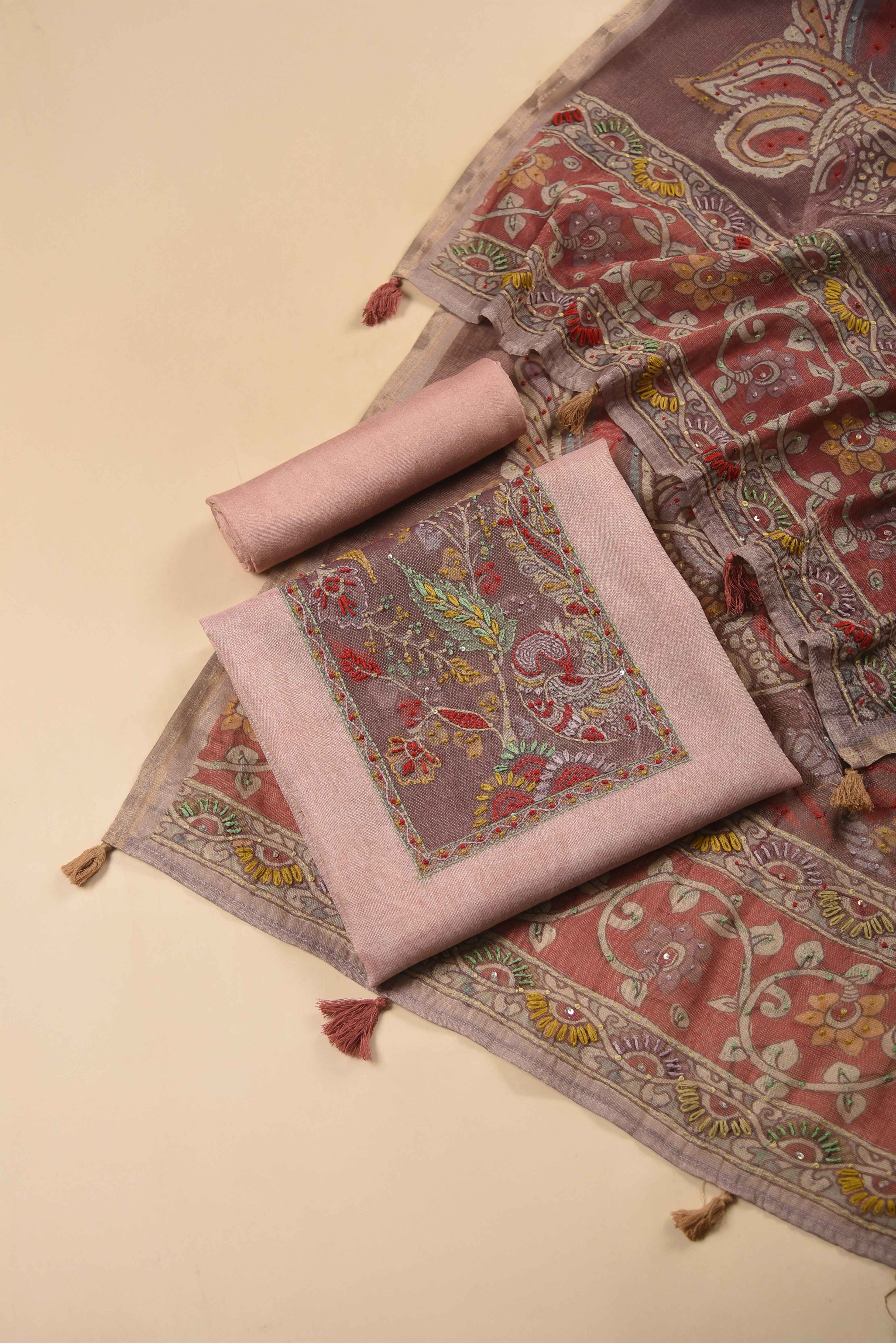 Red Mul chanderi Embroidered Unstitched Suit Fabric Set With Mul Chanderi Embroidered Dupatta