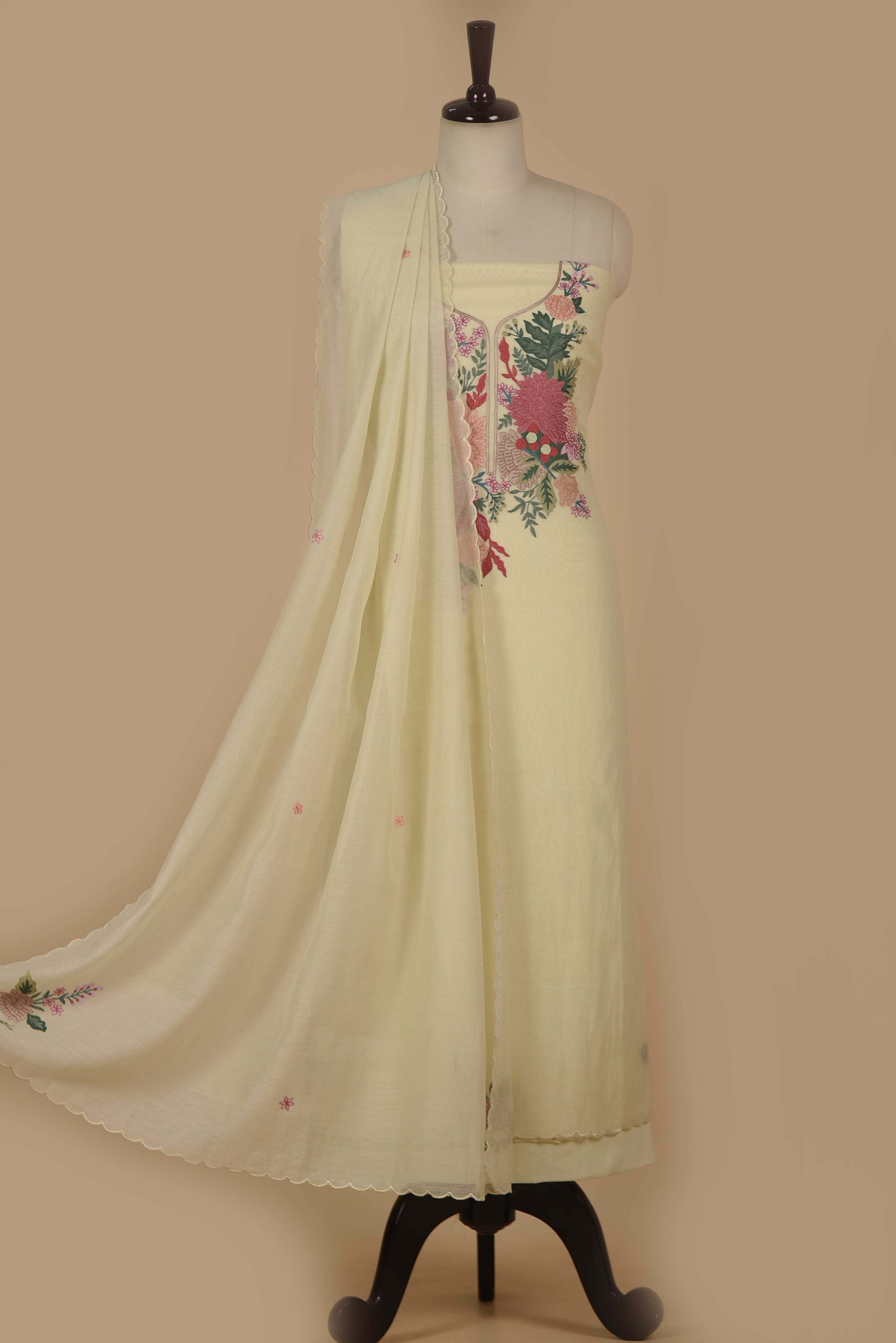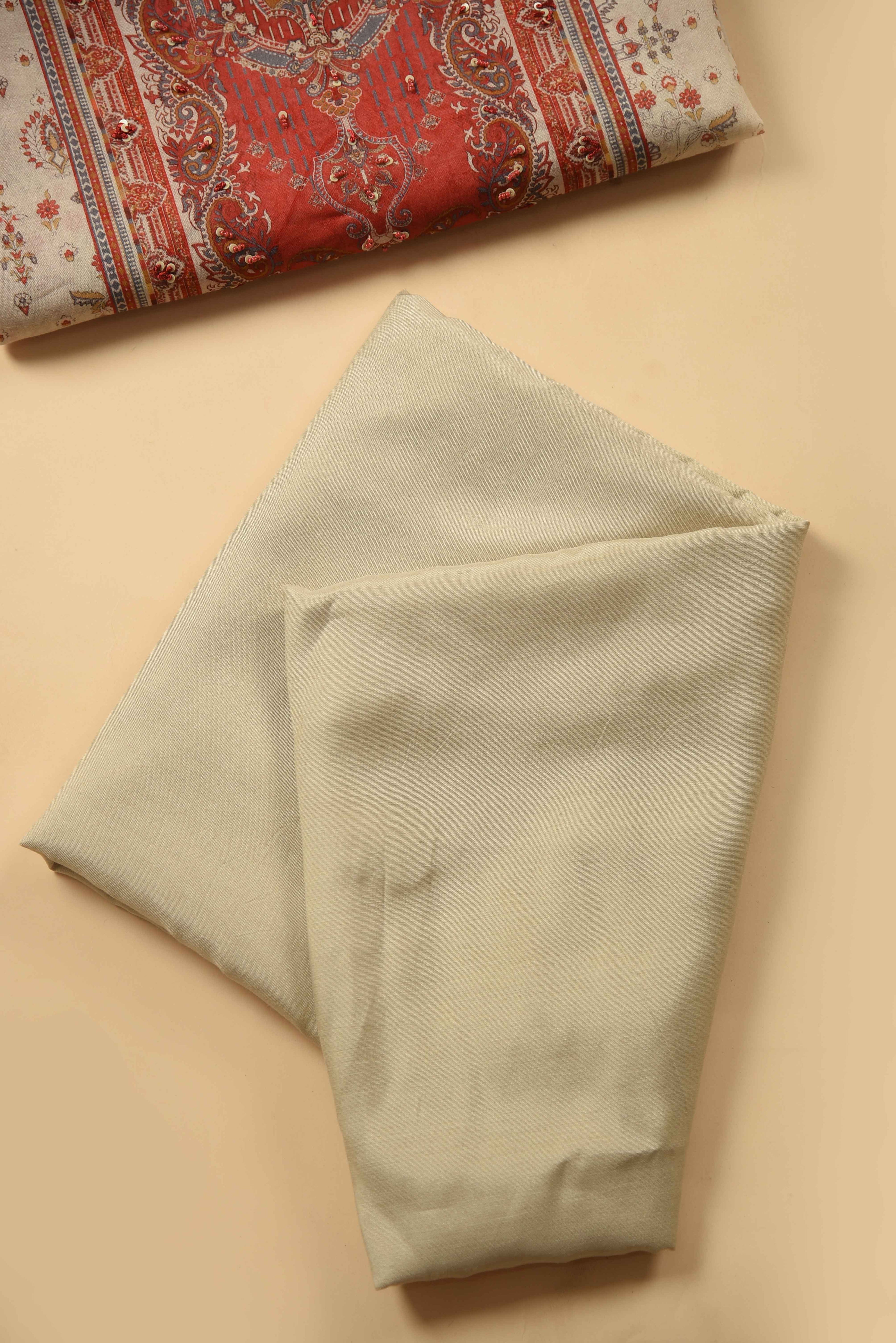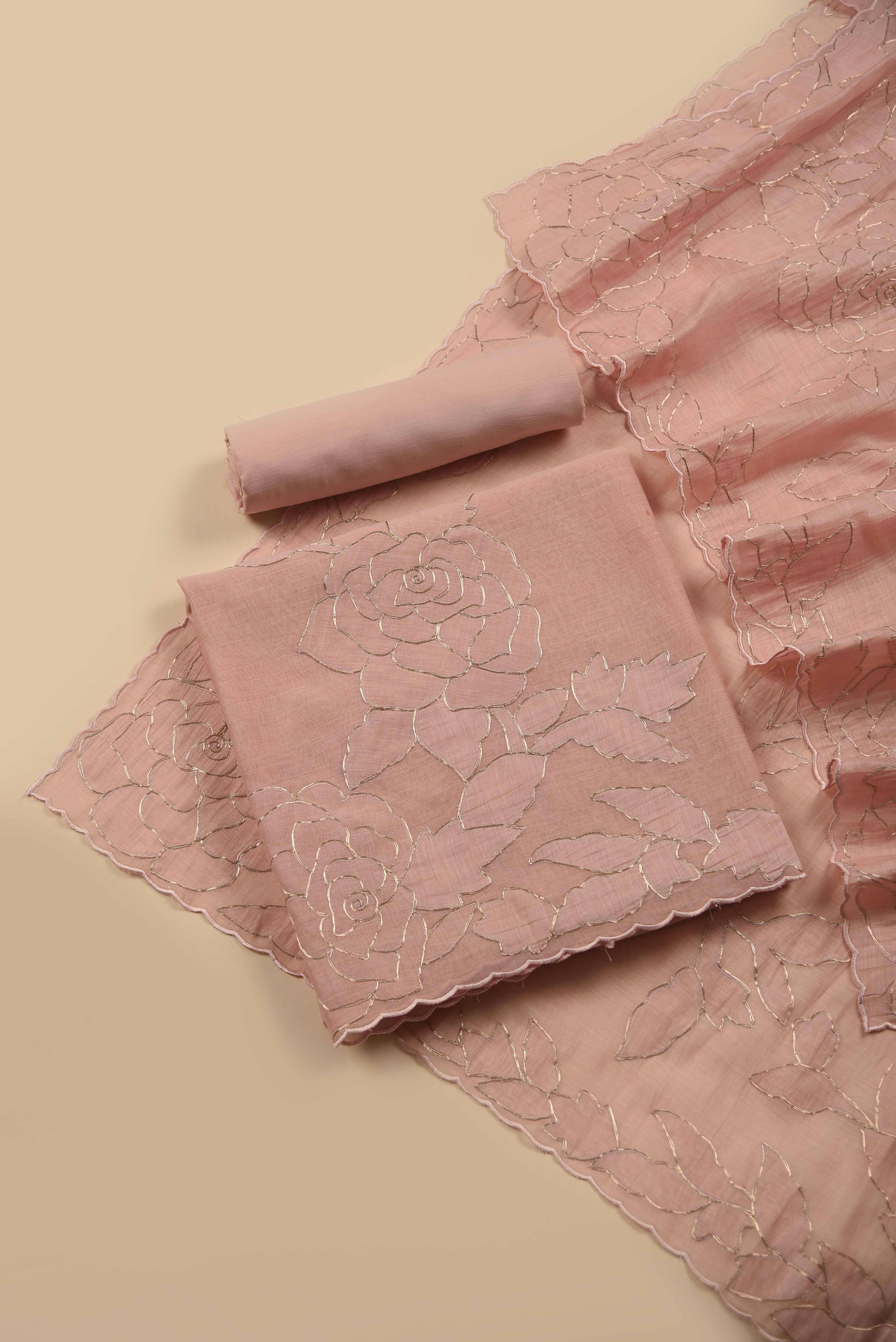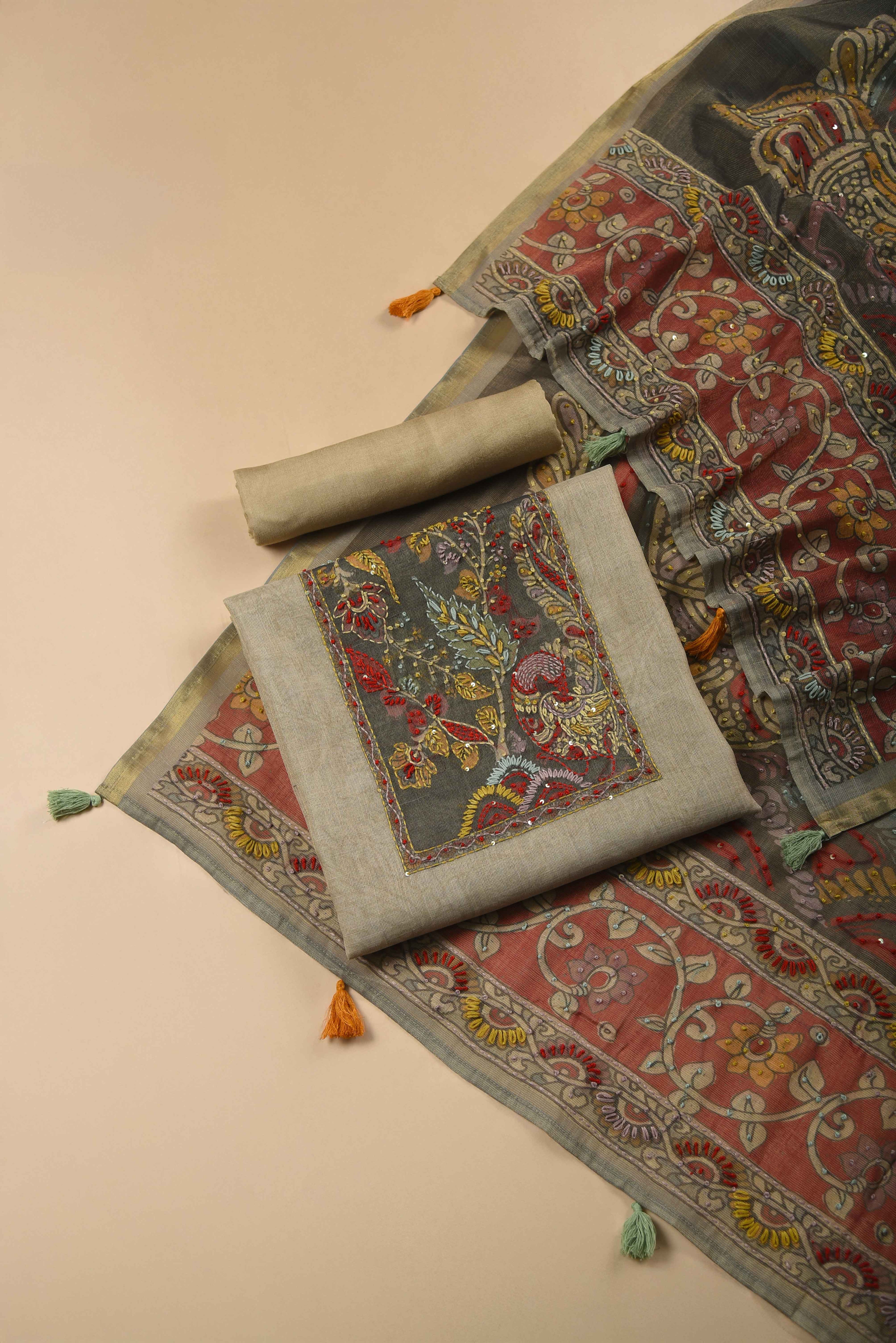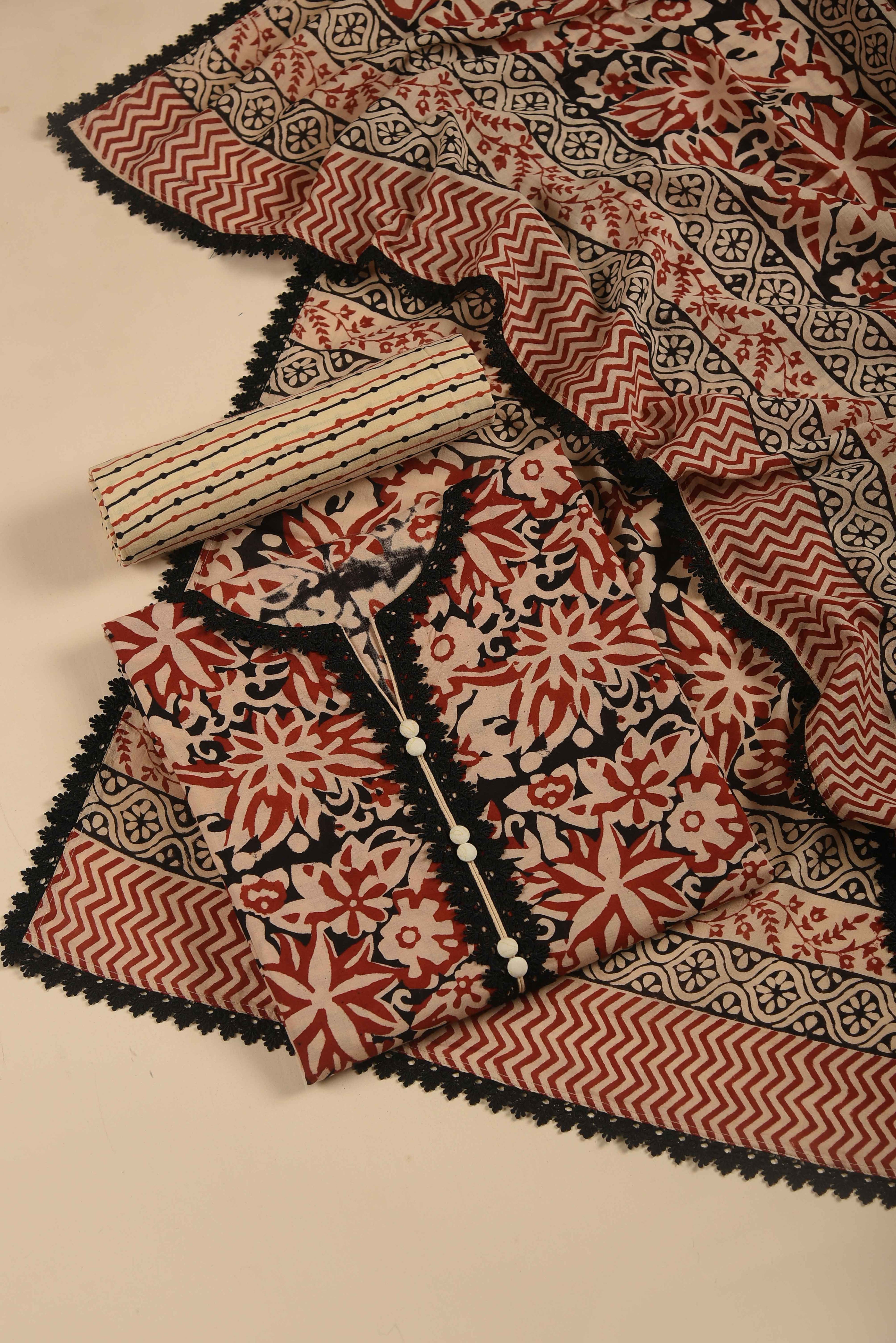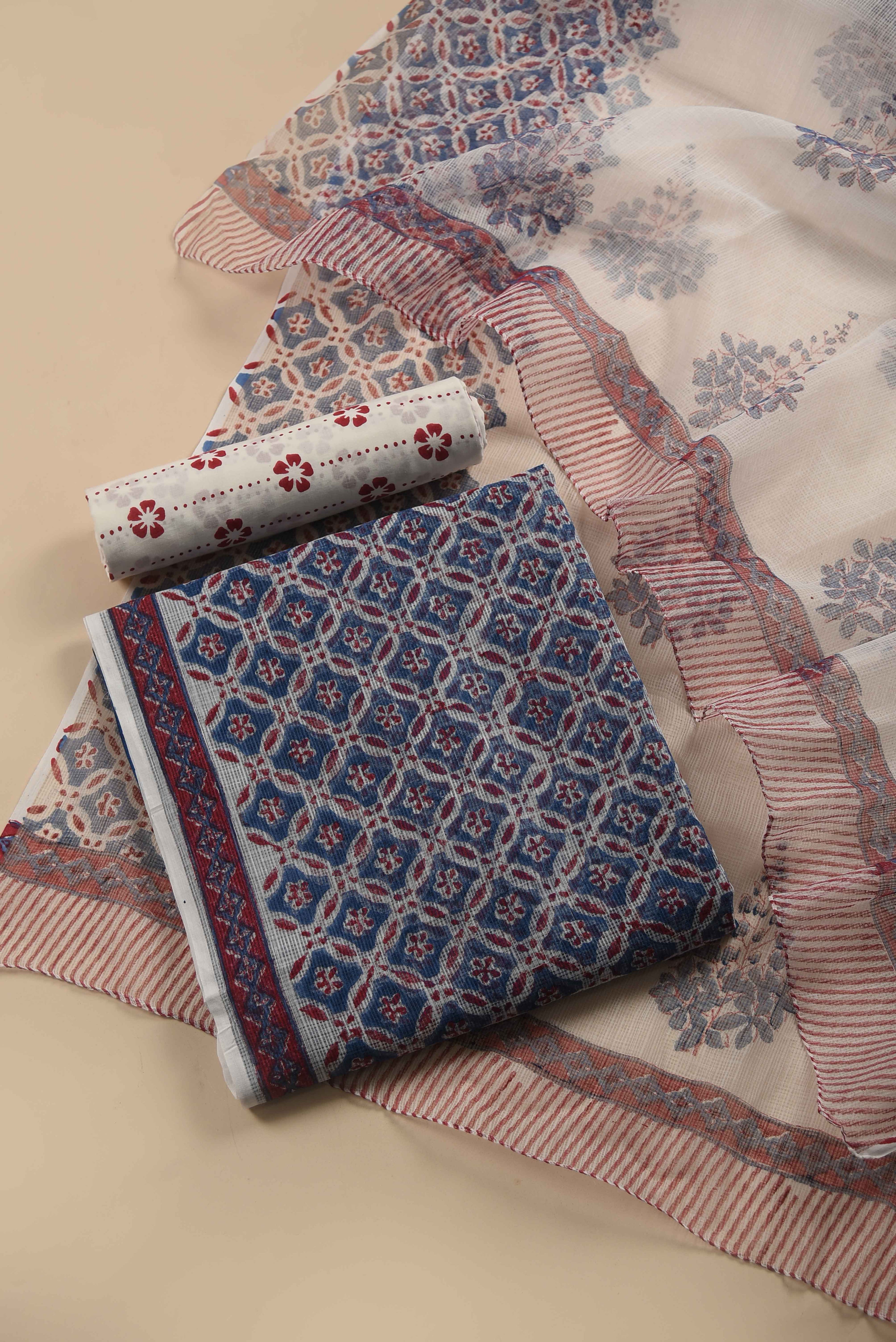 Red Mul chanderi Embroidered Unstitched Suit Fabric Set With Mul Chanderi Embroidered Dupatta