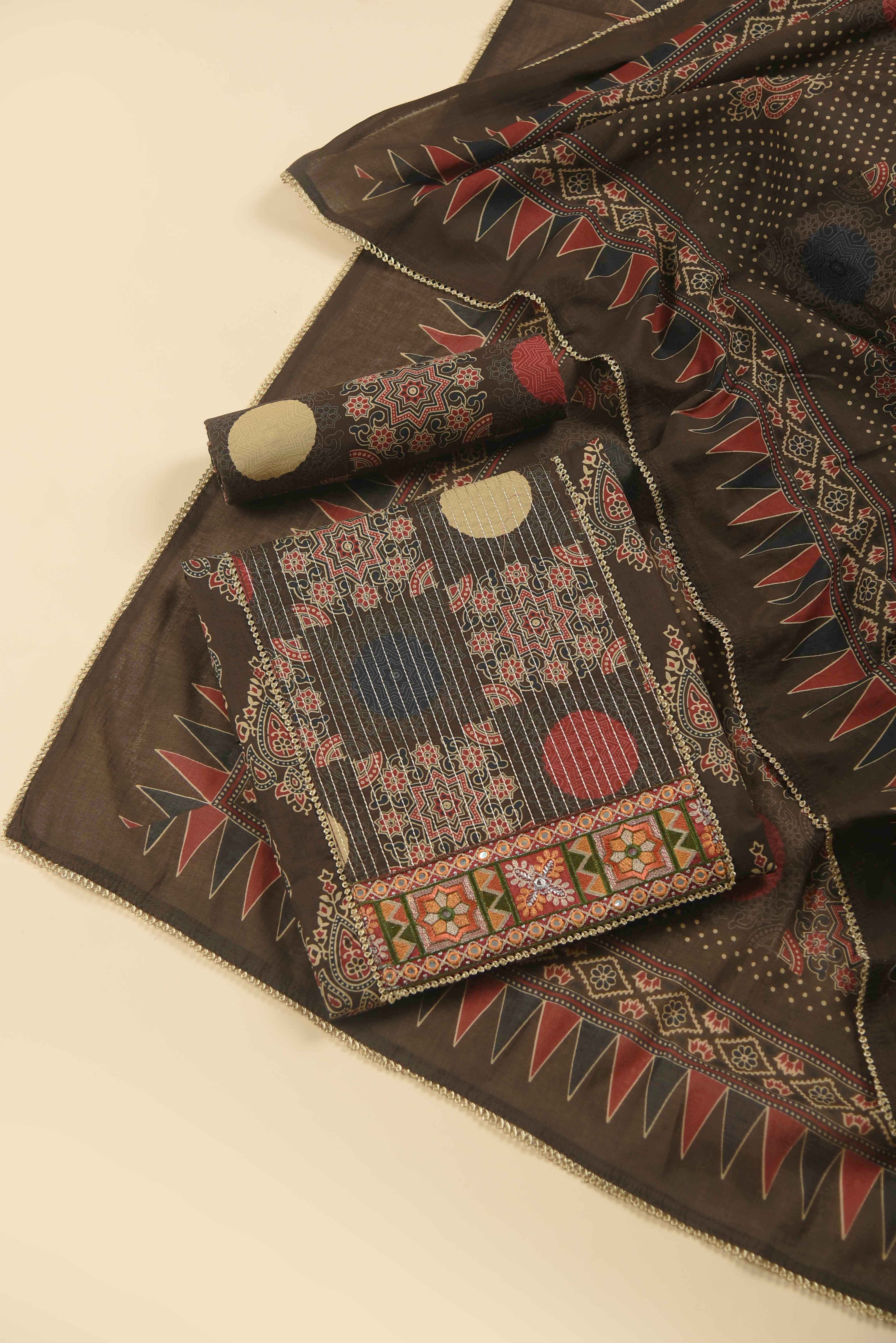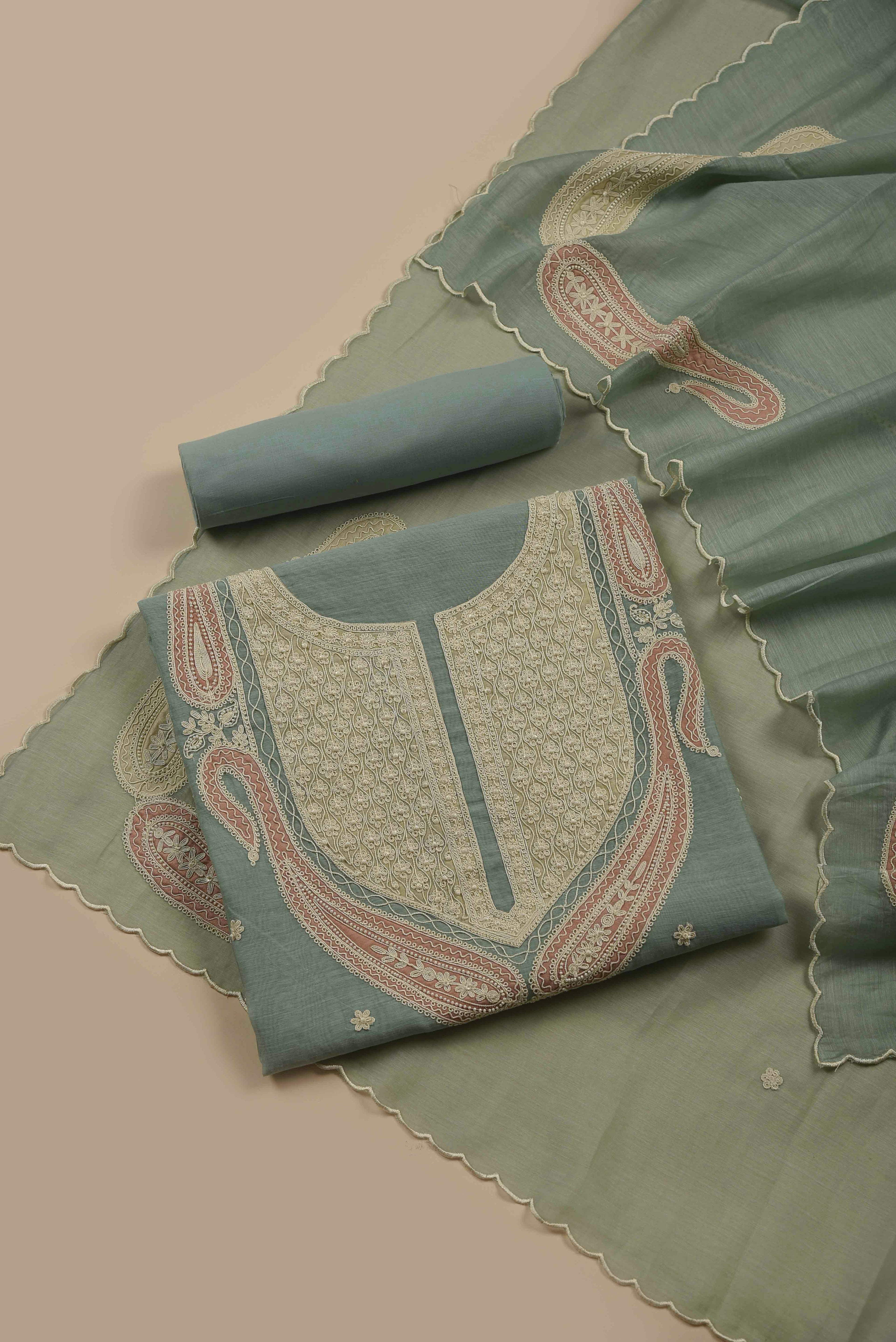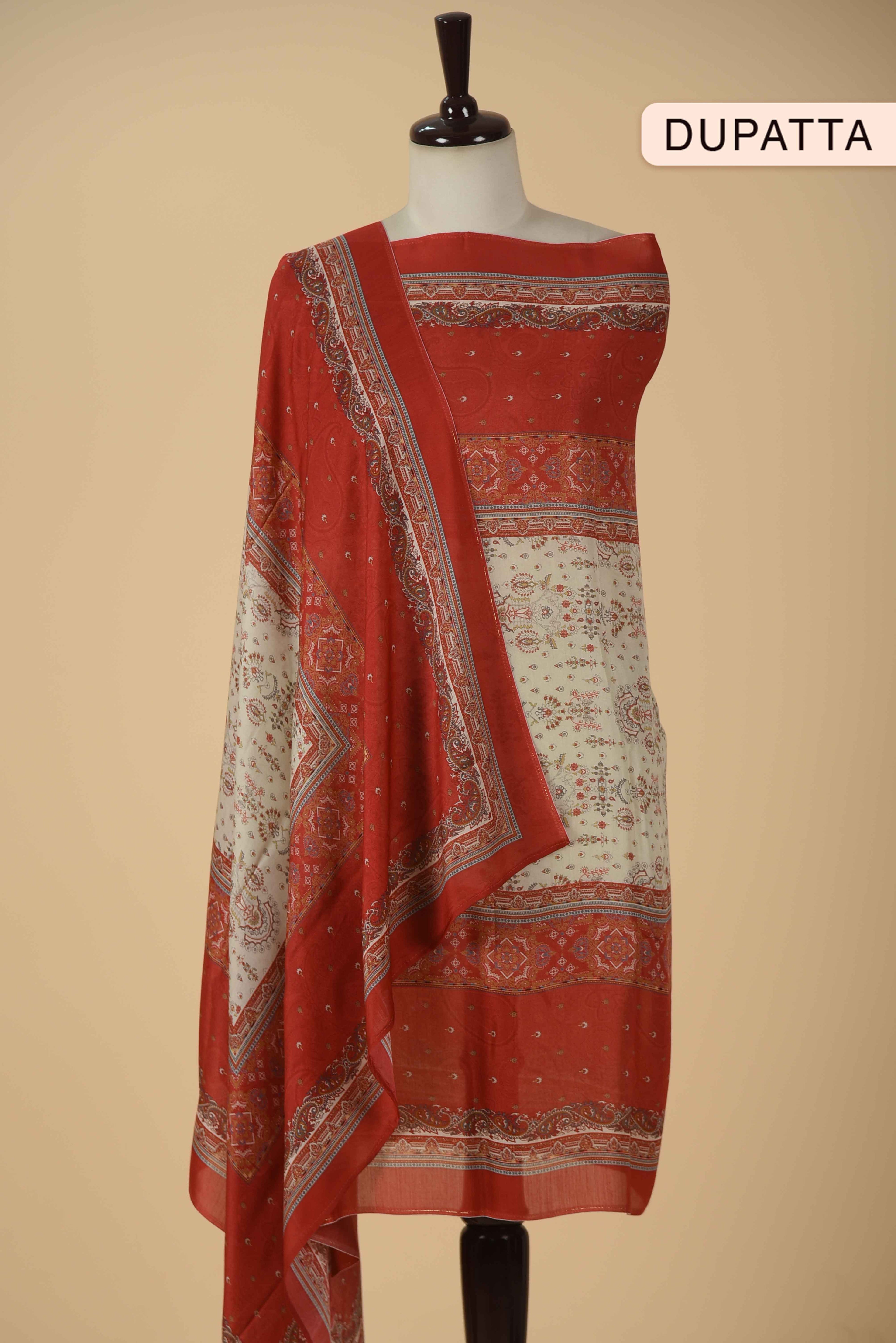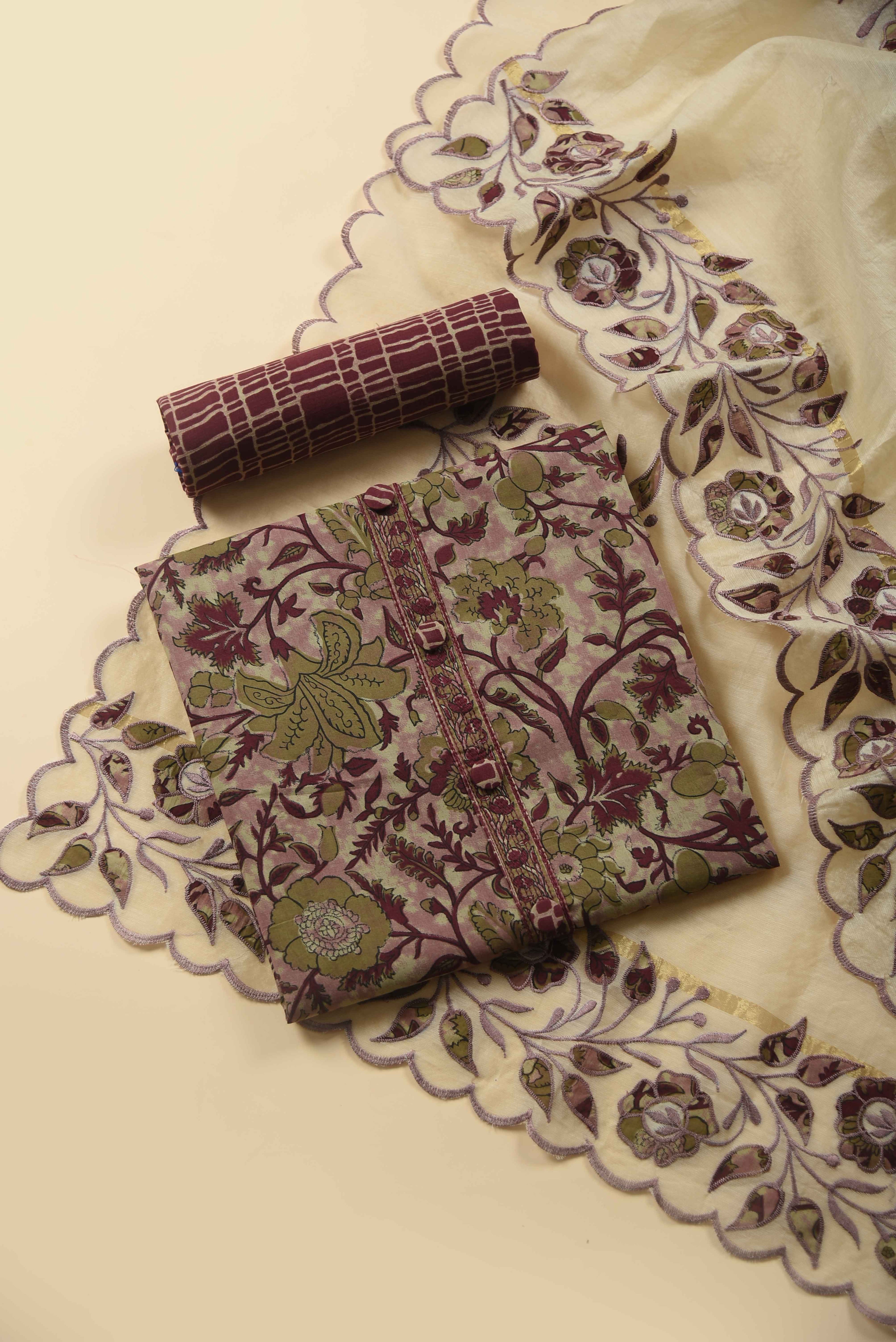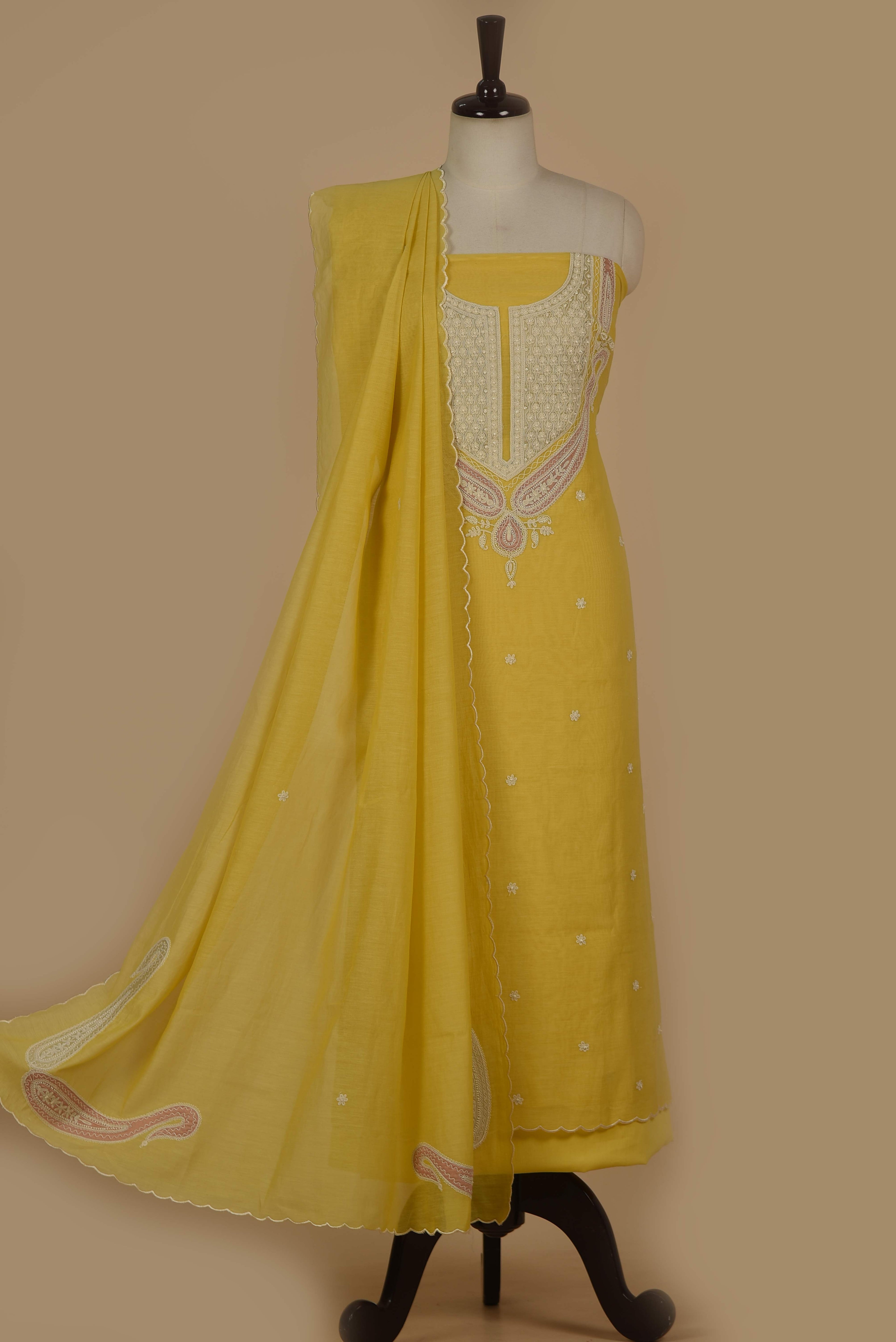 Red Mul chanderi Embroidered Unstitched Suit Fabric Set With Mul Chanderi Embroidered Dupatta