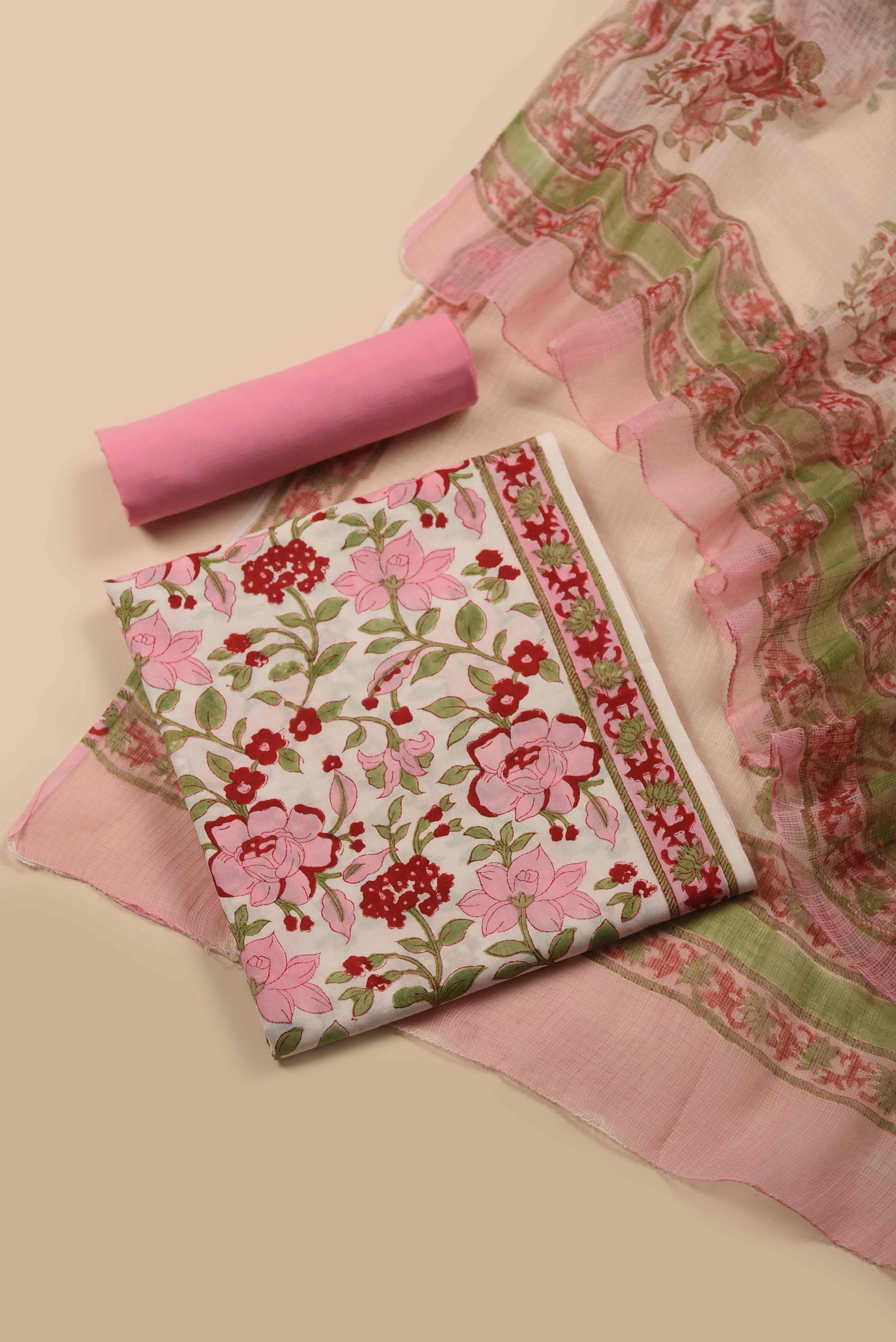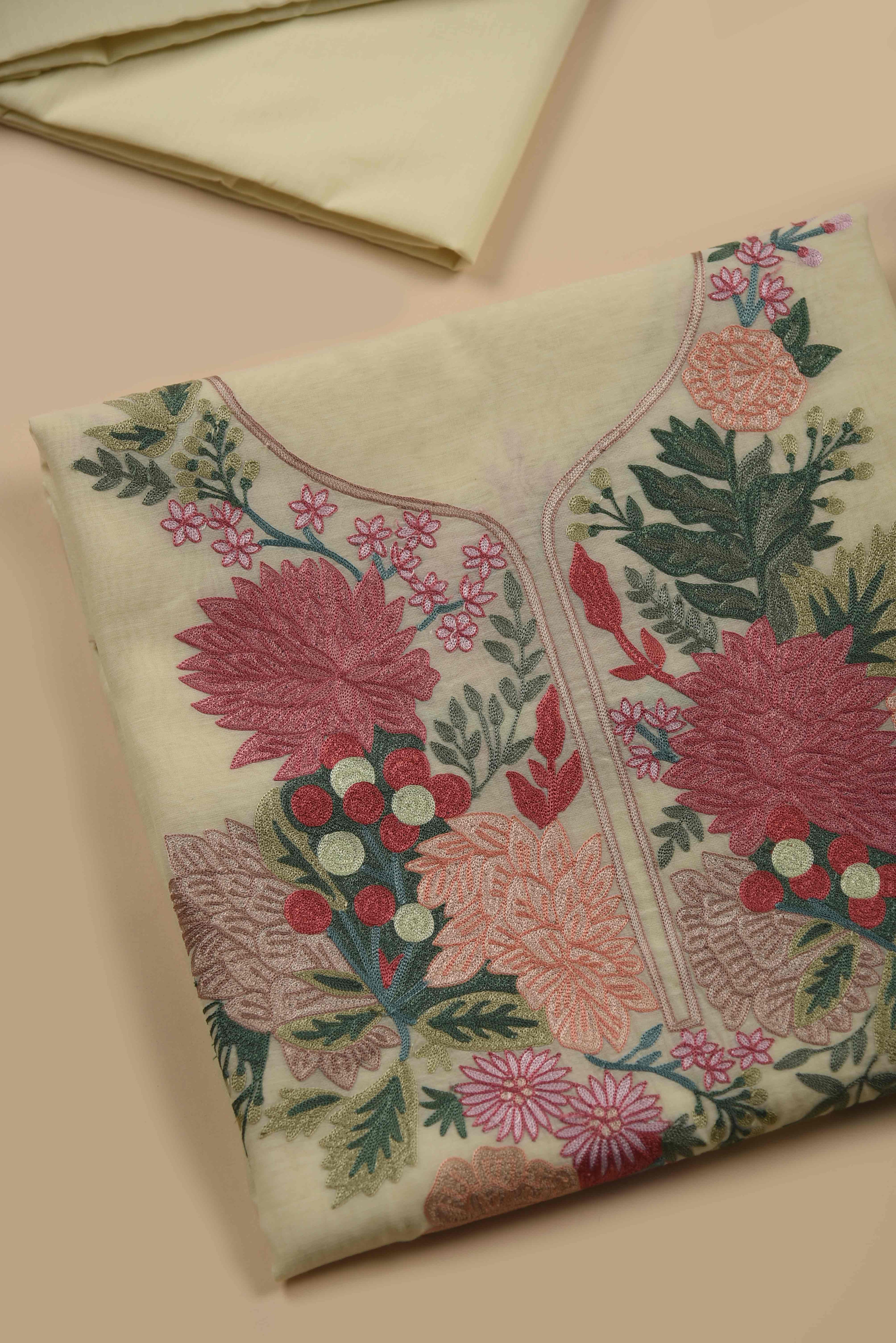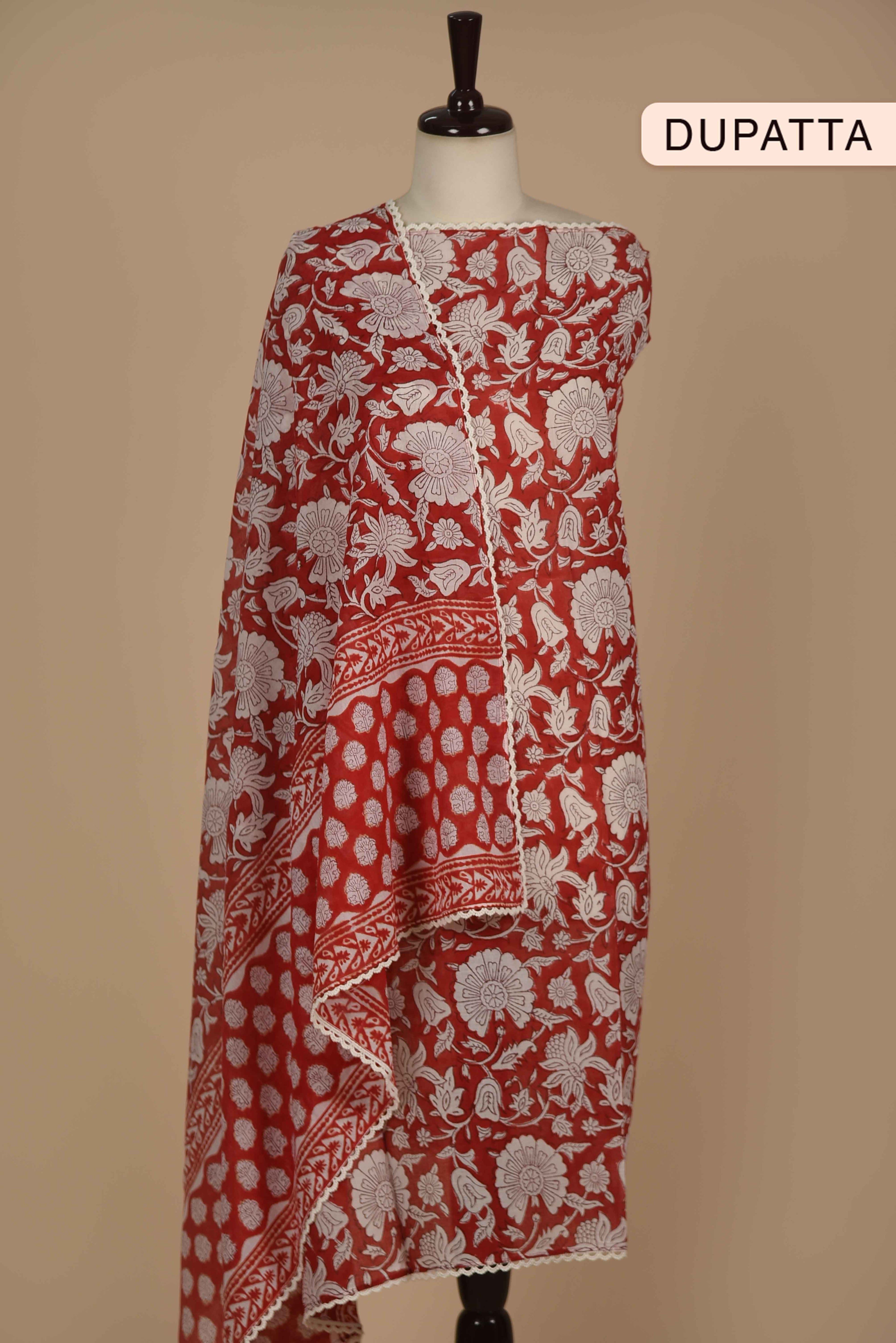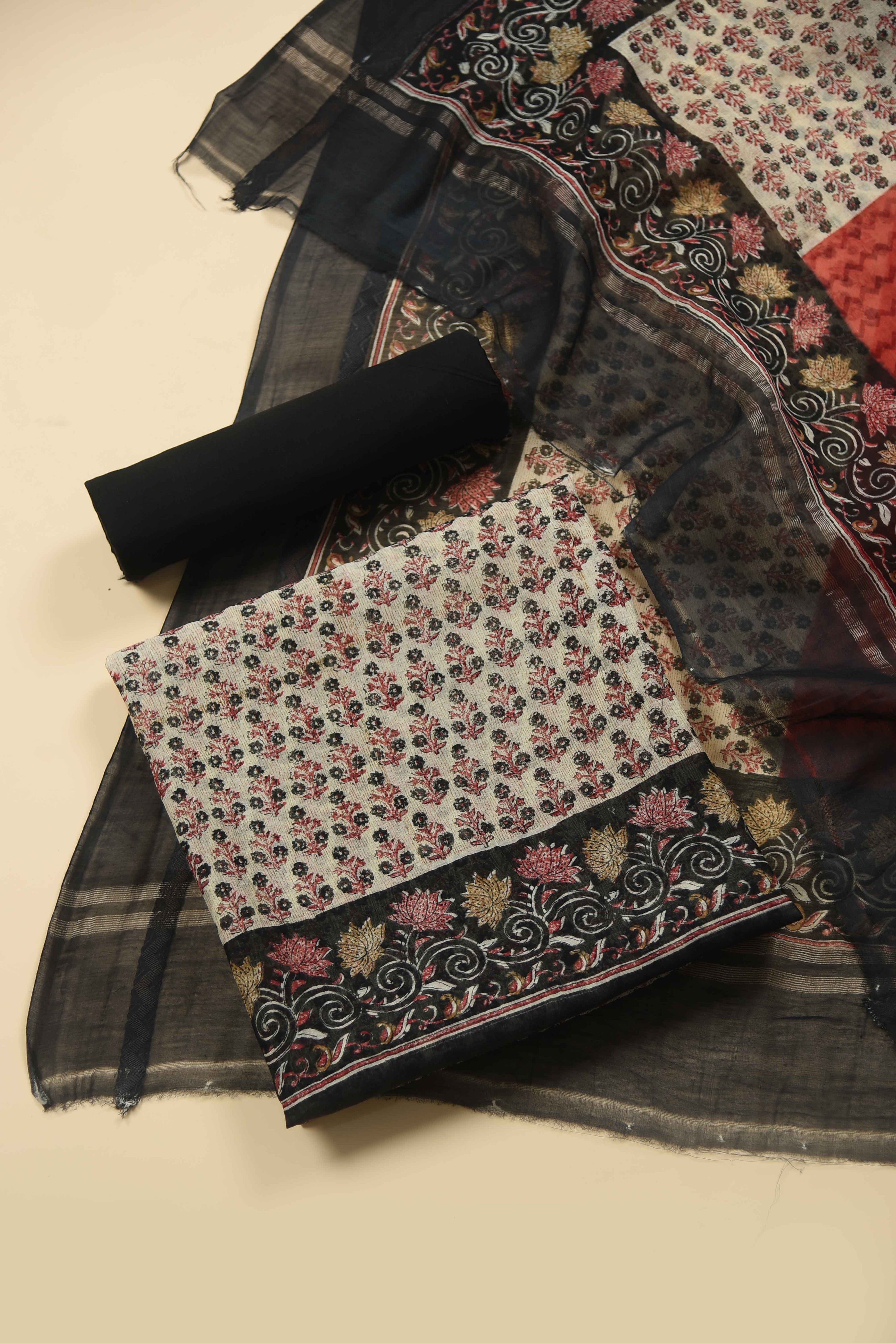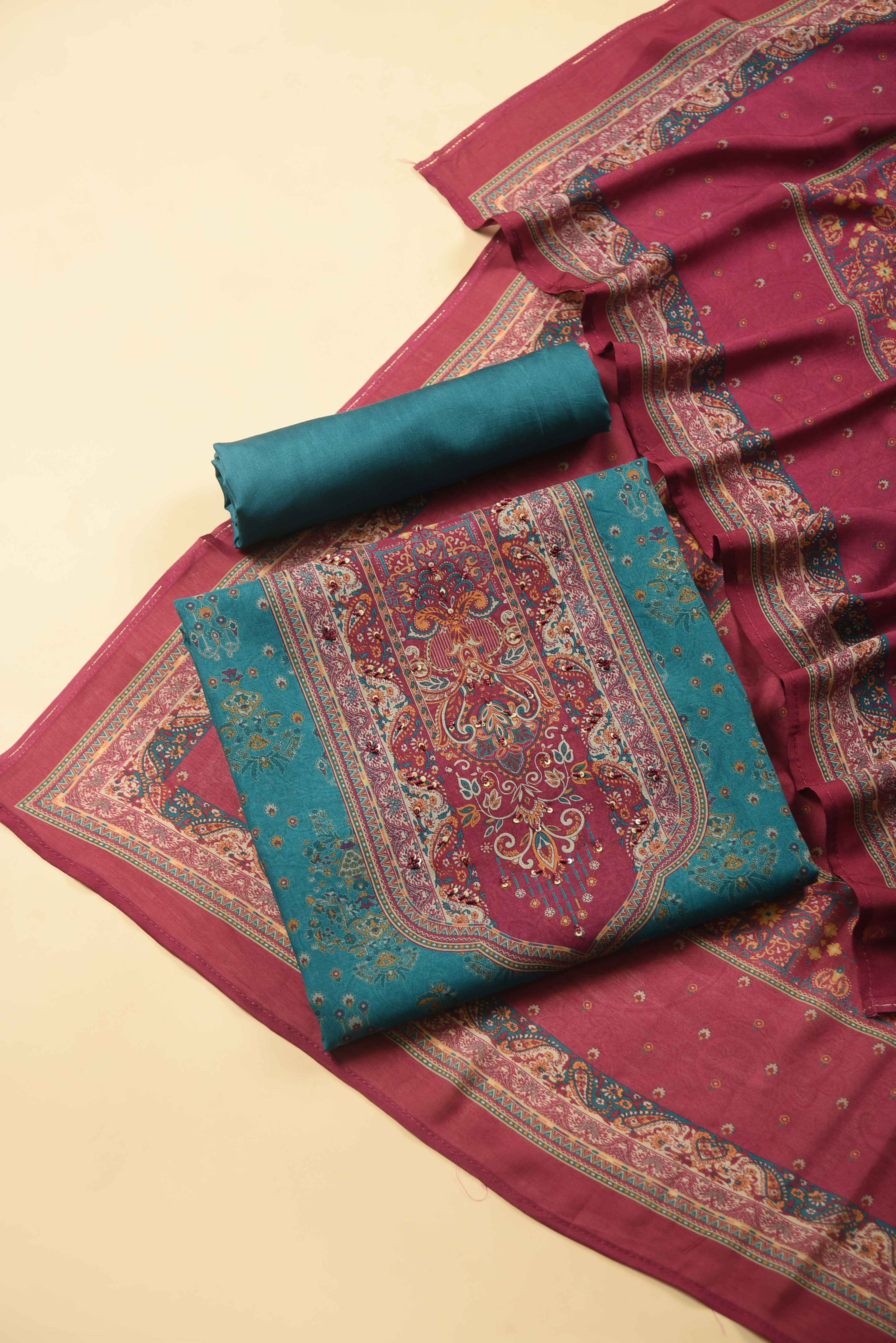 Red Mul chanderi Embroidered Unstitched Suit Fabric Set With Mul Chanderi Embroidered Dupatta