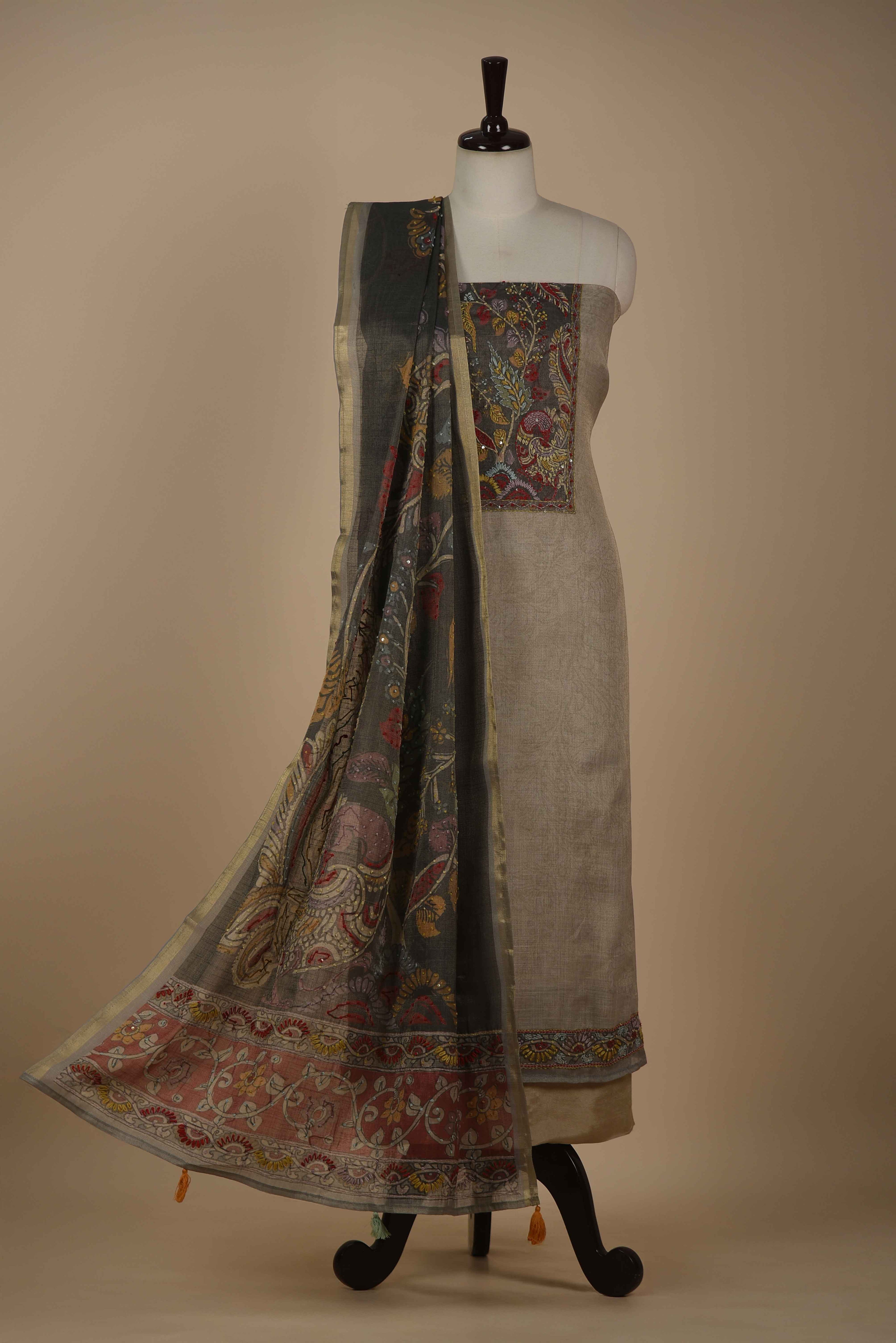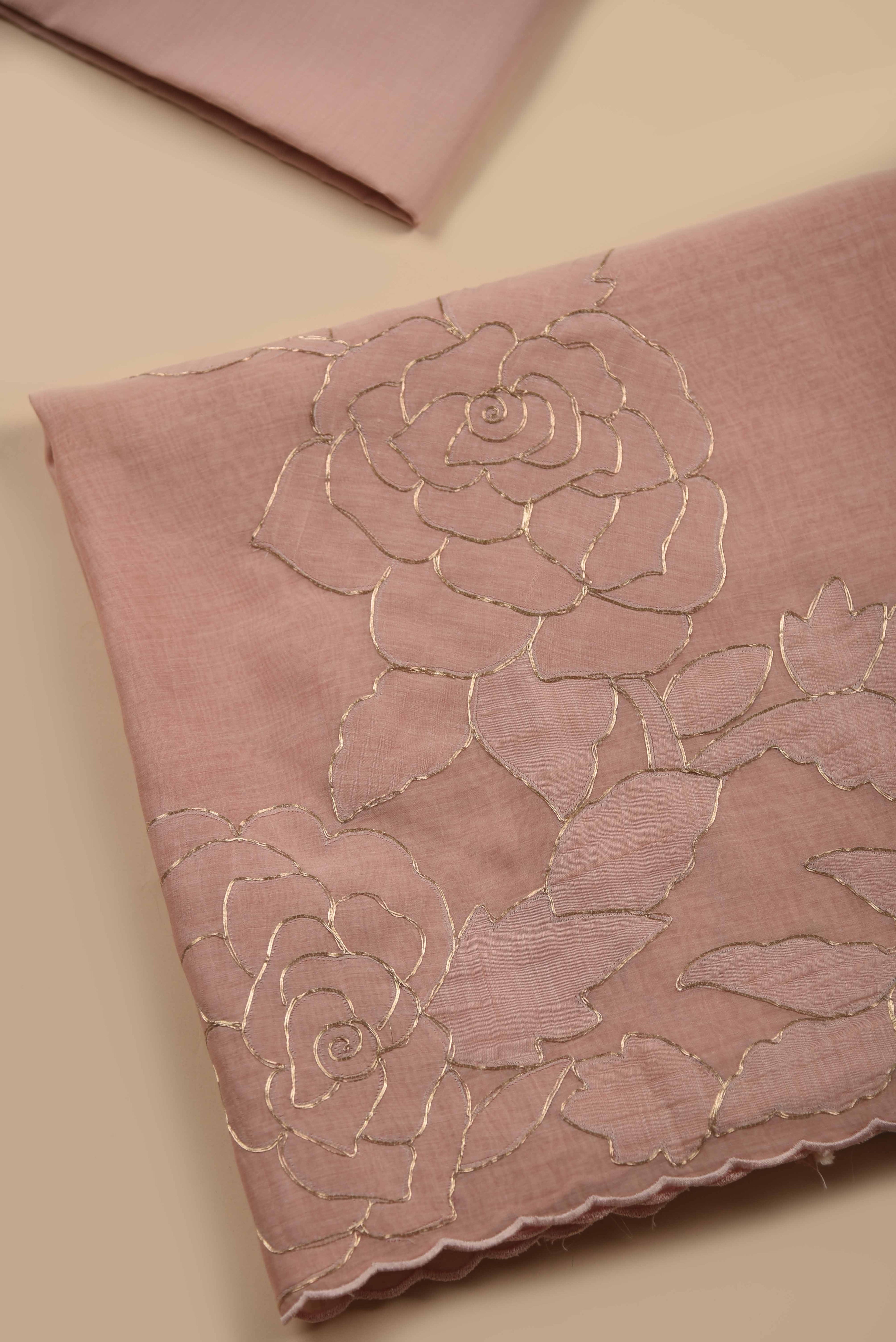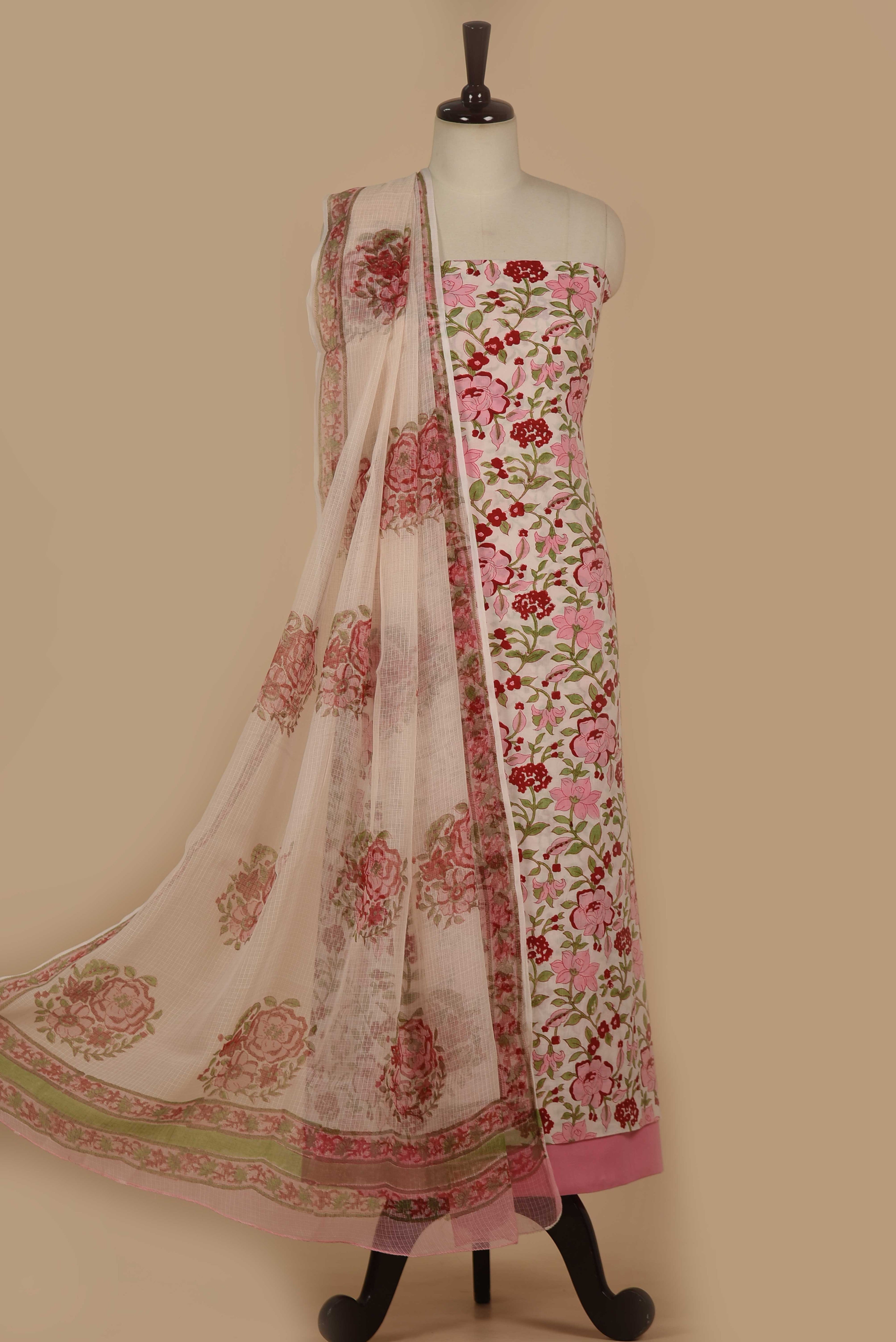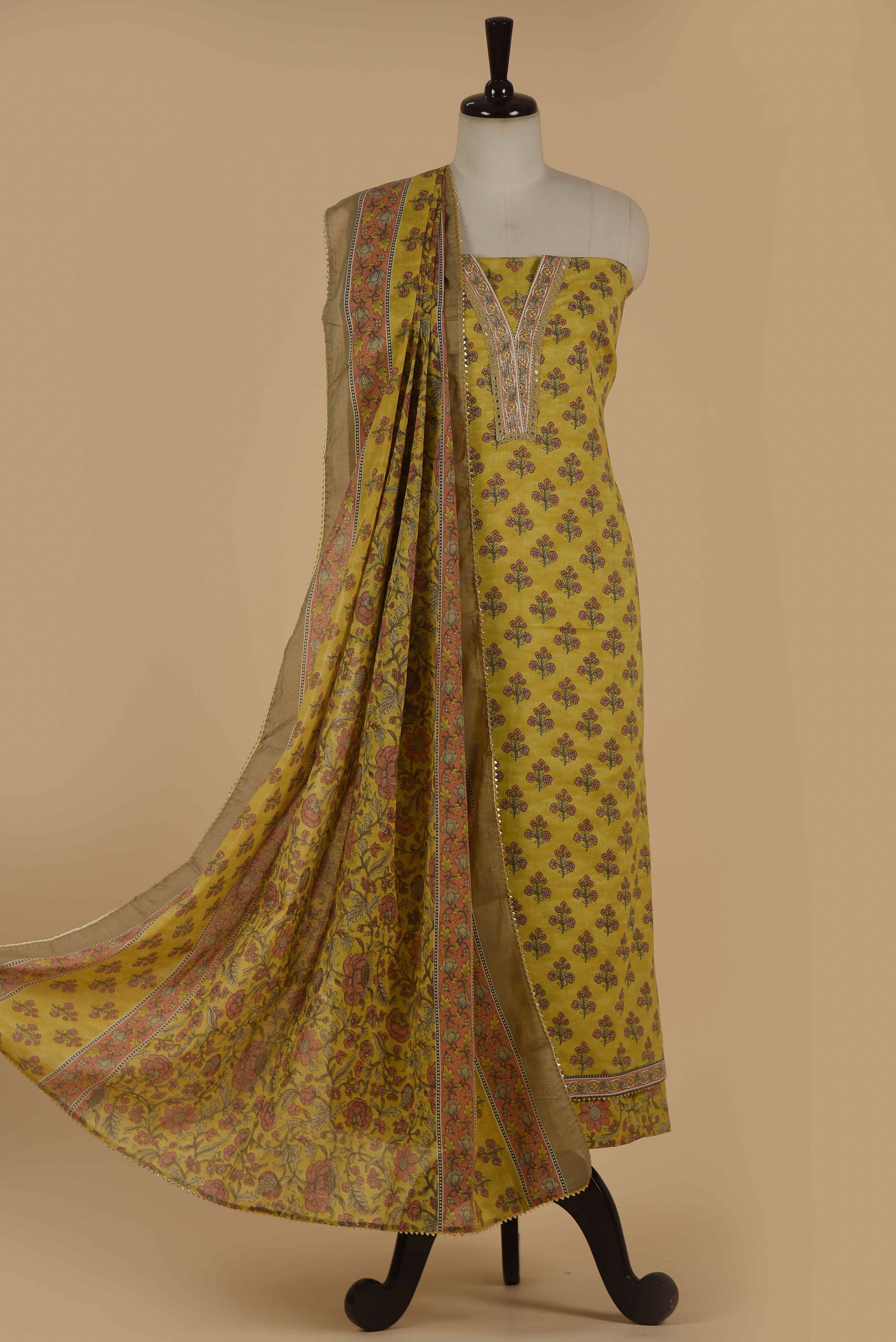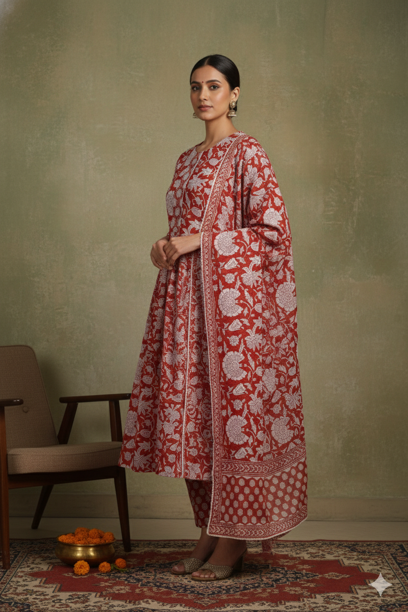 Red Mul chanderi Embroidered Unstitched Suit Fabric Set With Mul Chanderi Embroidered Dupatta
