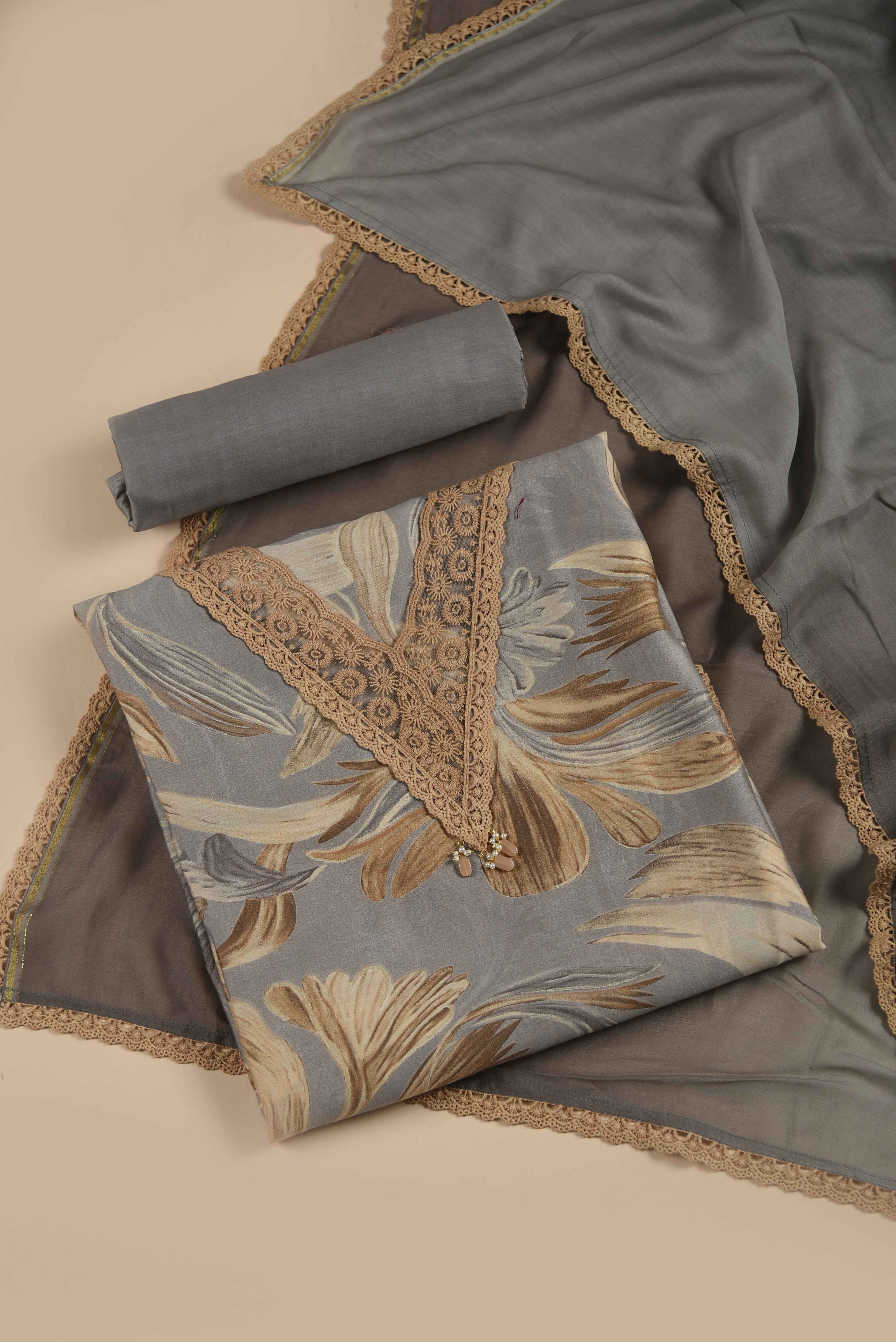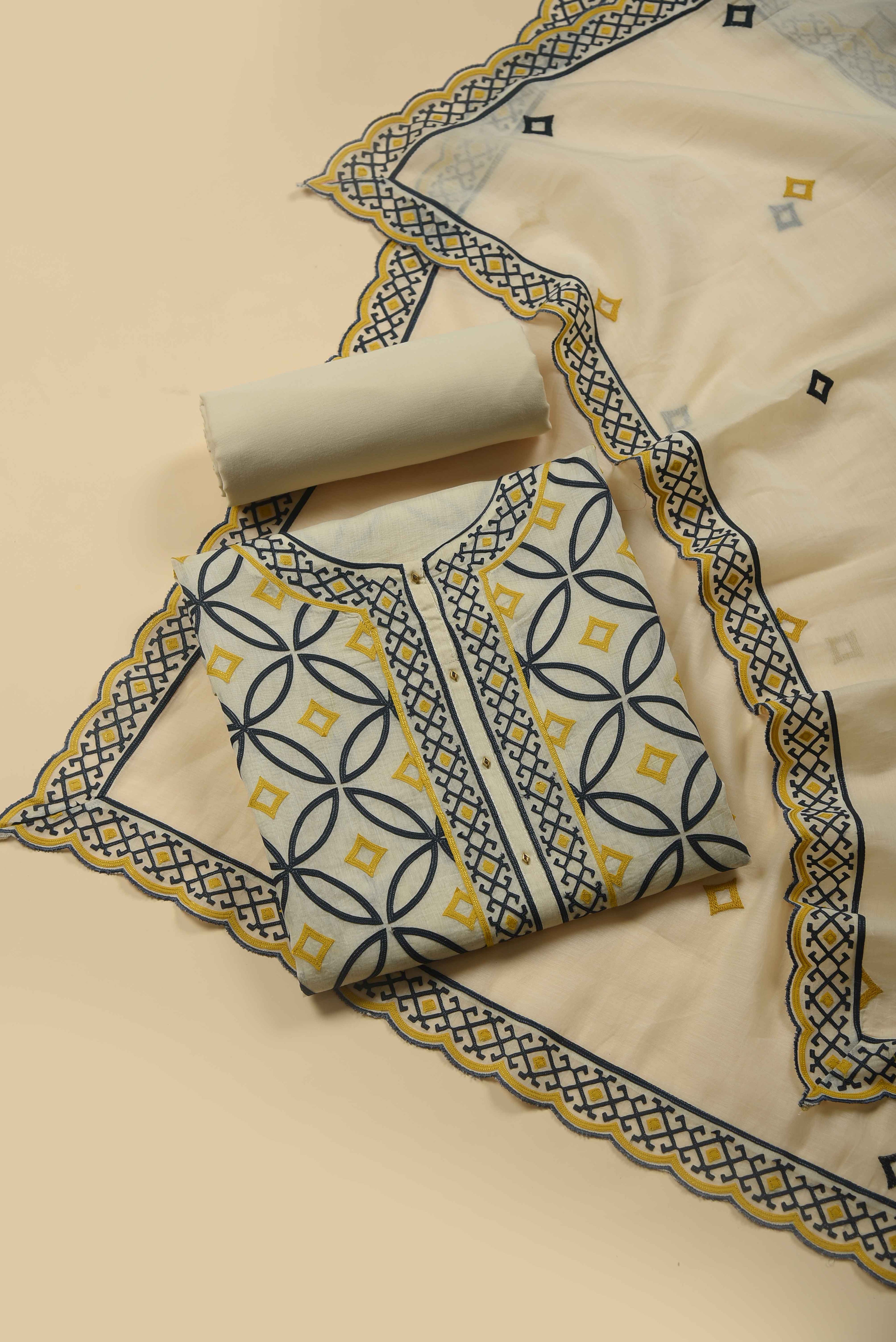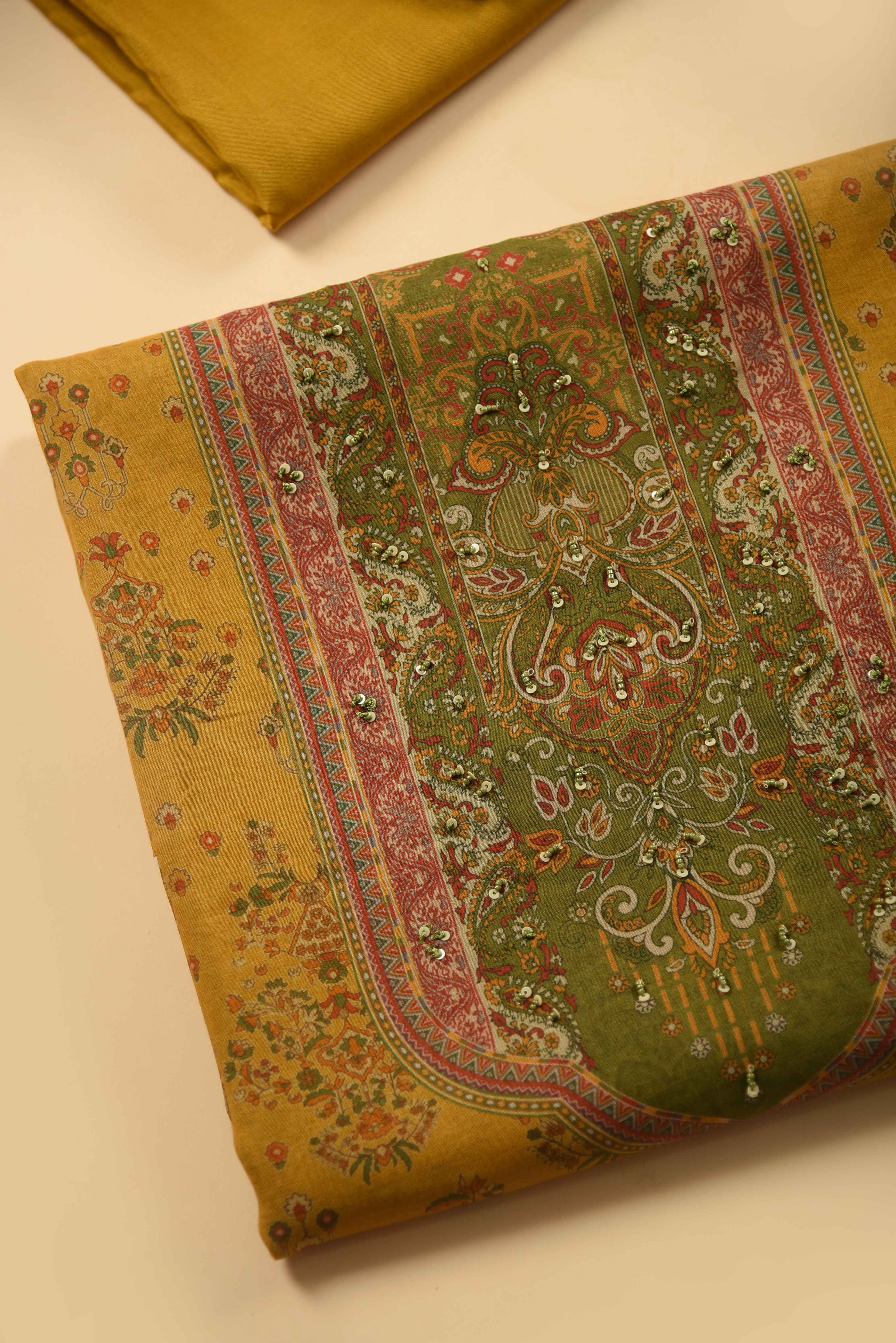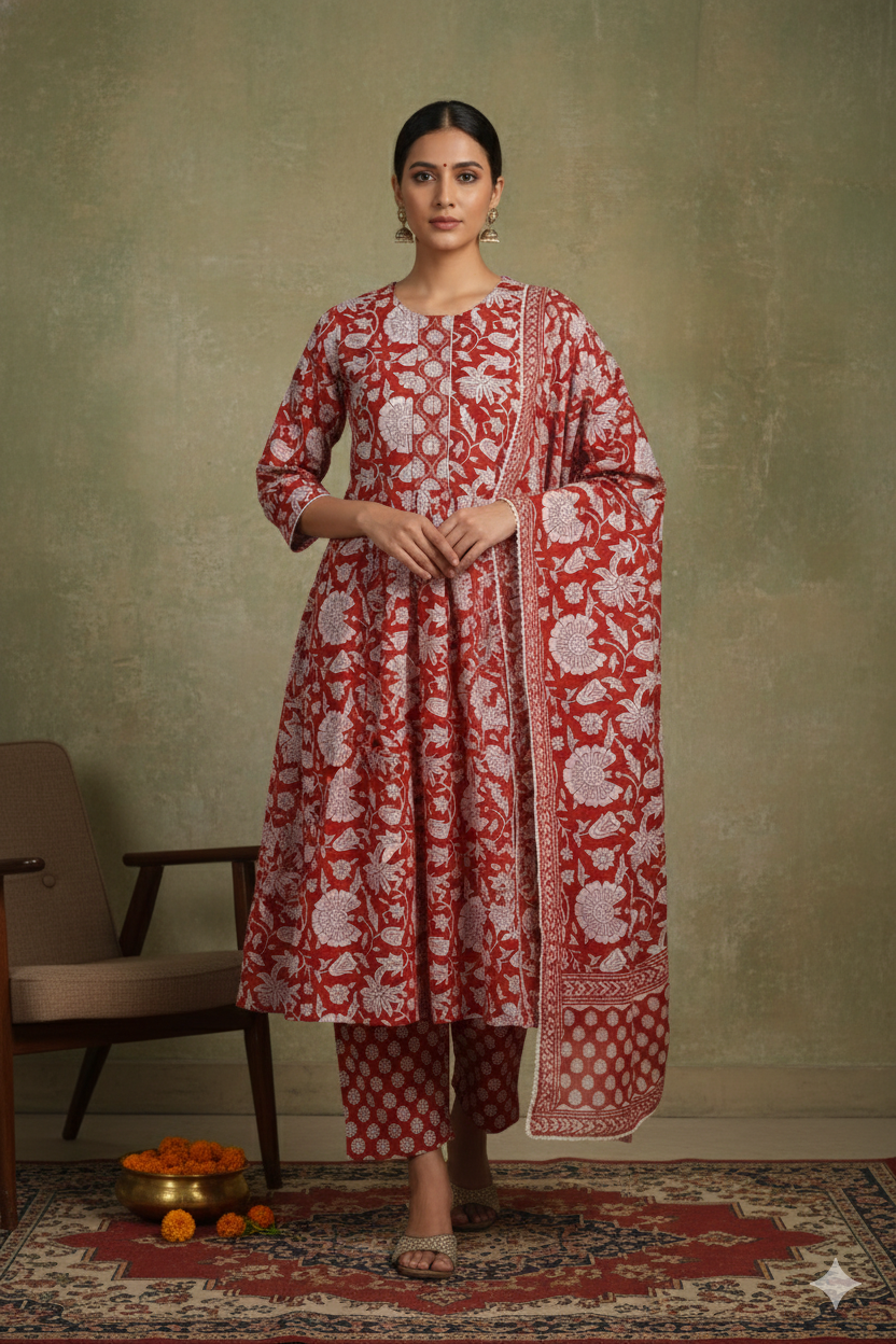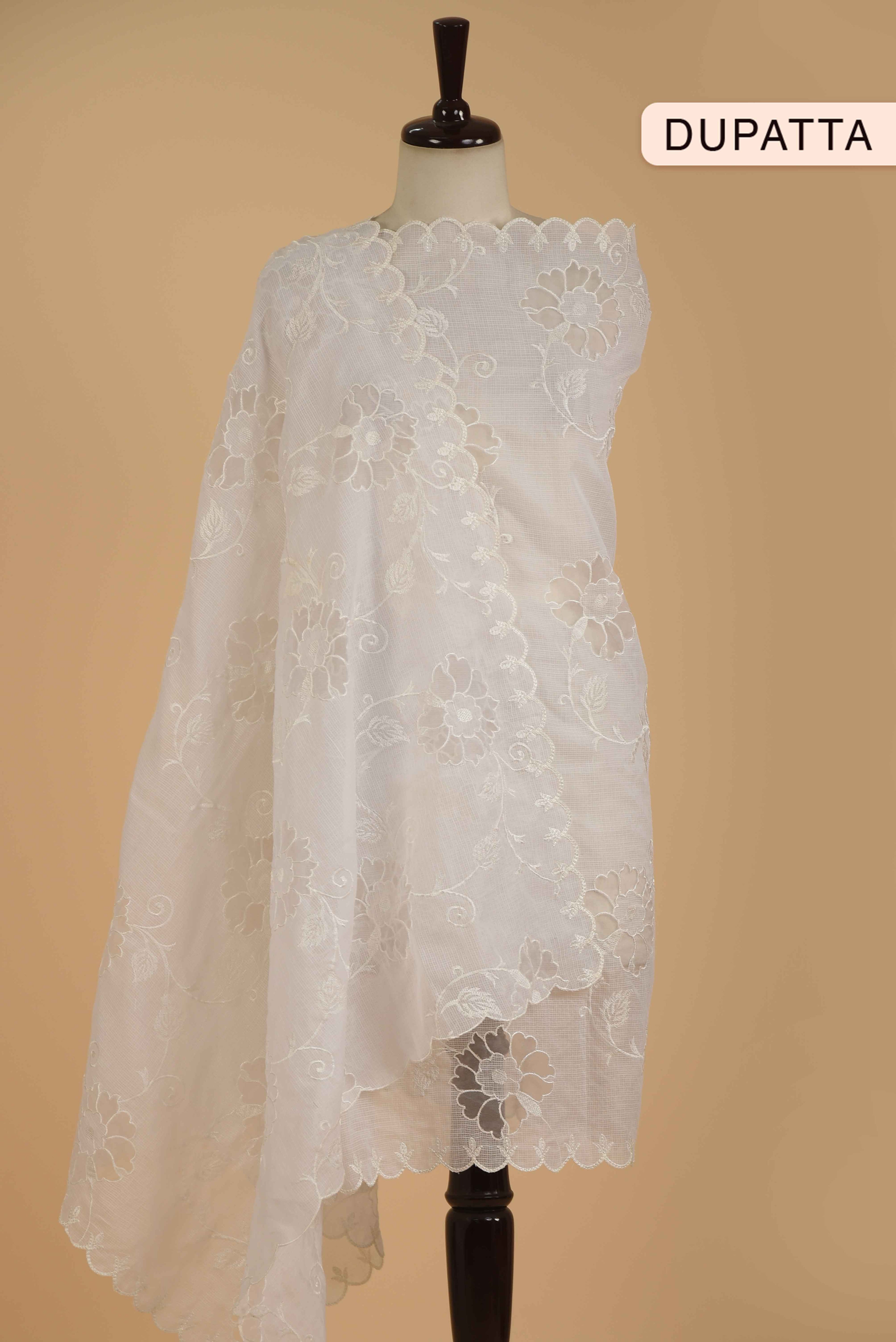 Red Mul chanderi Embroidered Unstitched Suit Fabric Set With Mul Chanderi Embroidered Dupatta