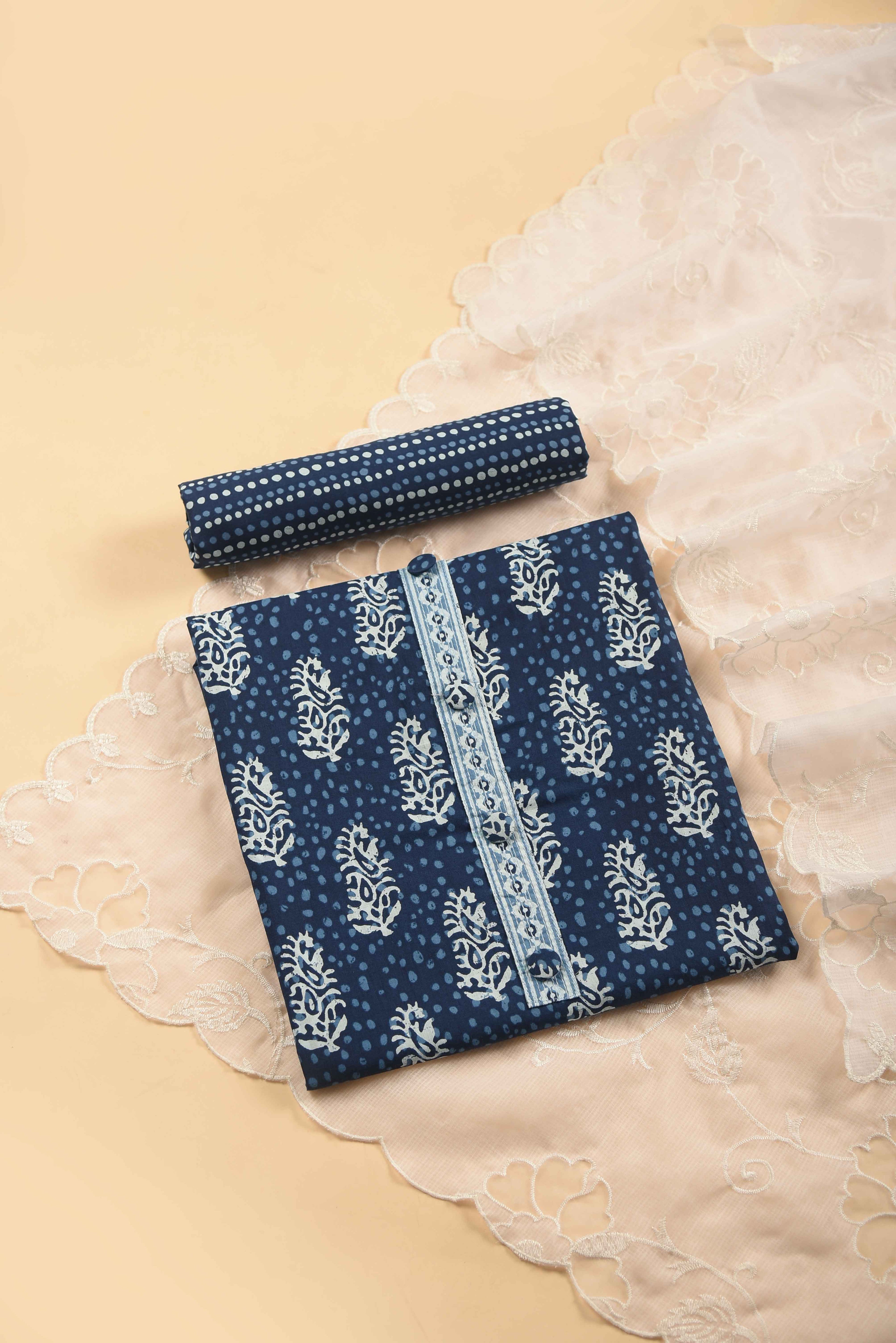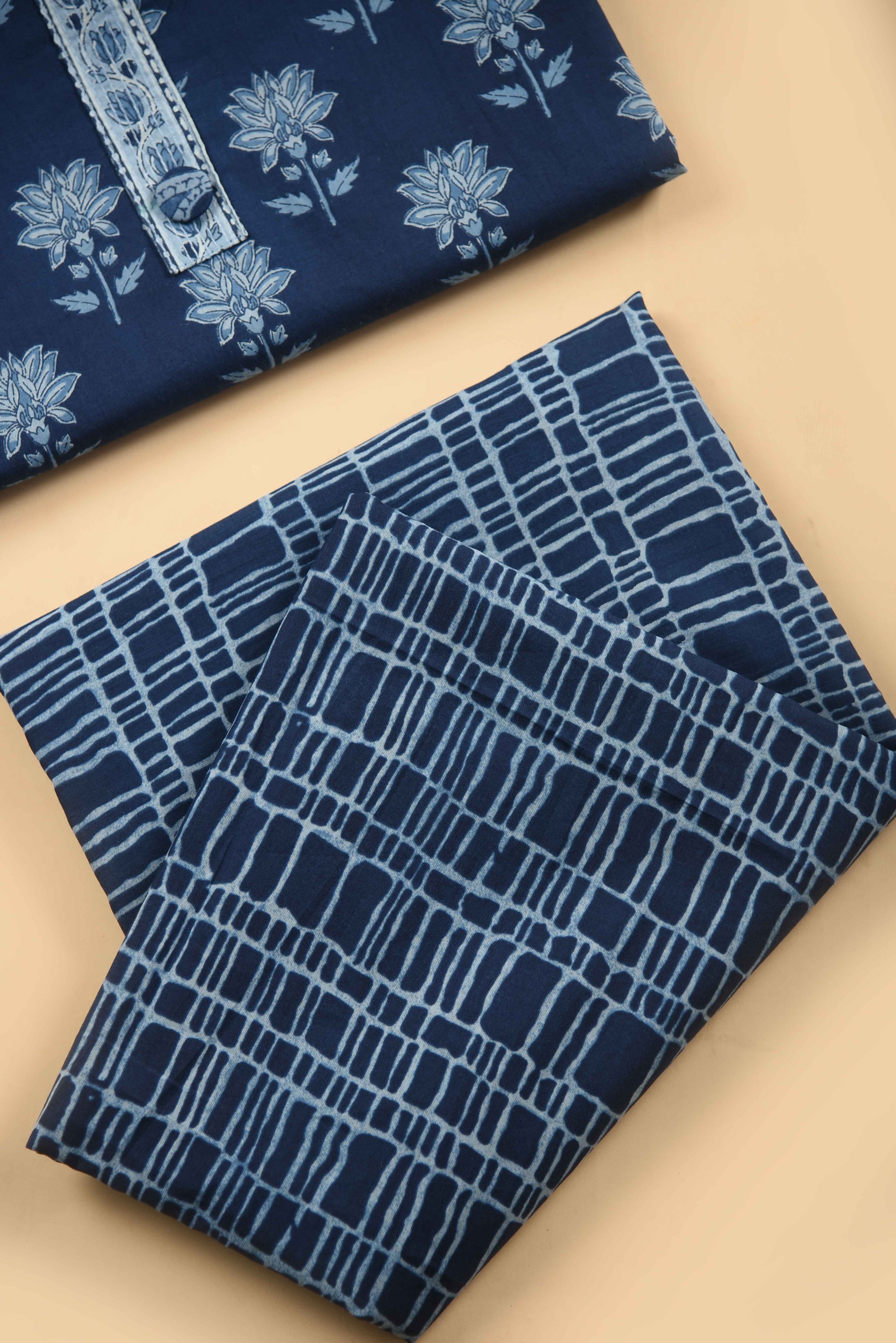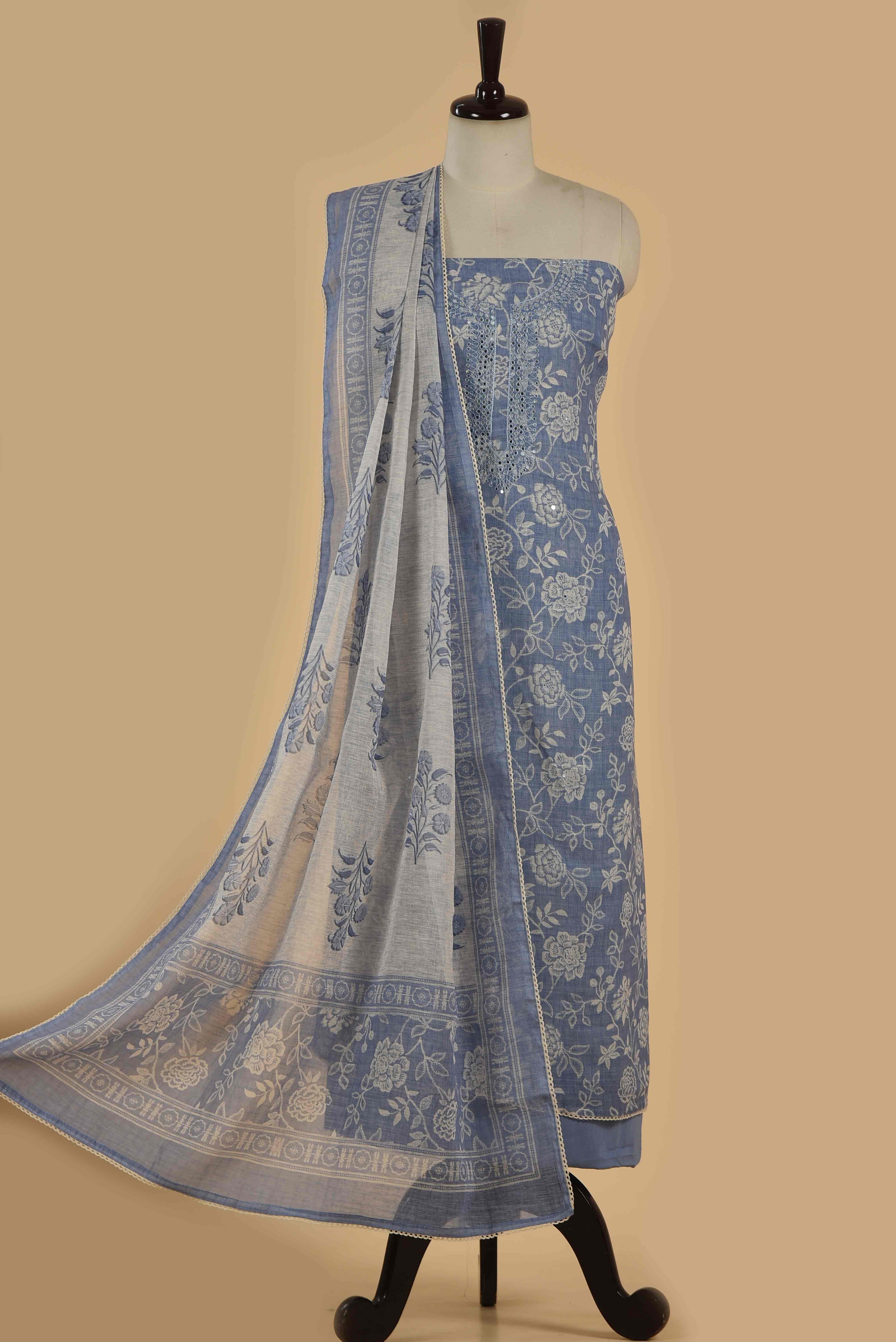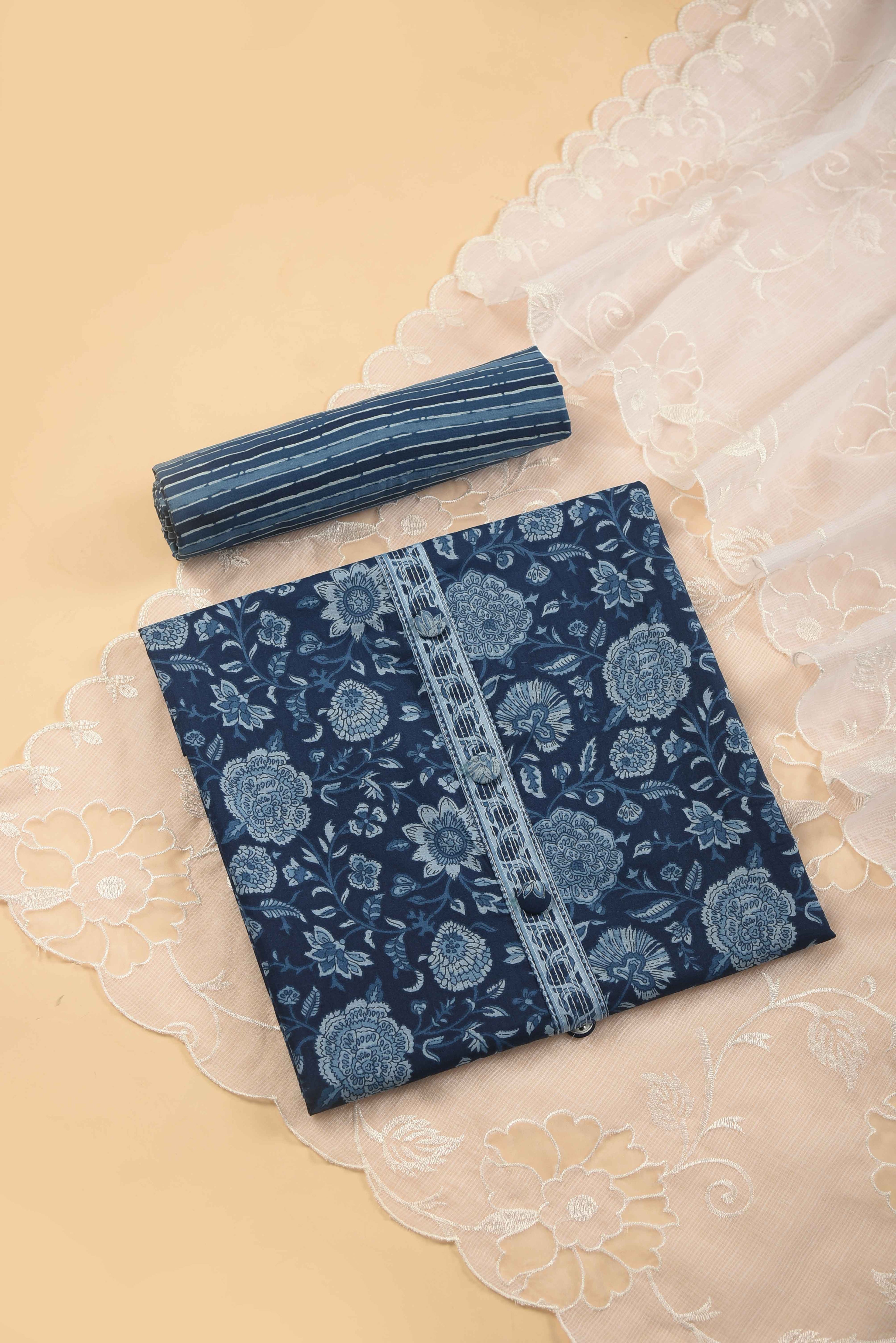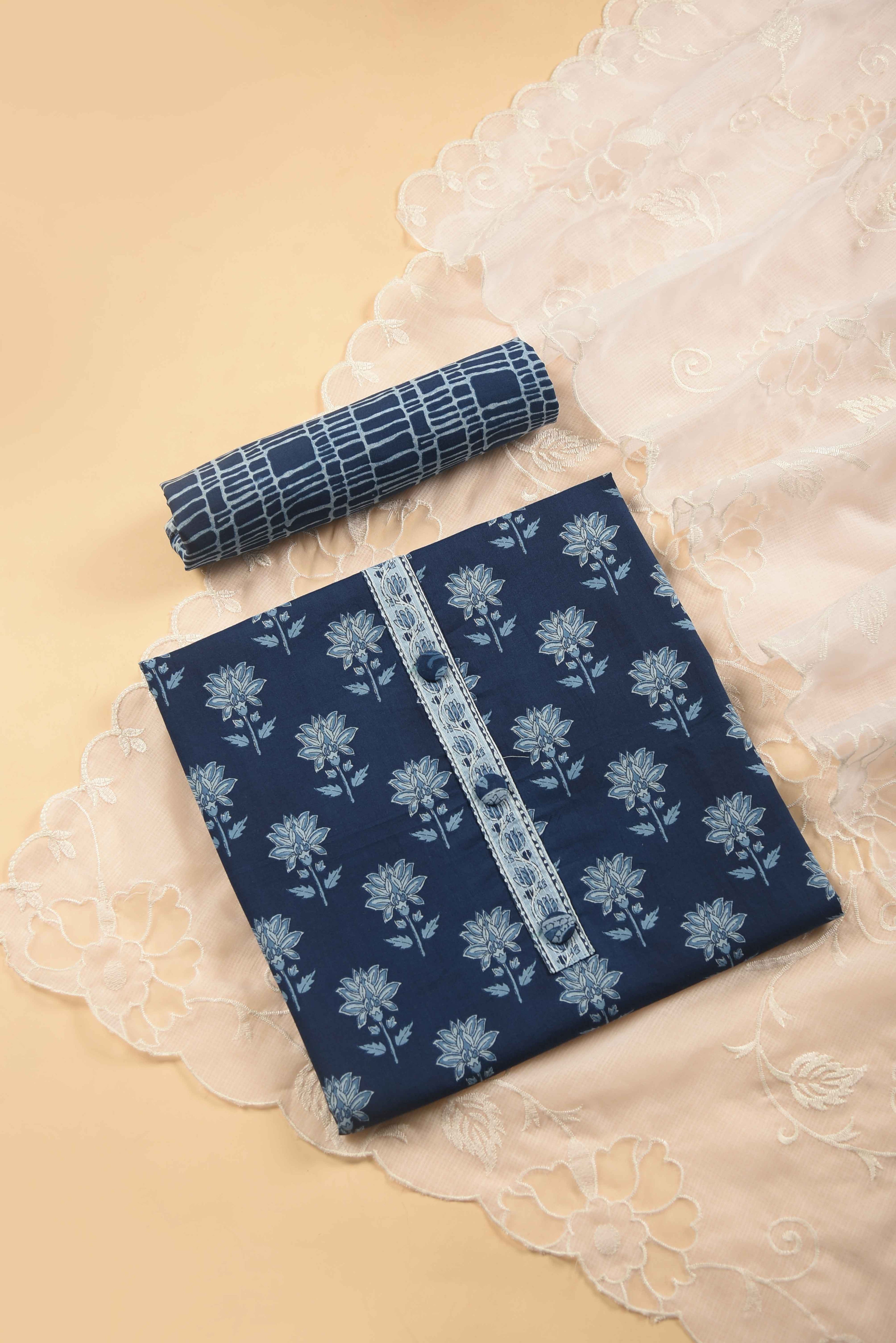 Blue Pure Cotton Printed With Lace Work Unstitched Suit Fabric Set With Cotton Printed Dupatta