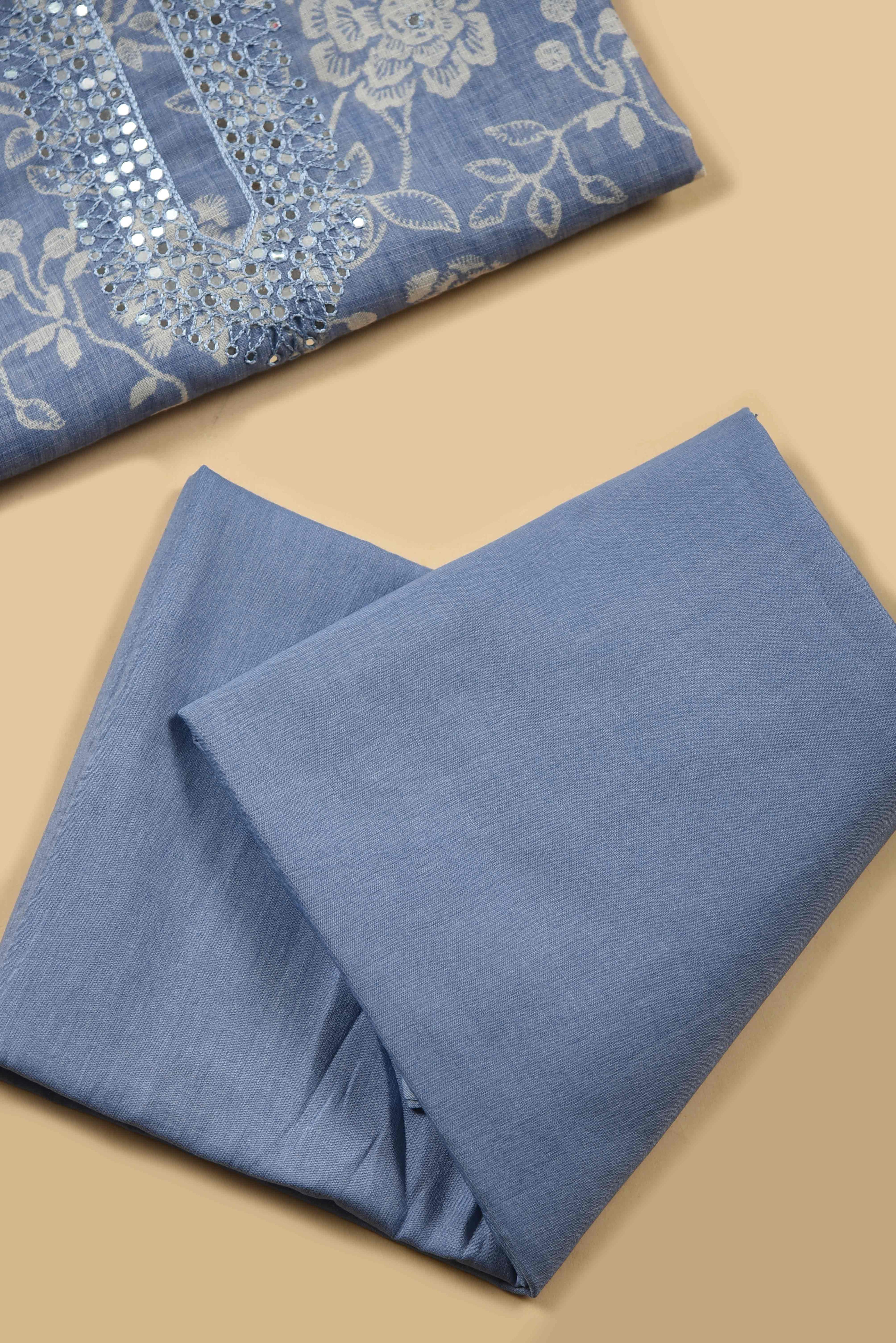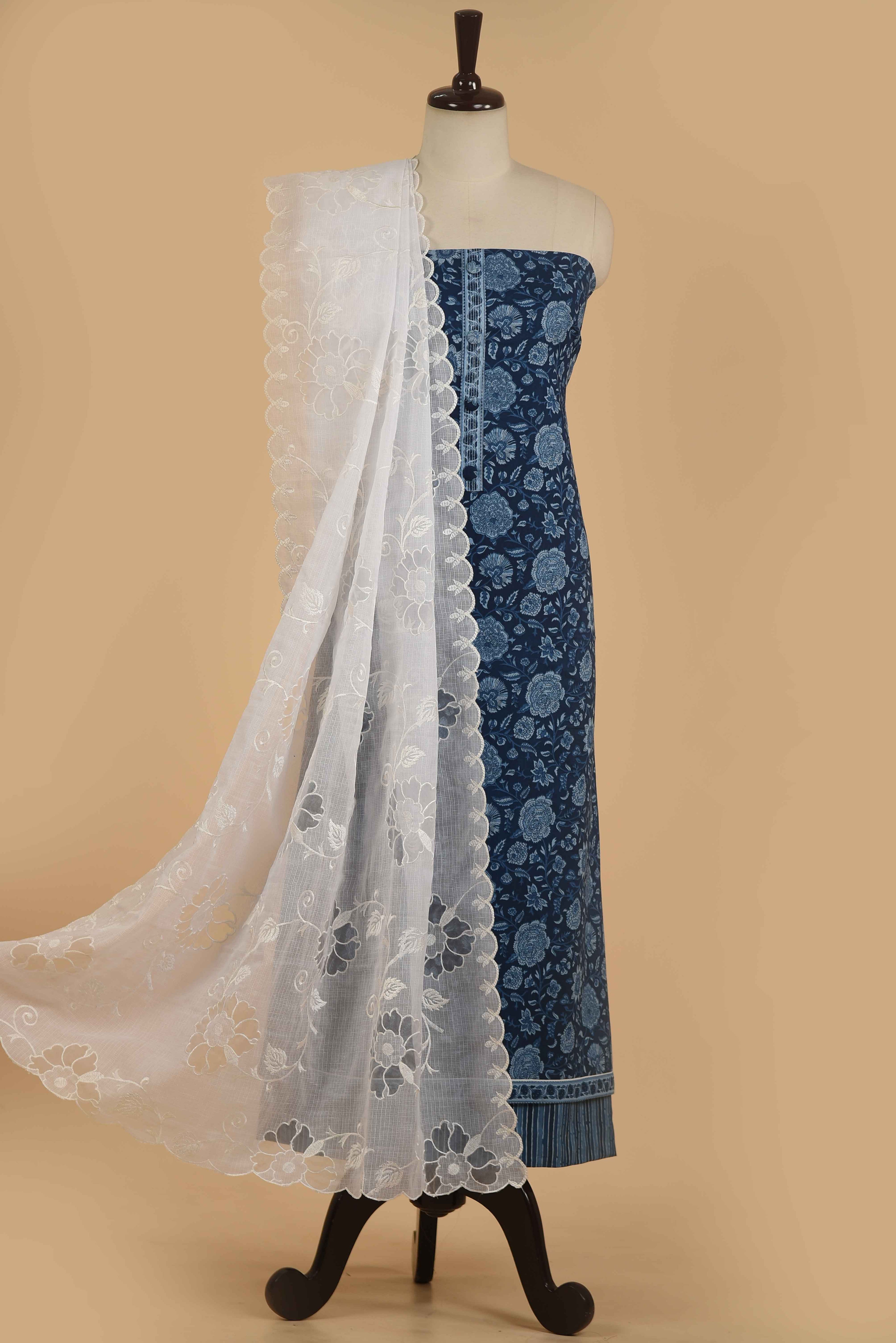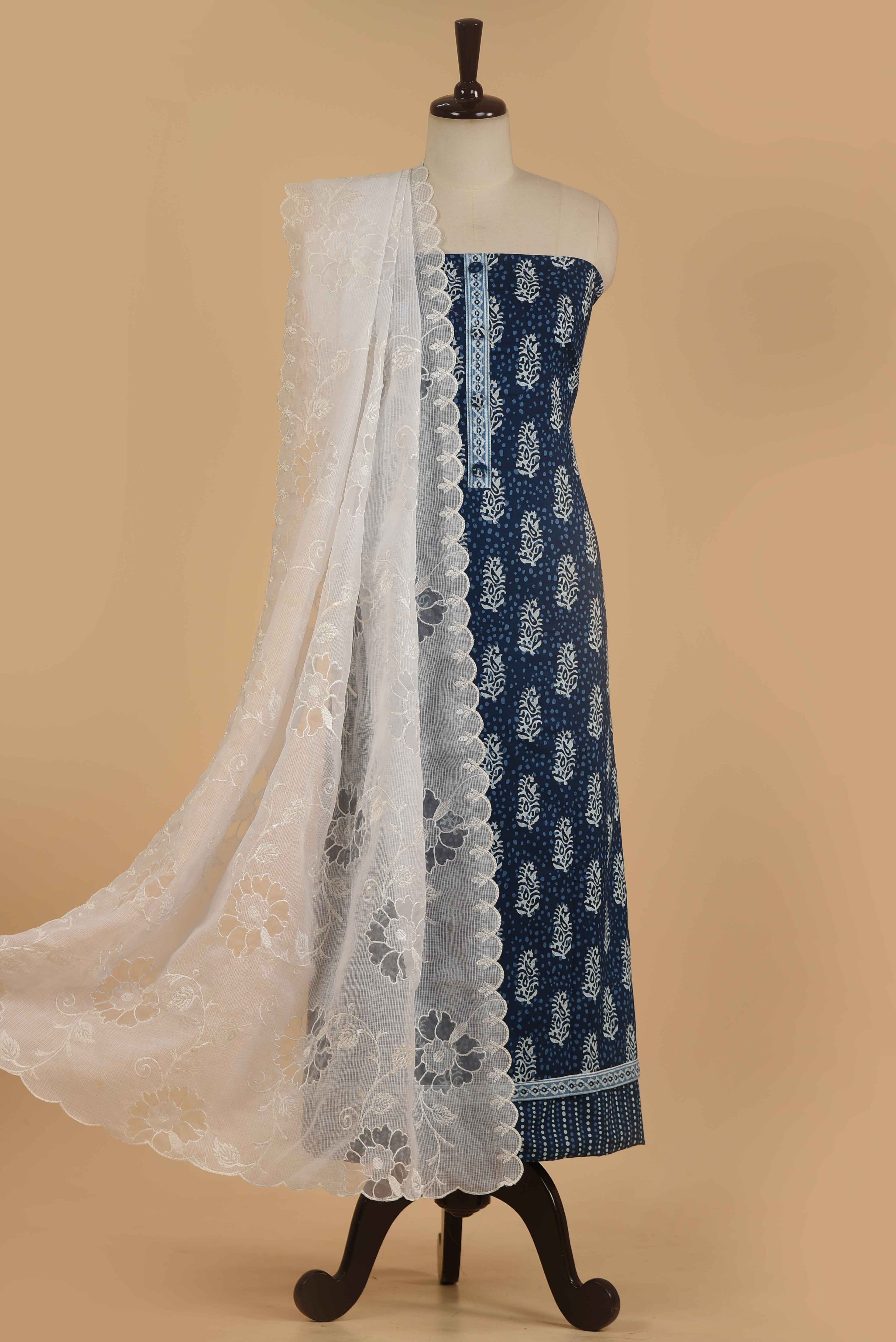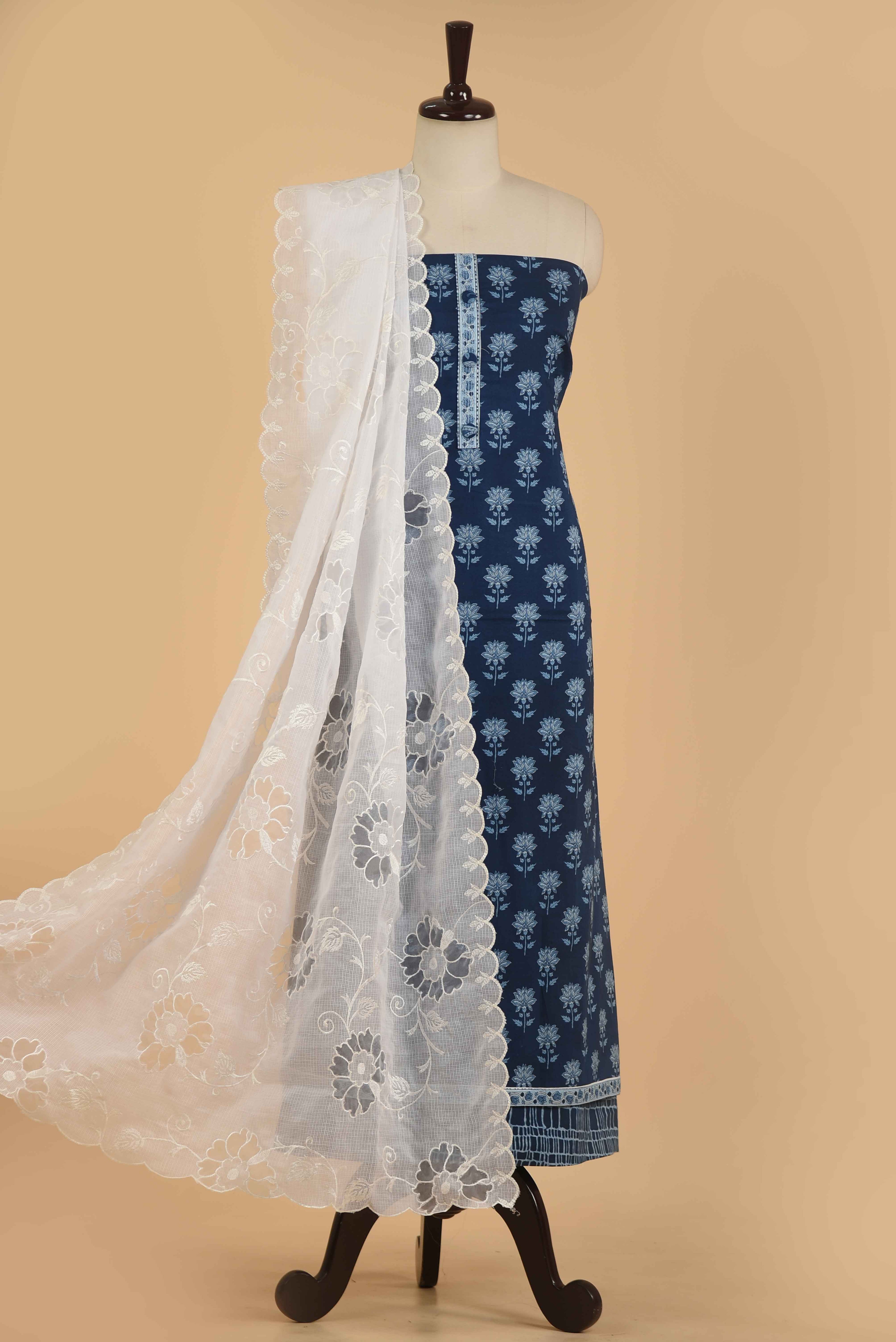 Blue Pure Cotton Printed With Lace Work Unstitched Suit Fabric Set With Cotton Printed Dupatta
