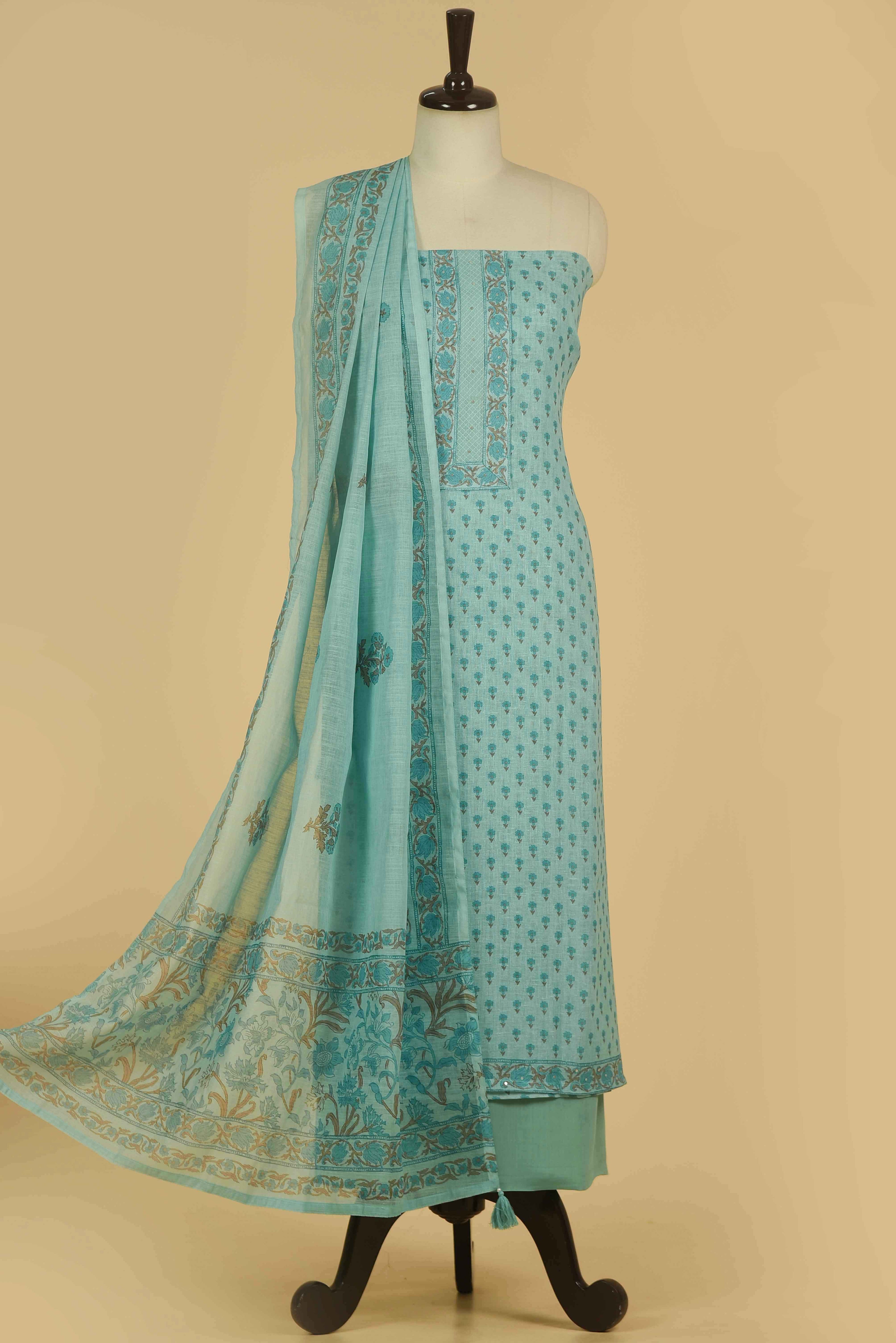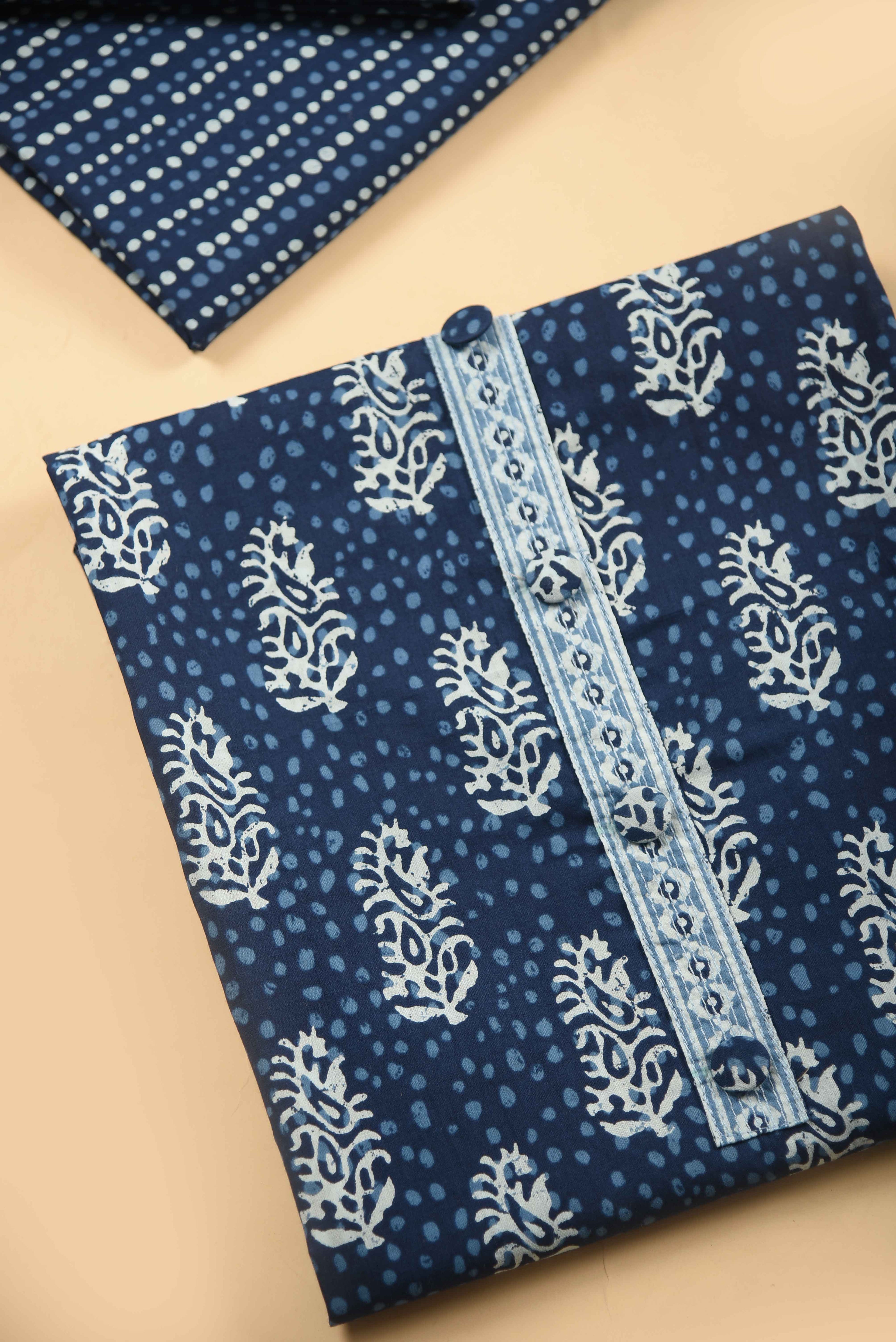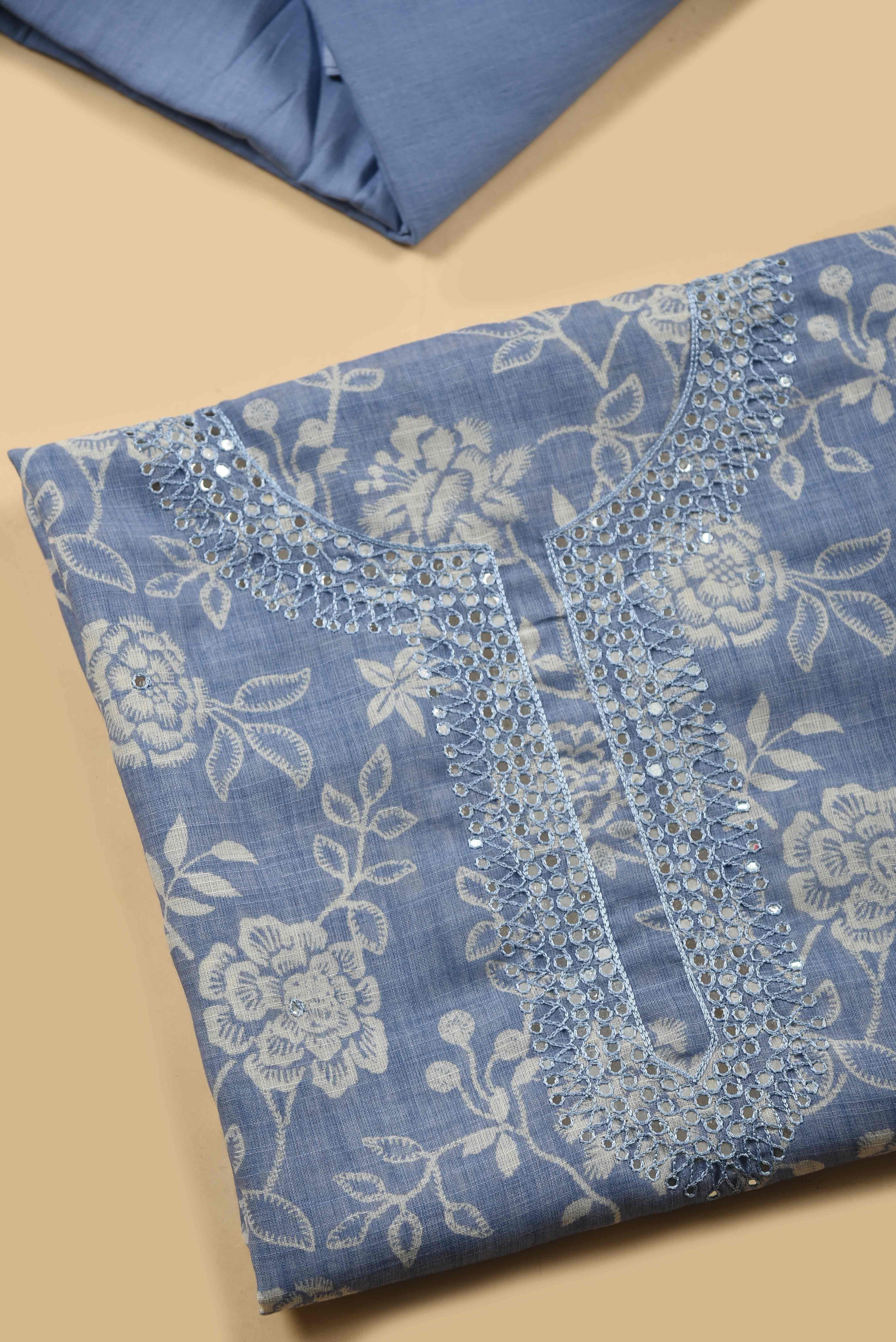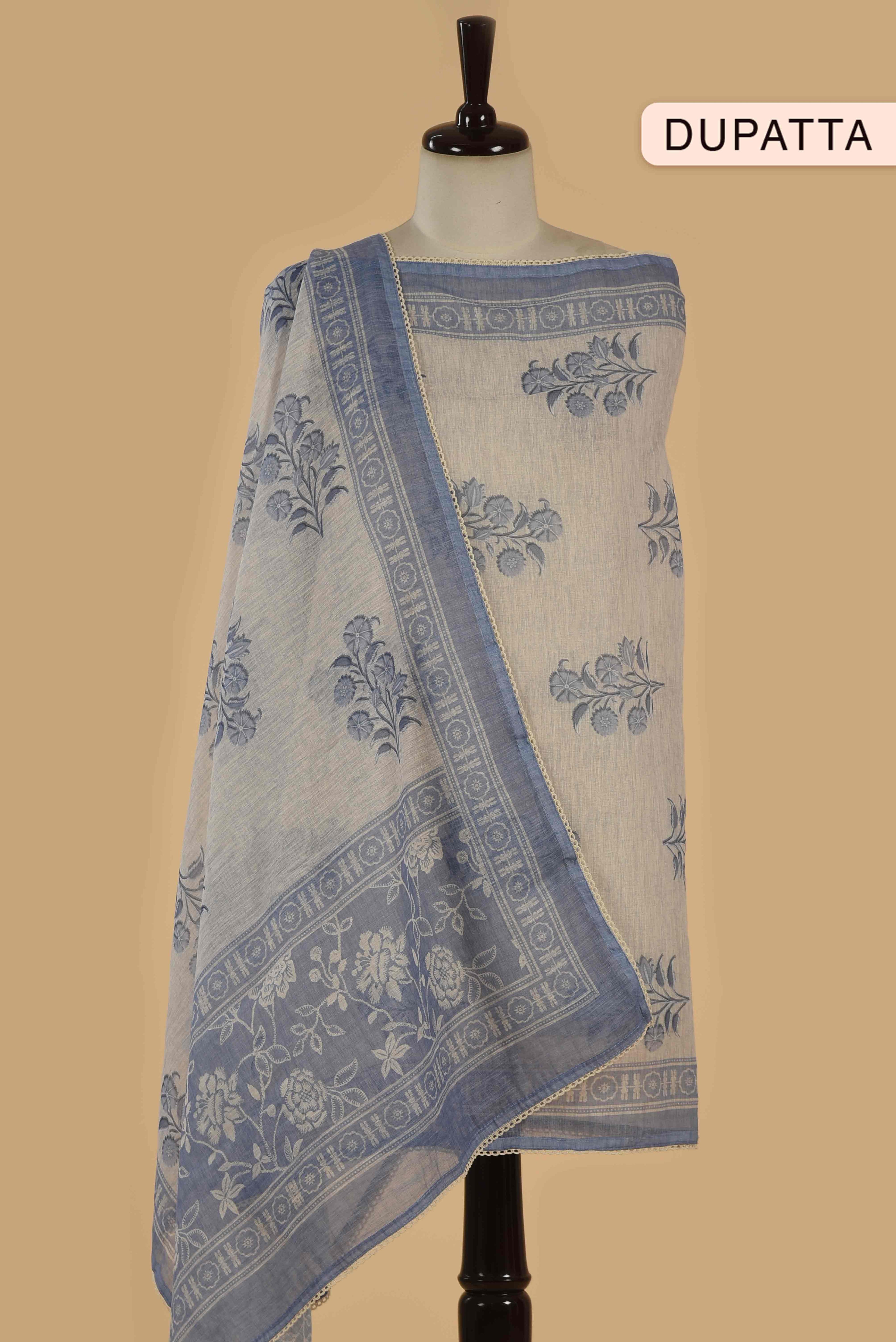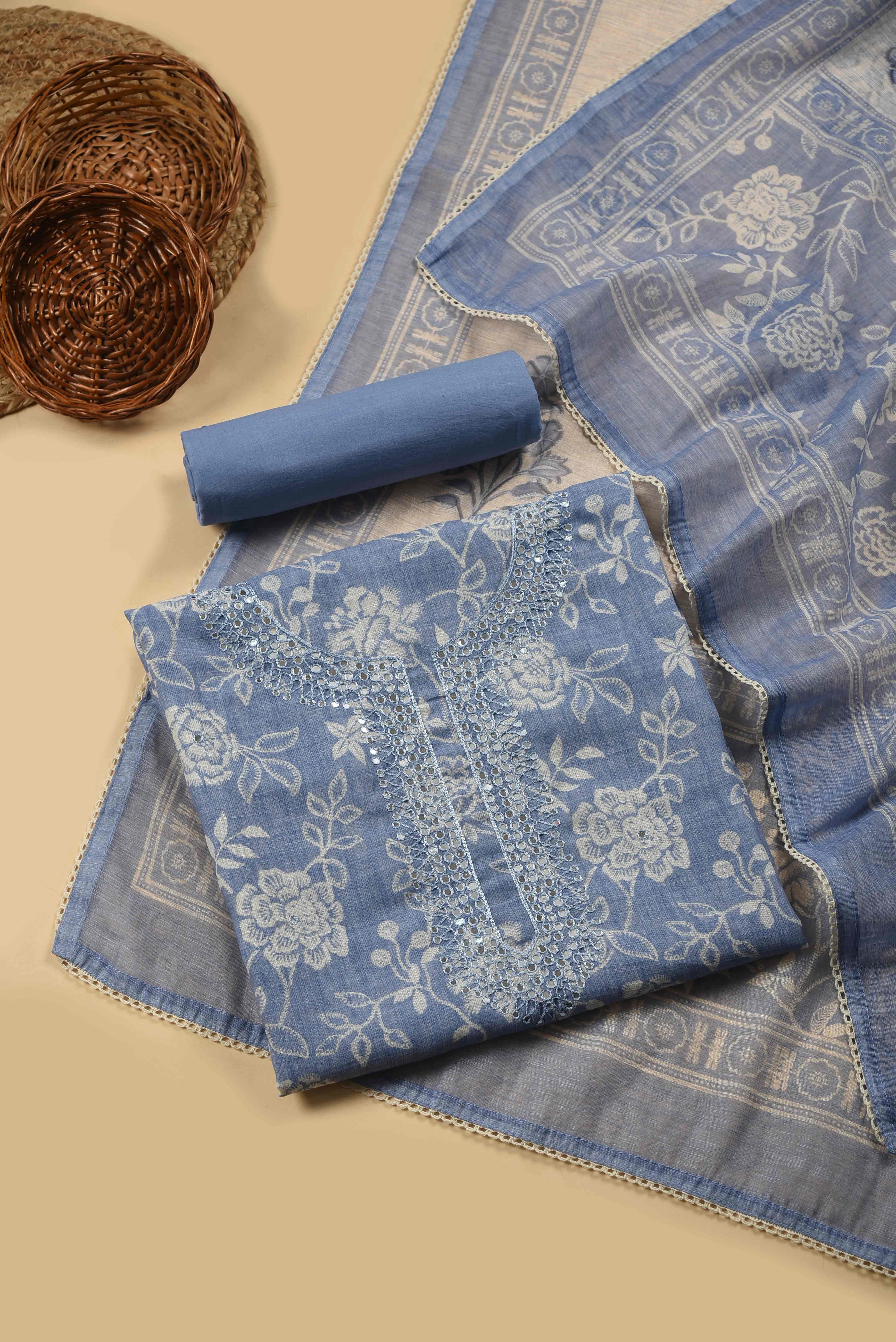 Blue Pure Cotton Printed With Lace Work Unstitched Suit Fabric Set With Cotton Printed Dupatta