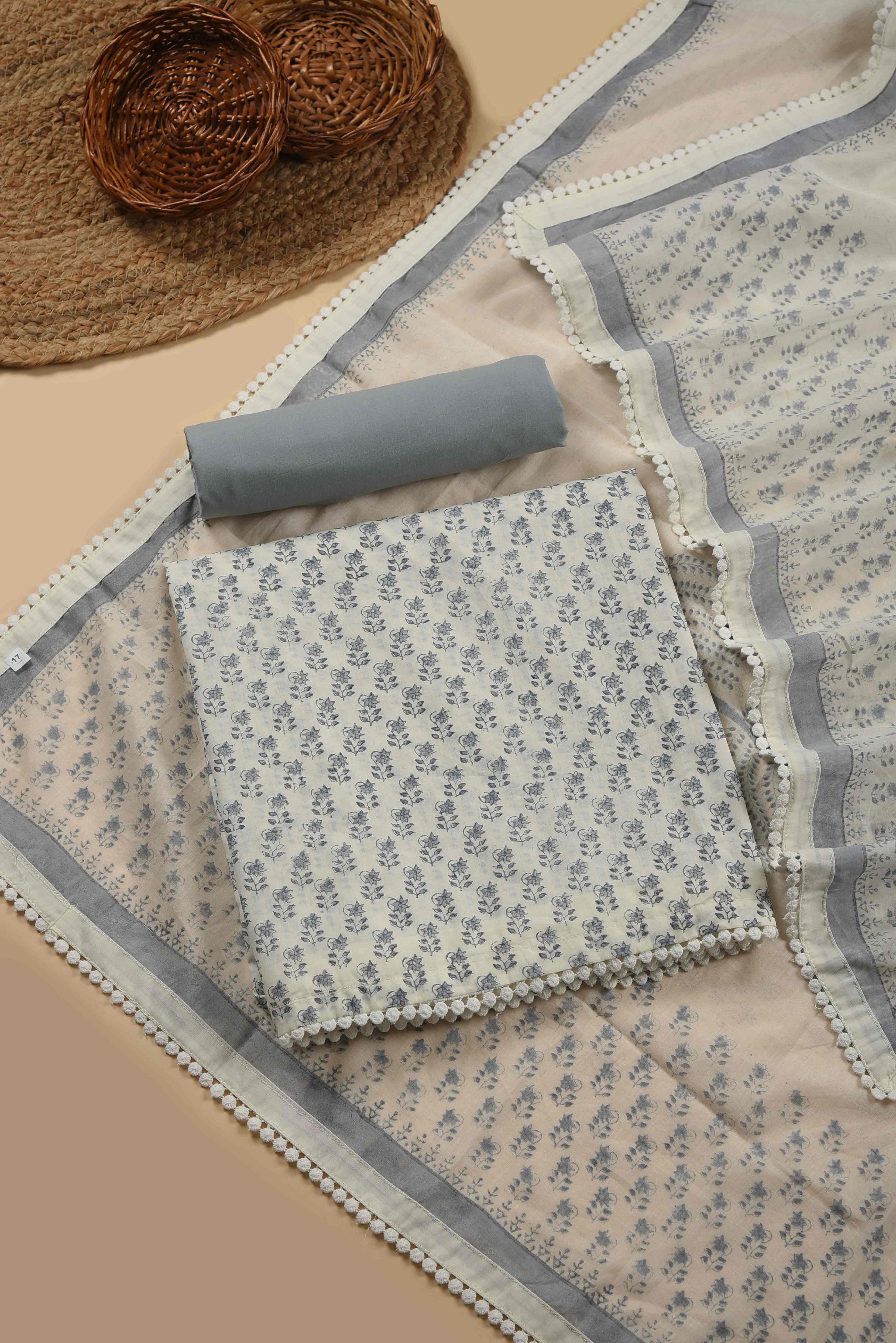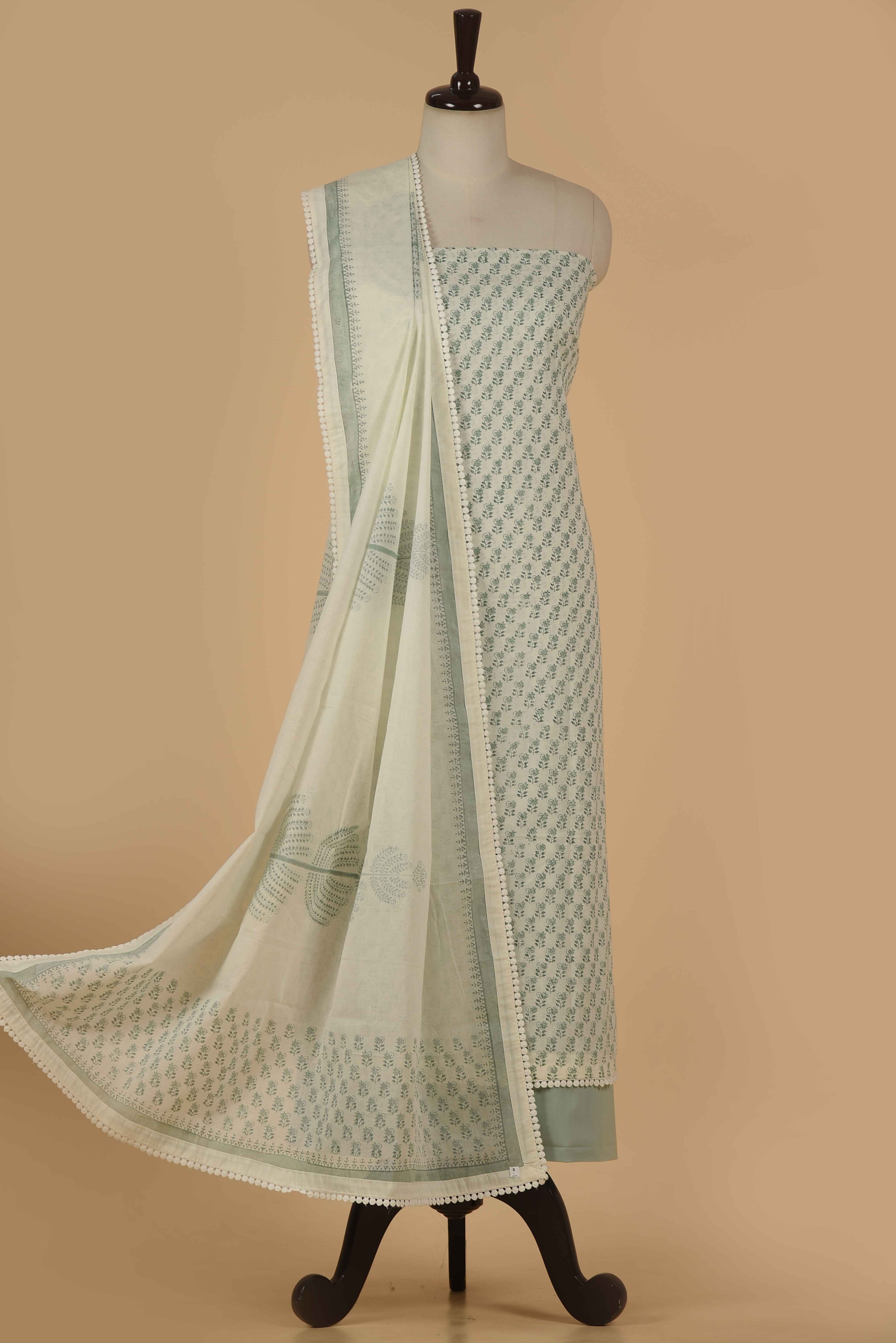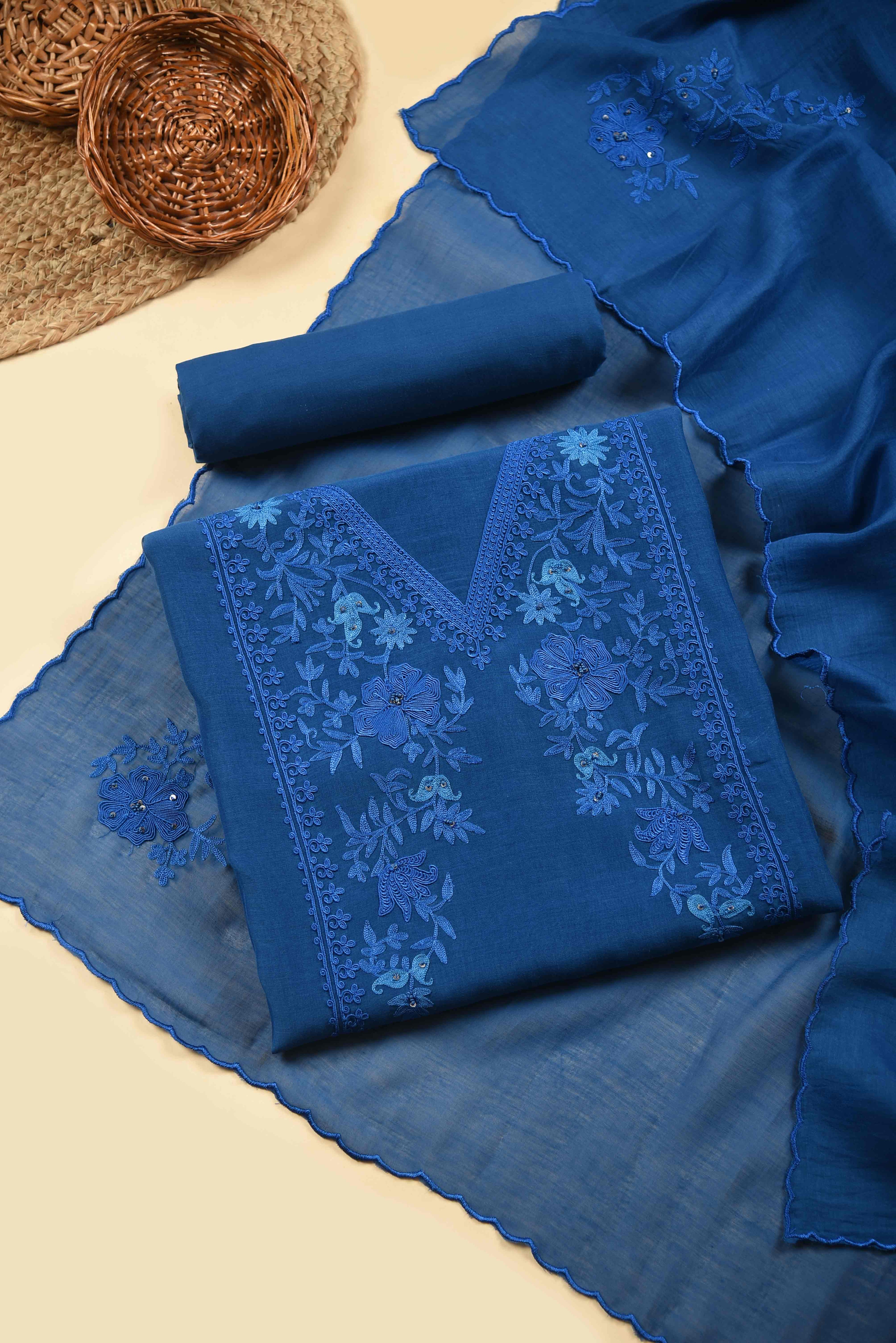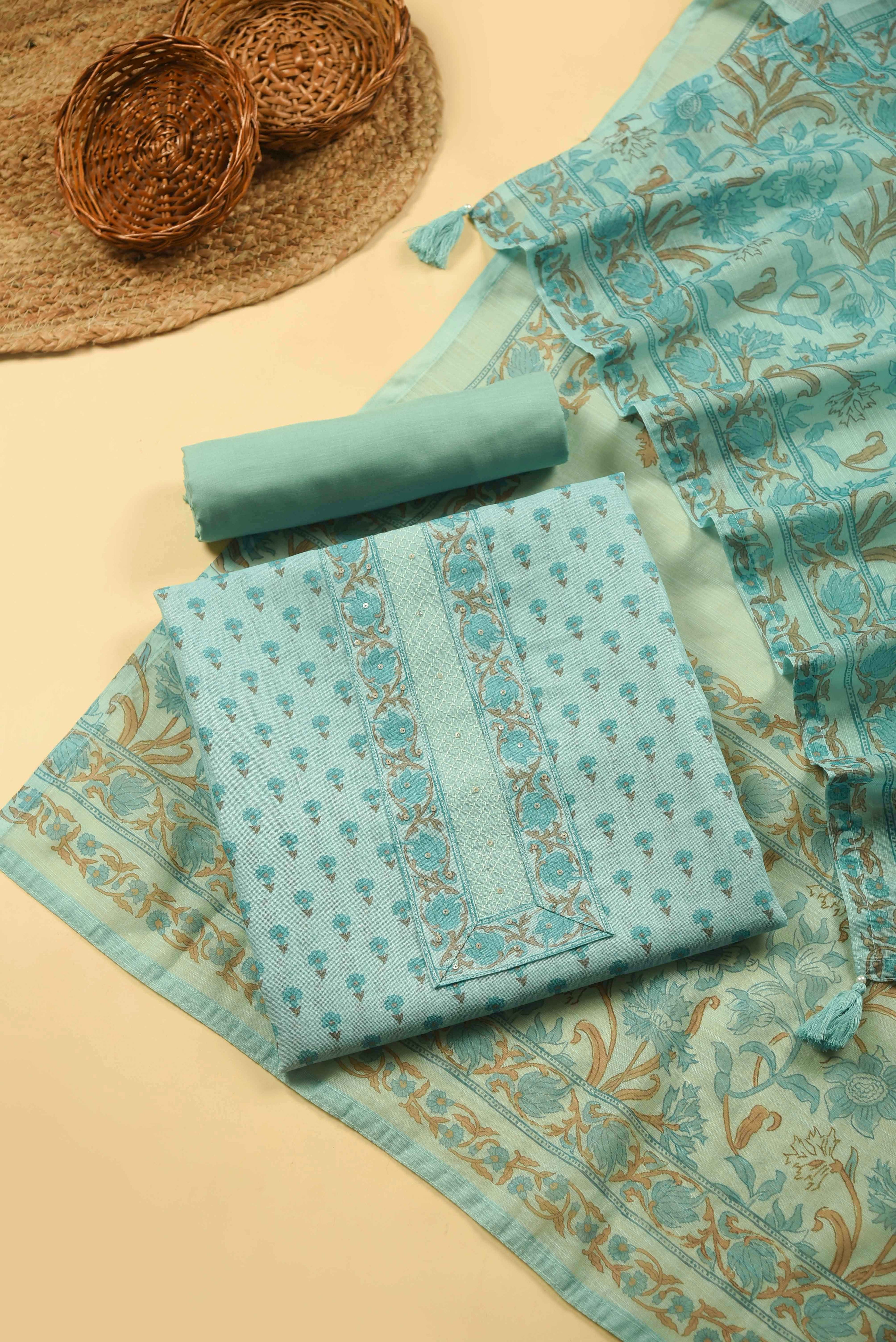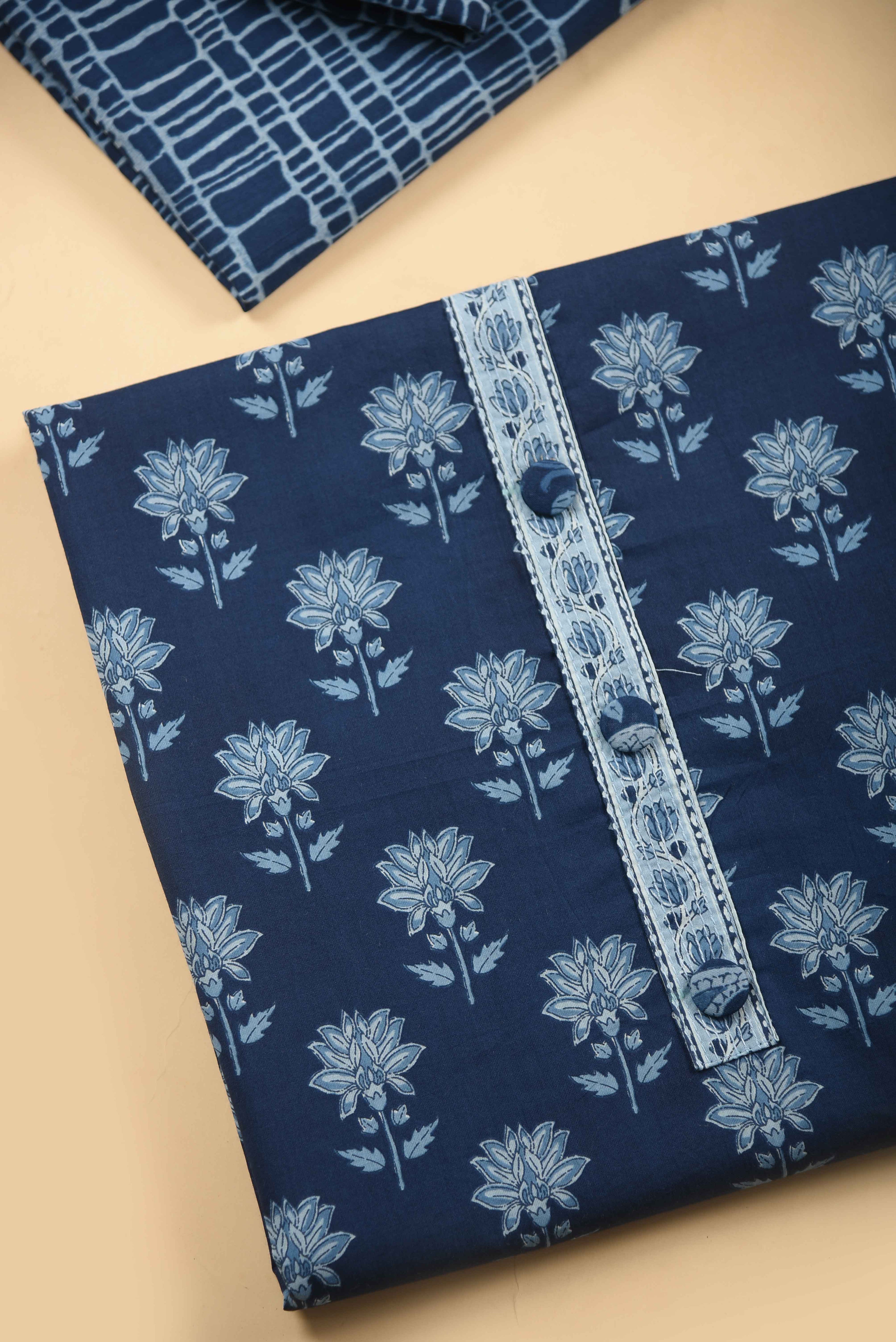Blue Pure Cotton Printed With Lace Work Unstitched Suit Fabric Set With Cotton Printed Dupatta