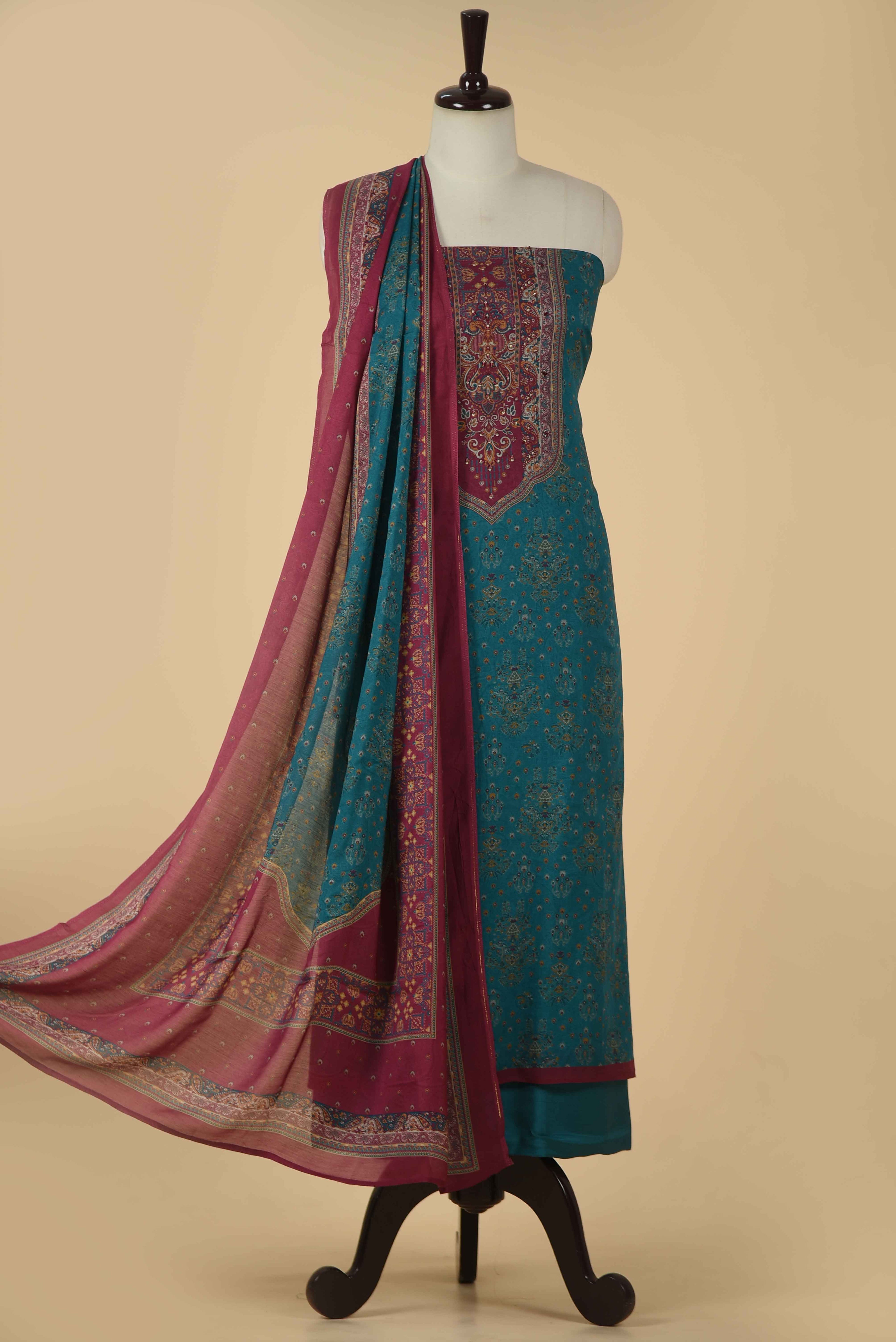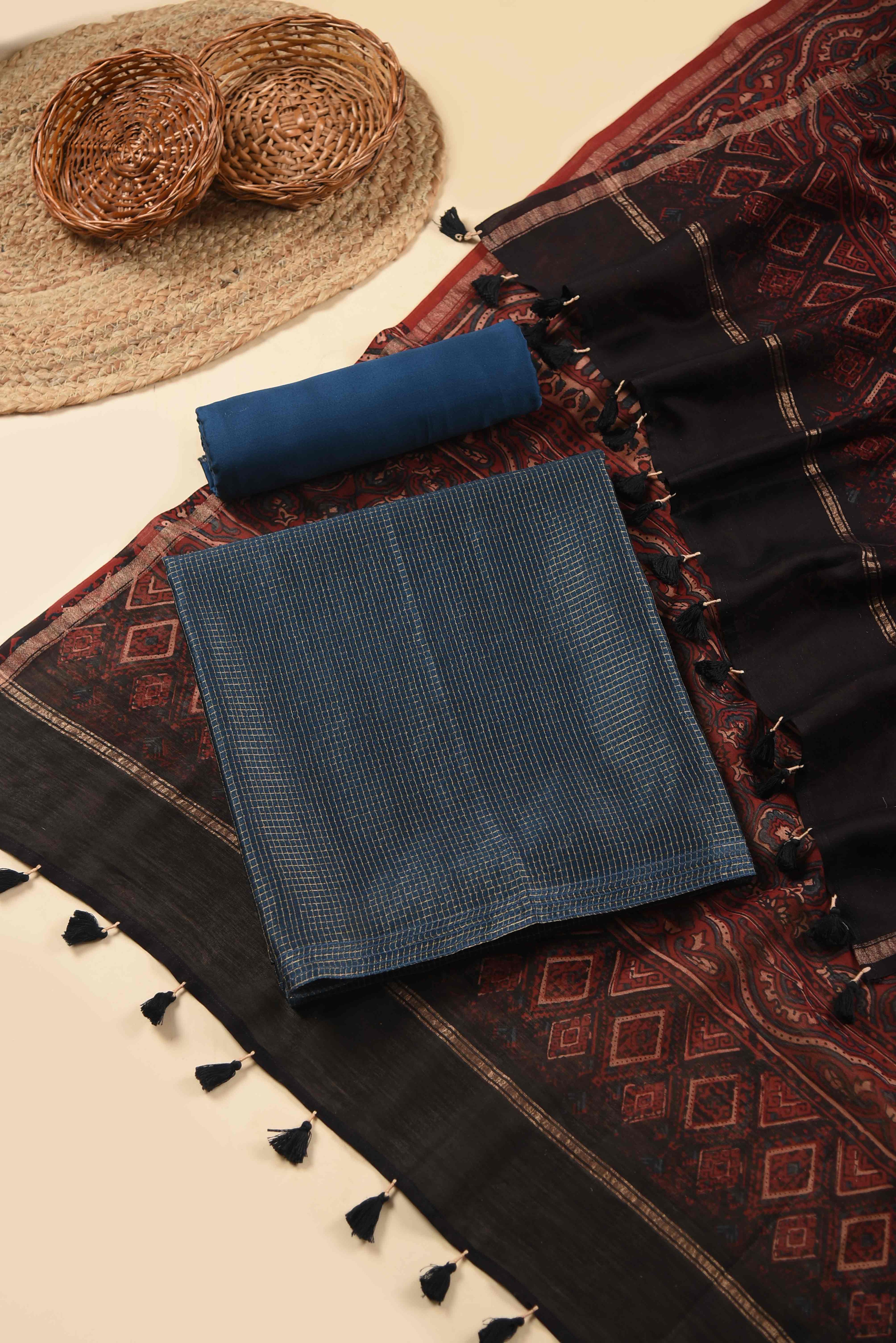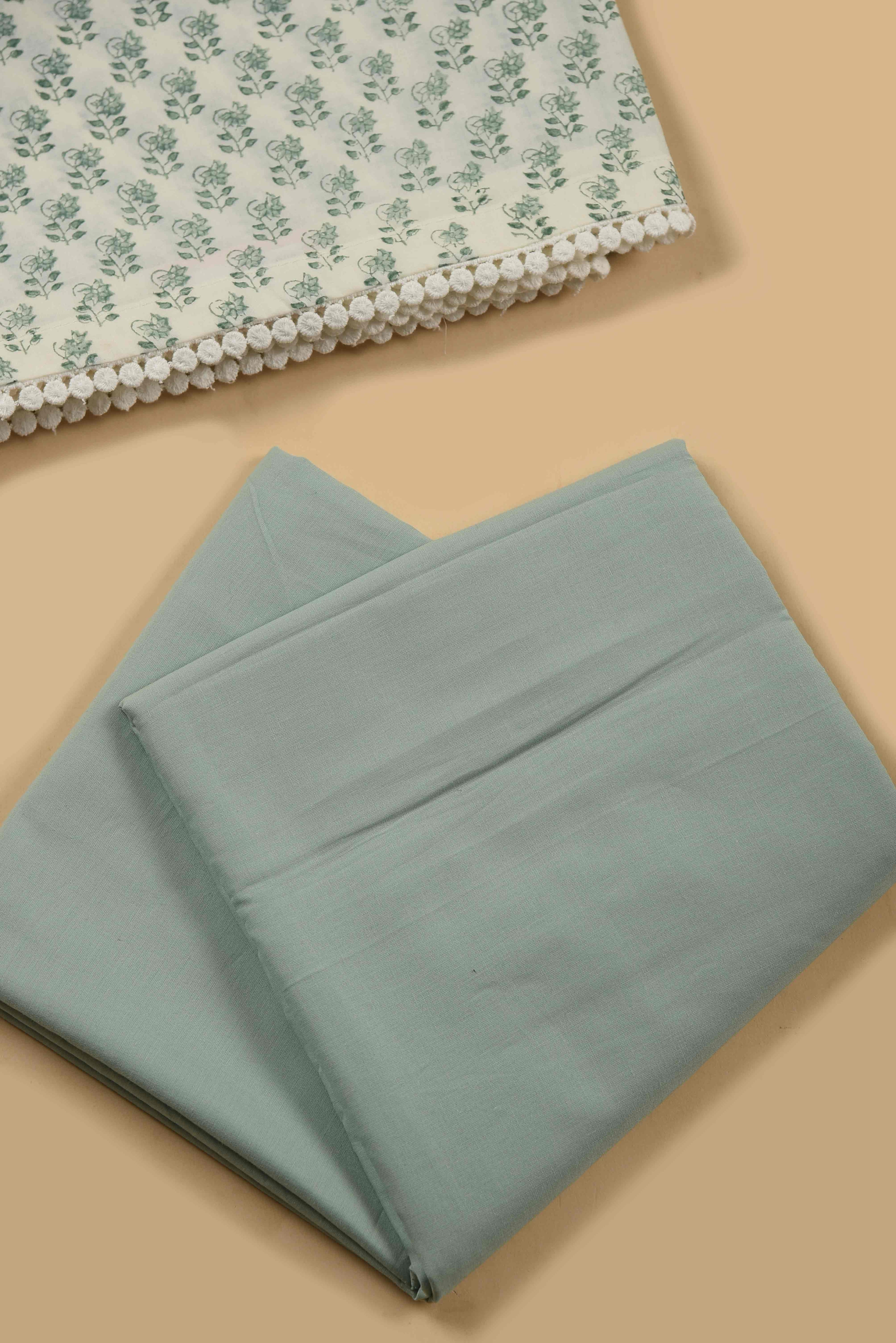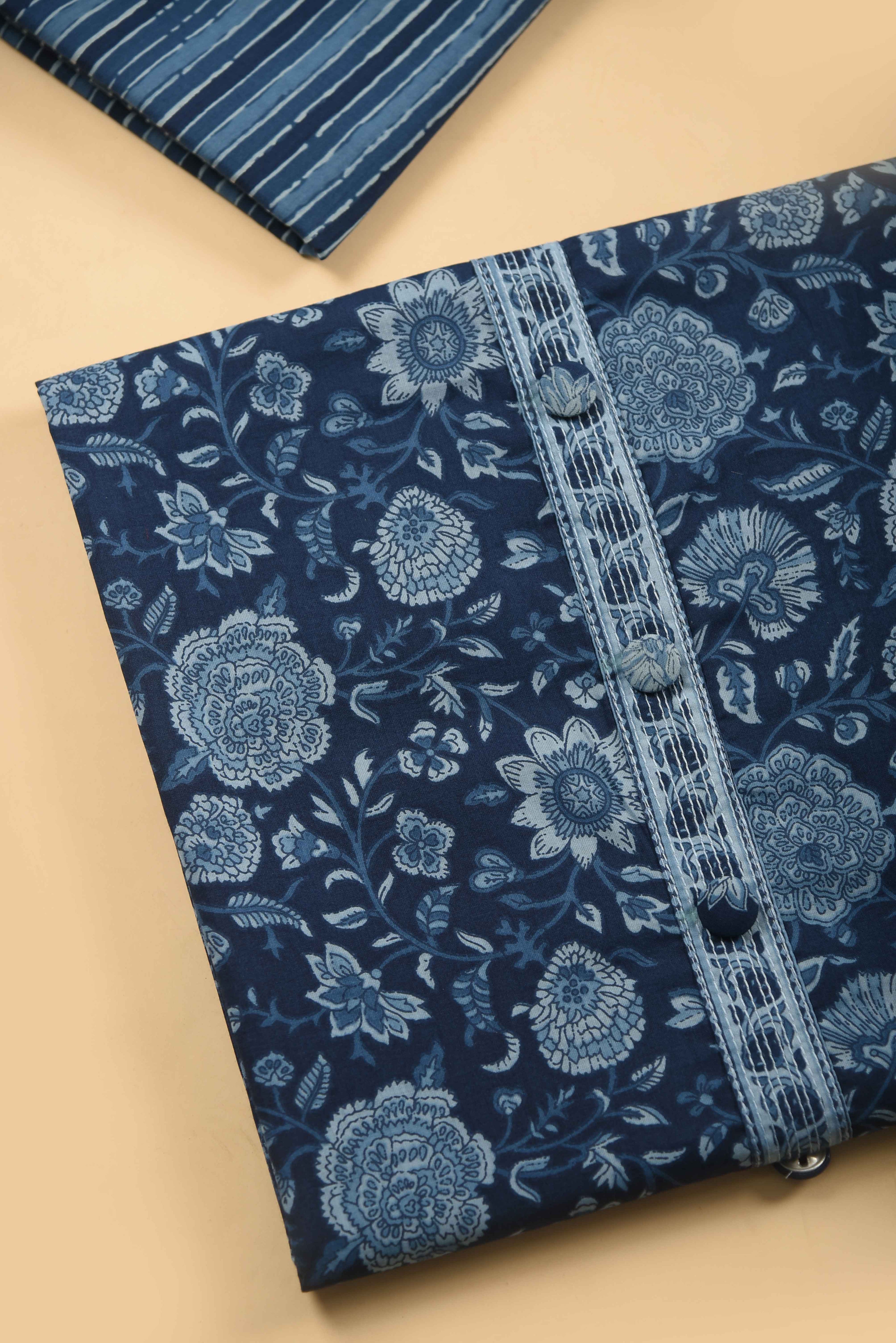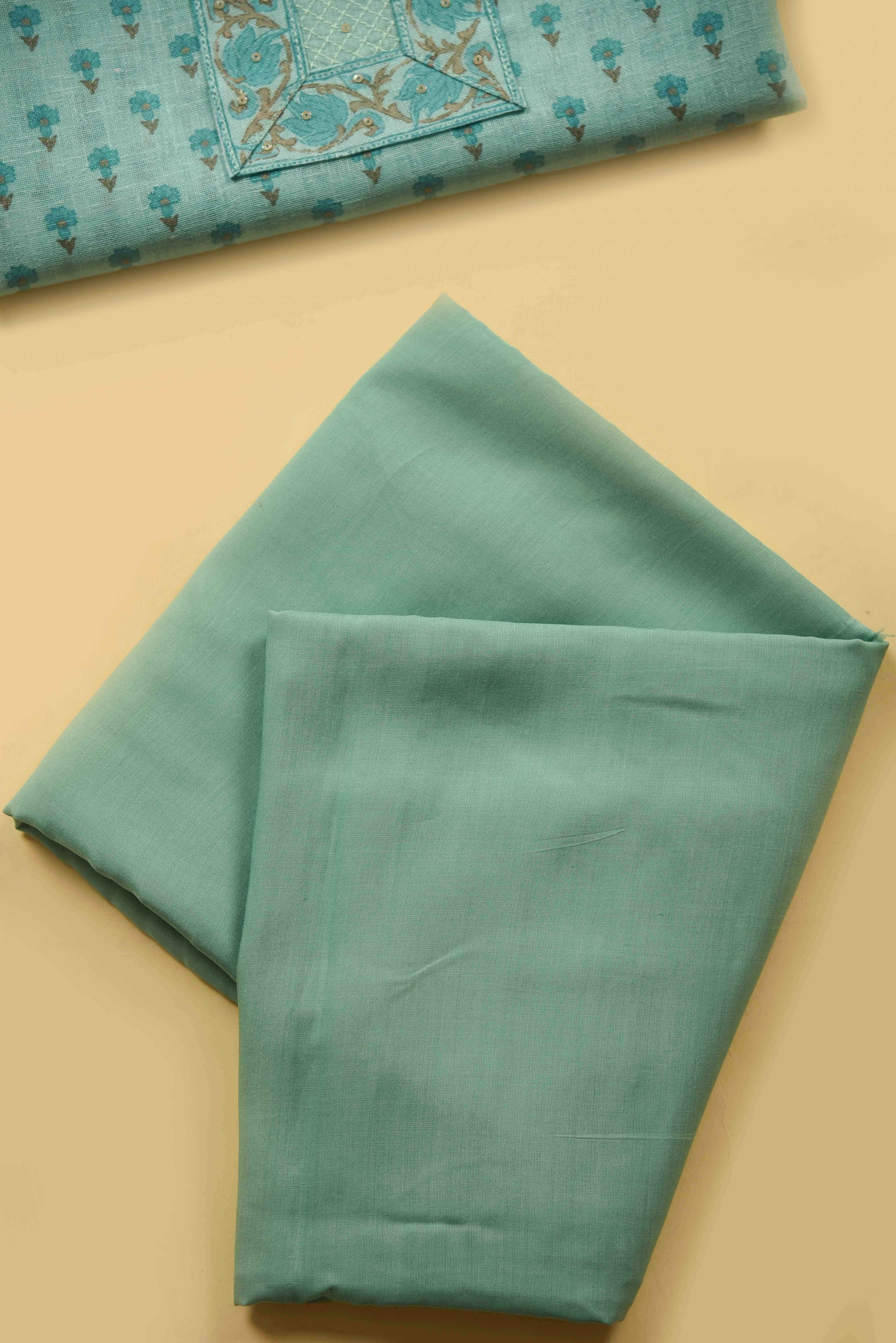 Blue Pure Cotton Printed With Lace Work Unstitched Suit Fabric Set With Cotton Printed Dupatta