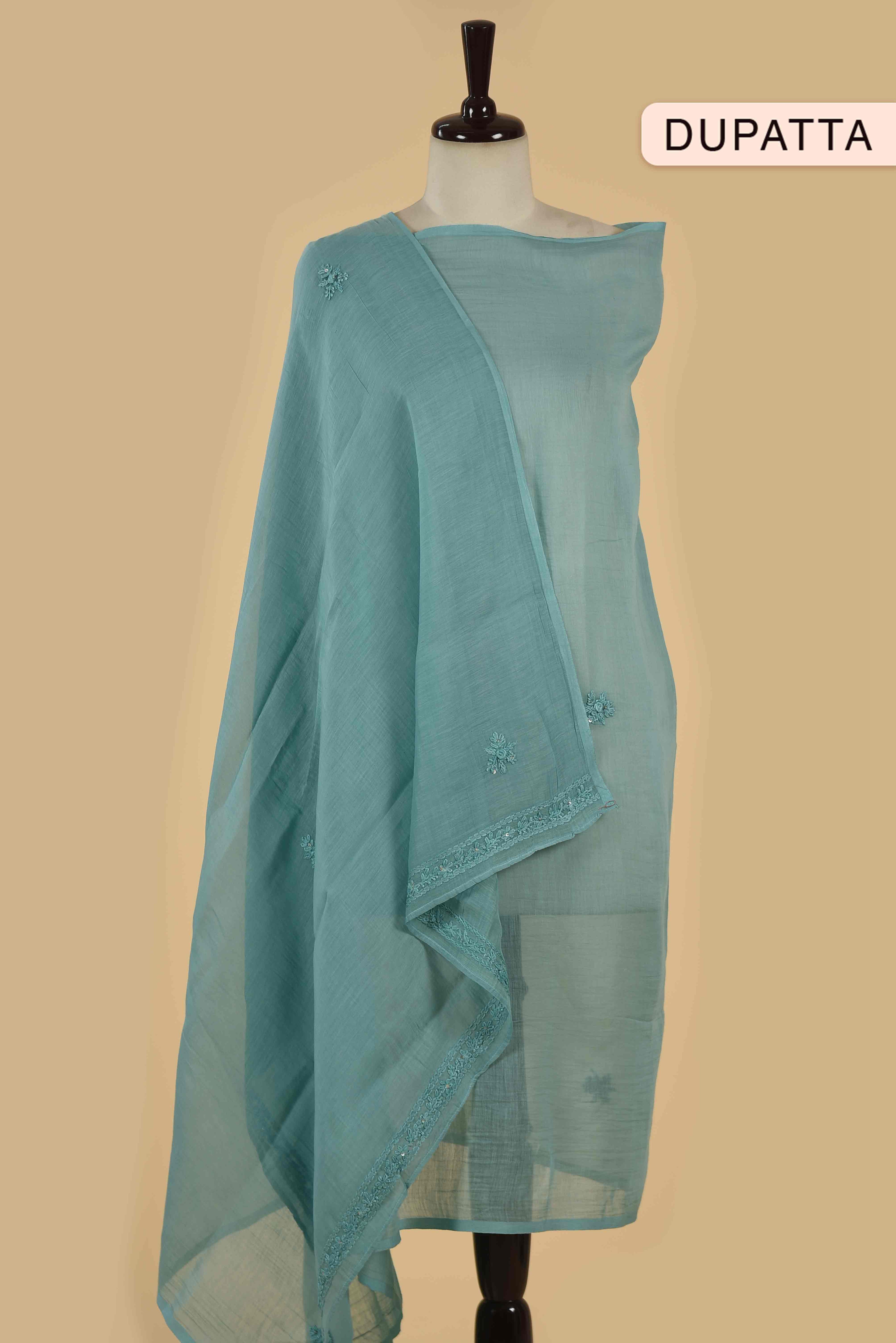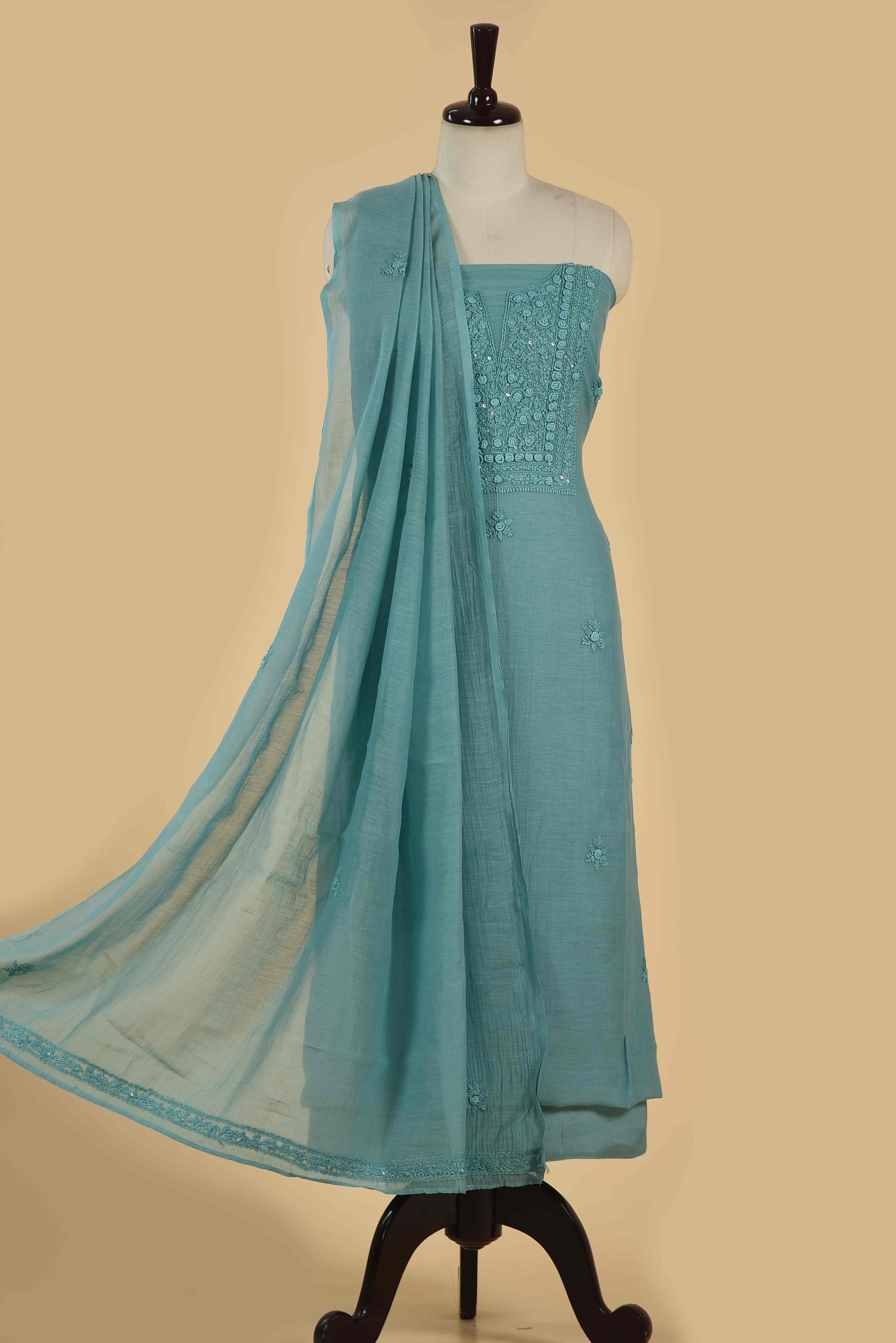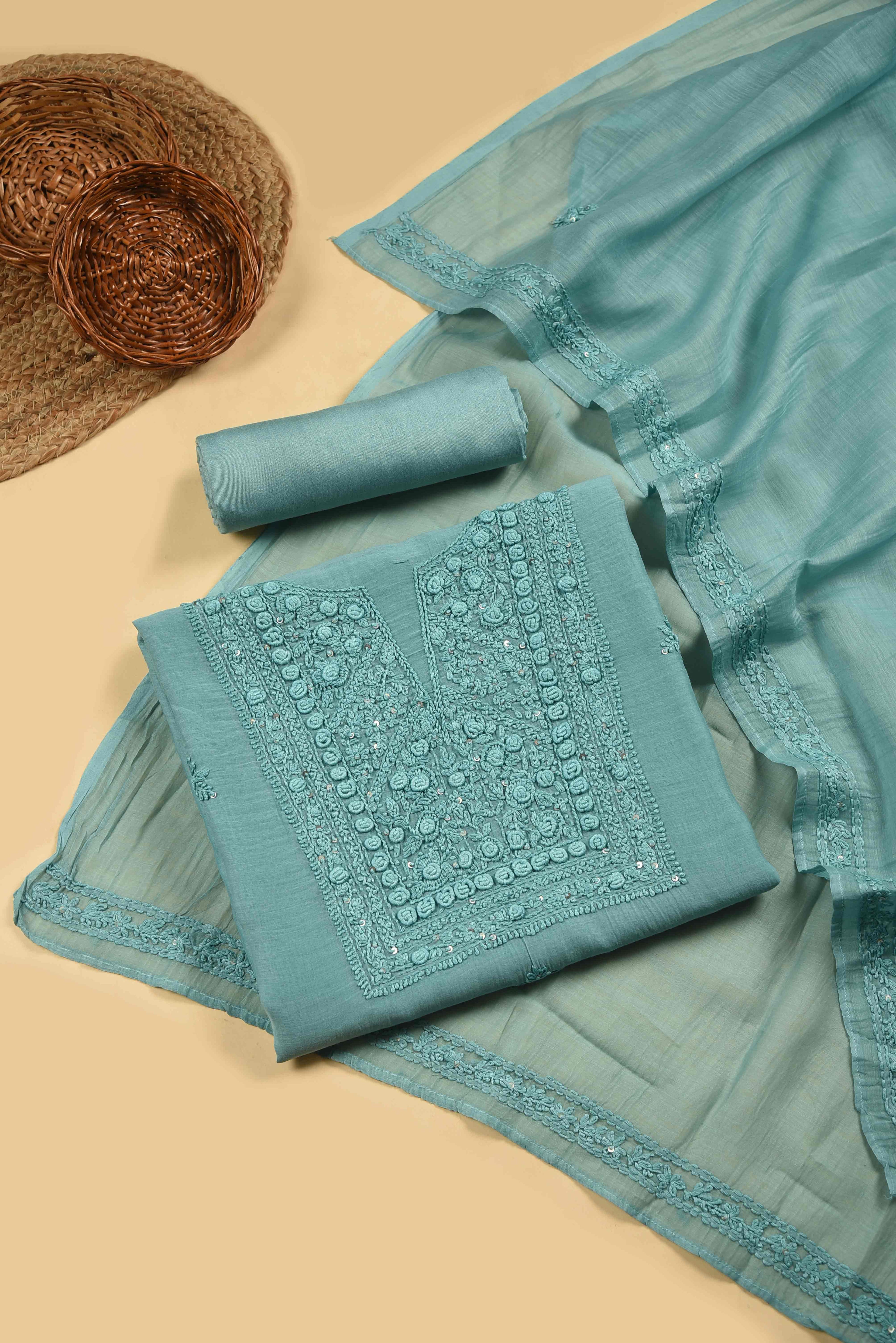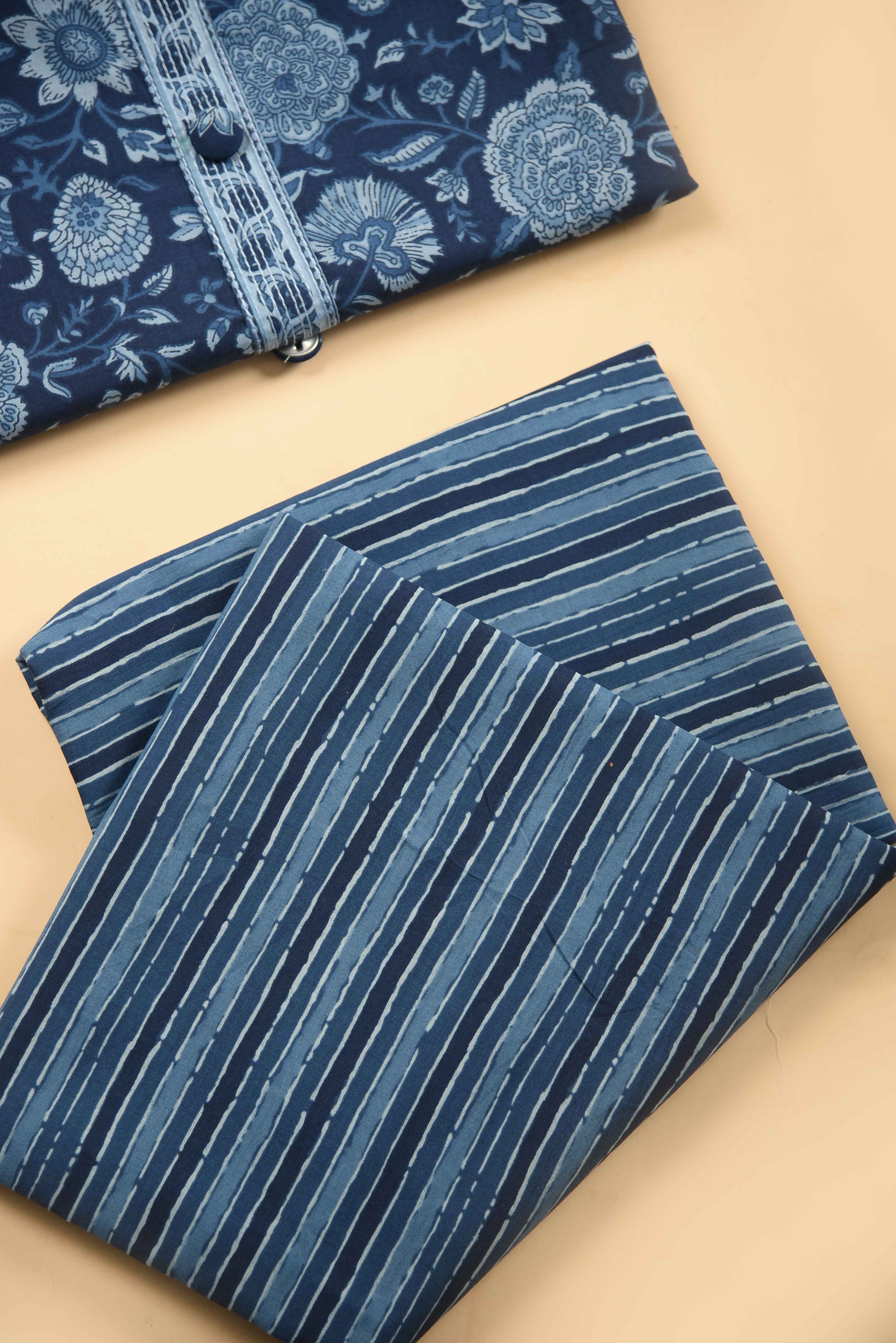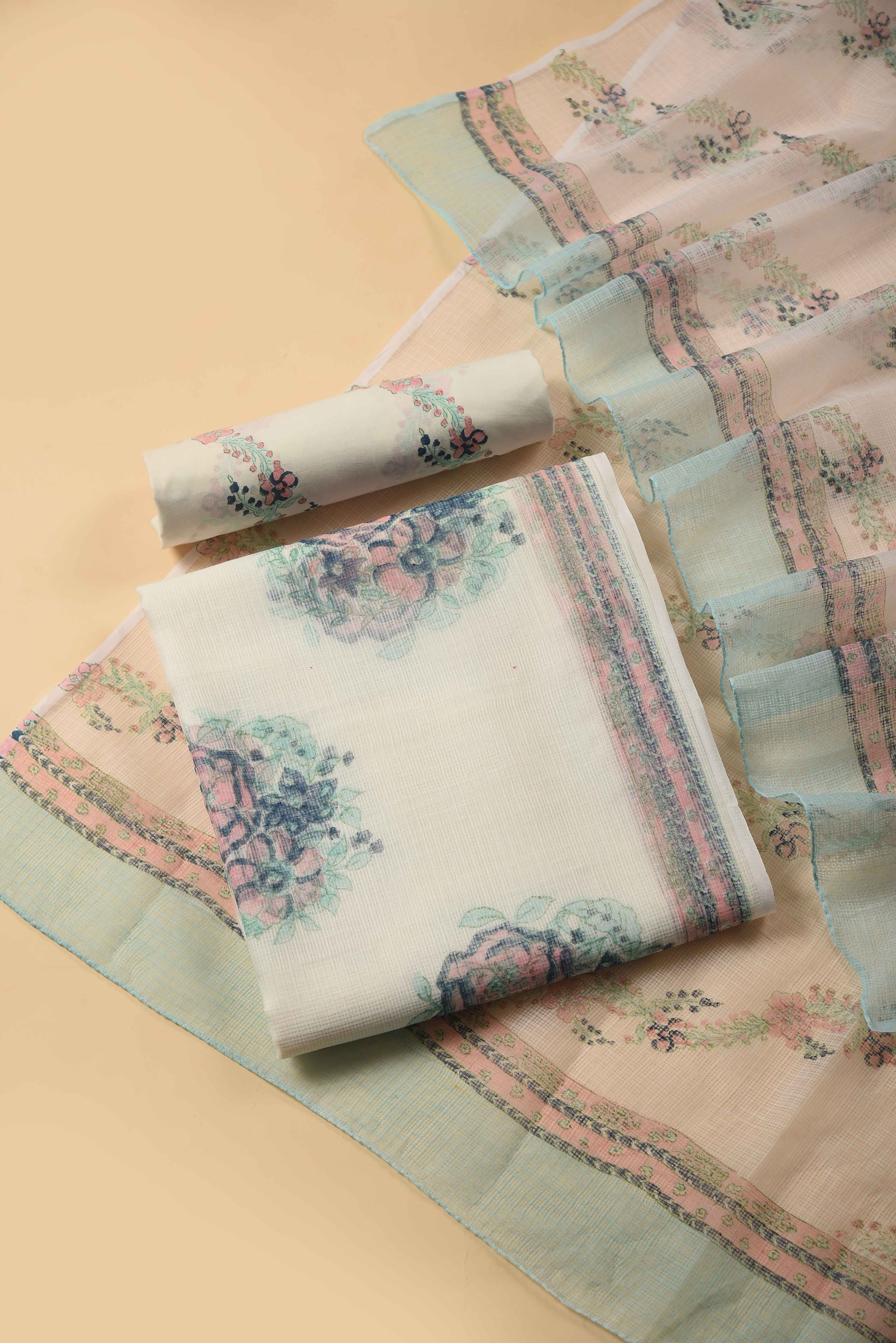 Blue Pure Cotton Printed With Lace Work Unstitched Suit Fabric Set With Cotton Printed Dupatta