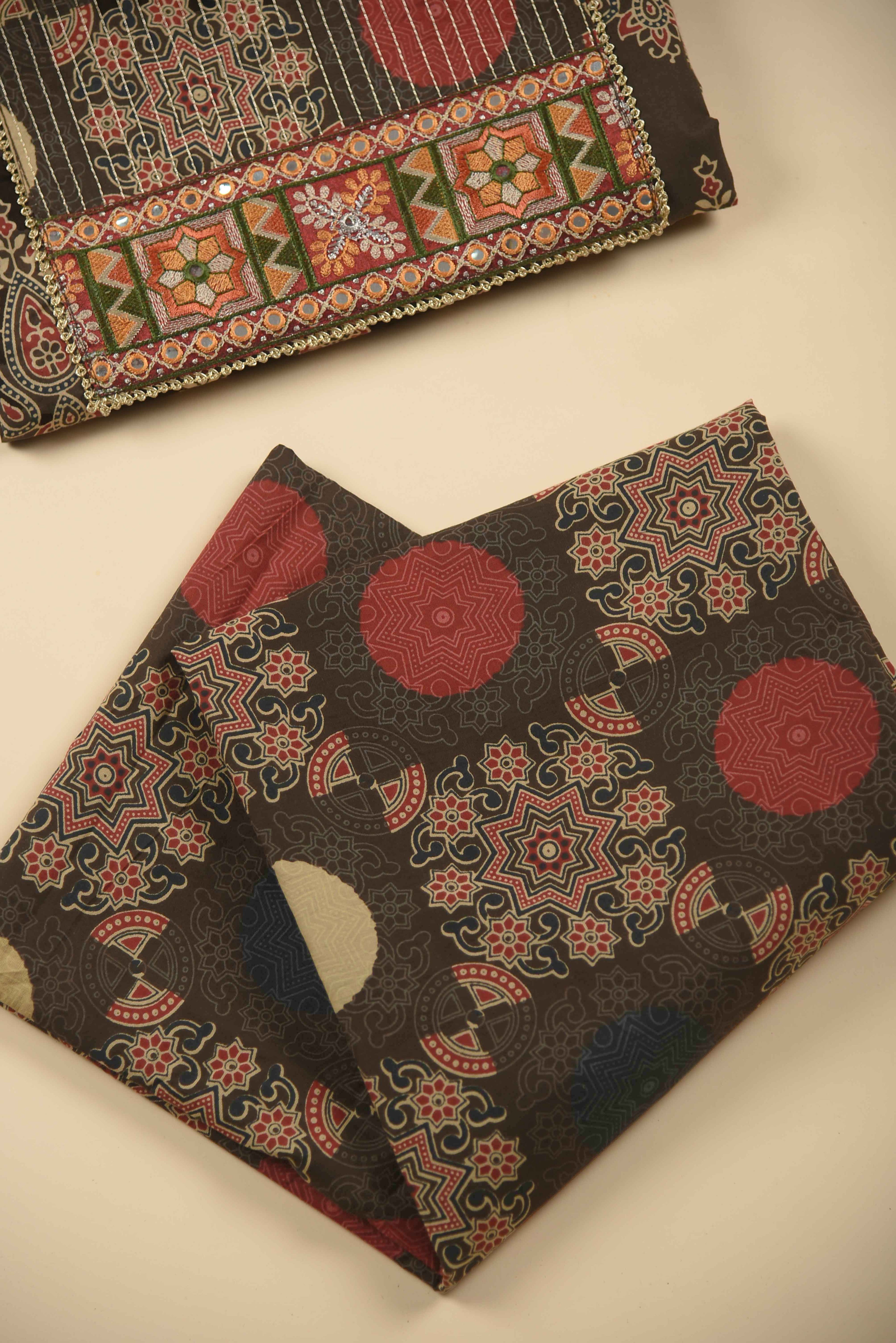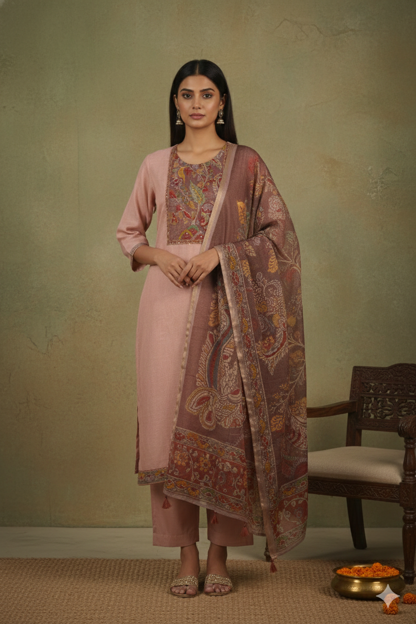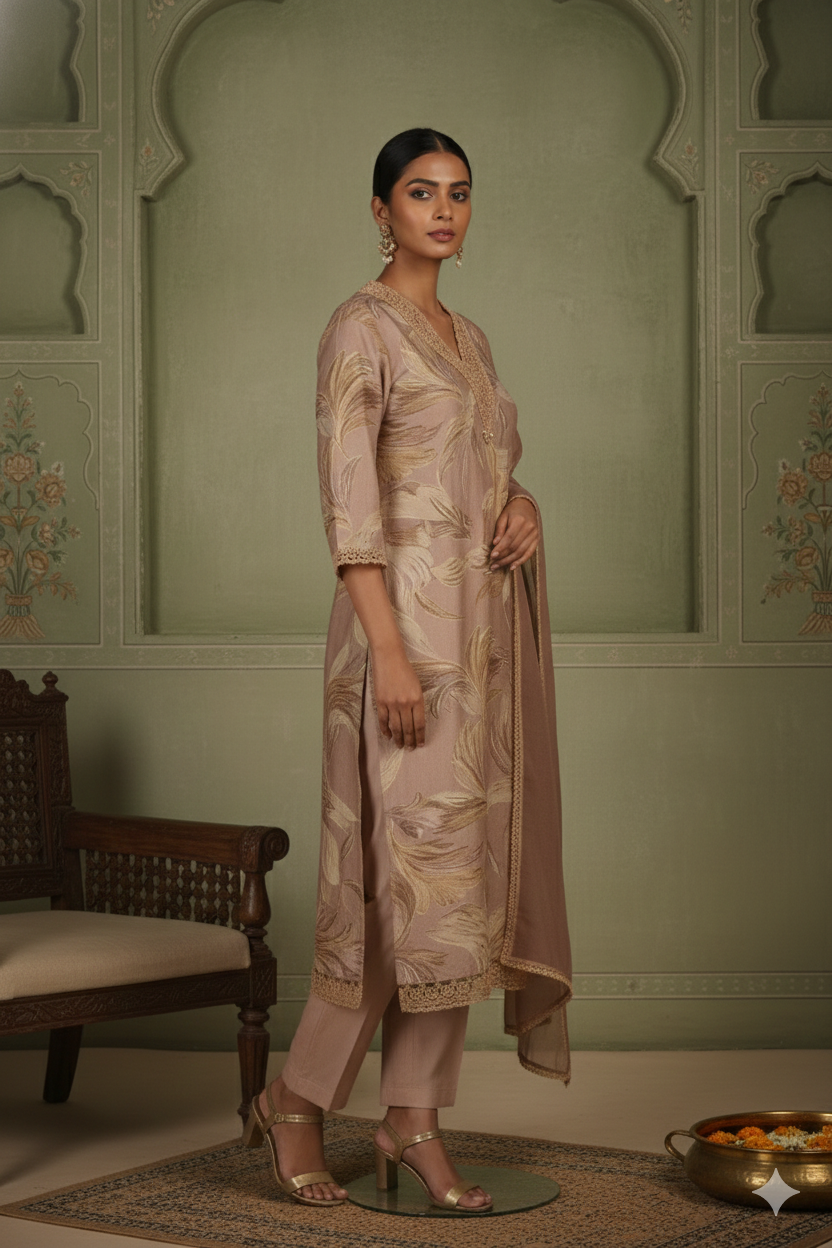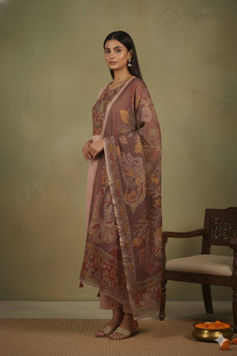 Brown Winter Wear Wool Spun Blend Tribal Embroidered Co-ord Set-Regular Fit