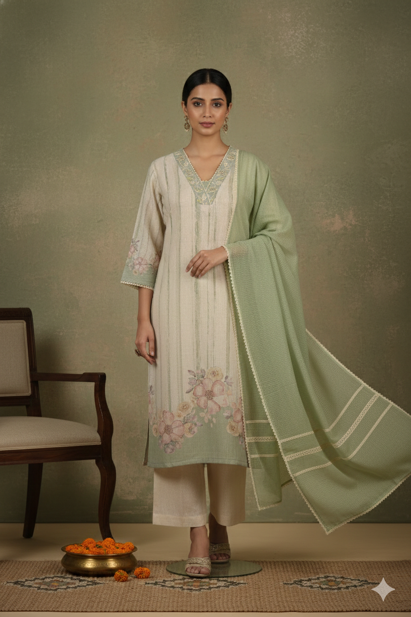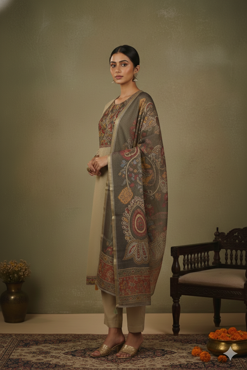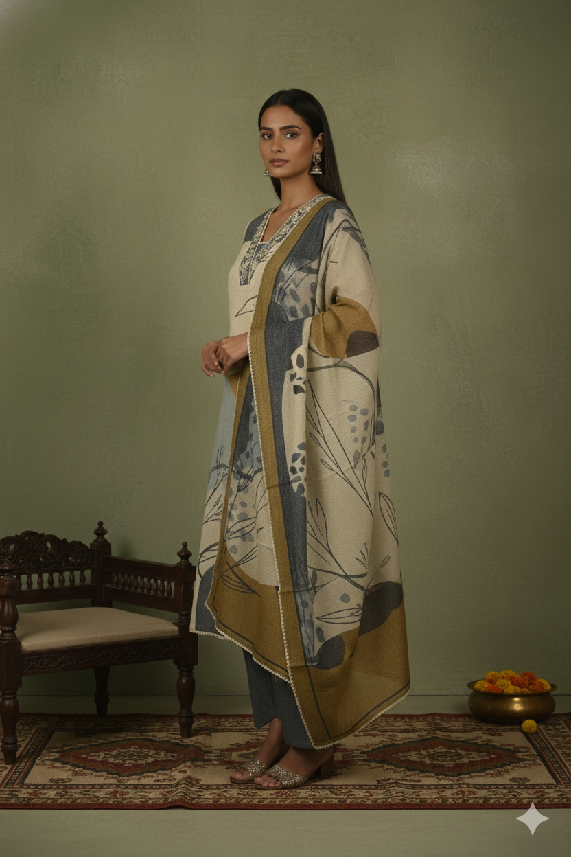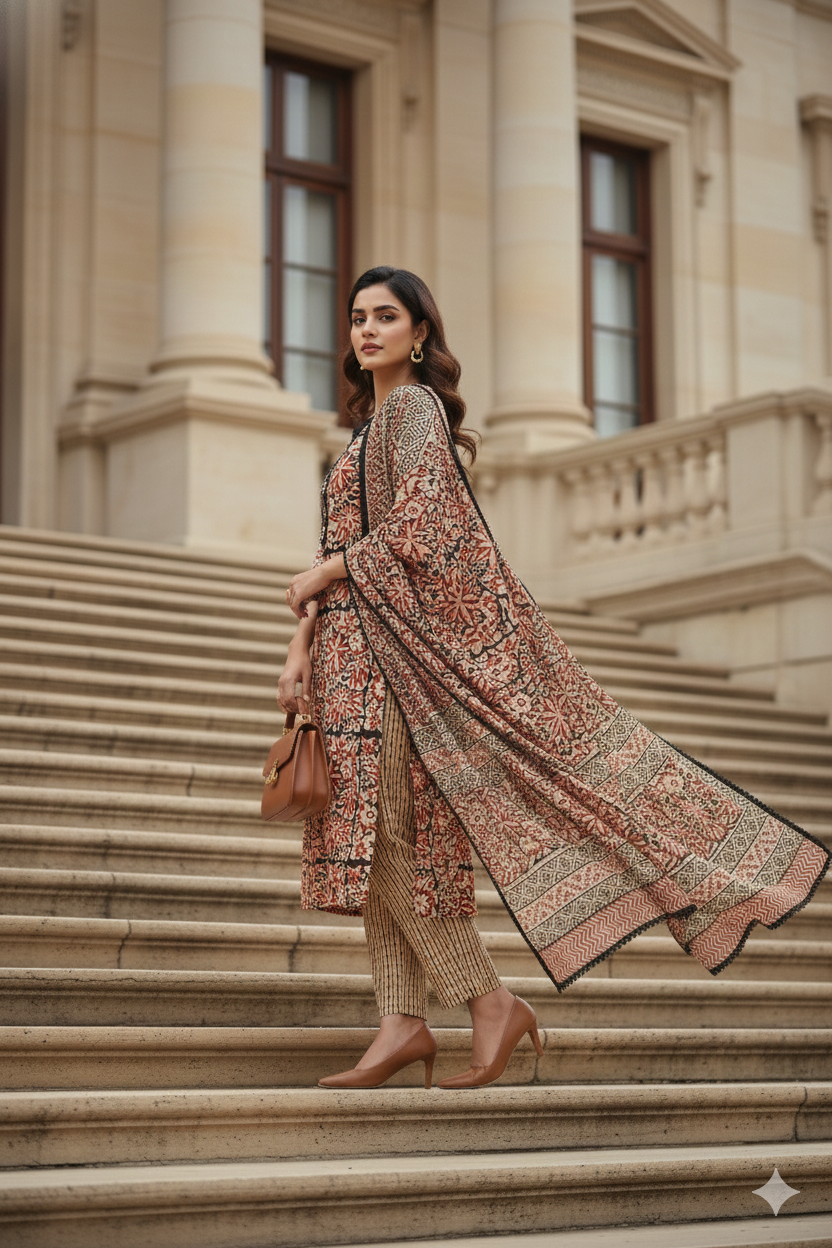 Brown Winter Wear Wool Spun Blend Tribal Embroidered Co-ord Set-Regular Fit