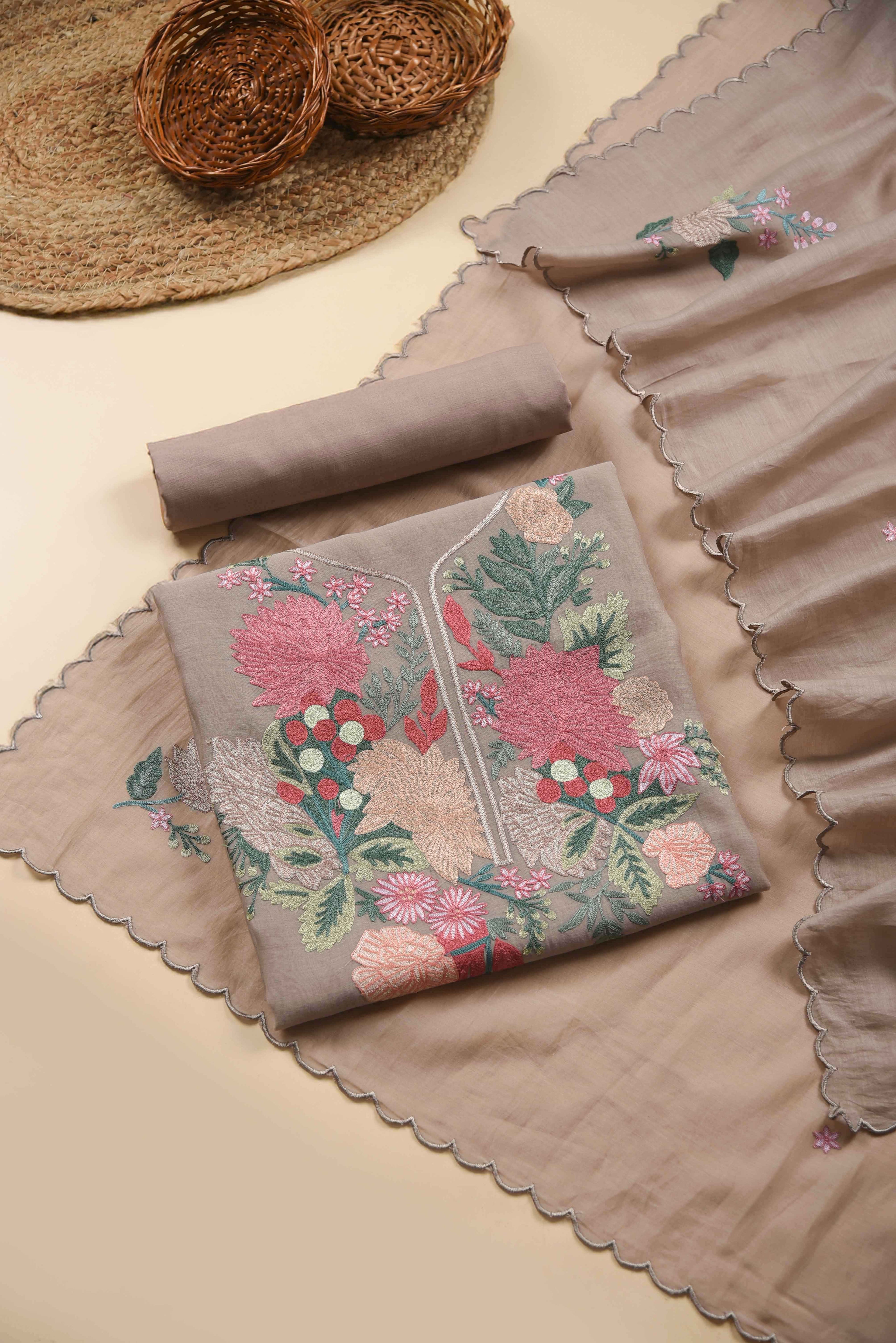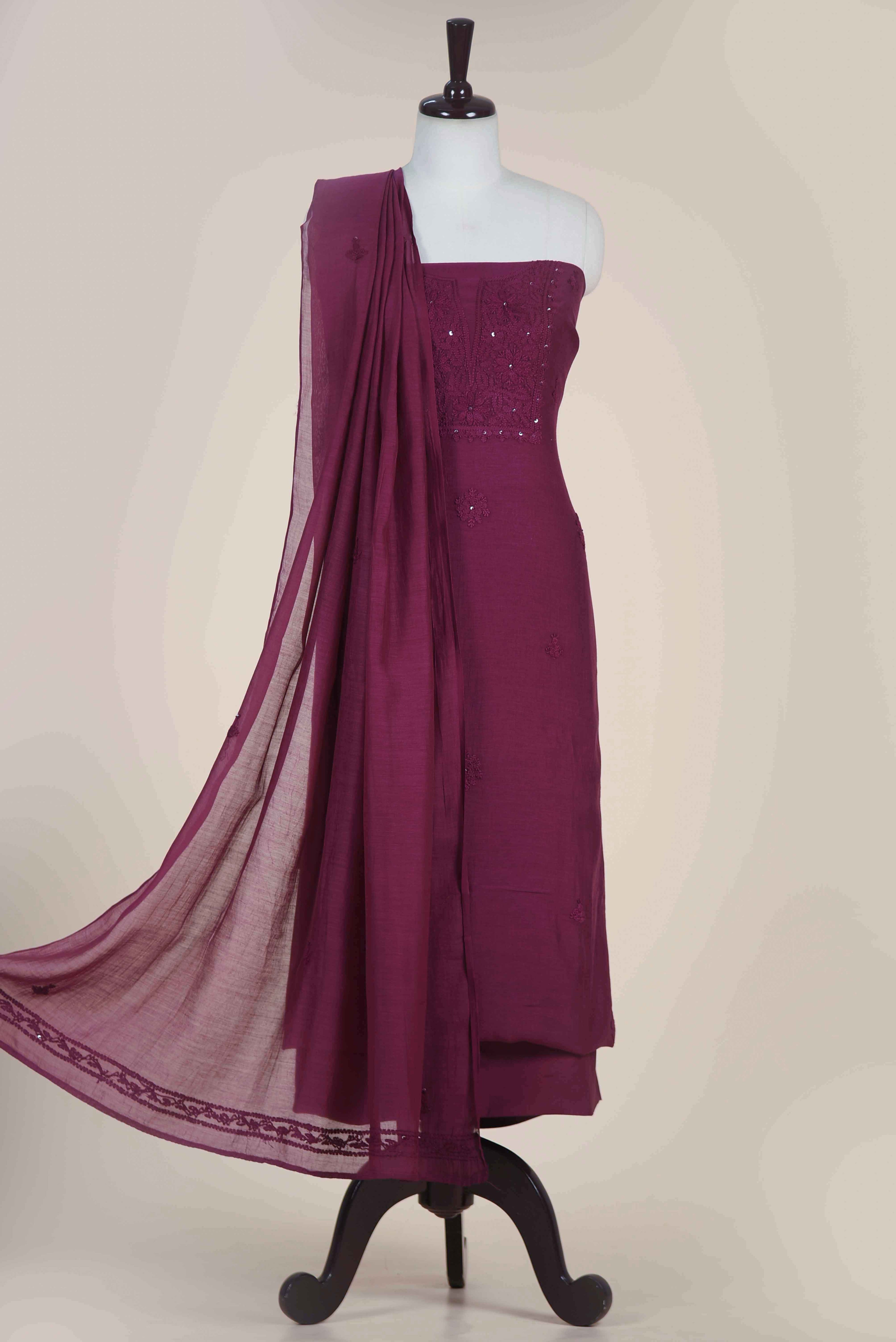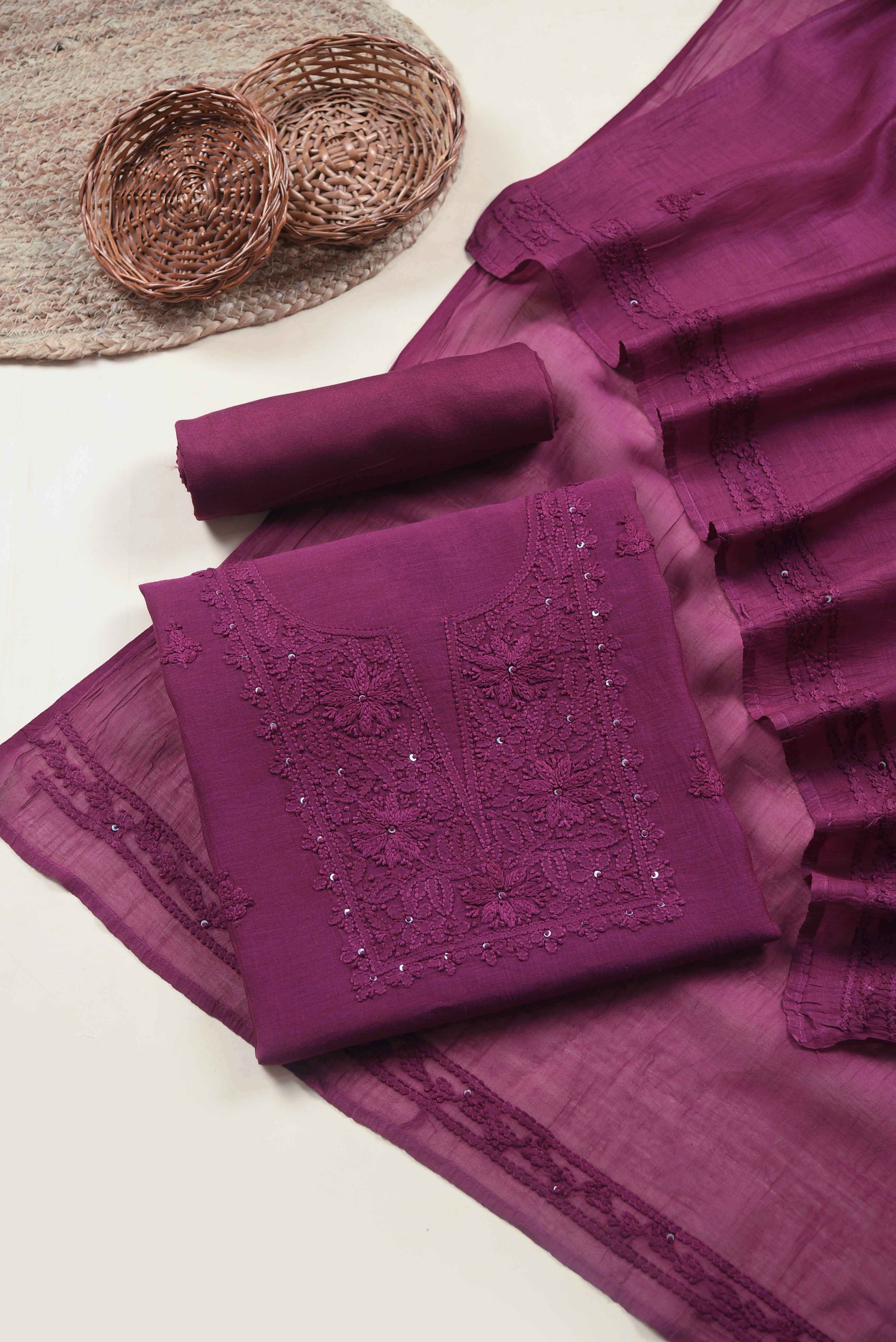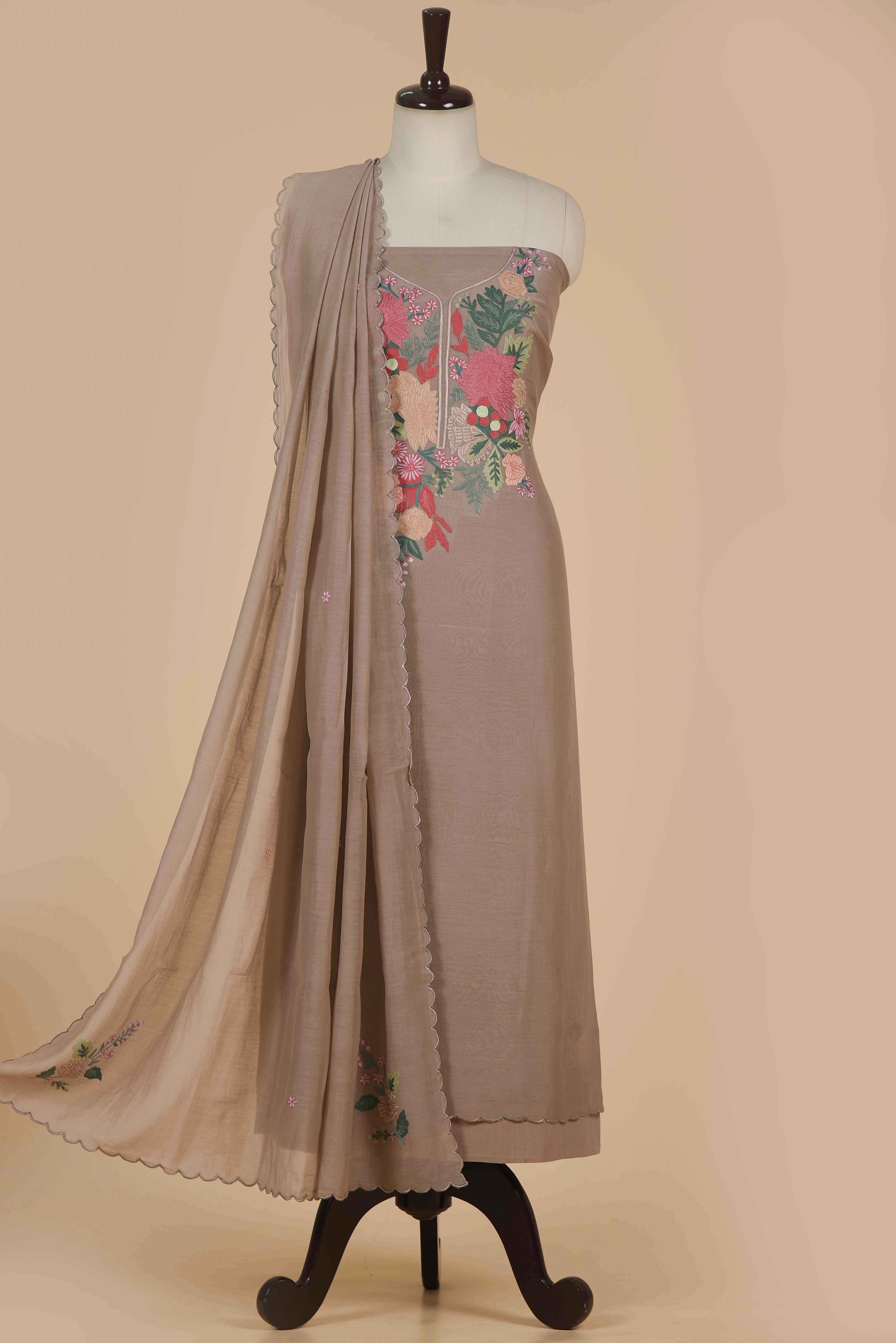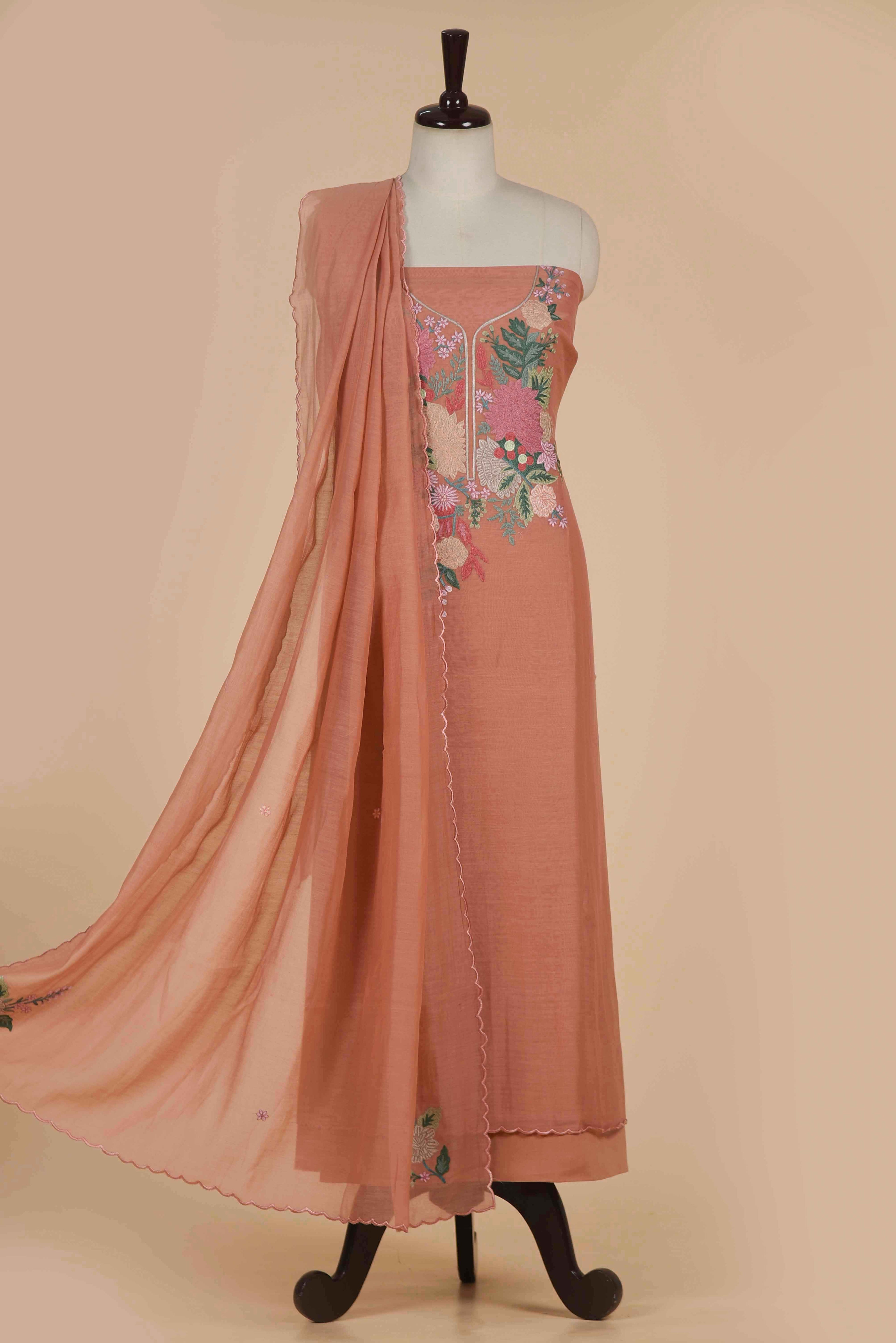 from 674 reviewsLight Mauve Mul Chanderi Embroidered Unstitched Suit Fabric Set With Mul Chanderi Embroidered Dupatta