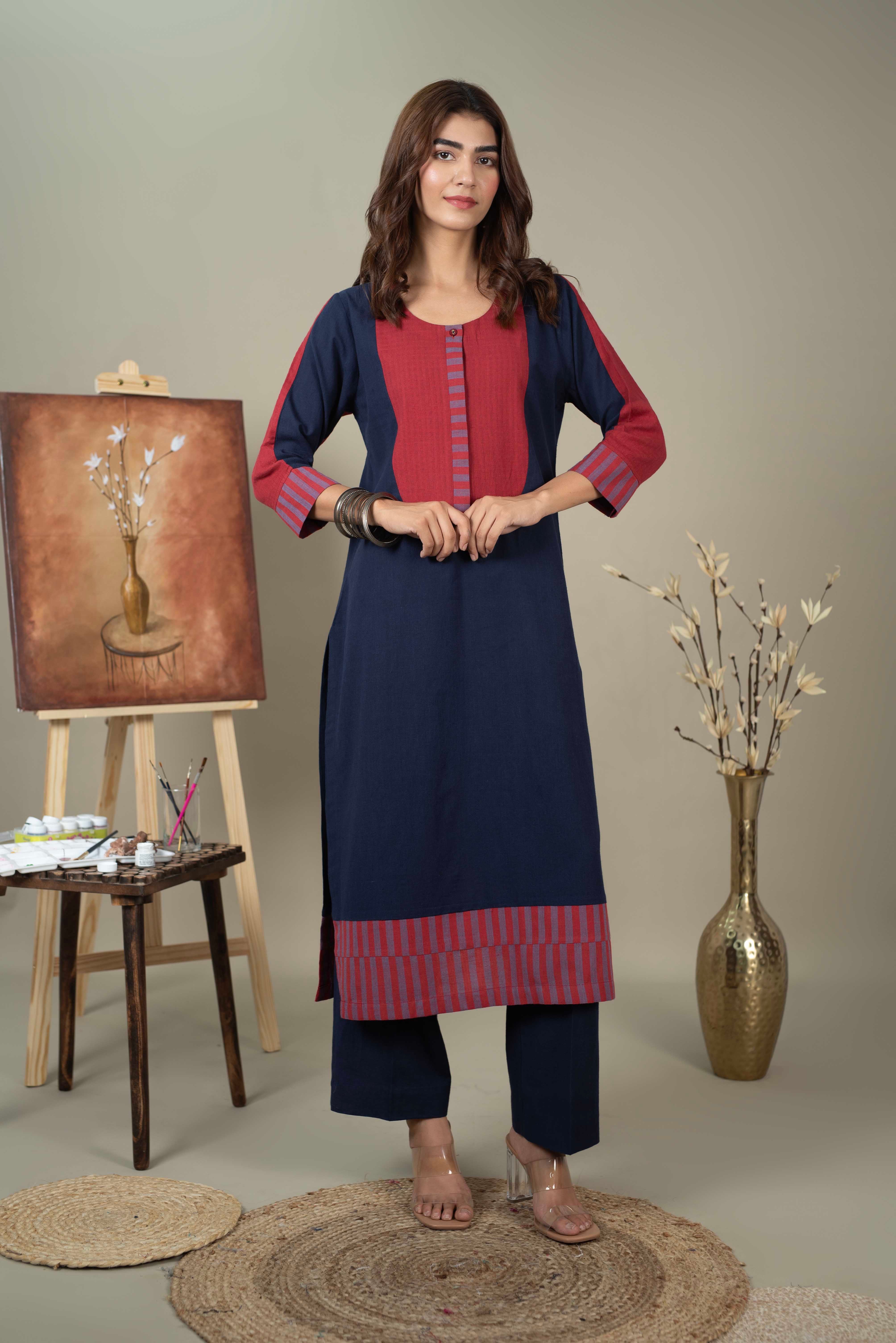 2. Blue with Maroon Pure Handloom Cotton Straight Kurta Set with Pants - Perfect pastel. Great for coffee dates or casual Fridays.