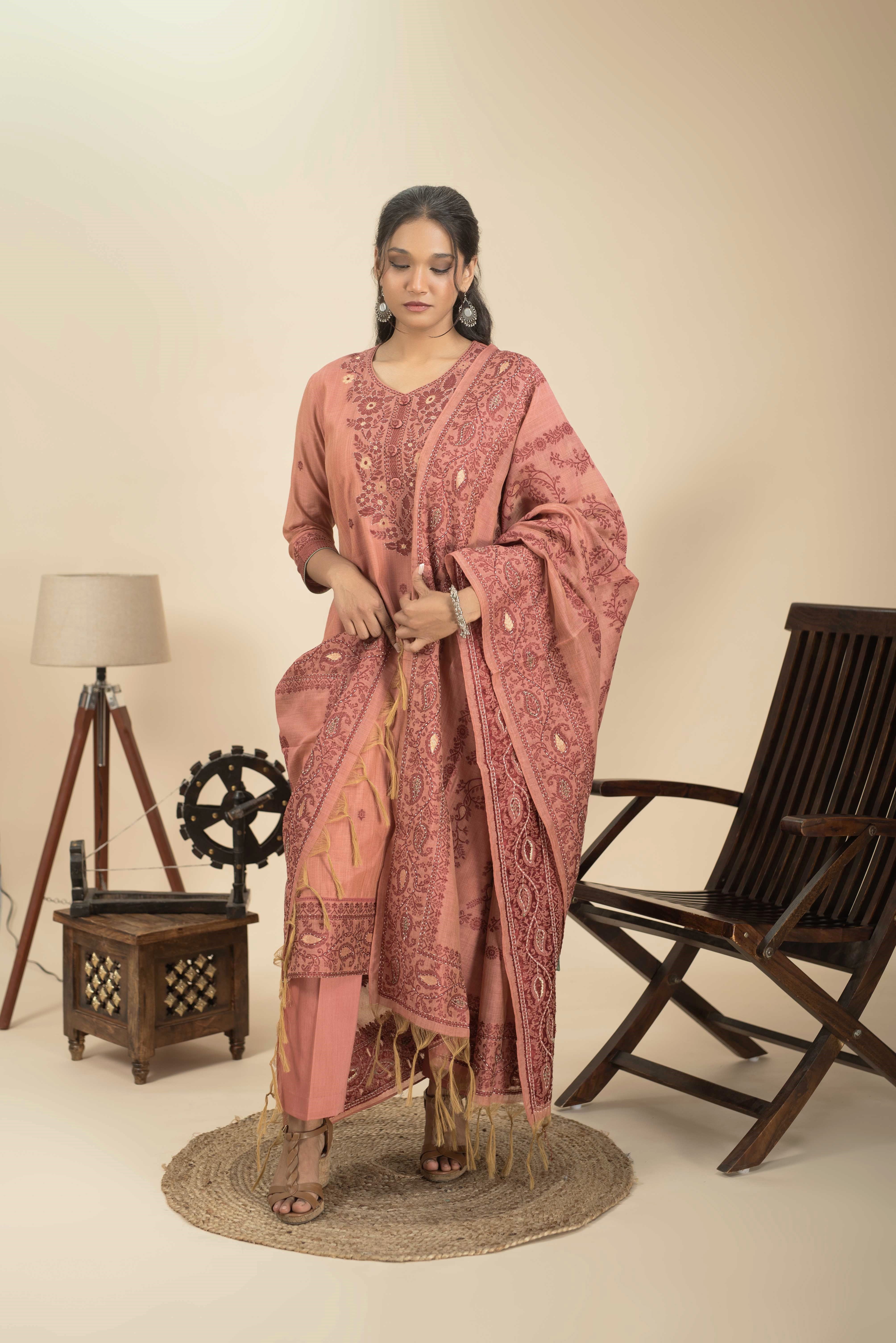 Paulsons Pick: Peach Chanderi Woven With Embroidery Ready To Wear Suit – Your festive wardrobe essential.