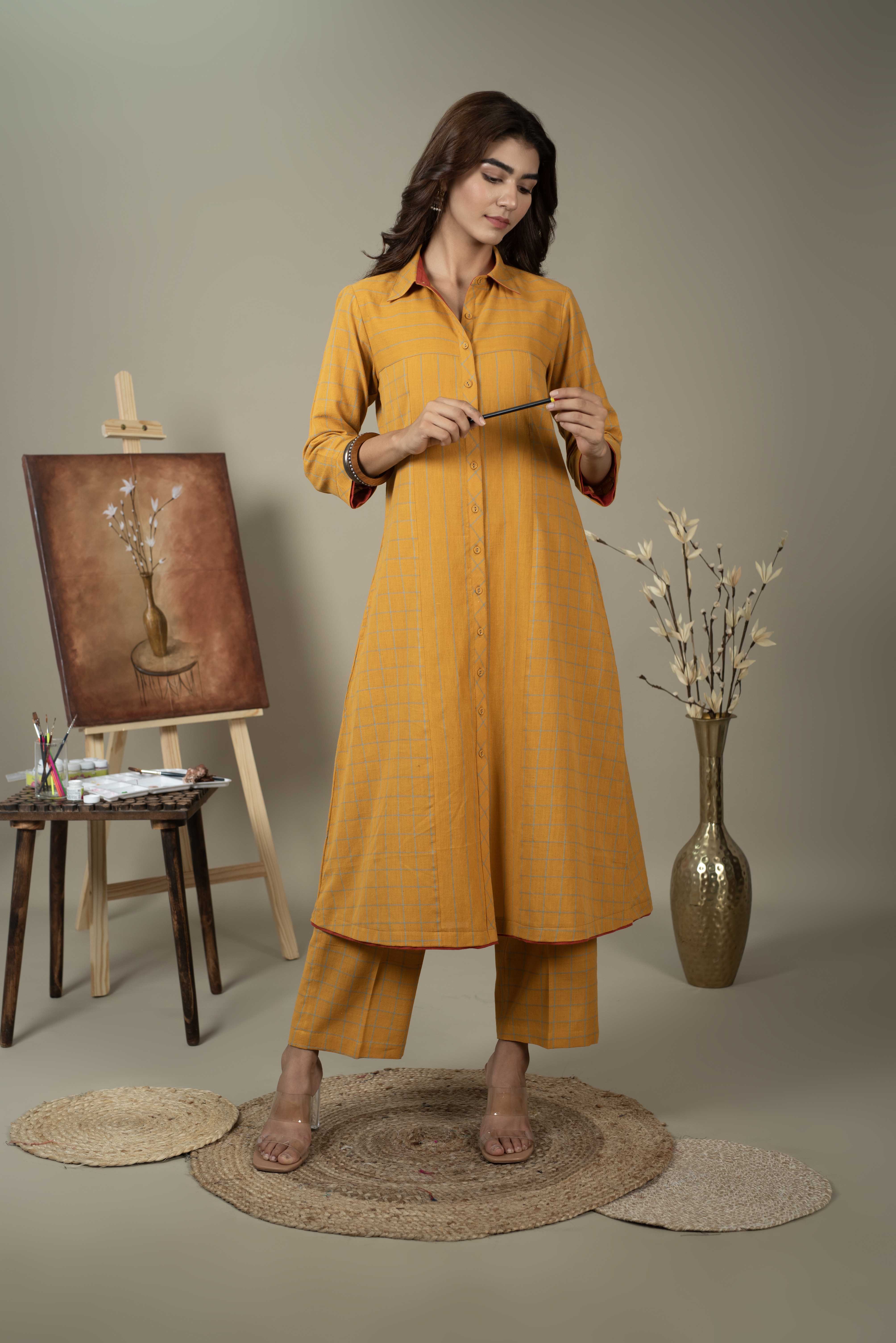 Paulsons Pick: Mustard Pure Handloom Cotton A-Line Kurta Set with Culotte Pants.