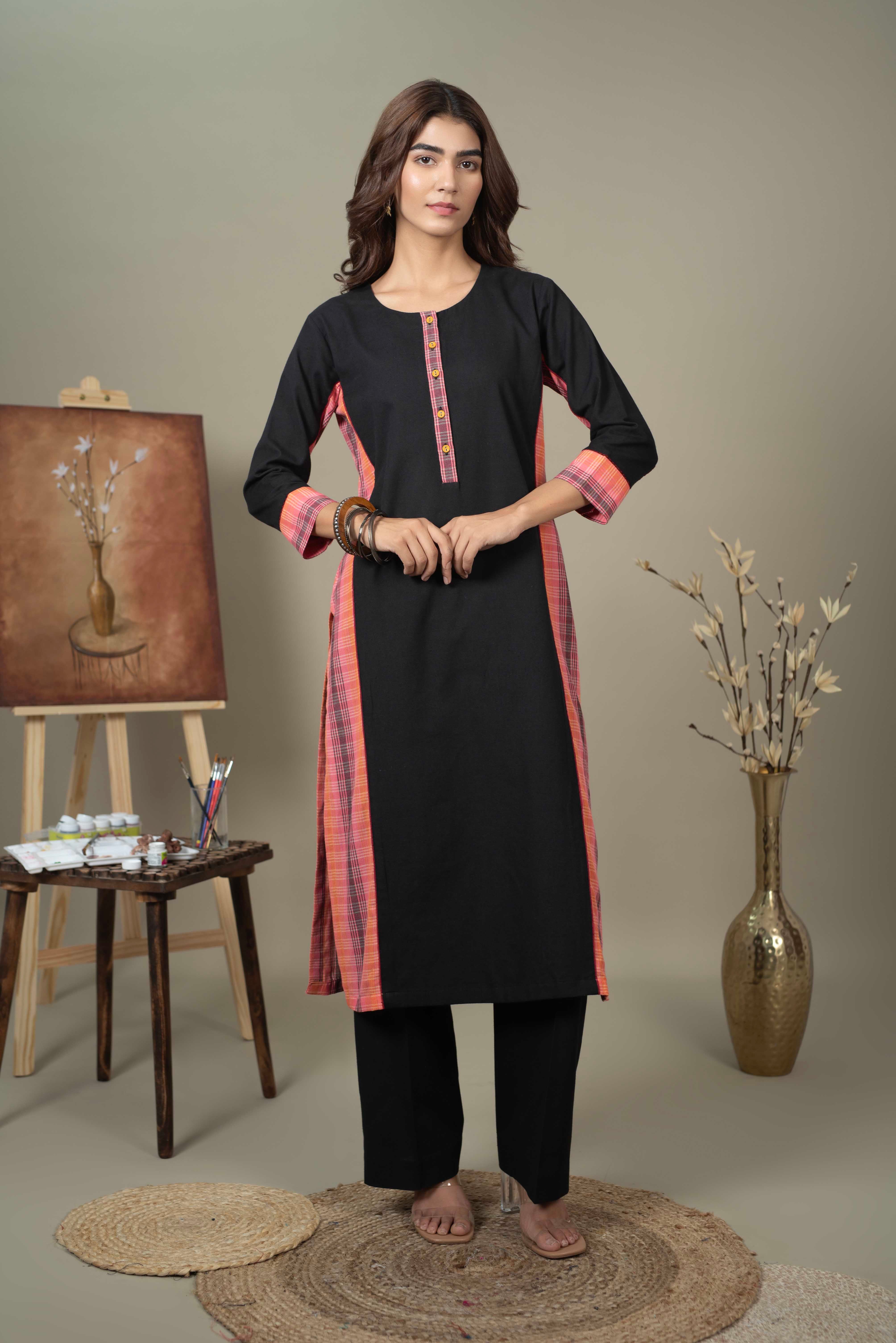 4. Black with Pink Check Pure Cotton Flax Straight Kurta Set with Pants - Cotton-rich blend for hot Indian summers.