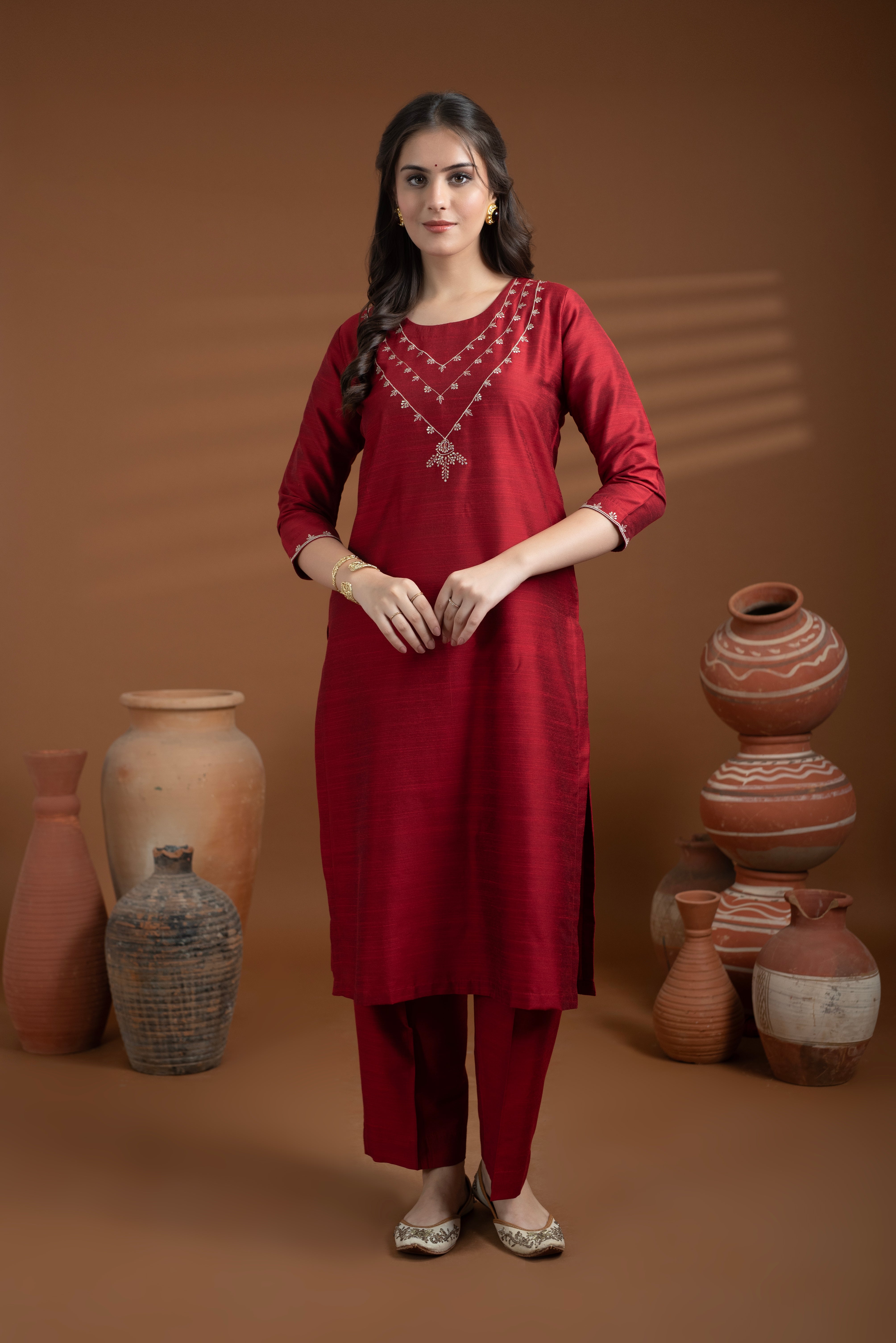 Banarasi Silk suits are making a comeback in festive wardrobes. Their flared bottoms add volume and drama, making them perfect for Navratri evenings. Look for embellished shararas paired with long kurtas for a chic ethnic look.