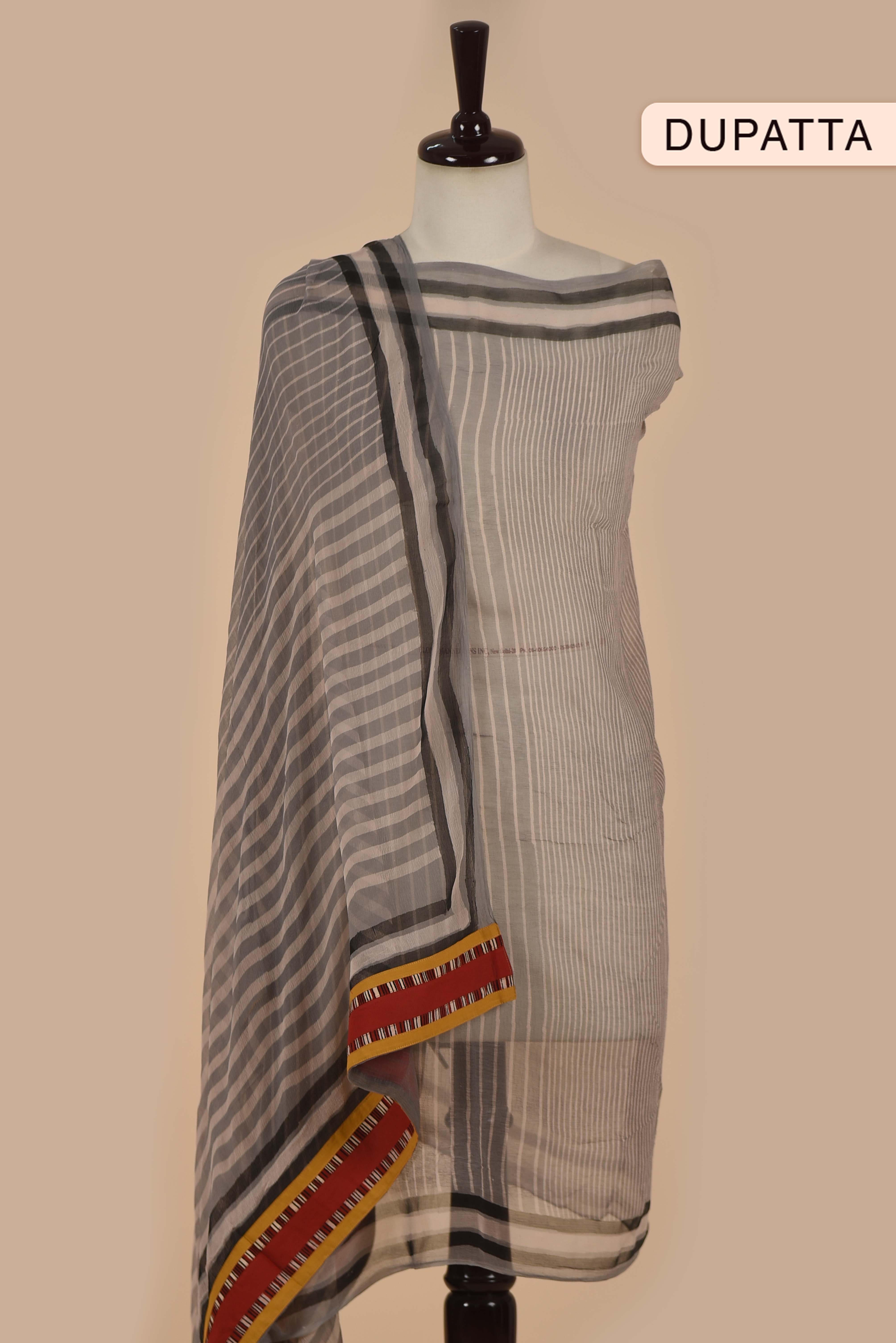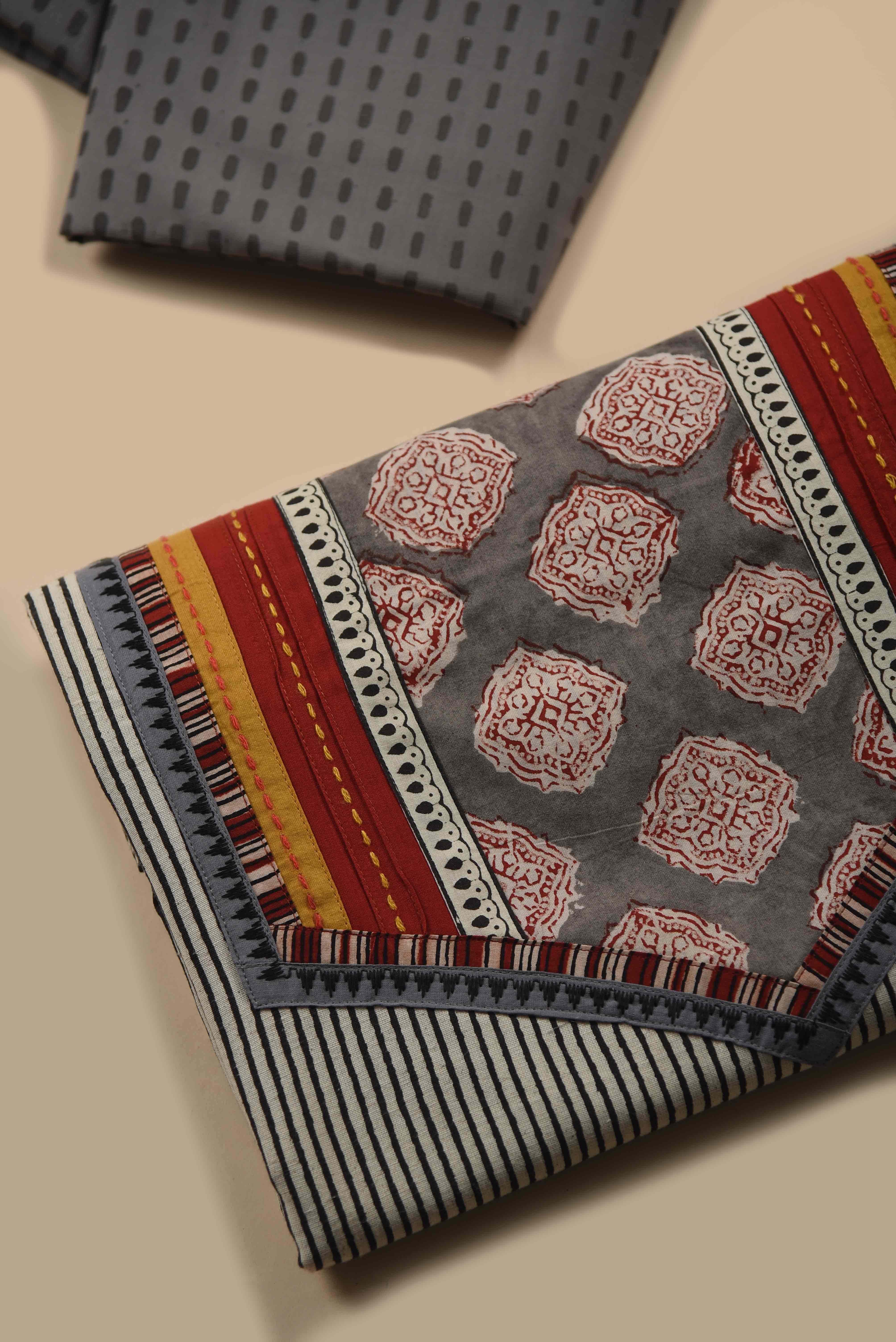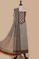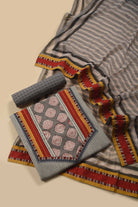 Beige With Gray Pure Cotton Hand Block Printed With Embroidery Unstitched Suit Fabric Set WIth Chiffon Hand Block Printed Dupatta