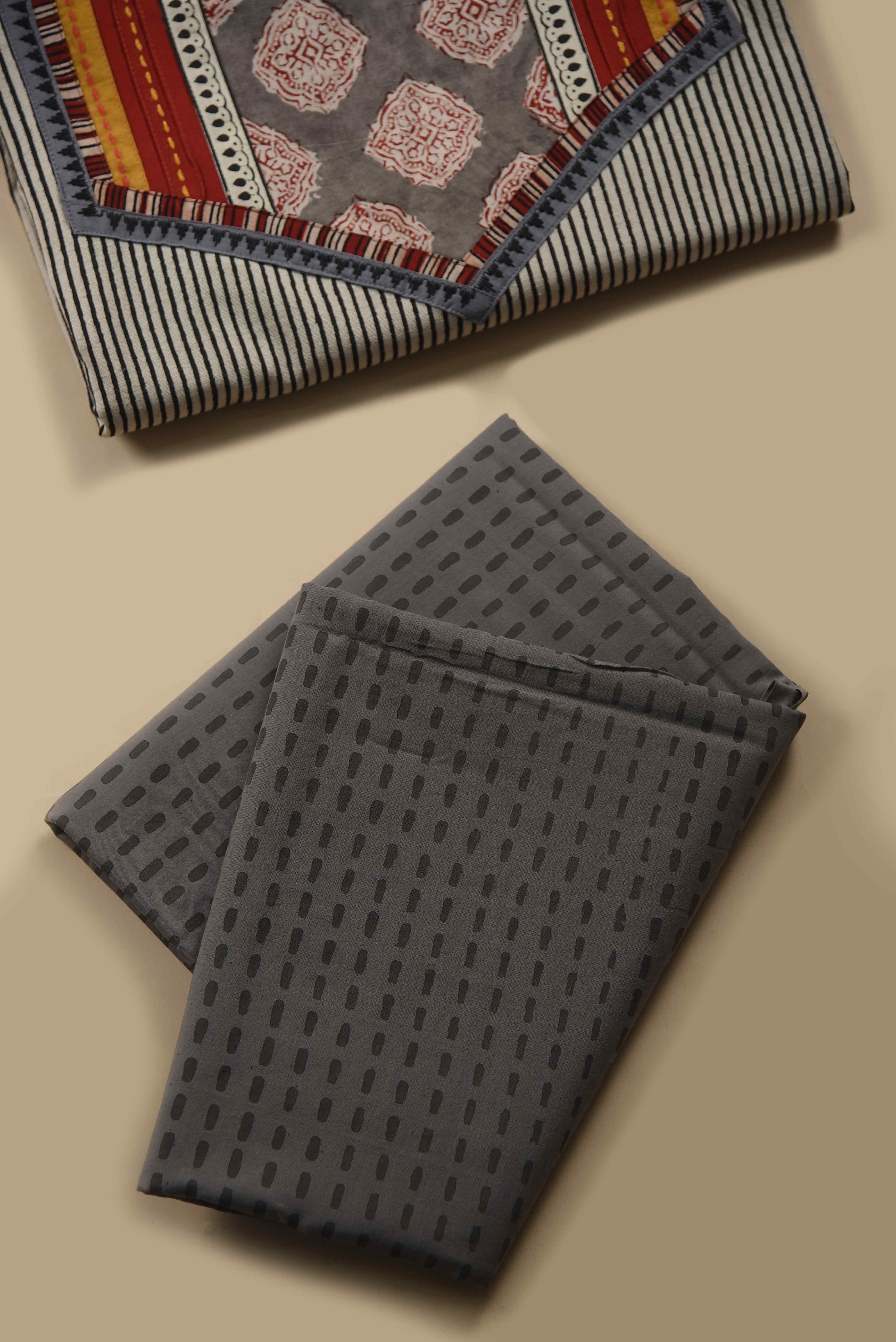 • Celebrate effortless elegance with our Beige With Gray Pure Cotton Hand Block Printed & Embroidered Unstitched Suit Fabric Set, paired with a matching Chiffon Hand Block Printed Dupatta.