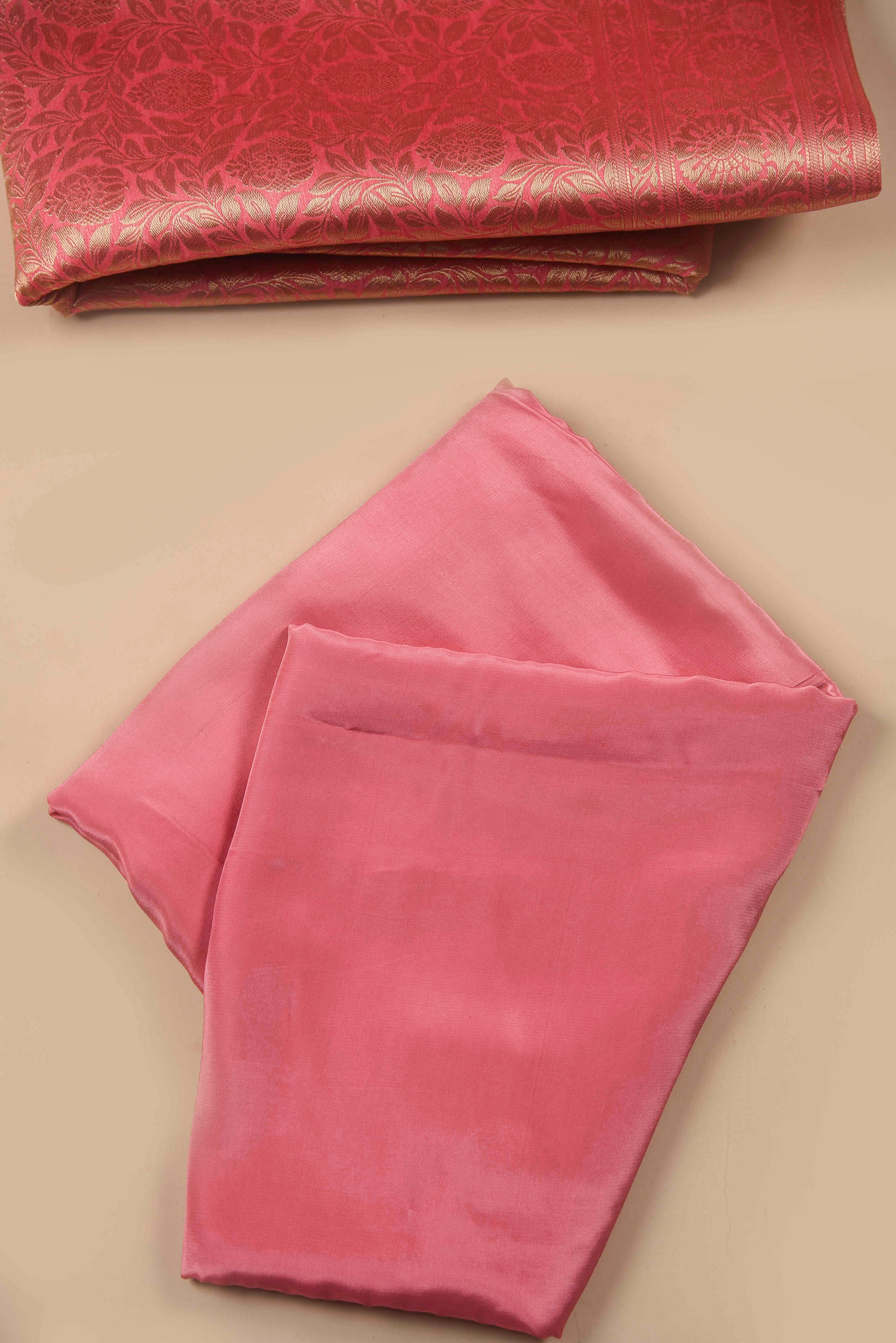 - Carrot Pink Fine Banarasi Silk Woven Unstitched Suit Fabric Set with Organza Woven Dupatta This exquisite Banarasi silk unstitched suit fabric set is a true collector’s delight.