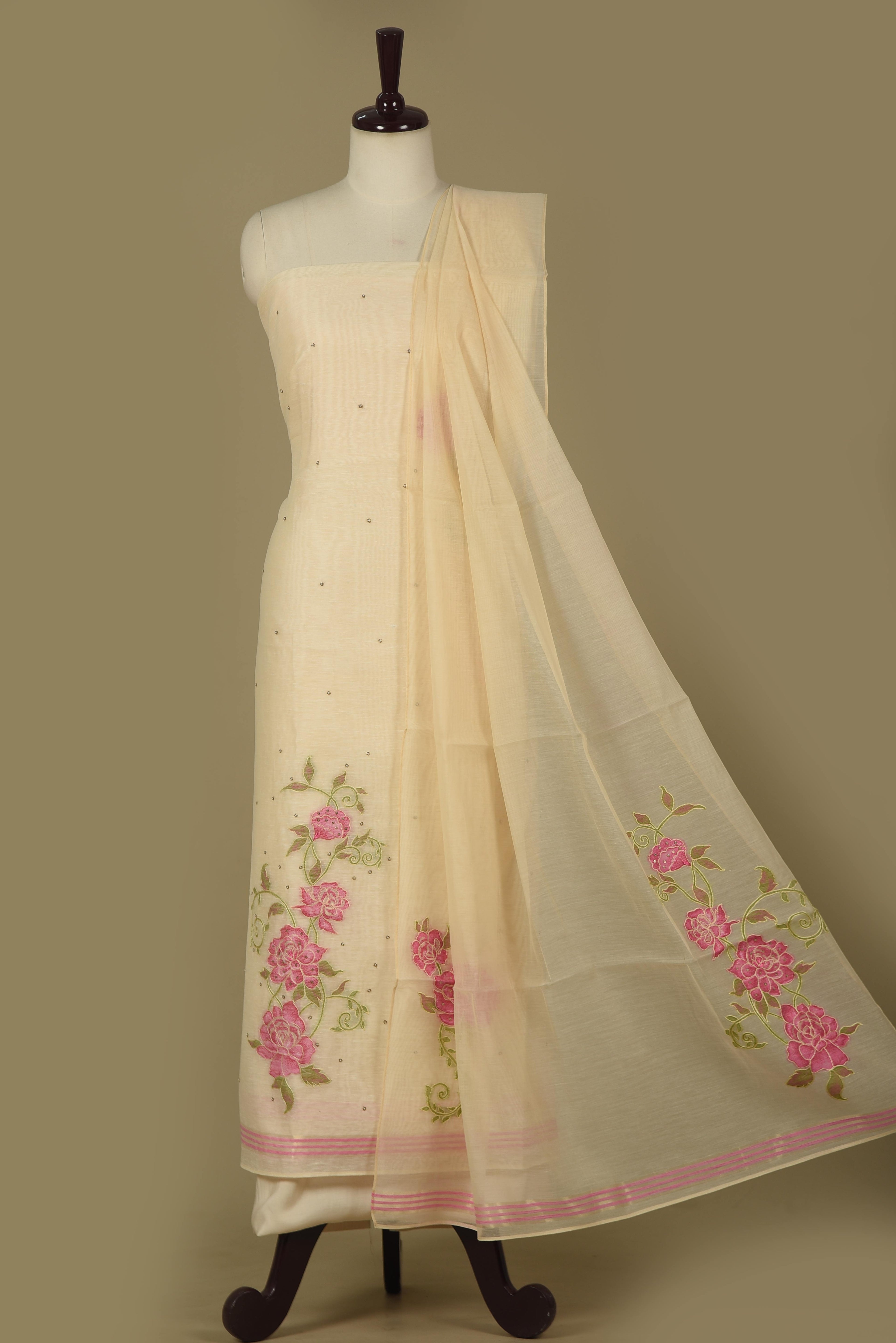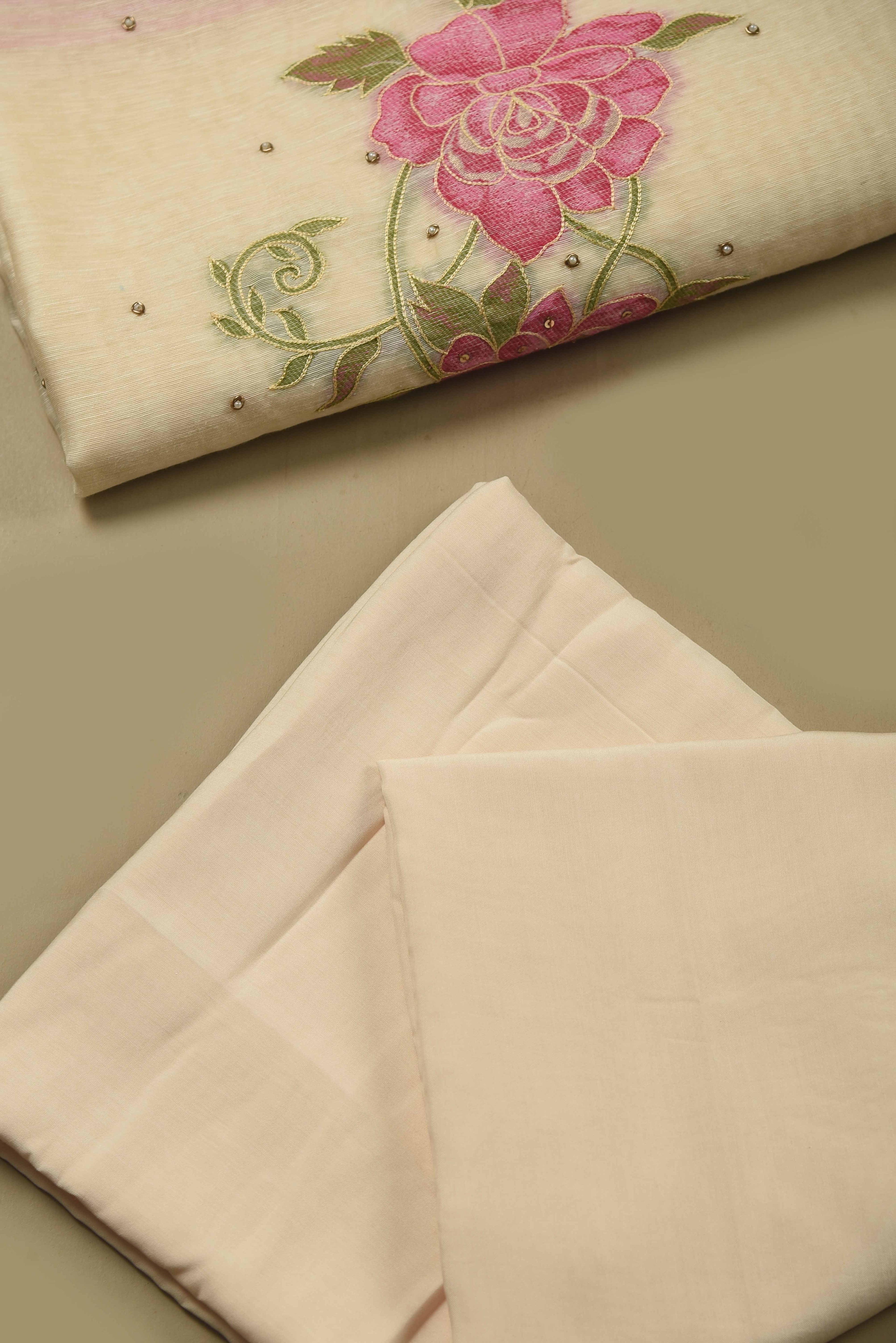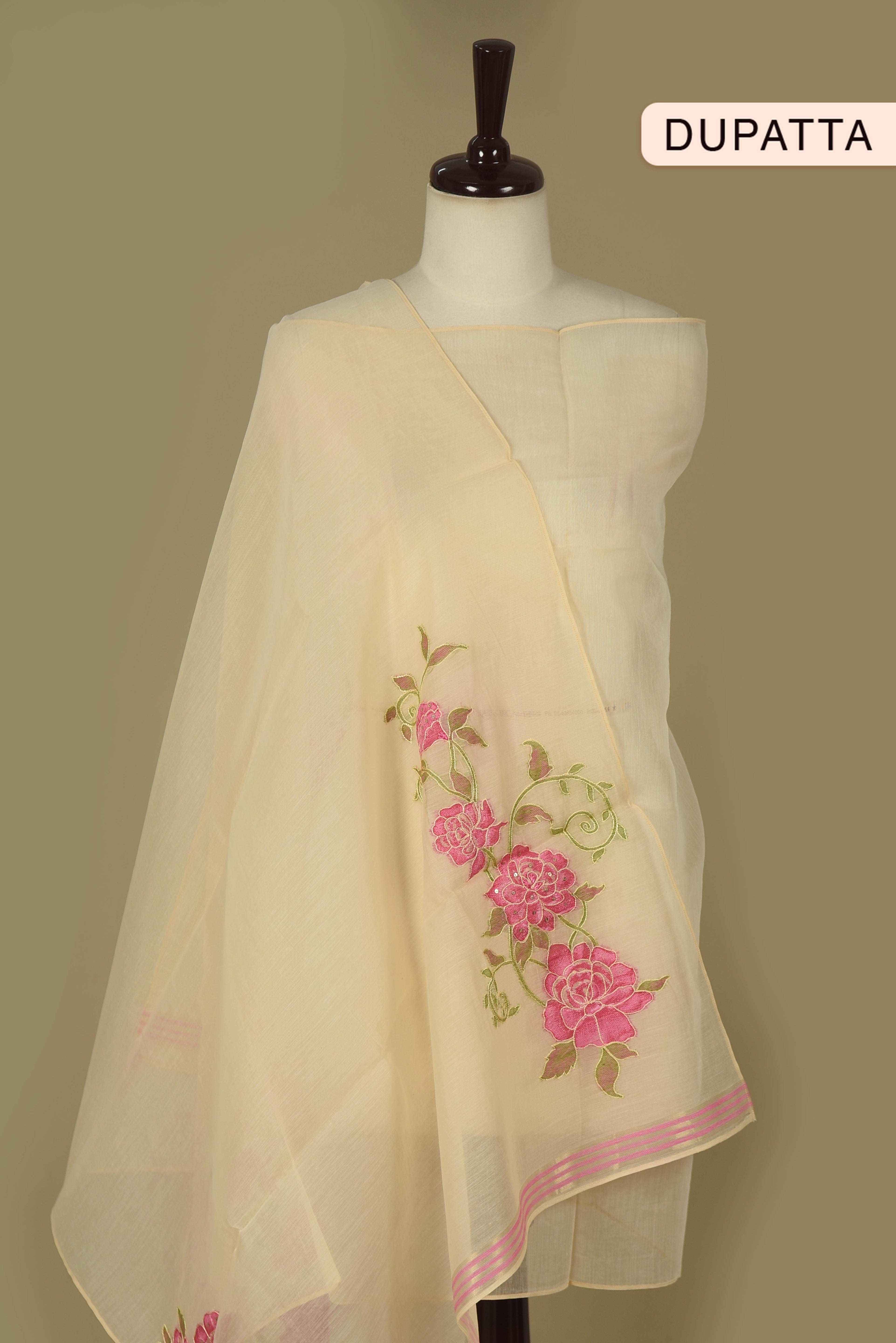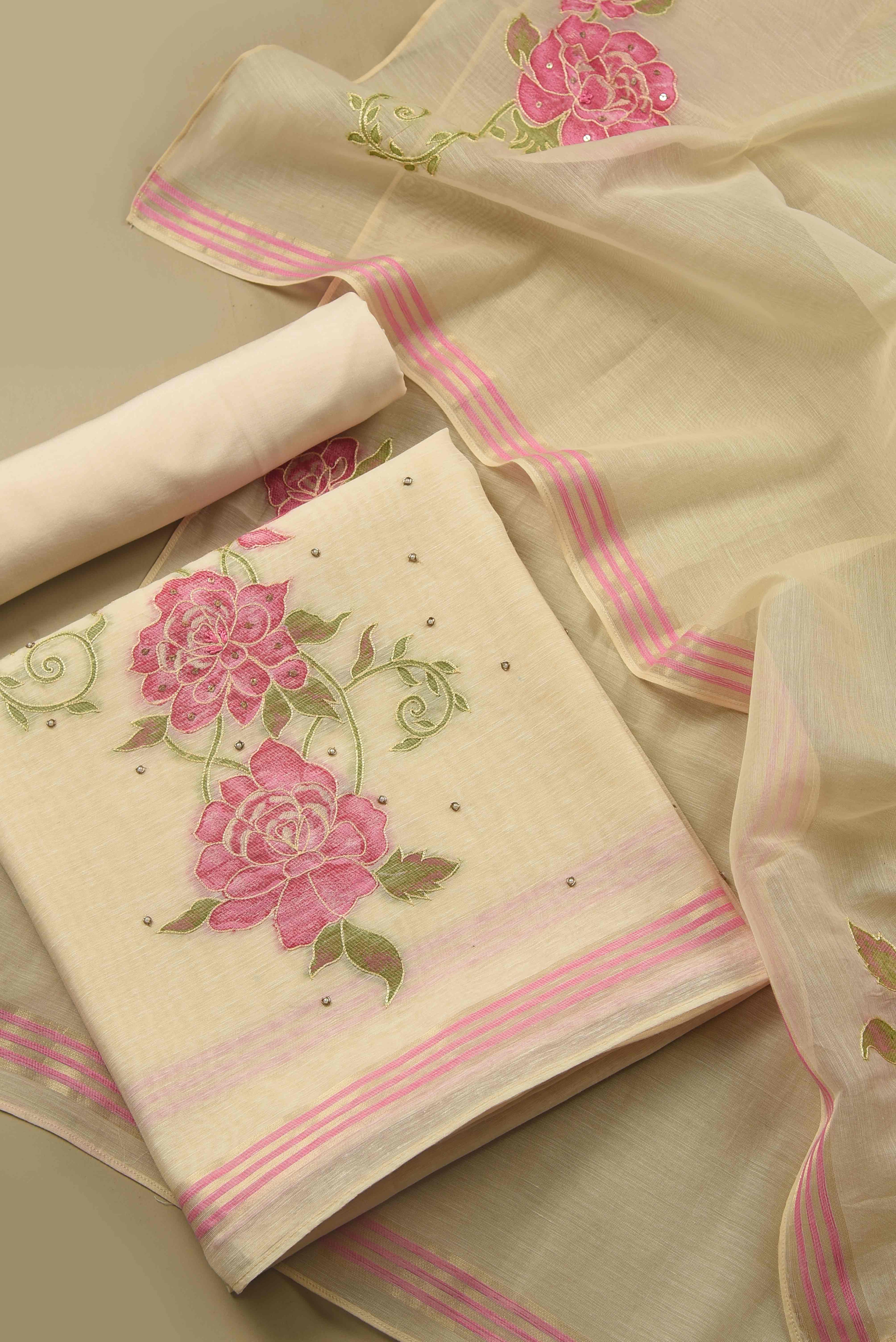 Cream With Pink Linen Embroidered Unstitched Suit Fabric Set With Linen Embroidered Dupatta