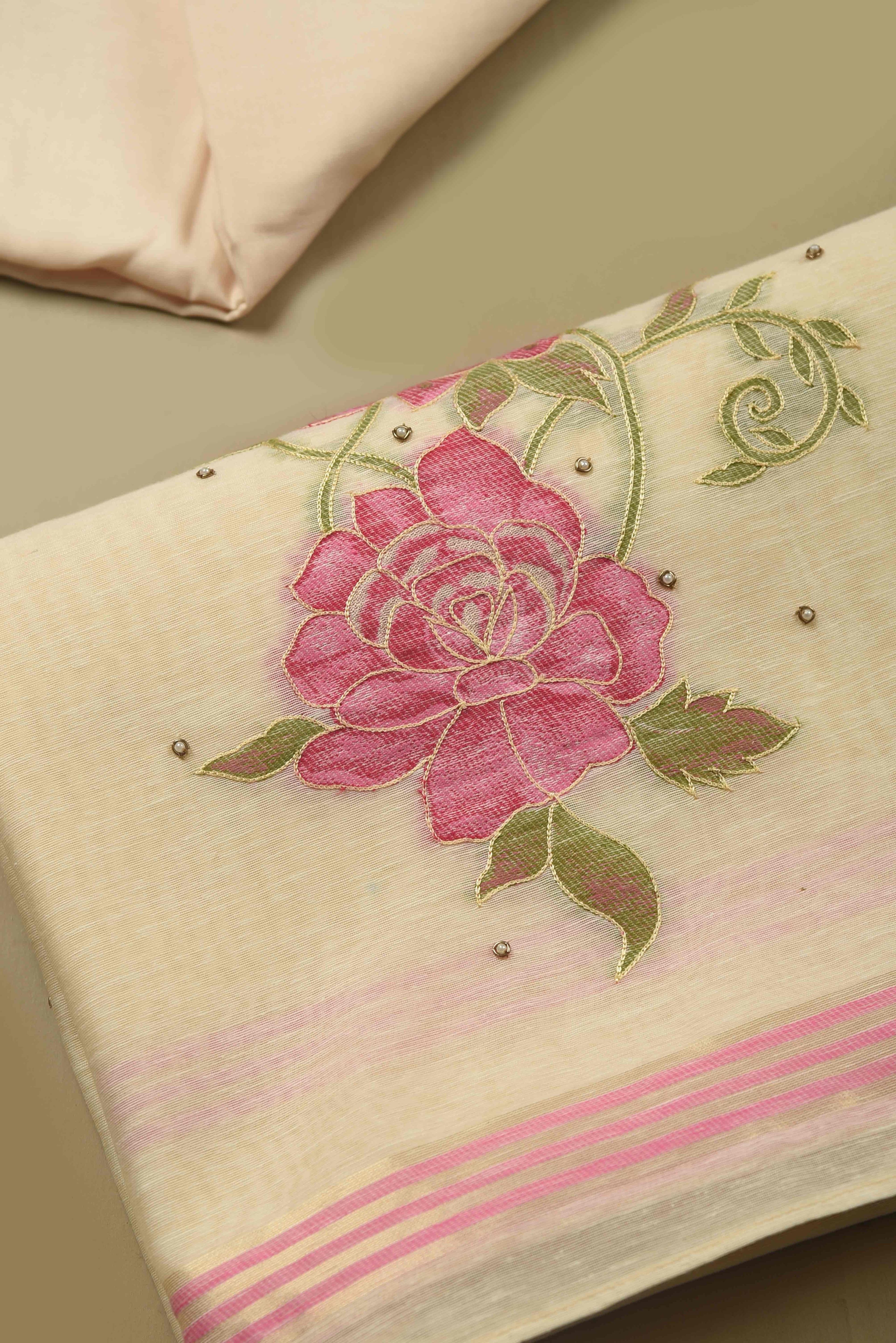 Elevate your occasion wear wardrobe with this Cream with Pink Linen Embroidered Unstitched Suit Fabric Set.