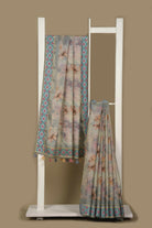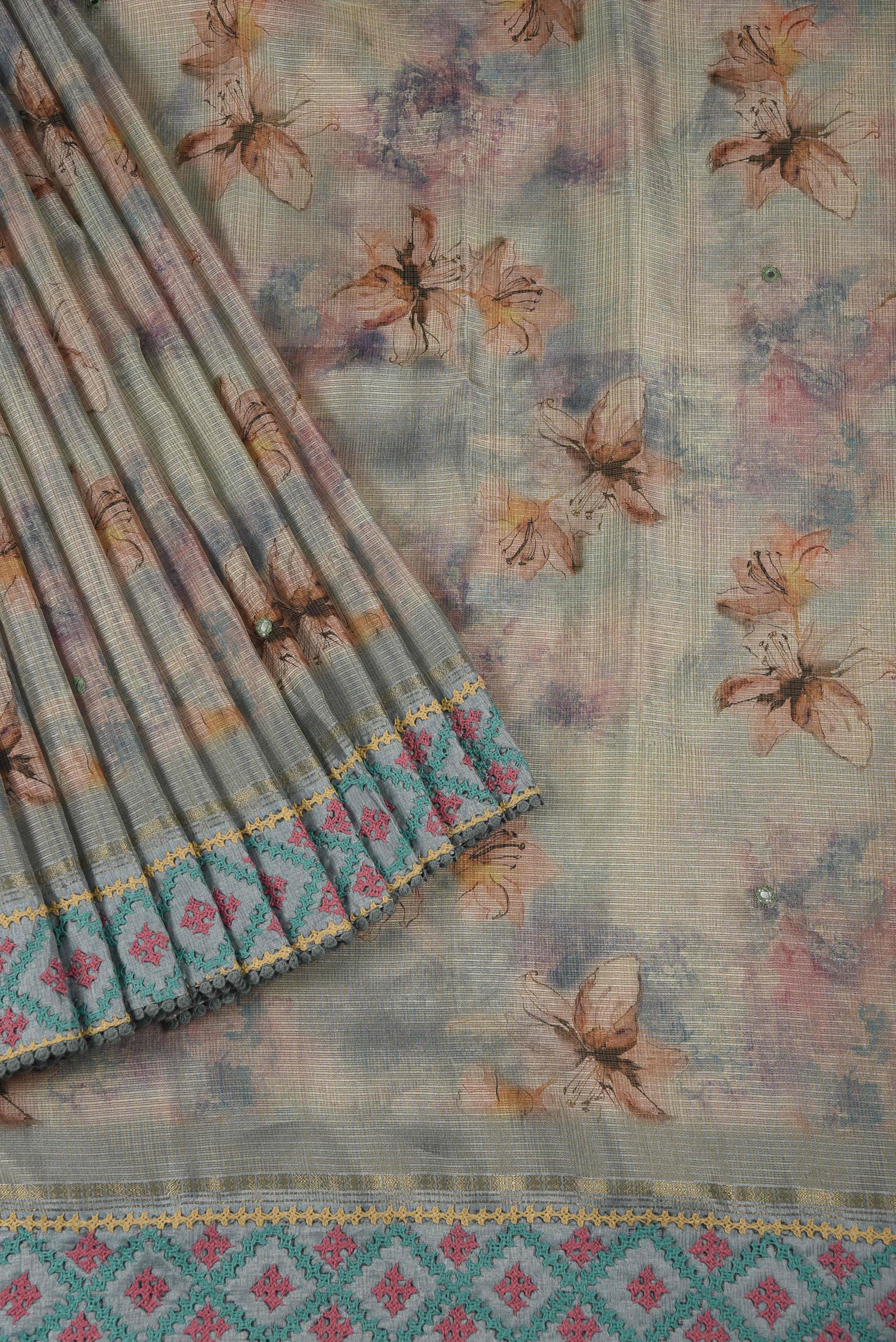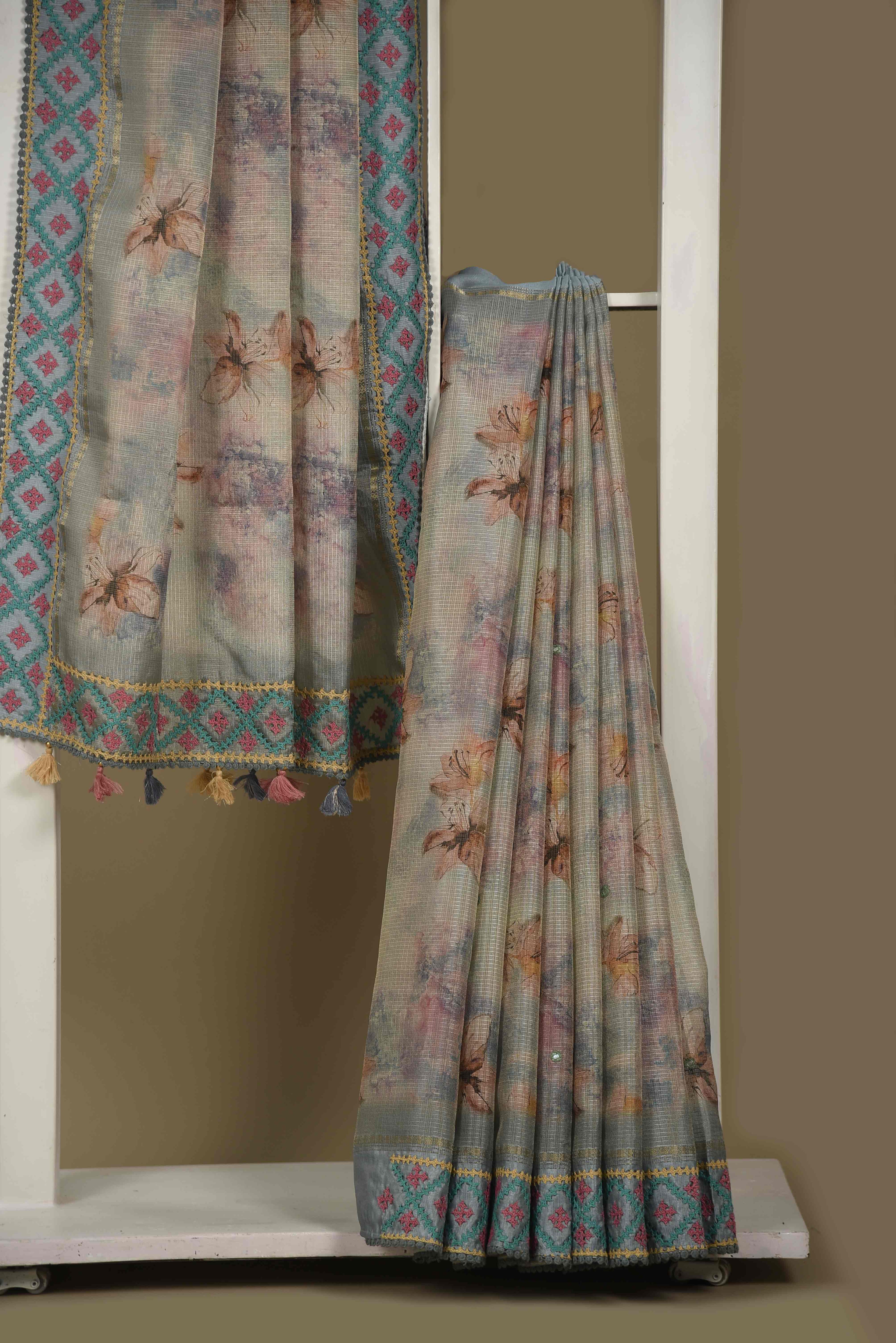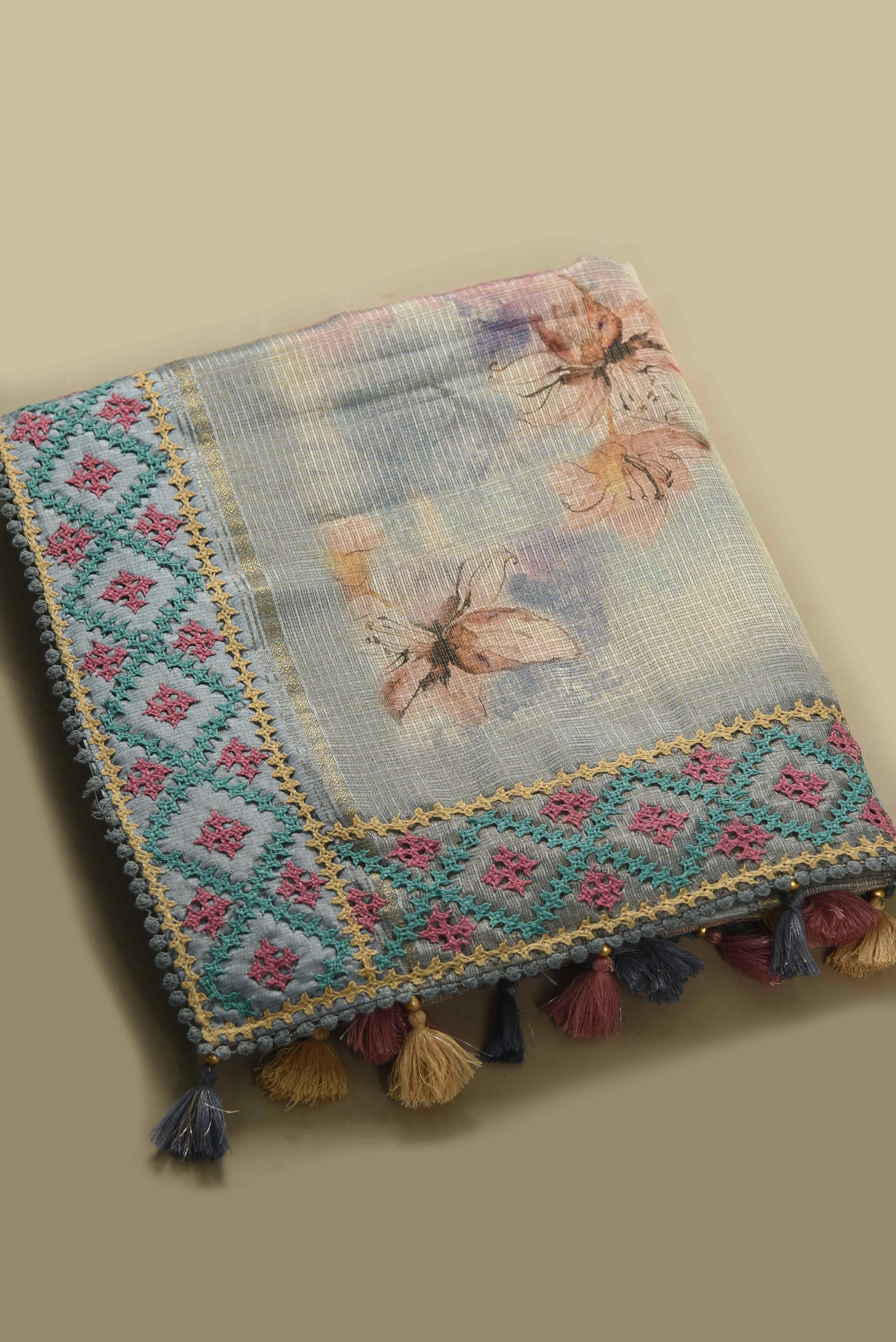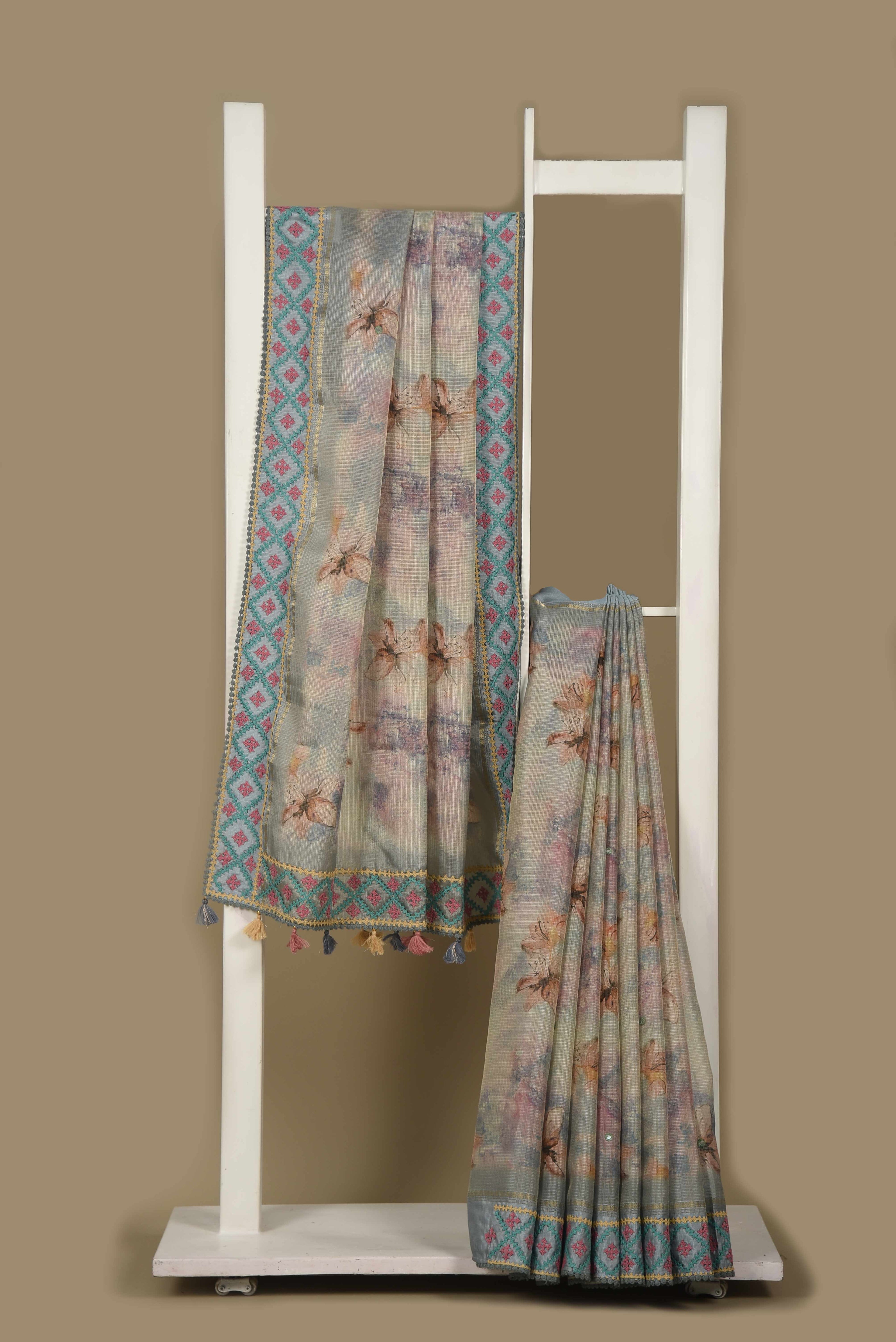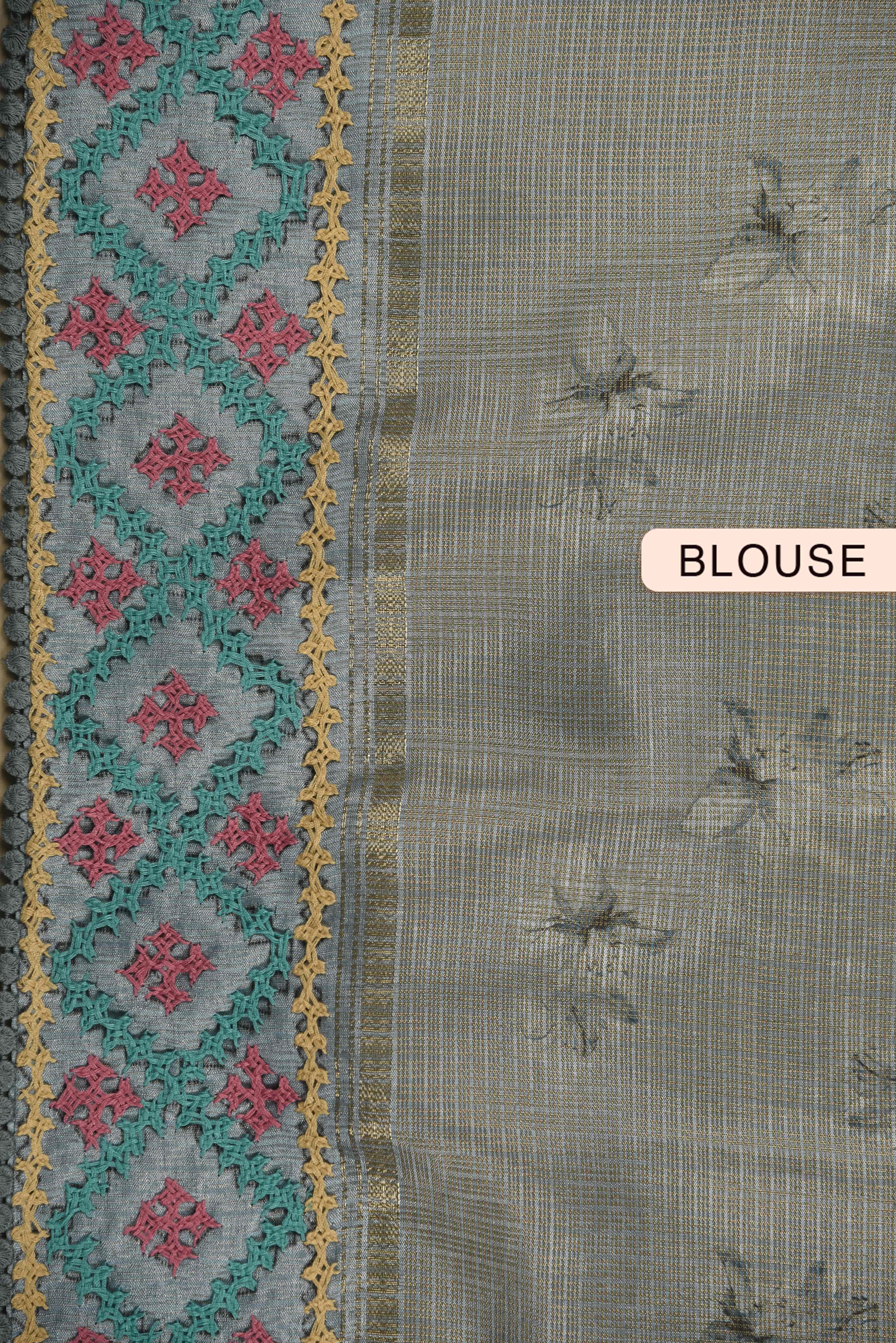 Gray Tissue Kota Printed & Embroidered Saree with Matching Blouse