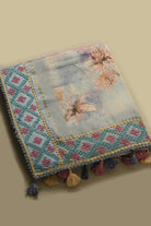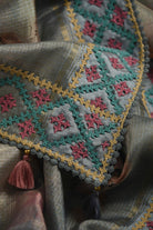 - The refined gray hue is elevated with intricate digital prints and delicate embroidery, thoughtfully placed along the borders for a subtle yet striking effect.