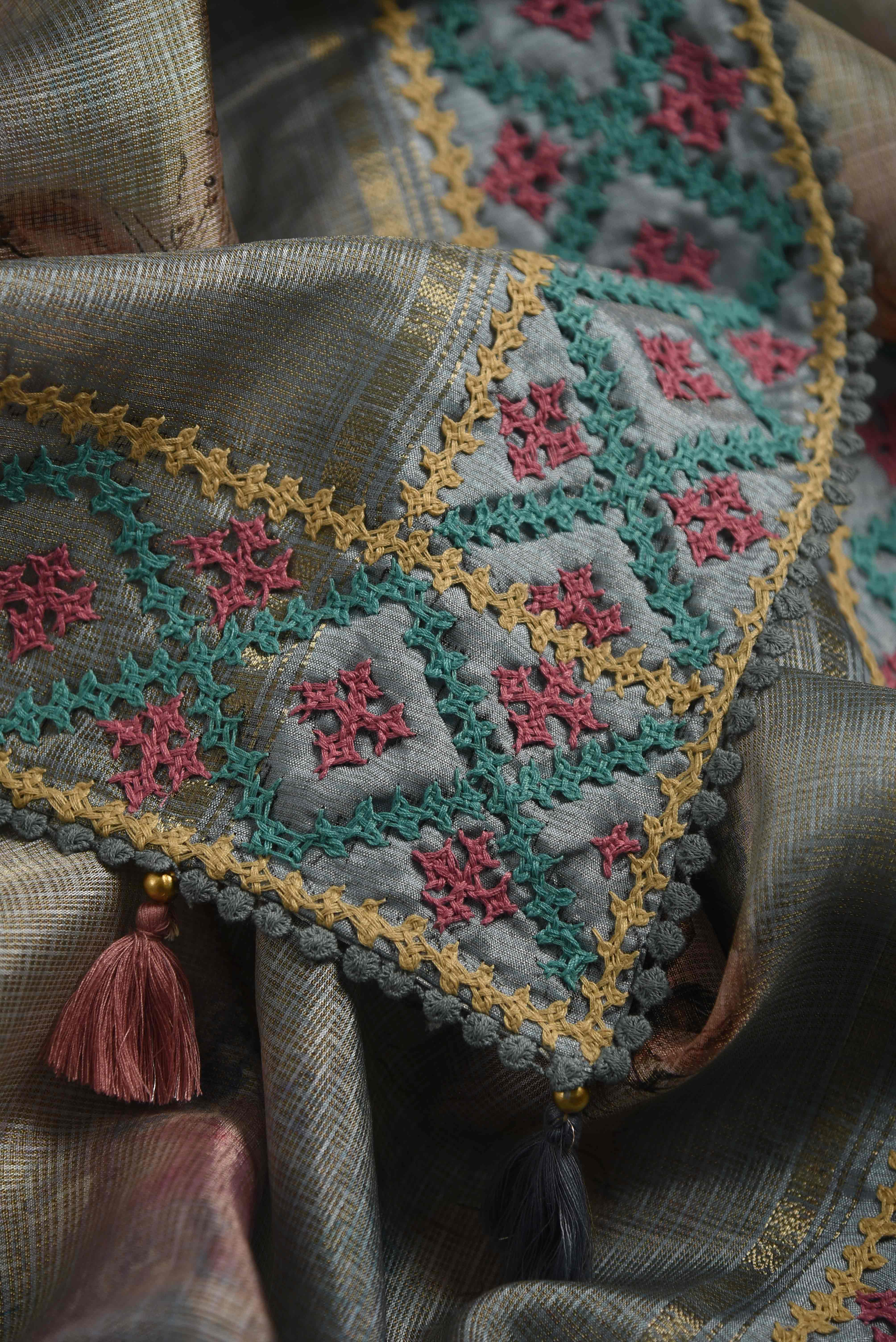 - Exude graceful charm with our Gray Tissue Kota Printed and Embroidered Saree, paired with a matching blouse piece.