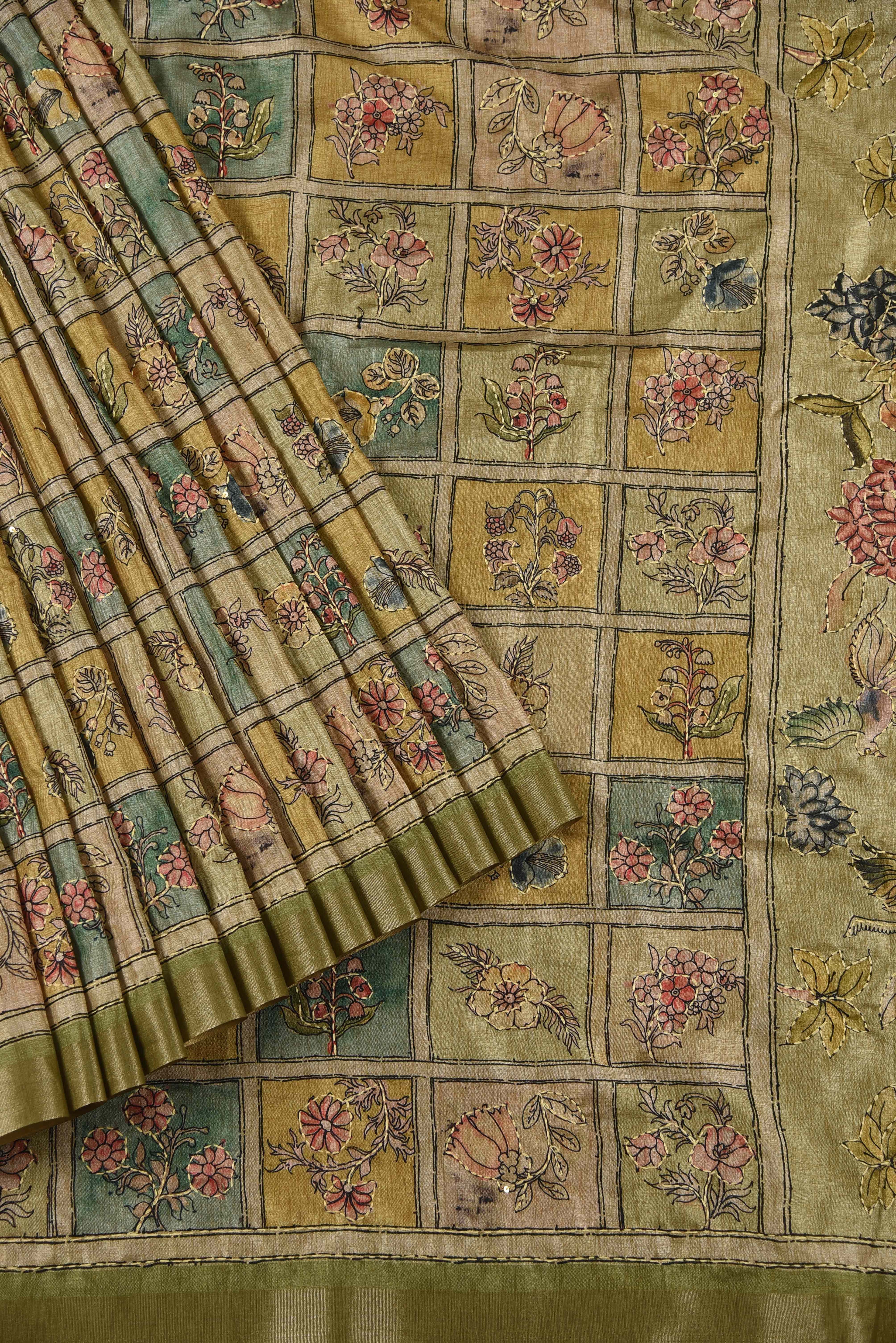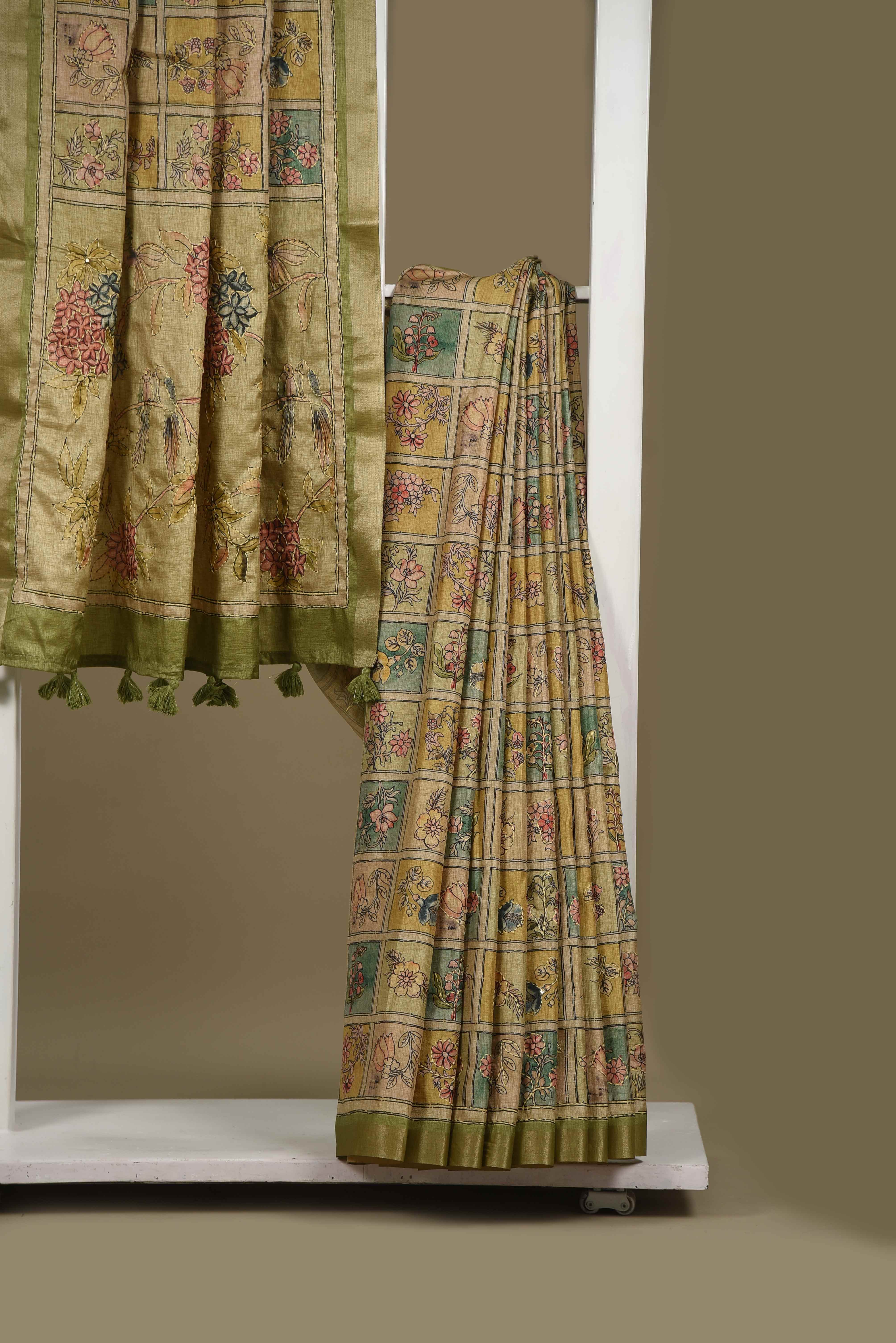 - The refreshing Green base is enhanced with a finely woven border and further elevated by delicate printed and embroidered detailing.