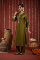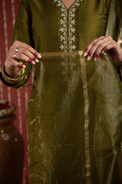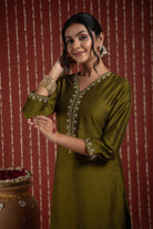 Green Cotton Silk V-Neck Zari Work Kurta Set Regular Fit