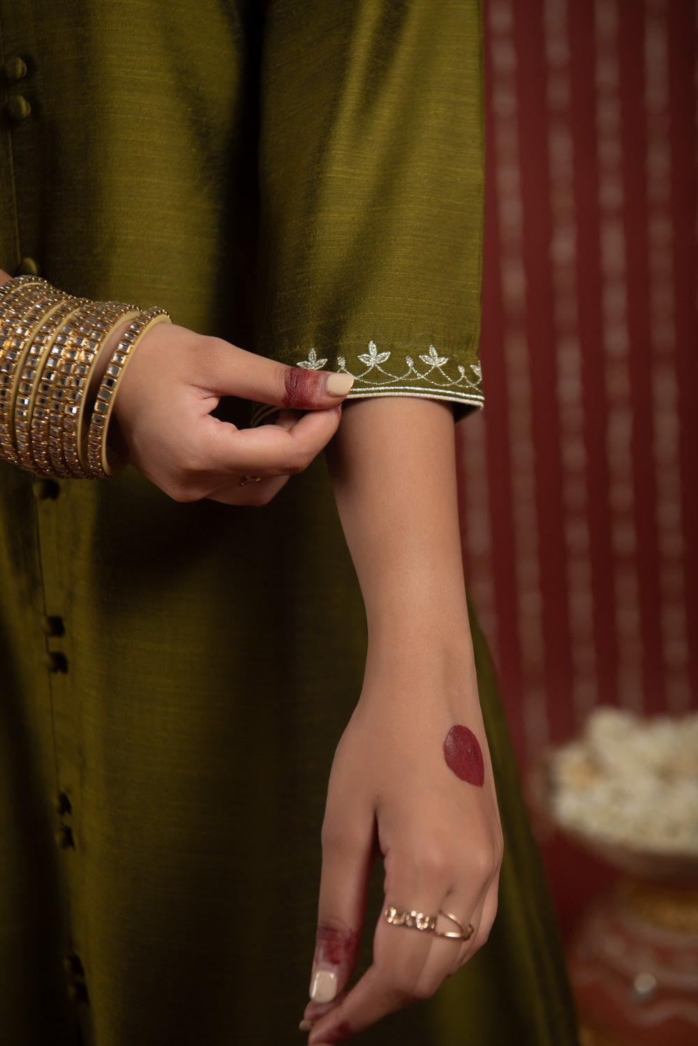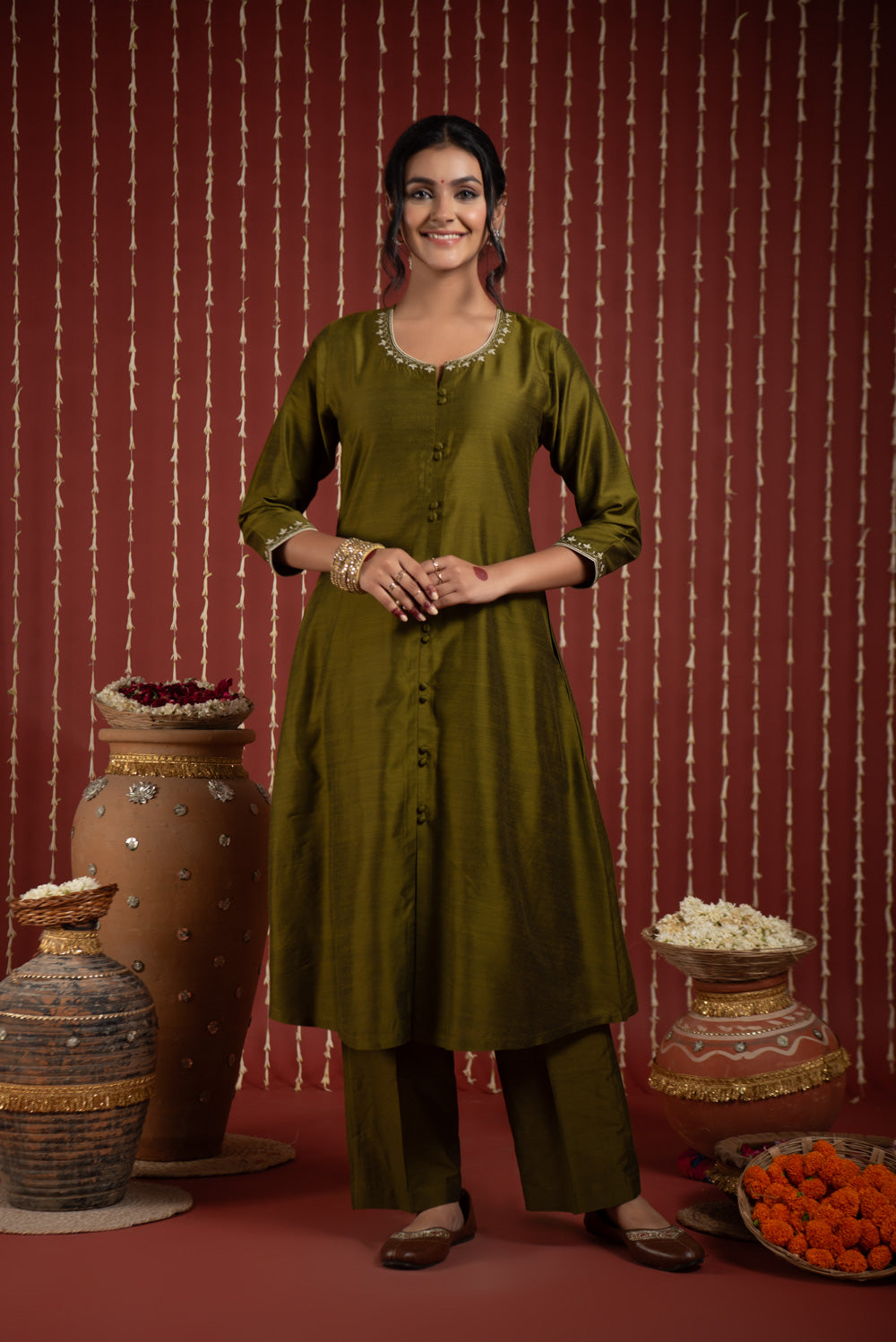 Green Cotton Silk Zari Work A-Line Kurta Set Regular Fit