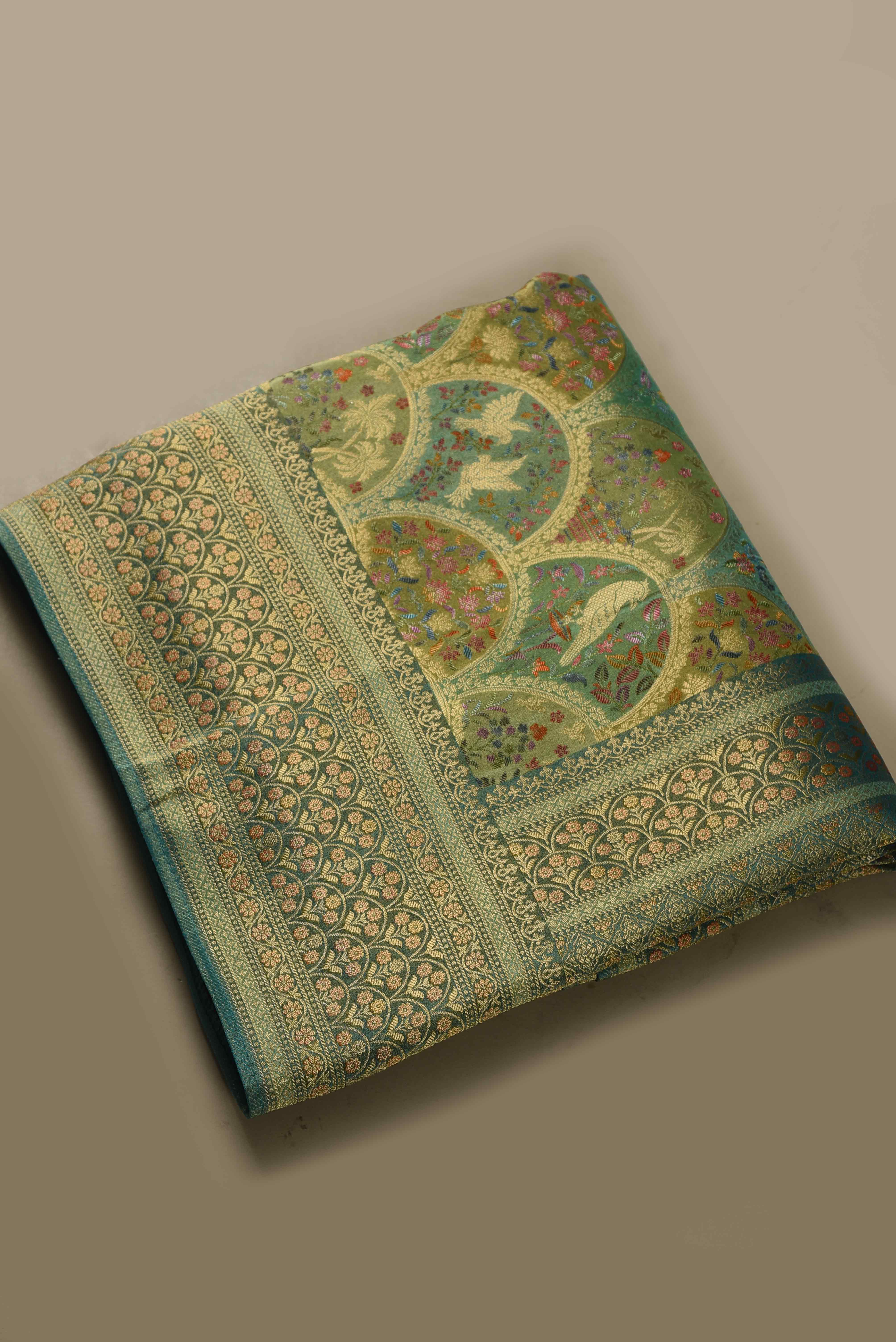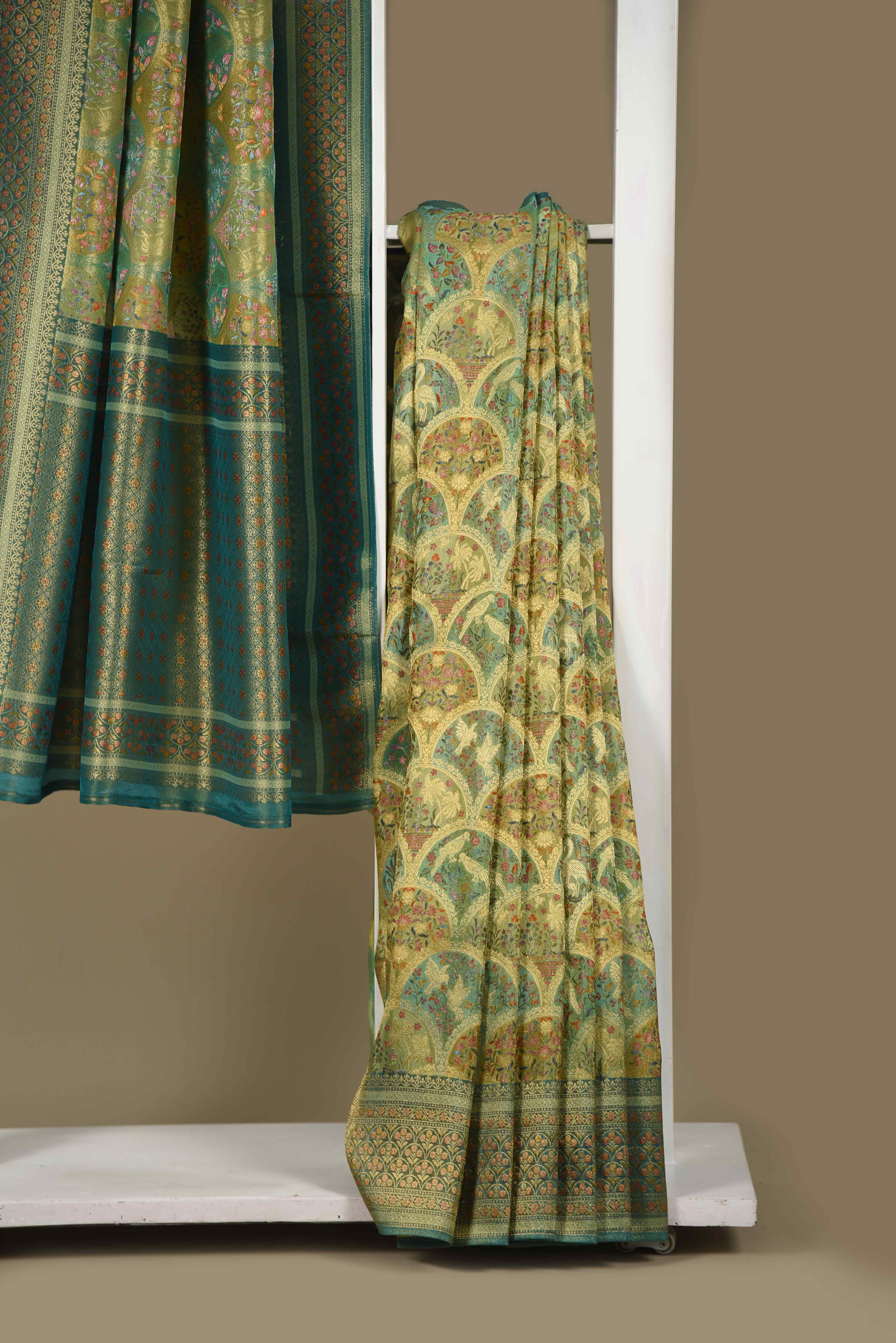 - Green Tissue Silk Viscose Blend Multicolor Woven Saree with Matching Blouse Embrace timeless sophistication with our Green Tissue Silk Viscose Blend Saree, a graceful fusion of elegance and comfort.