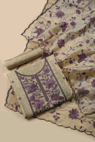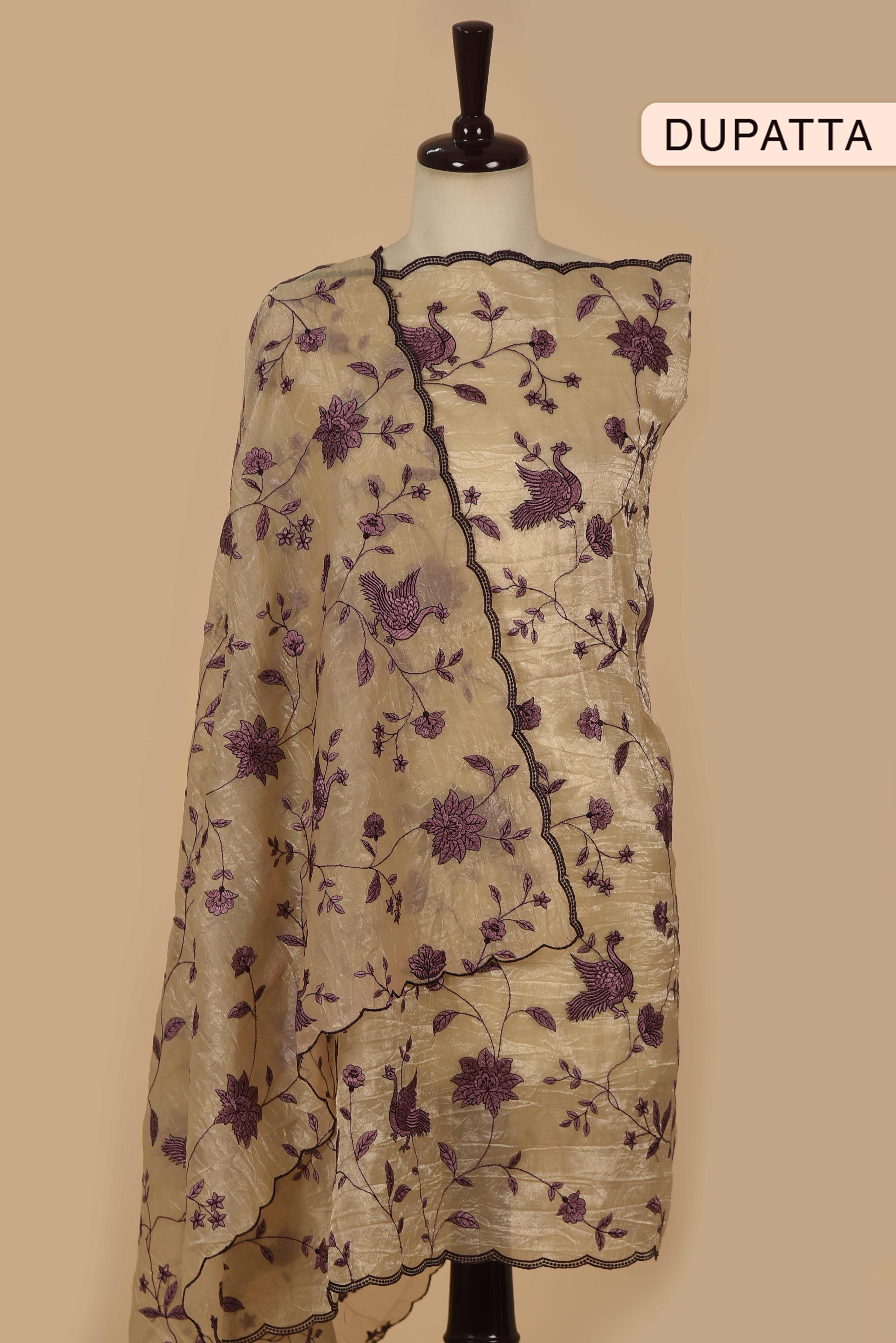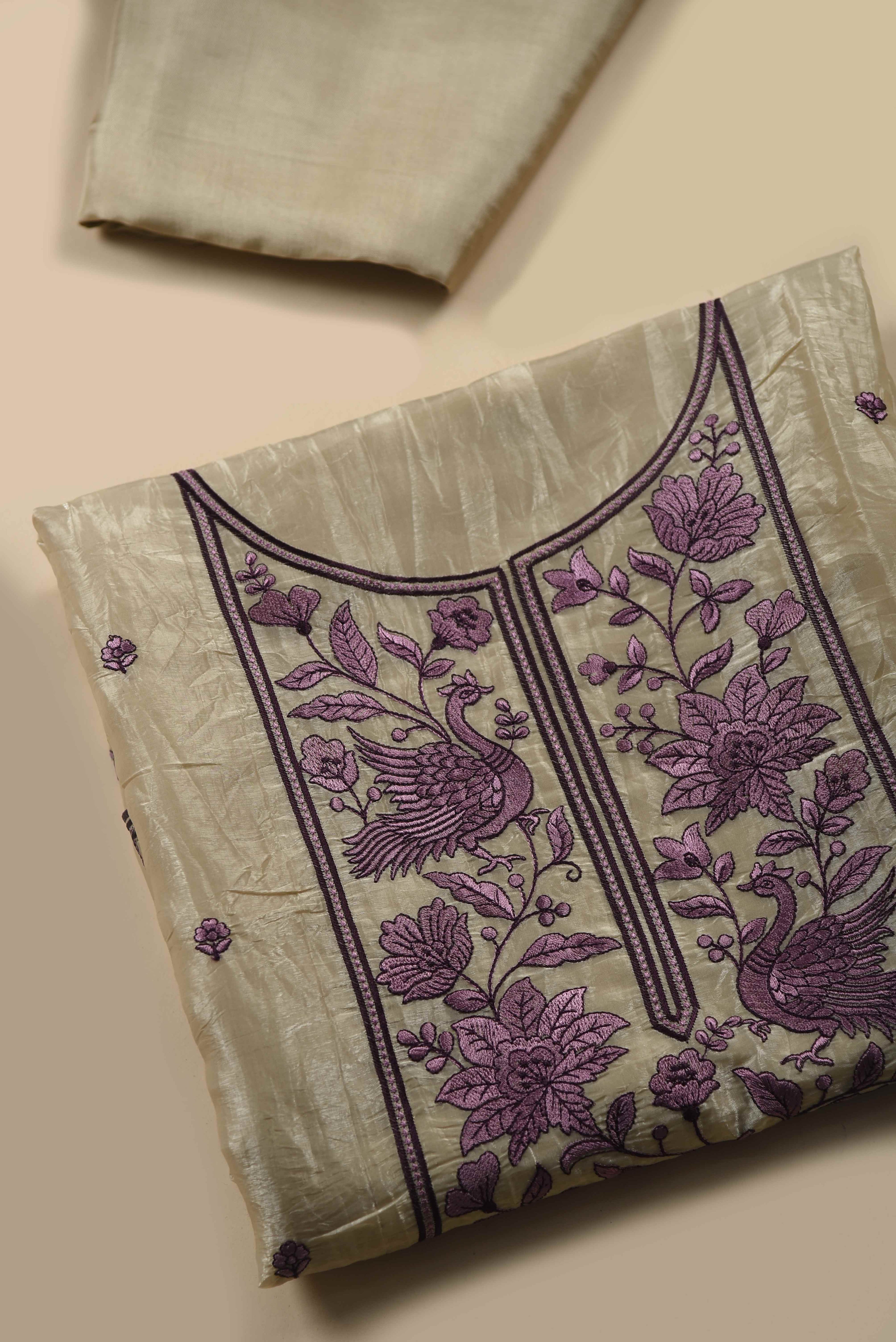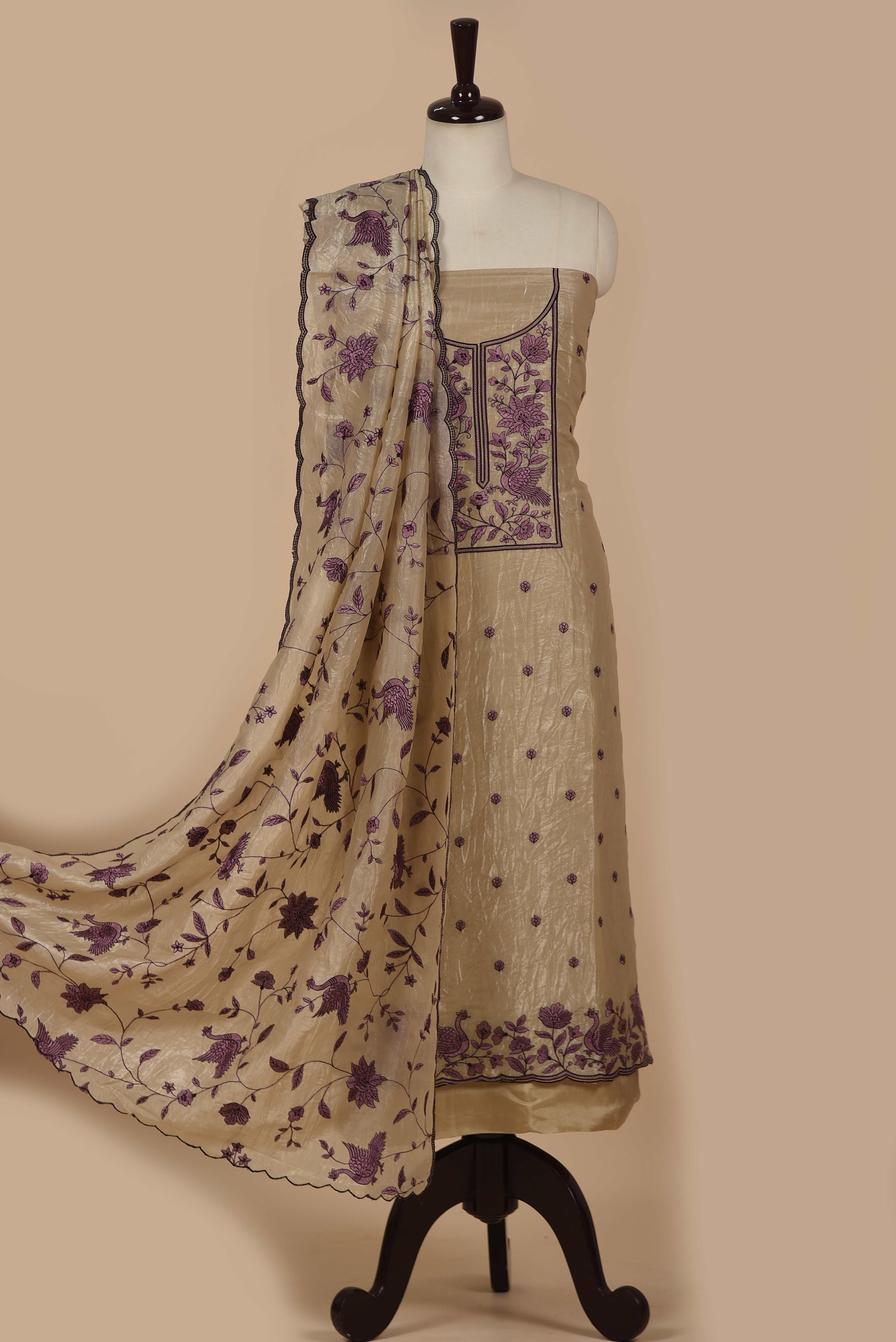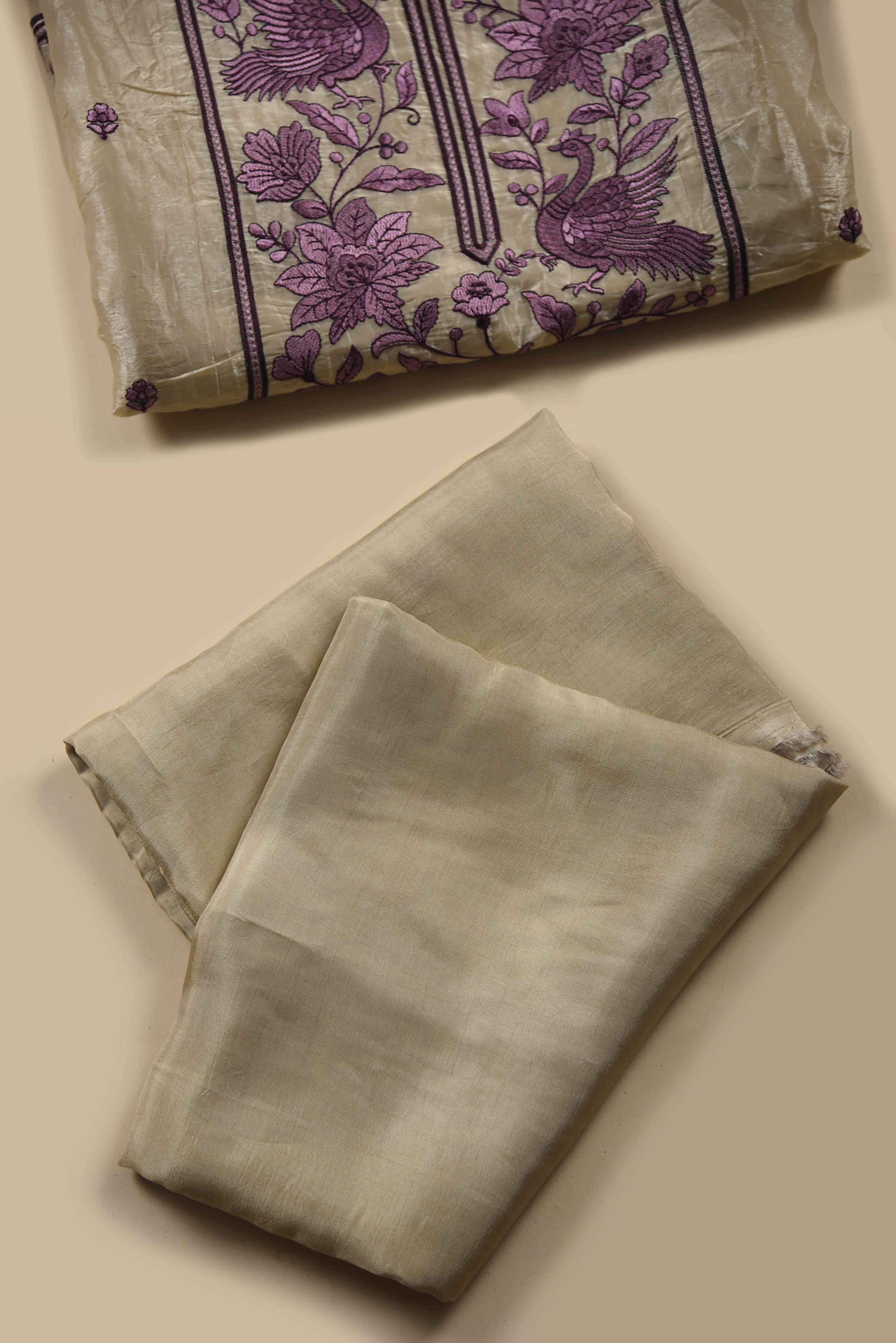 Light Camel & Mauve Crushed Silk Embroidered Unstitched Suit Set with Silk Dupatta