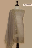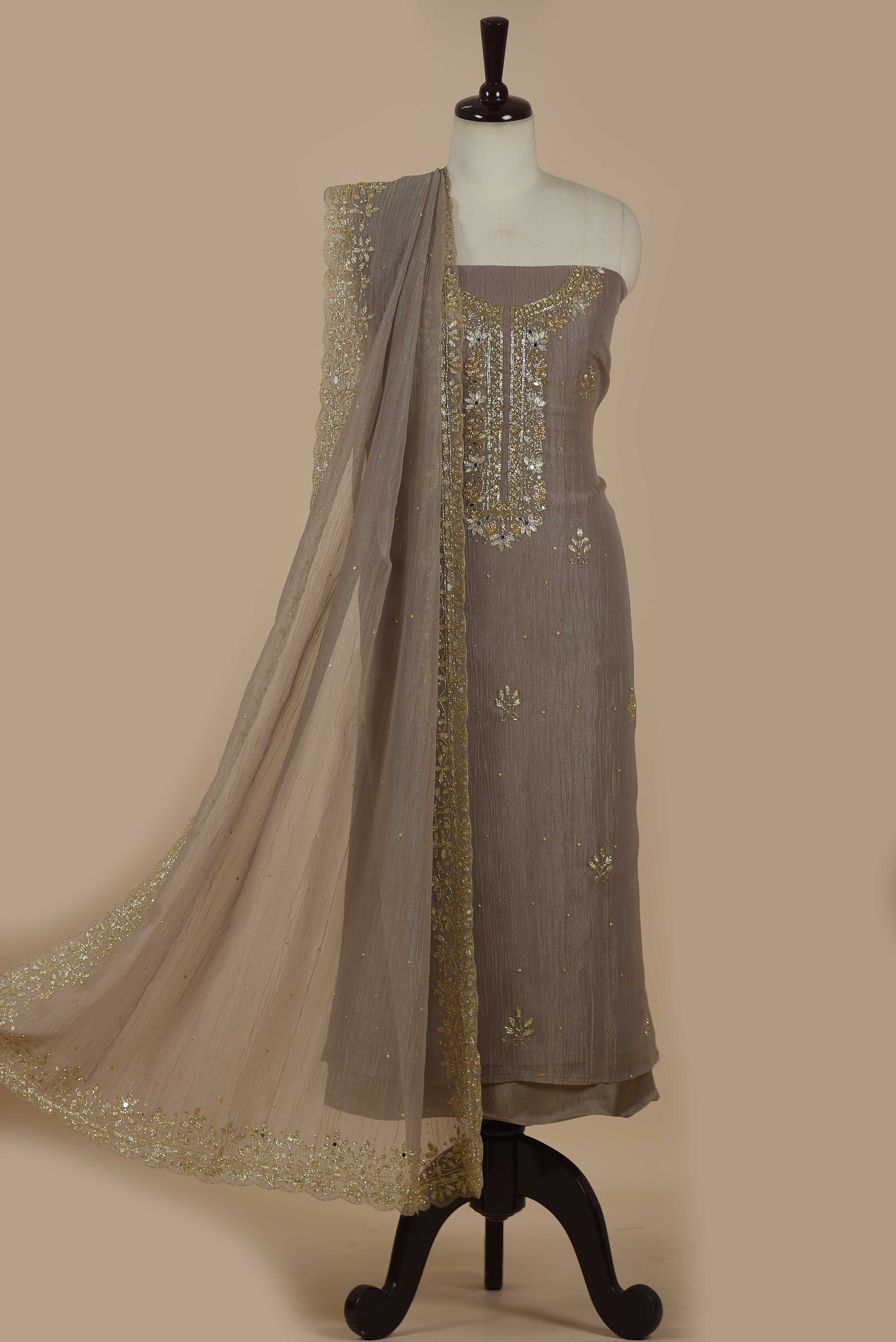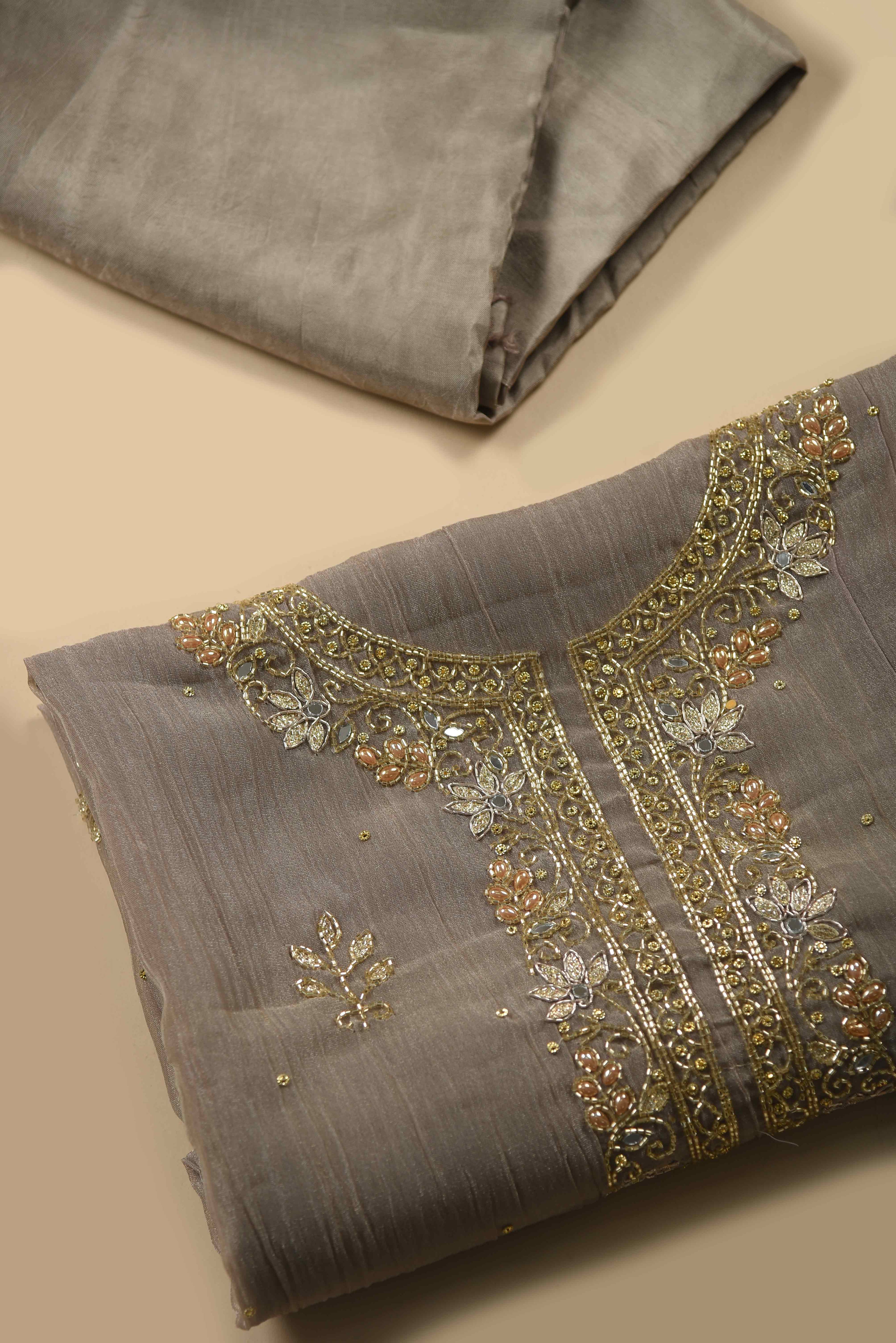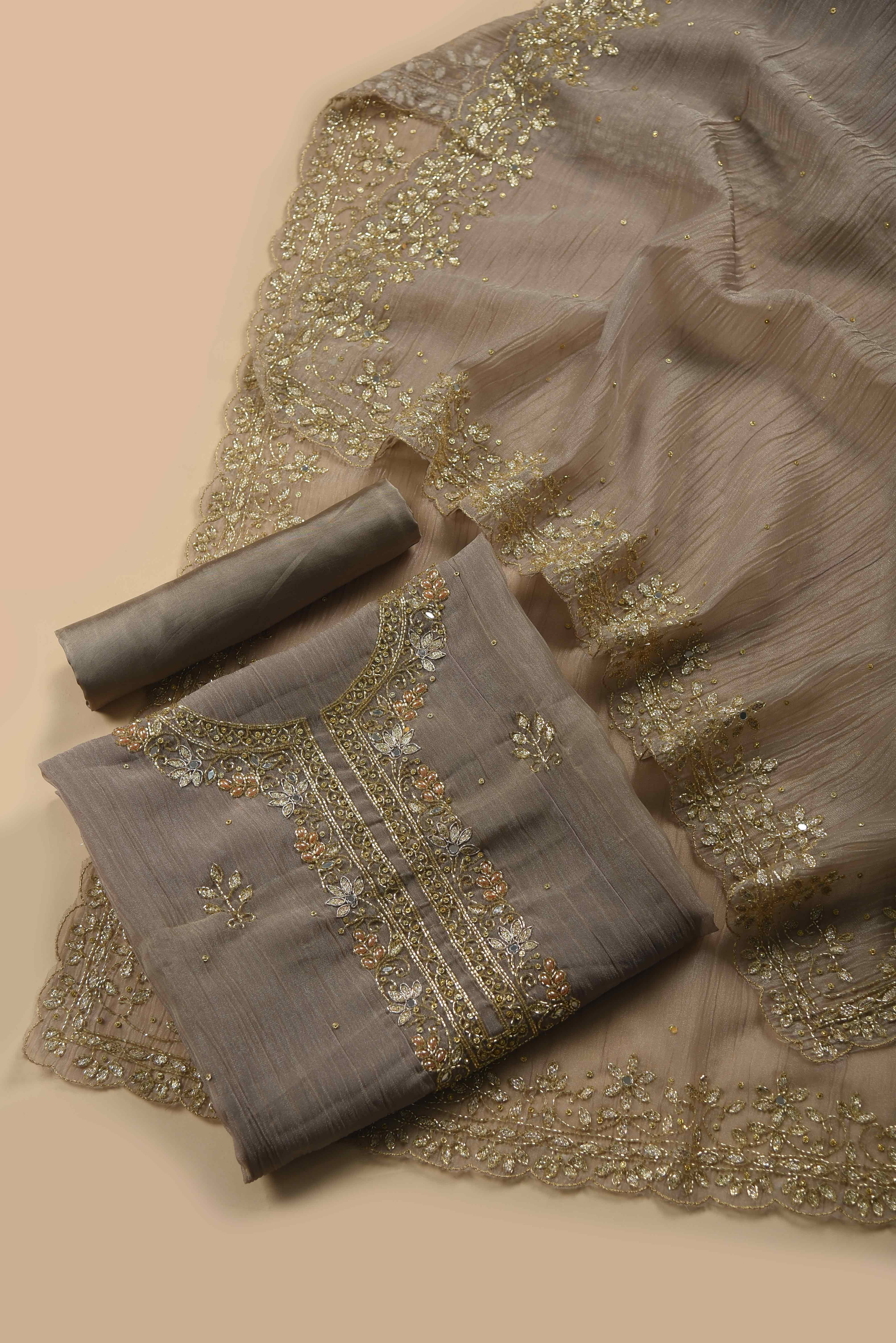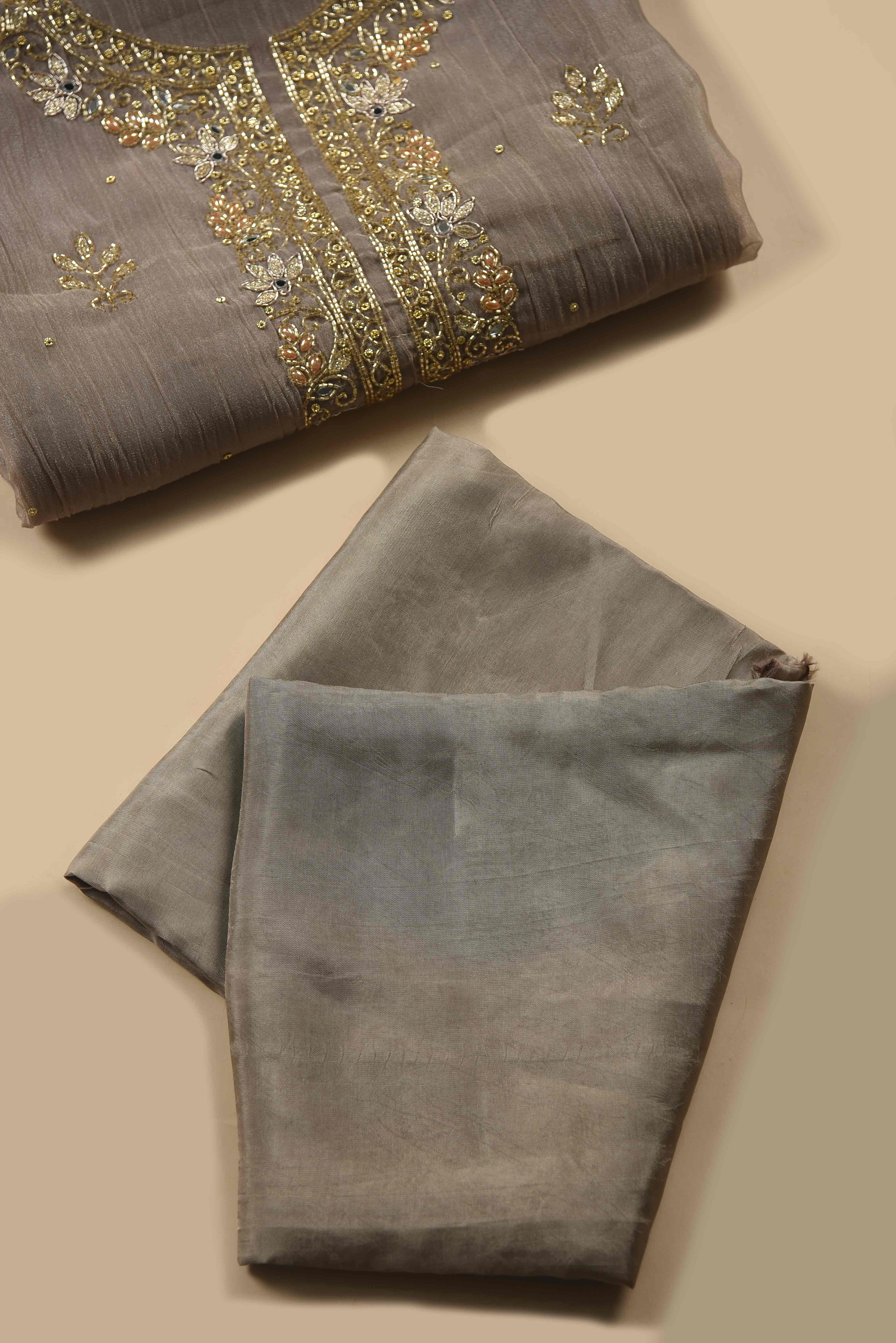 - Exude understated luxury with our Light Gray Tissue Silk Blend Hand-Embellished Unstitched Suit Fabric Set—a timeless ensemble crafted to make a subtle yet striking statement.
