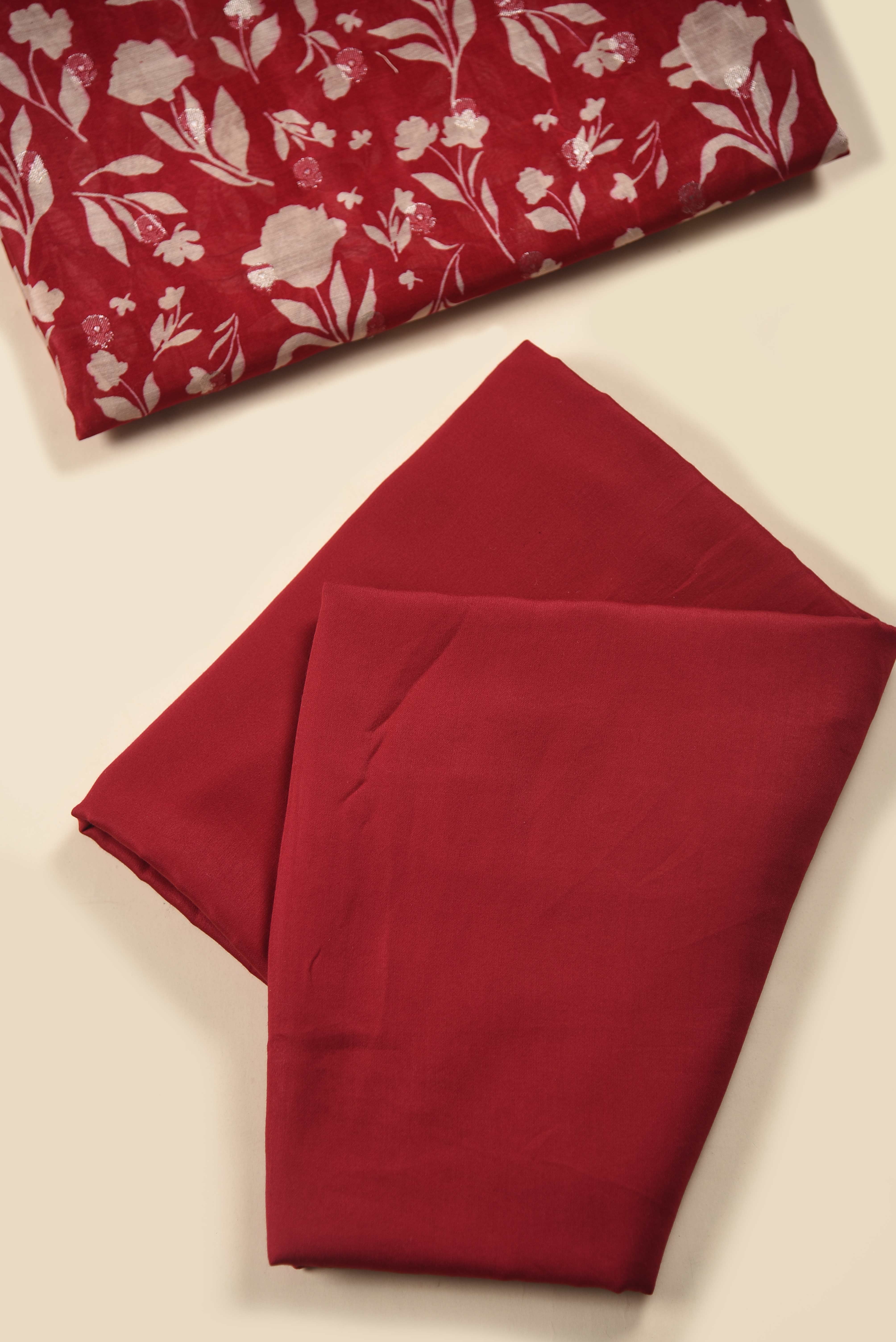 - Maroon Chanderi Silk Printed & Woven Unstitched Suit Fabric Set with Matching Dupatta Radiate timeless elegance with this Maroon Chanderi Silk Unstitched Suit Fabric Set, exquisitely paired with a coordinated printed and woven Chanderi dupatta.