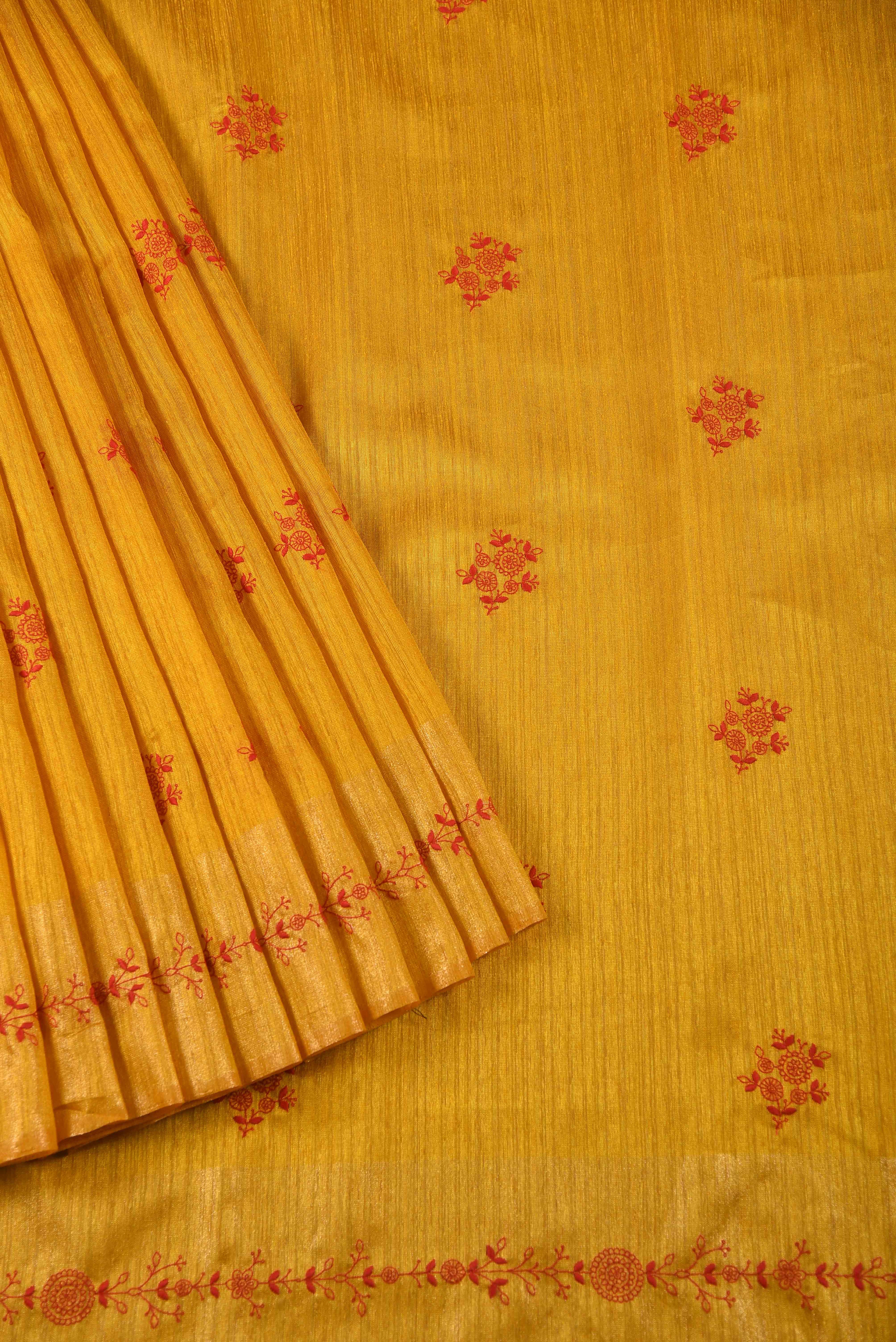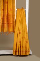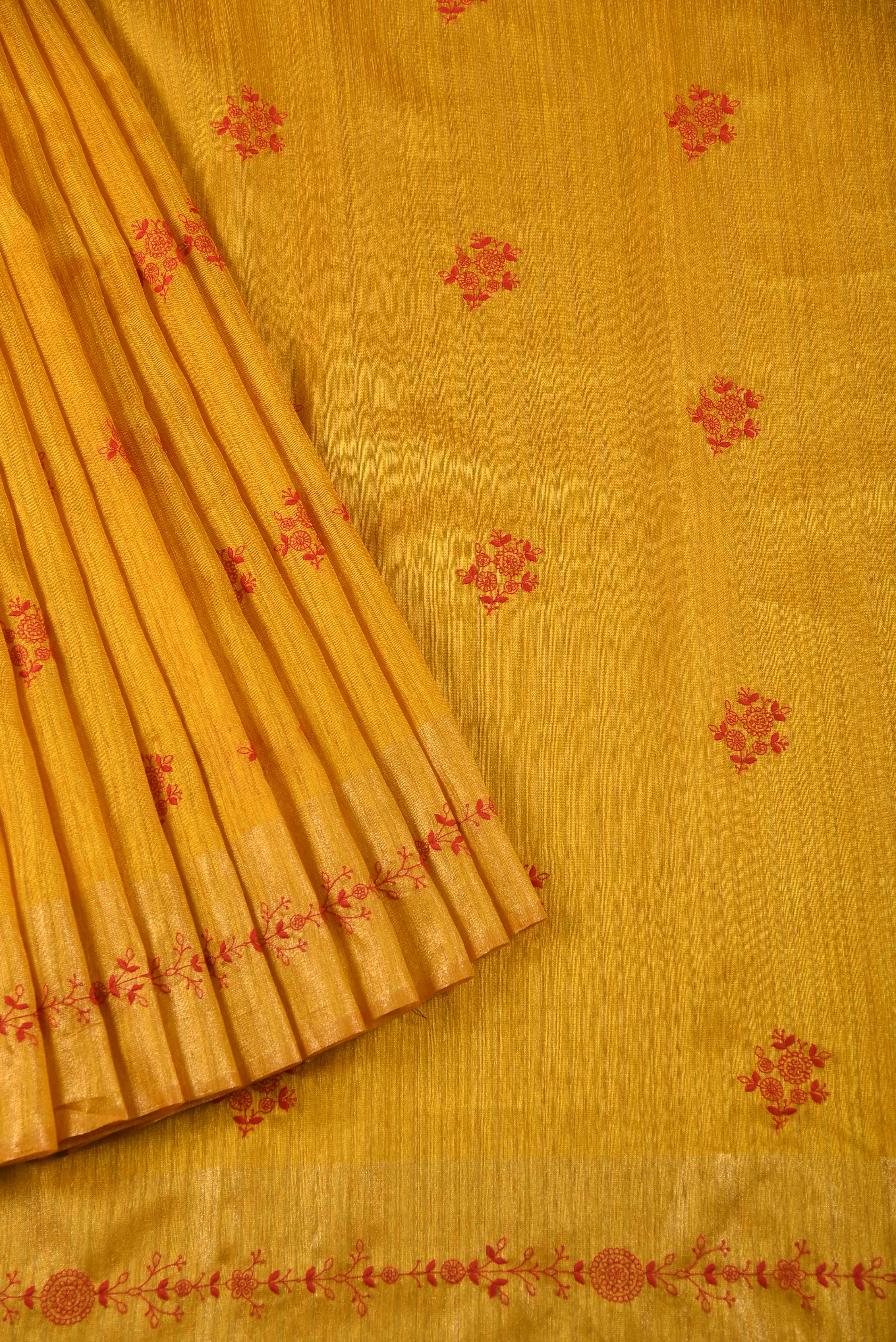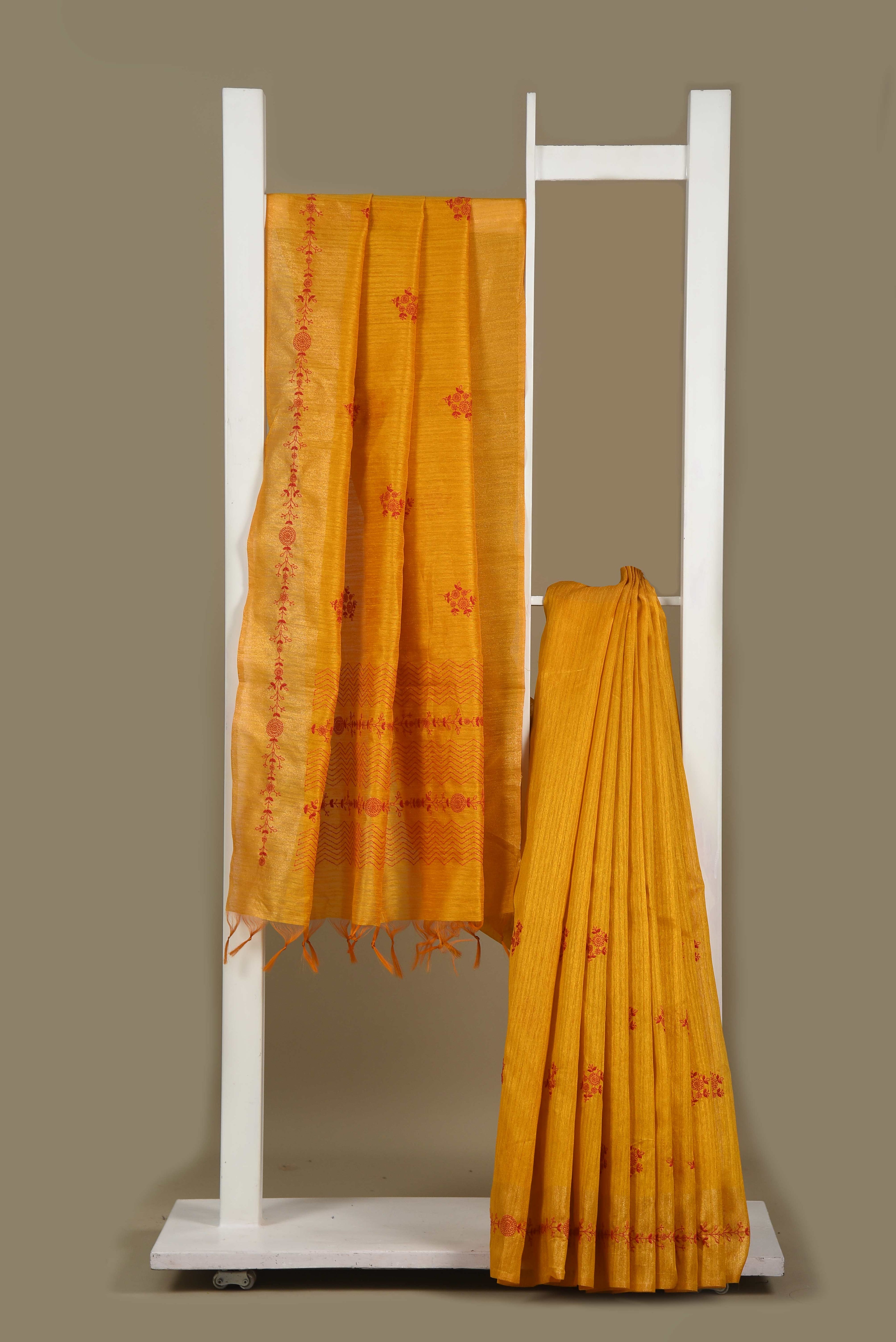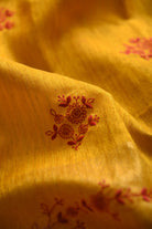 - Embrace graceful sophistication with our Mustard Linen Silk Blend Embroidered Saree, paired with an unstitched matching blouse piece.