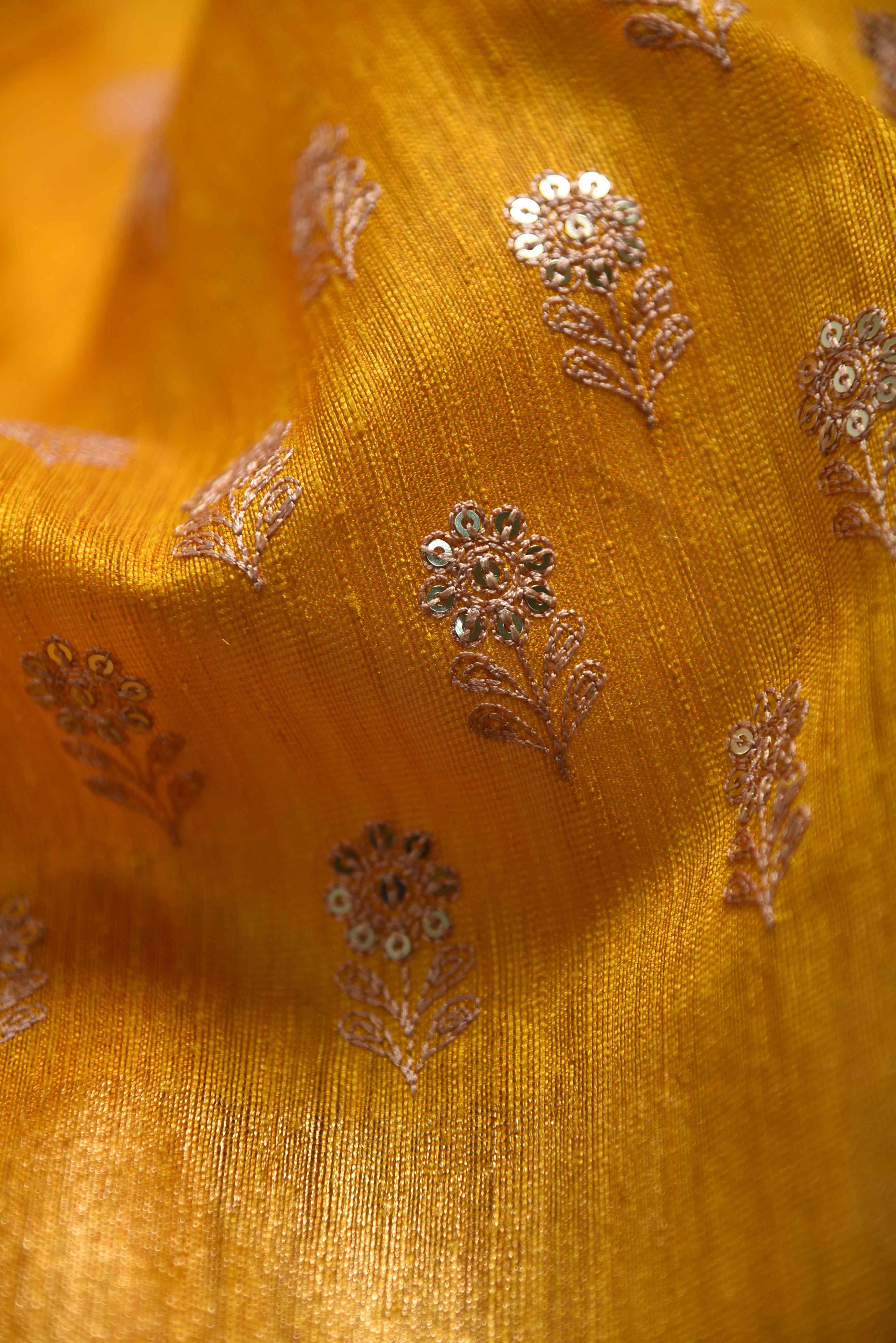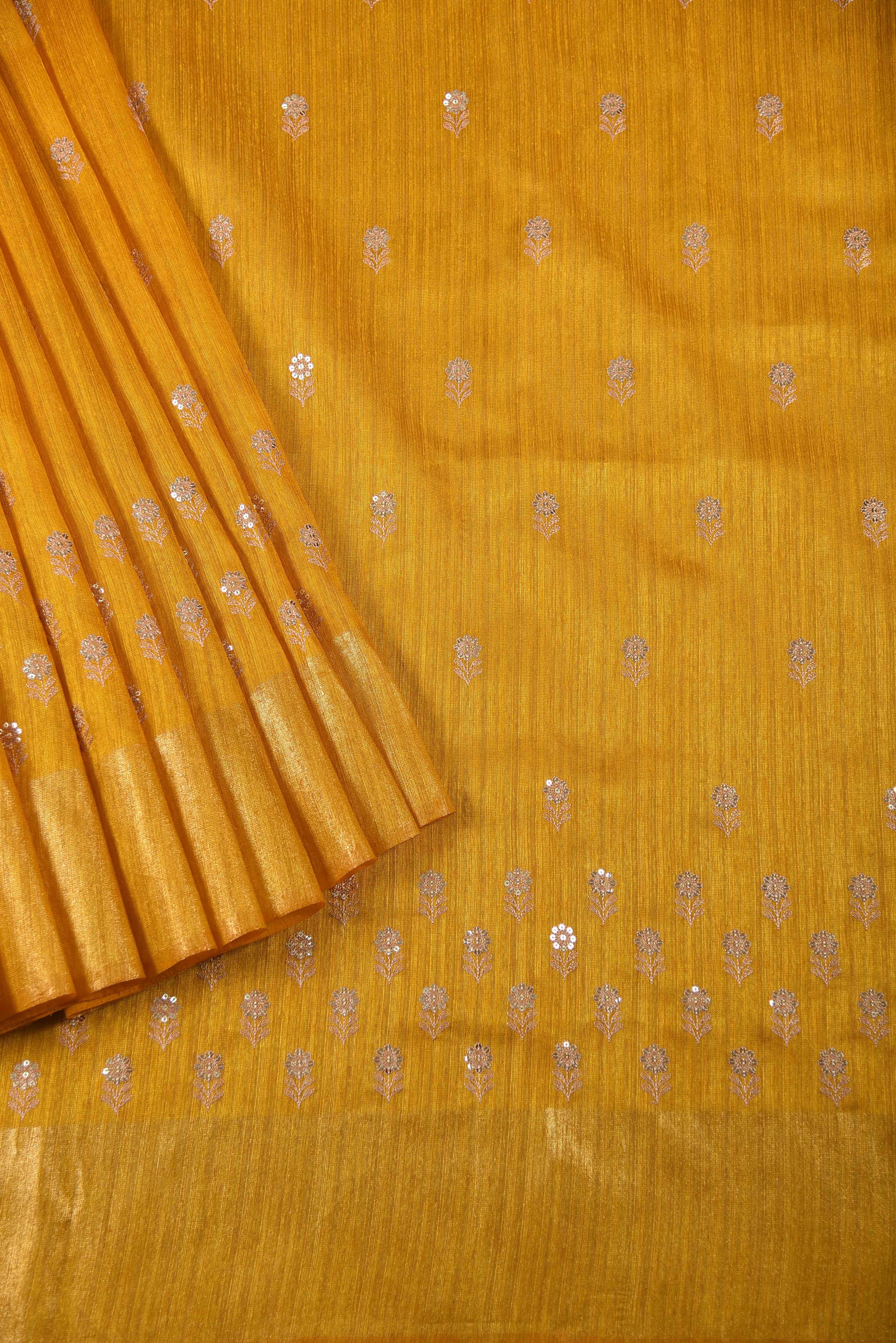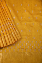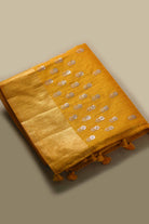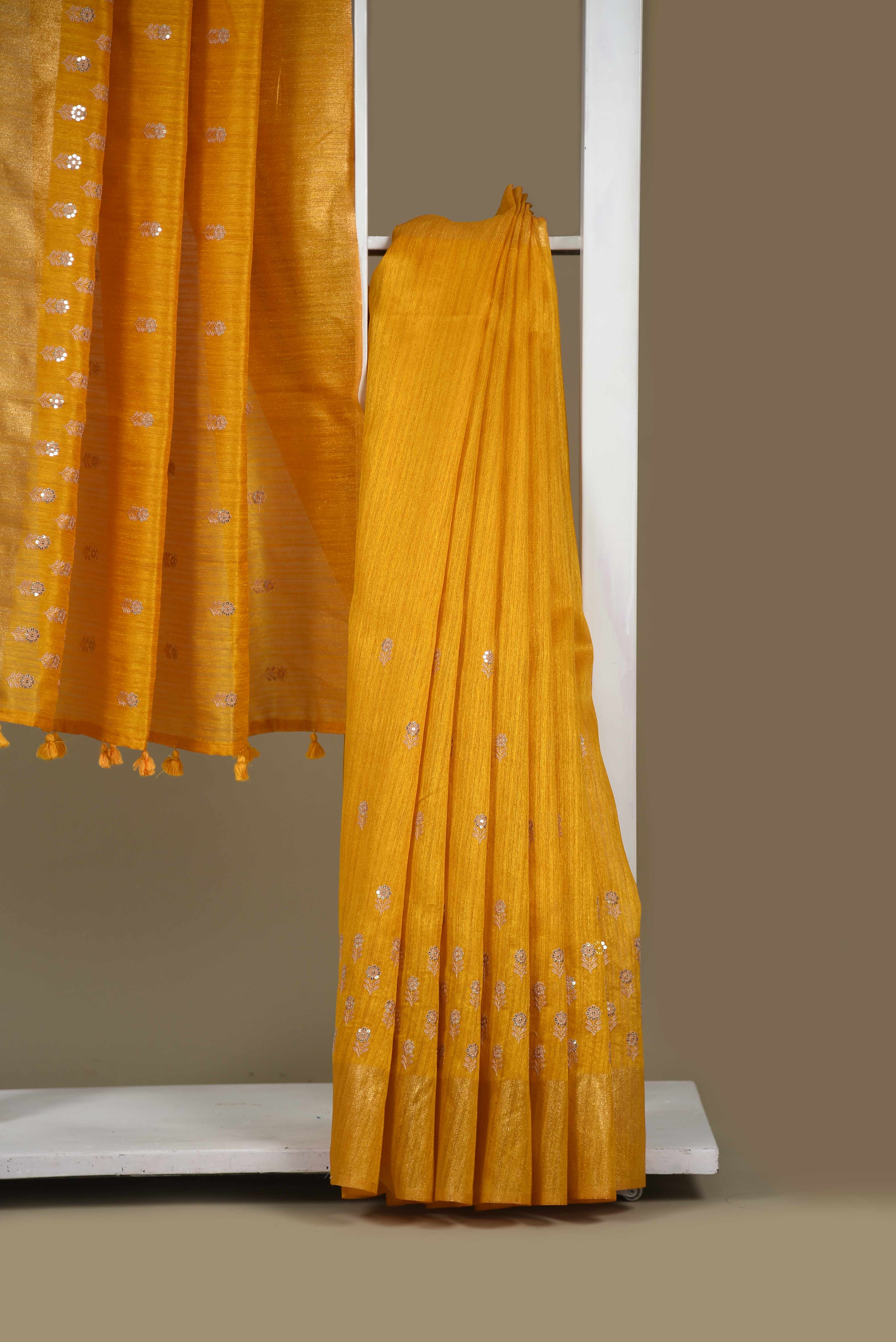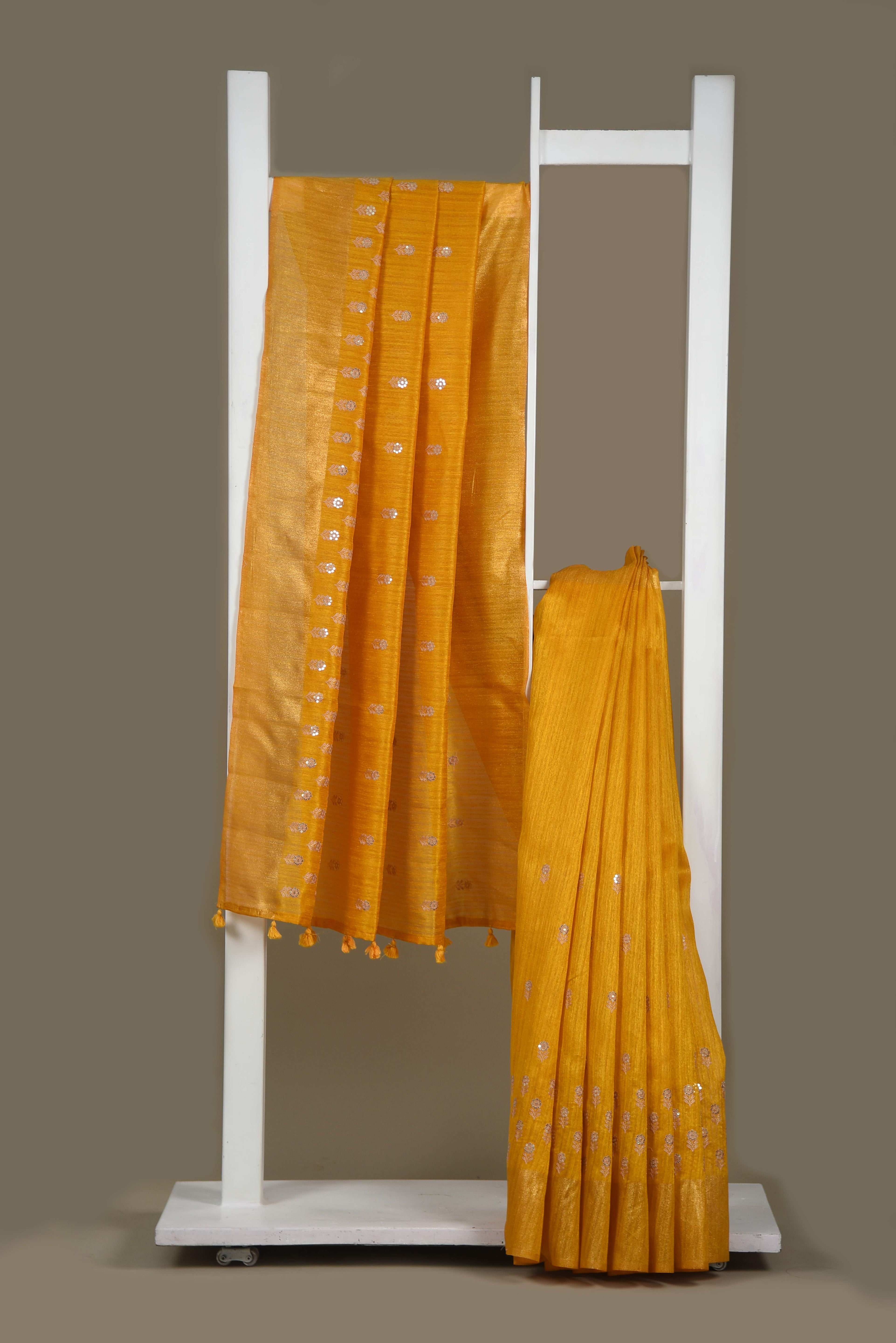 - Drape yourself in understated elegance with our Mustard Linen Silk Blend Embroidered Saree, thoughtfully paired with an unstitched matching blouse piece.