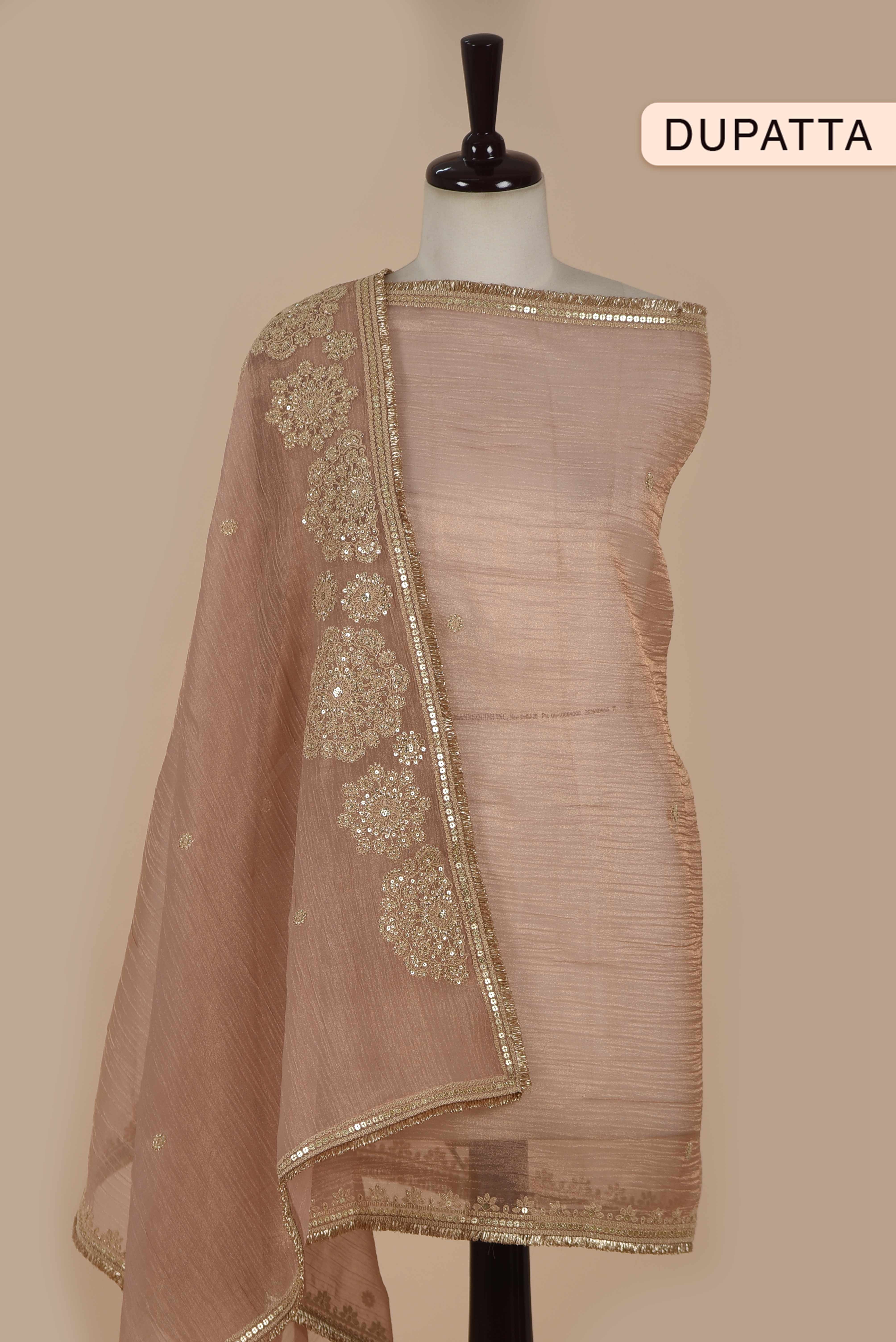 - The kurta fabric is enriched with subtle golden weaves that create a natural, luminous shimmer, while delicate zari and sequin embroidery along the neckline and hem add a touch of refined artistry. Paired with a crushed shimmer silk dupatta, beautifully highlighted with intricate zari embroidery, the ensemble radiates festive allure and luxurious depth. Perfect for formal gatherings, festive soirées, or elegant evening affairs, this set harmonizes opulent texture with traditional craftsmanship—making it a true statement of sophistication.