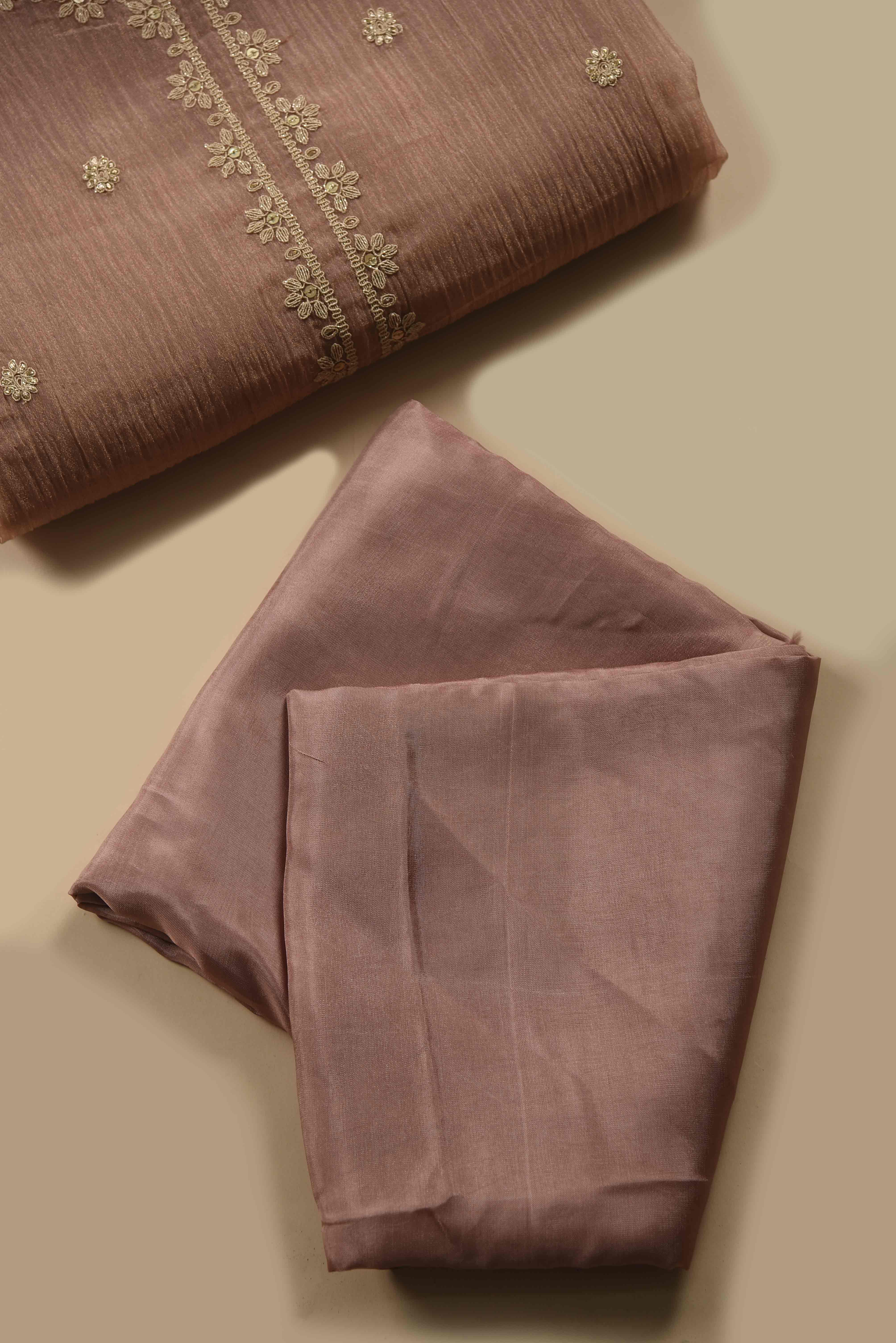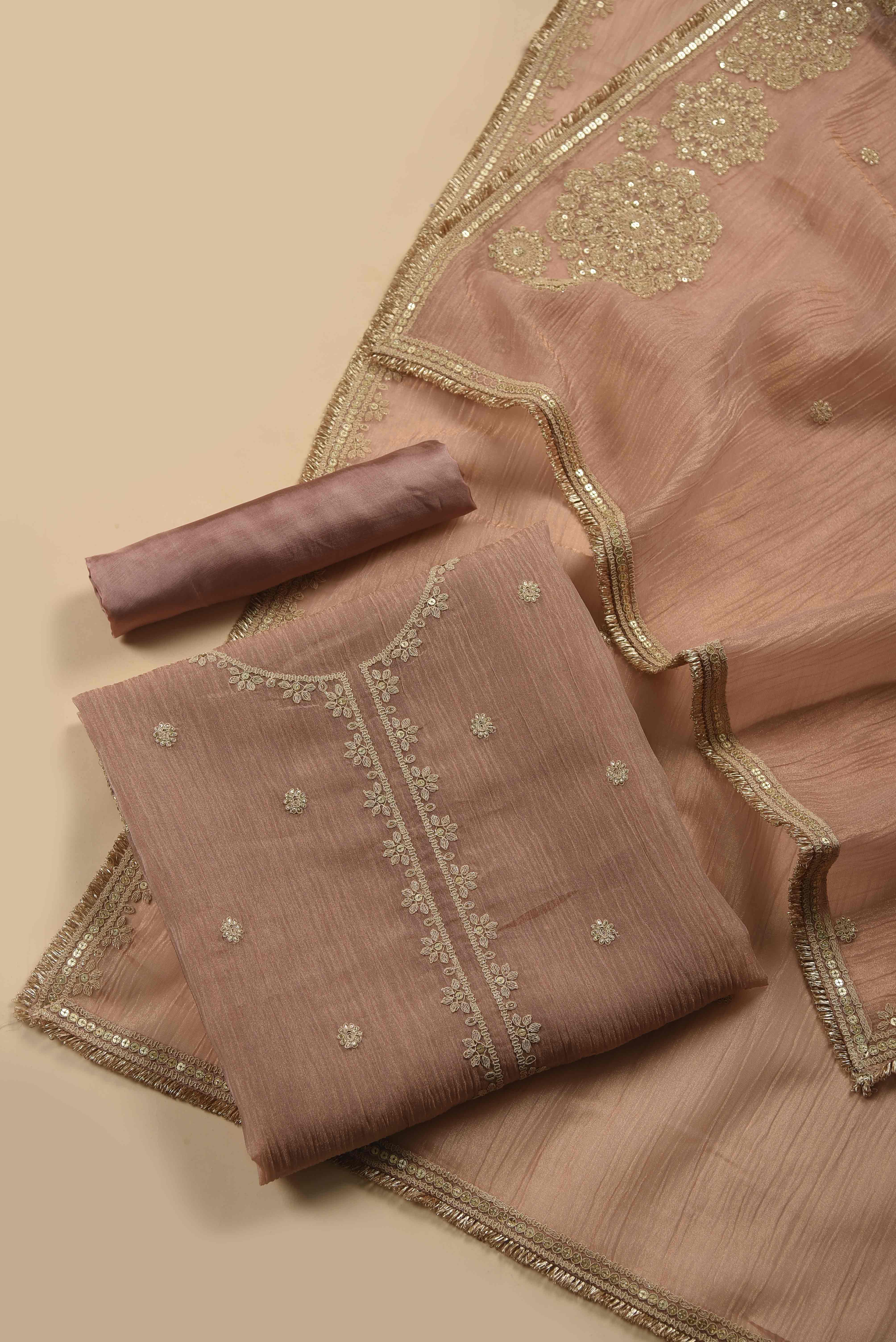 - Pink Crushed Silk Viscose Embroidered Unstitched Suit Fabric Set with Shimmer Silk Dupatta Drape yourself in understated elegance with our Pink Crushed Silk Viscose Unstitched Suit Fabric Set, crafted to exude grace and timeless charm.