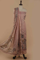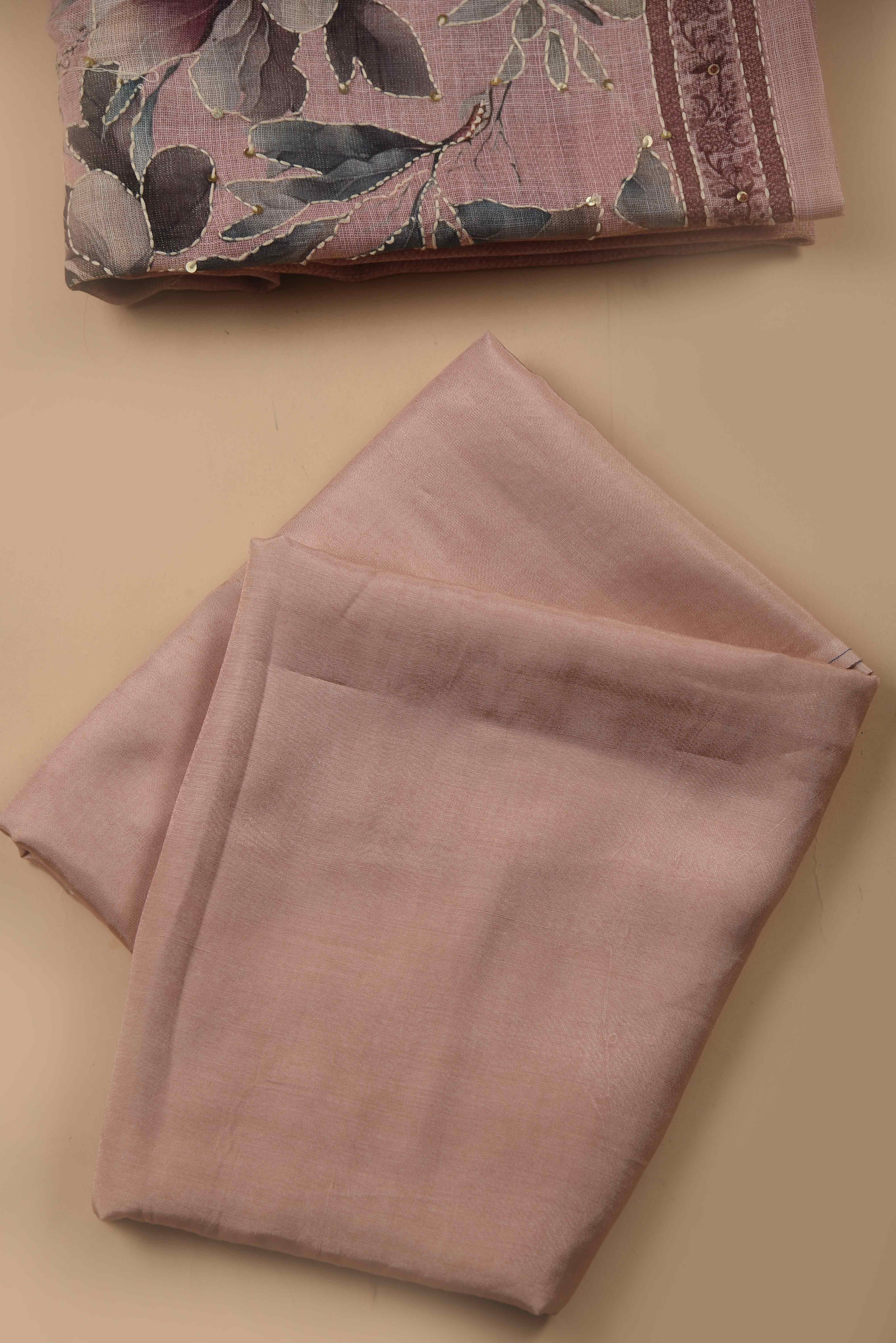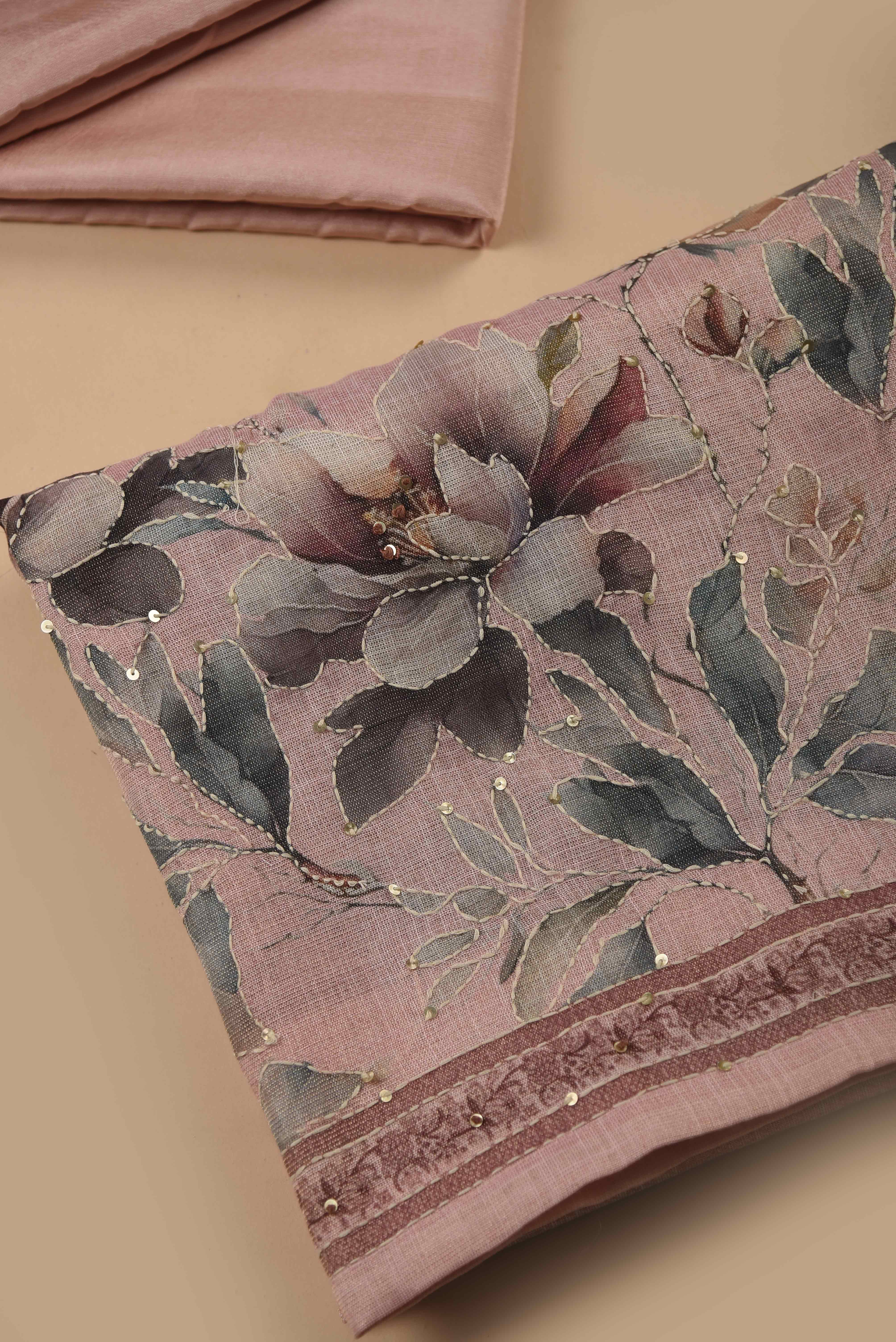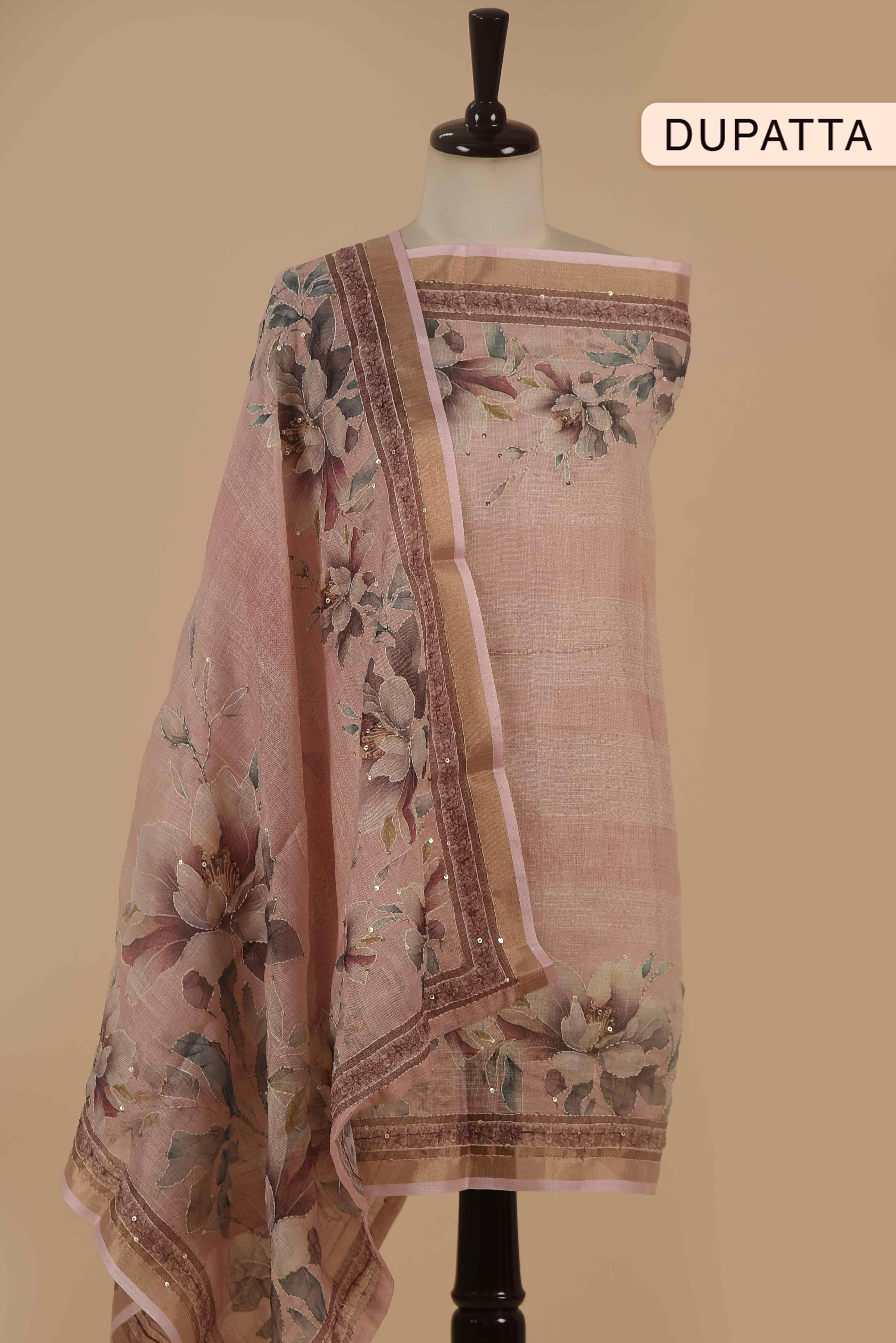 Pink Linen Printed With Embroidered Unstitched Suit Fabric Set With Linen Embroidered Dupatta