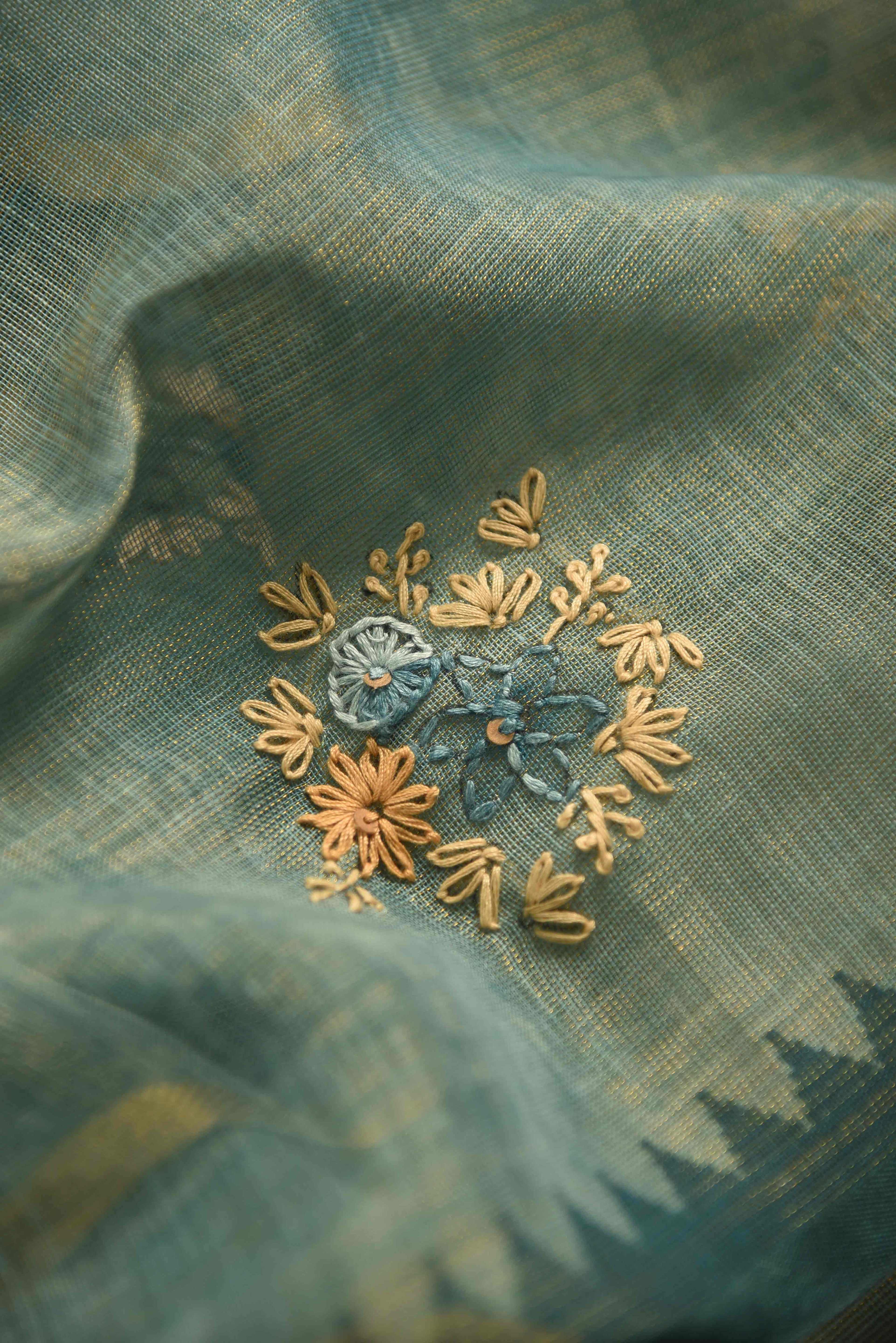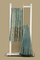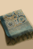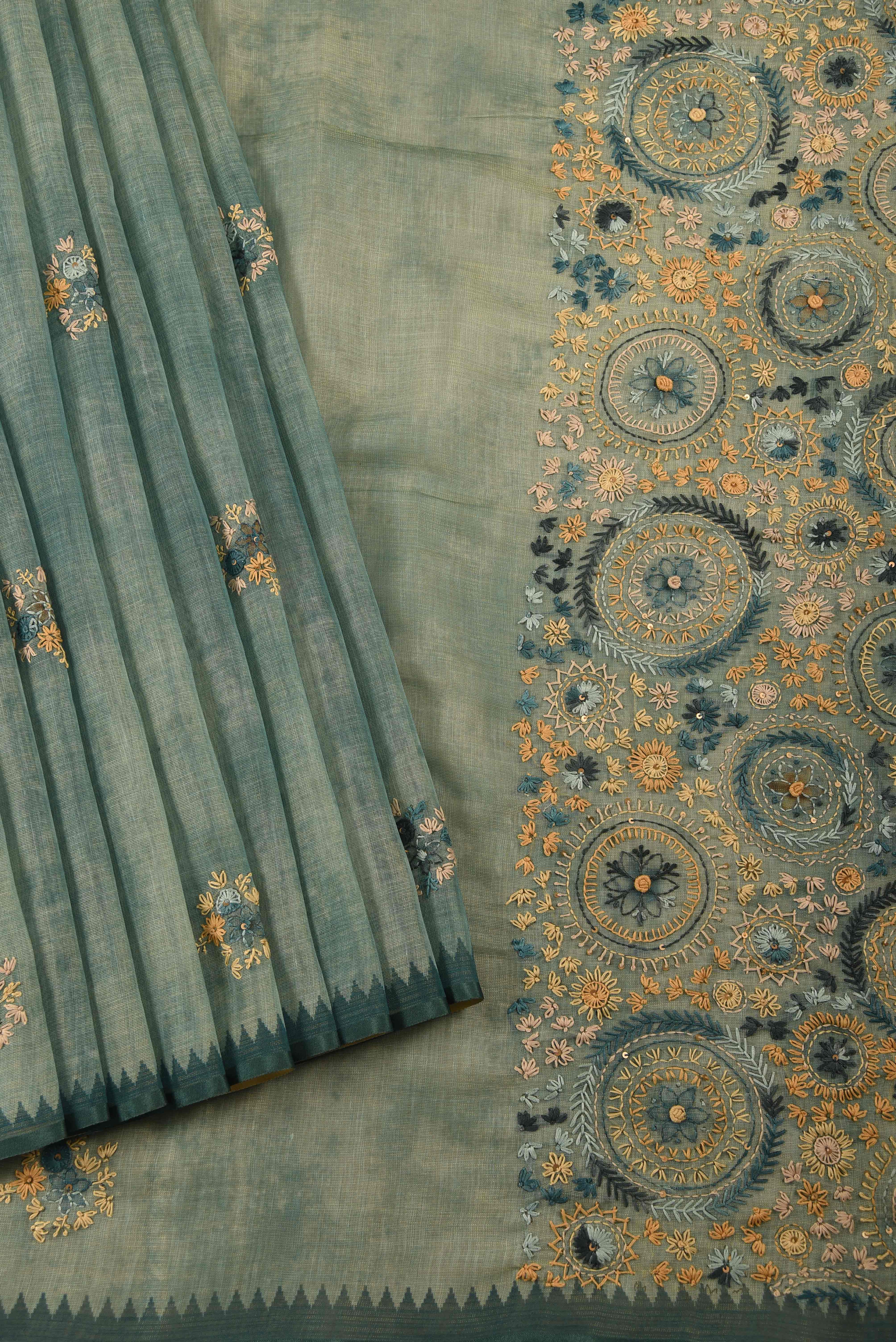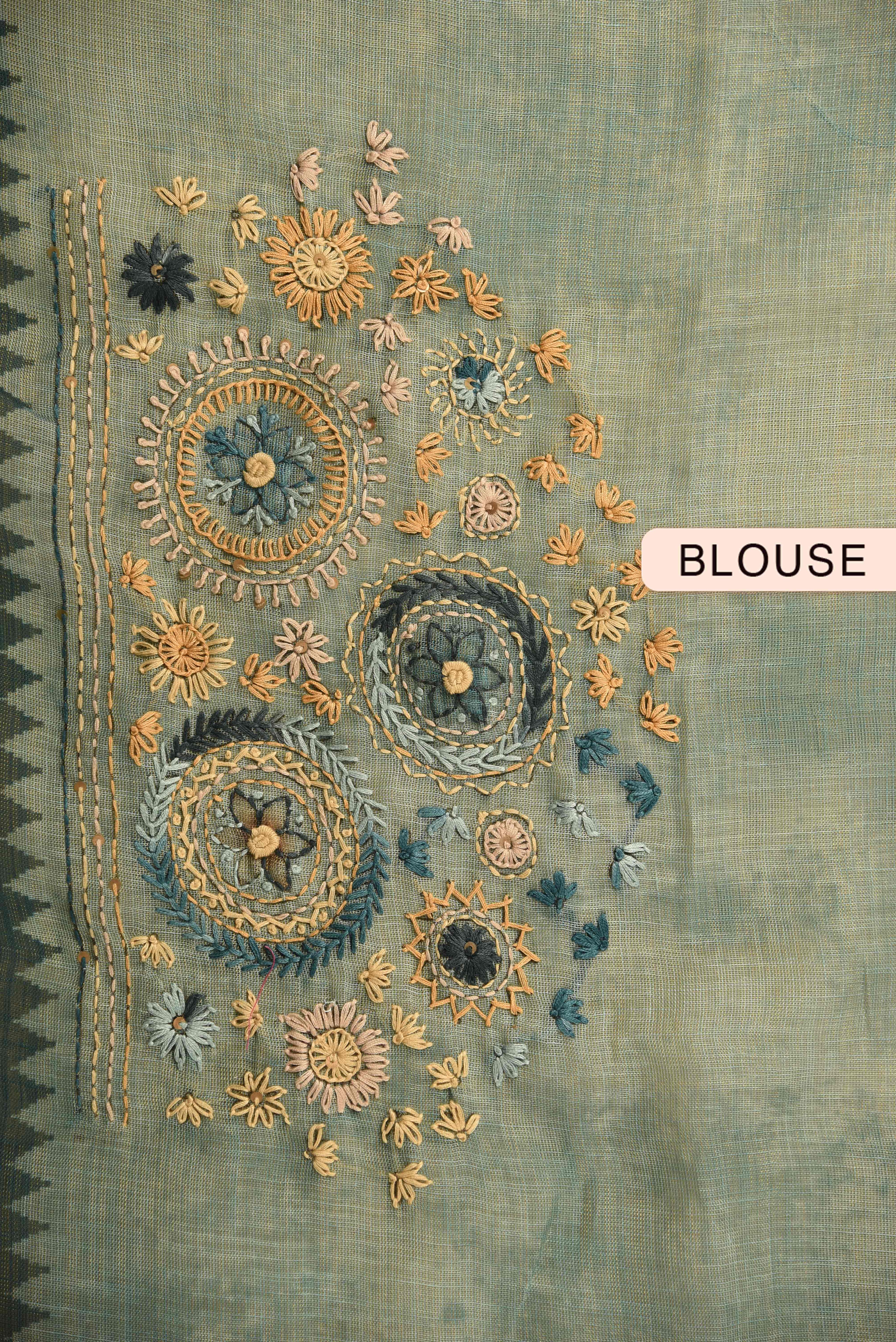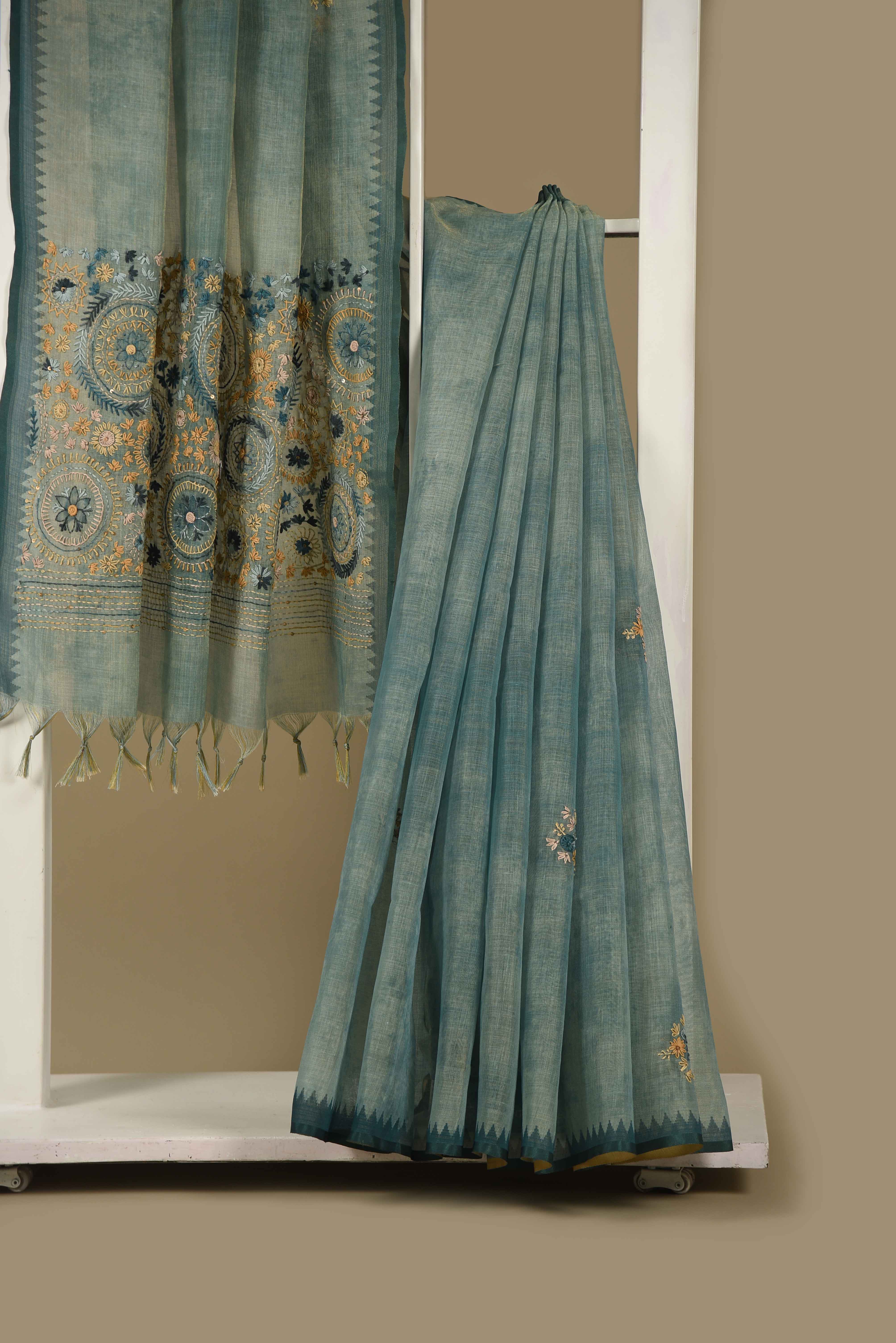 Sea Green Linen Blend Embroidered Saree with Matching Blouse