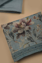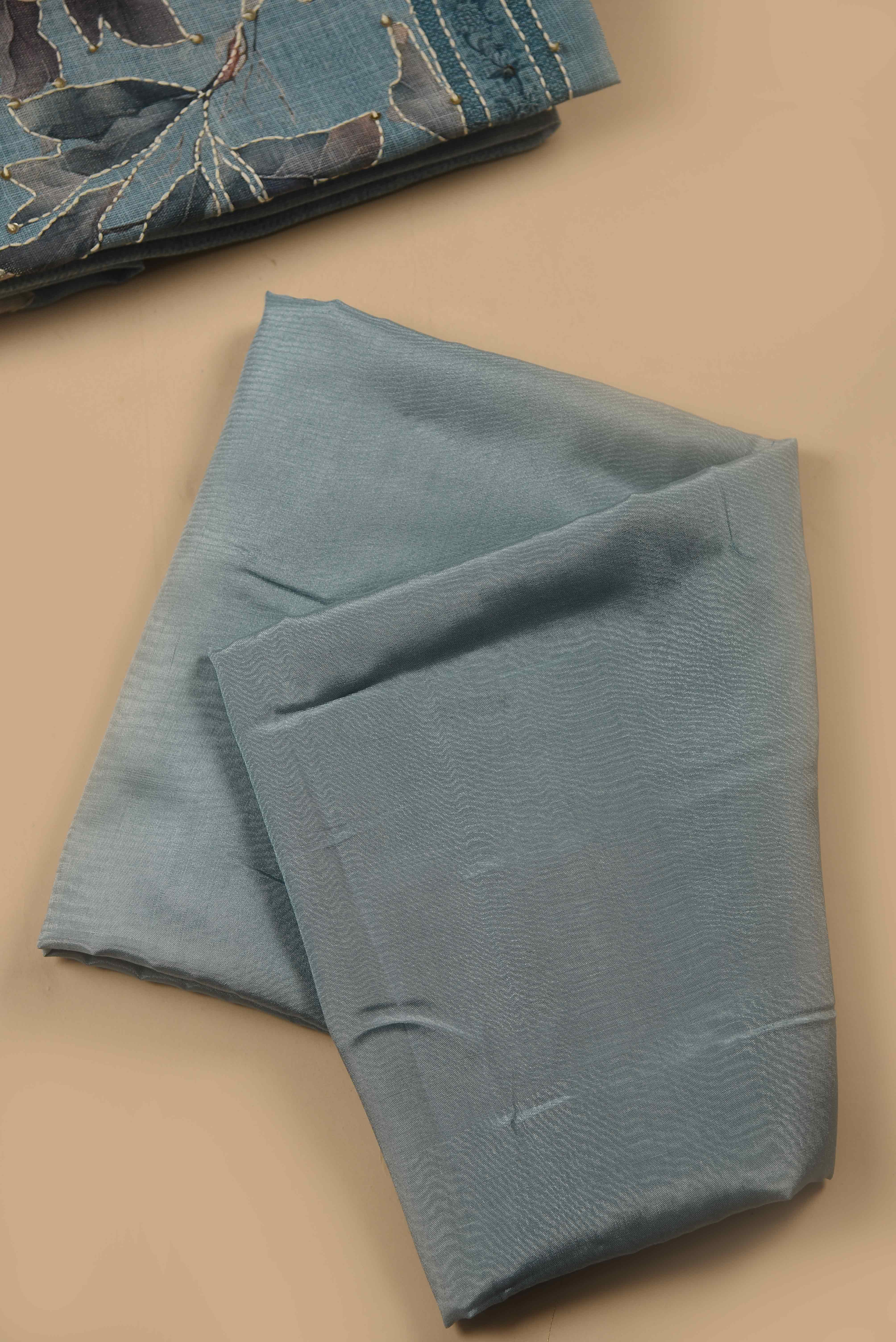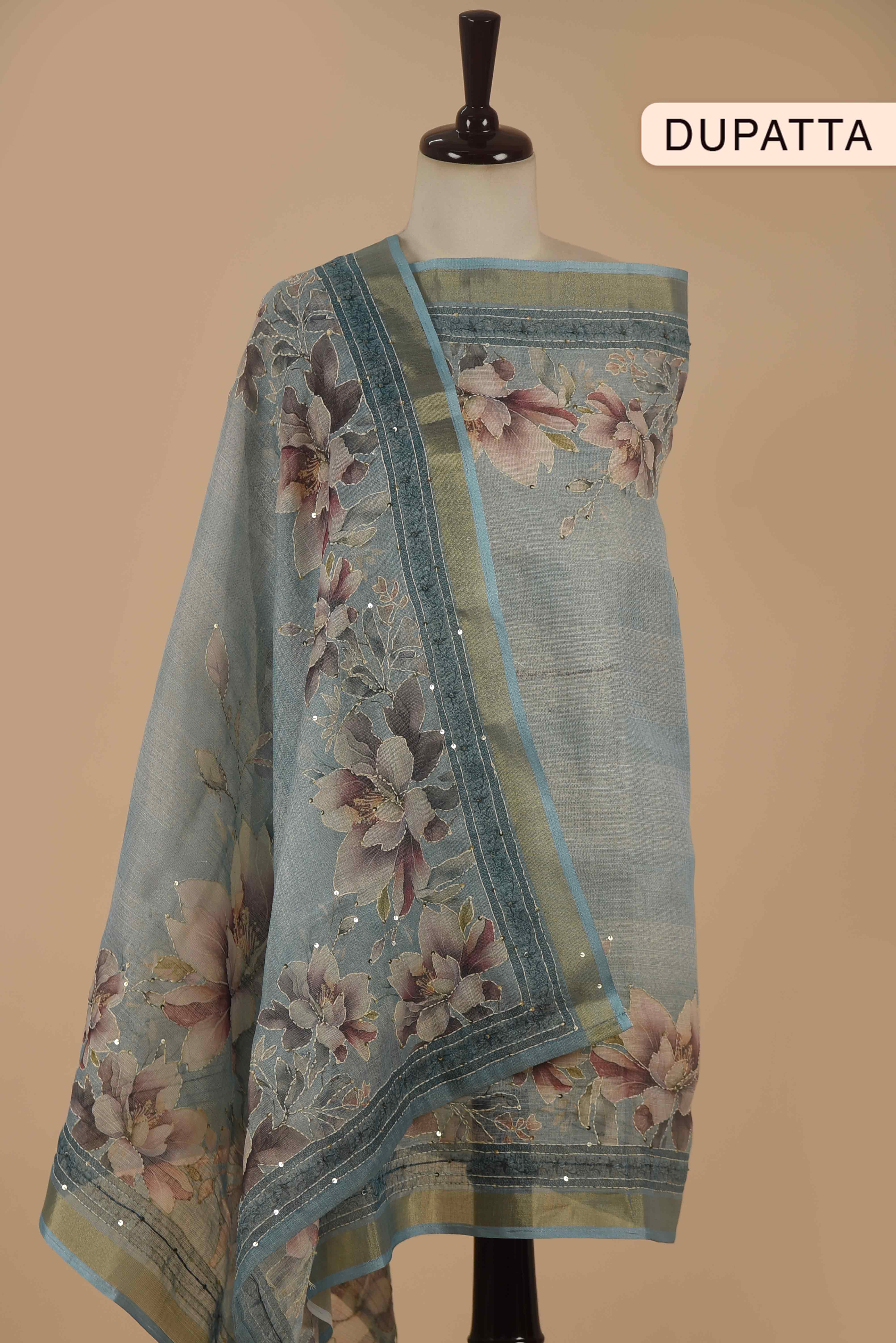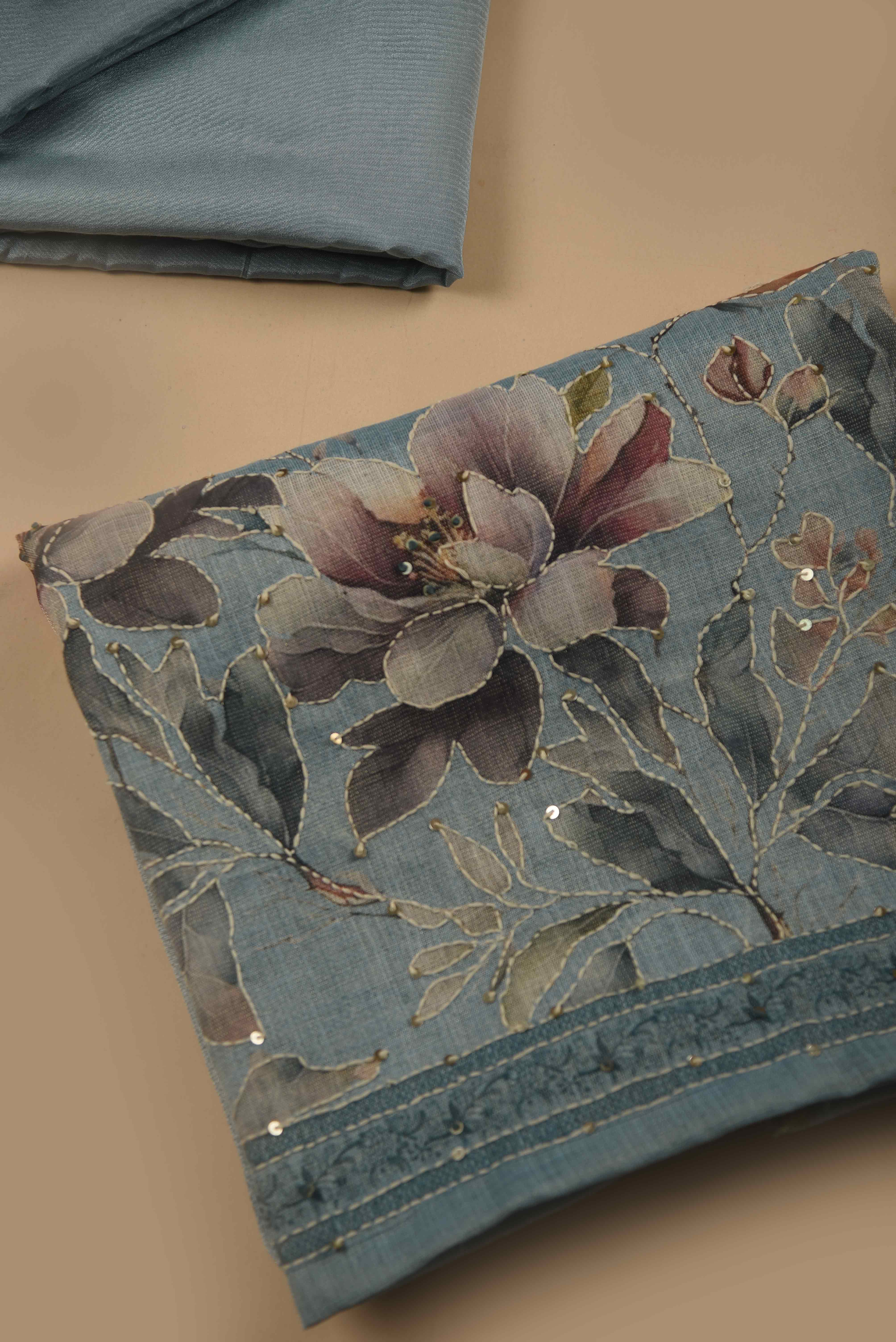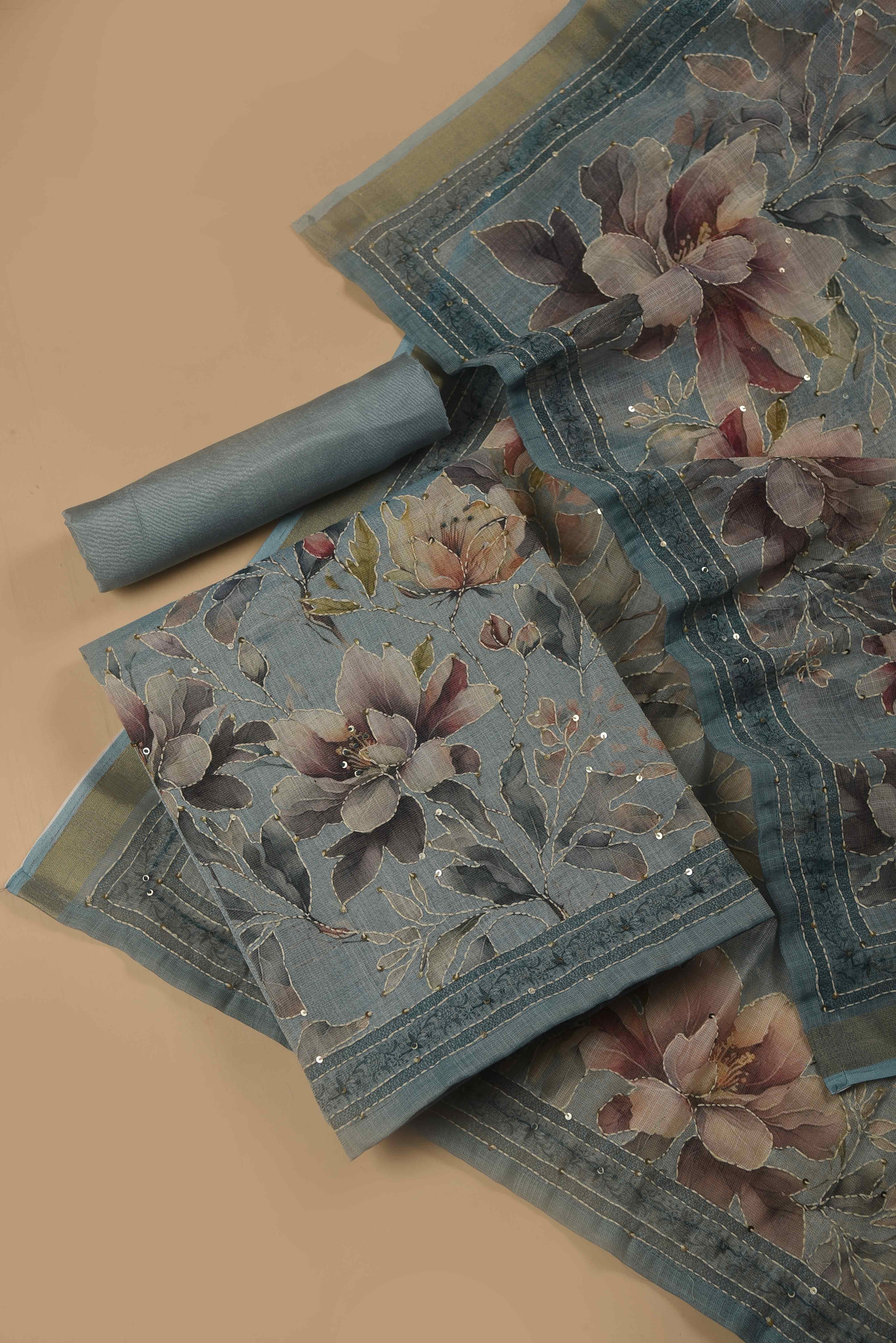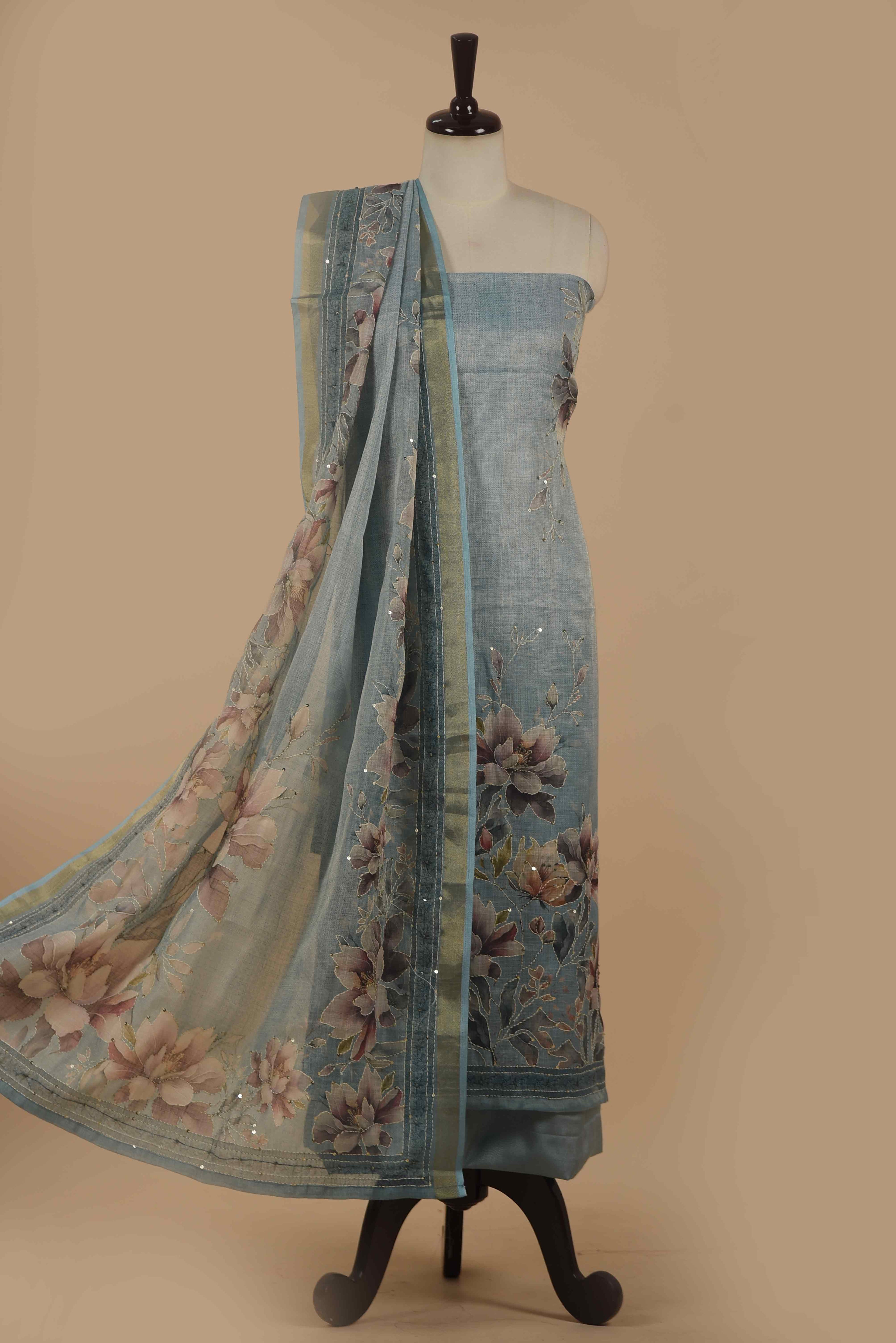 Sky Blue Linen Printed With Embroidered Unstitched Suit Fabric Set With Linen Embroidered Dupatta