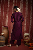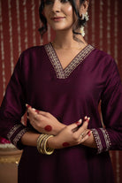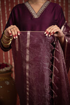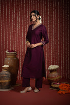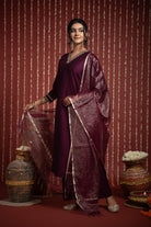Wine Cotton Silk Bordered V-Neck Zari Work Kurta Set Regular Fit