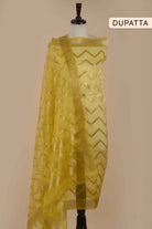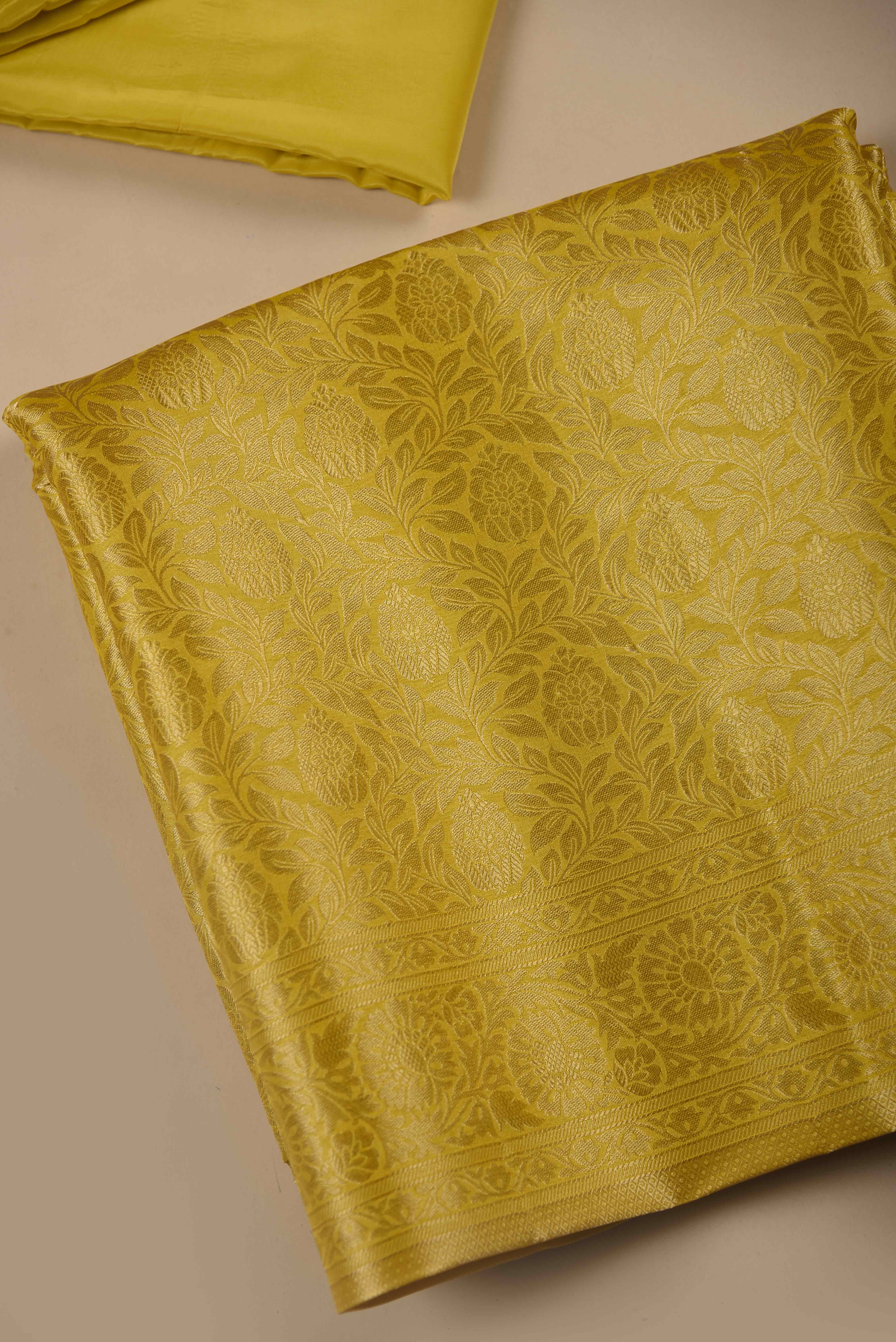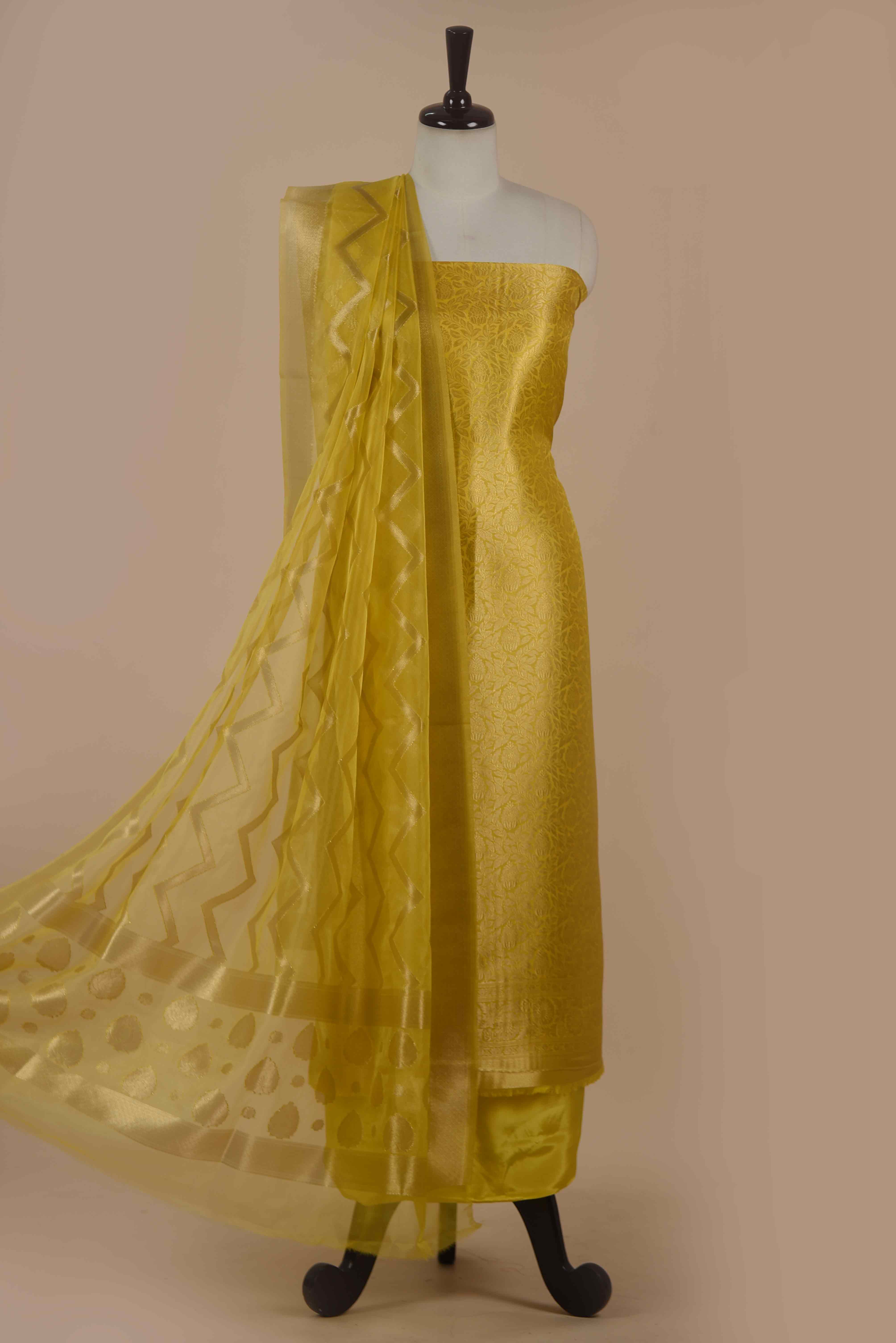 - Yellow Fine Banarasi Silk Woven Unstitched Suit Fabric Set with Organza Woven Dupatta This exquisite Banarasi silk unstitched suit fabric set is a true collector’s delight.