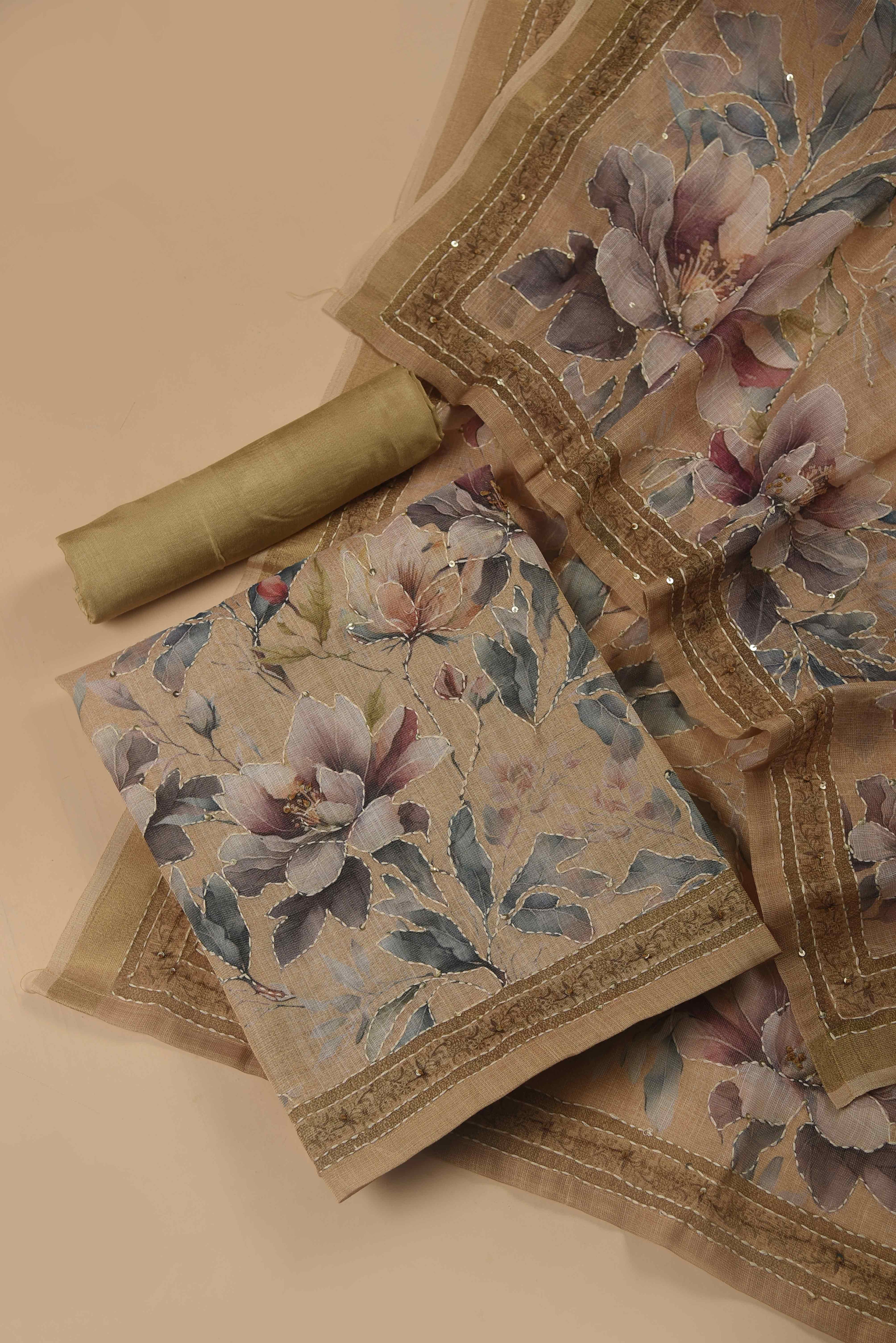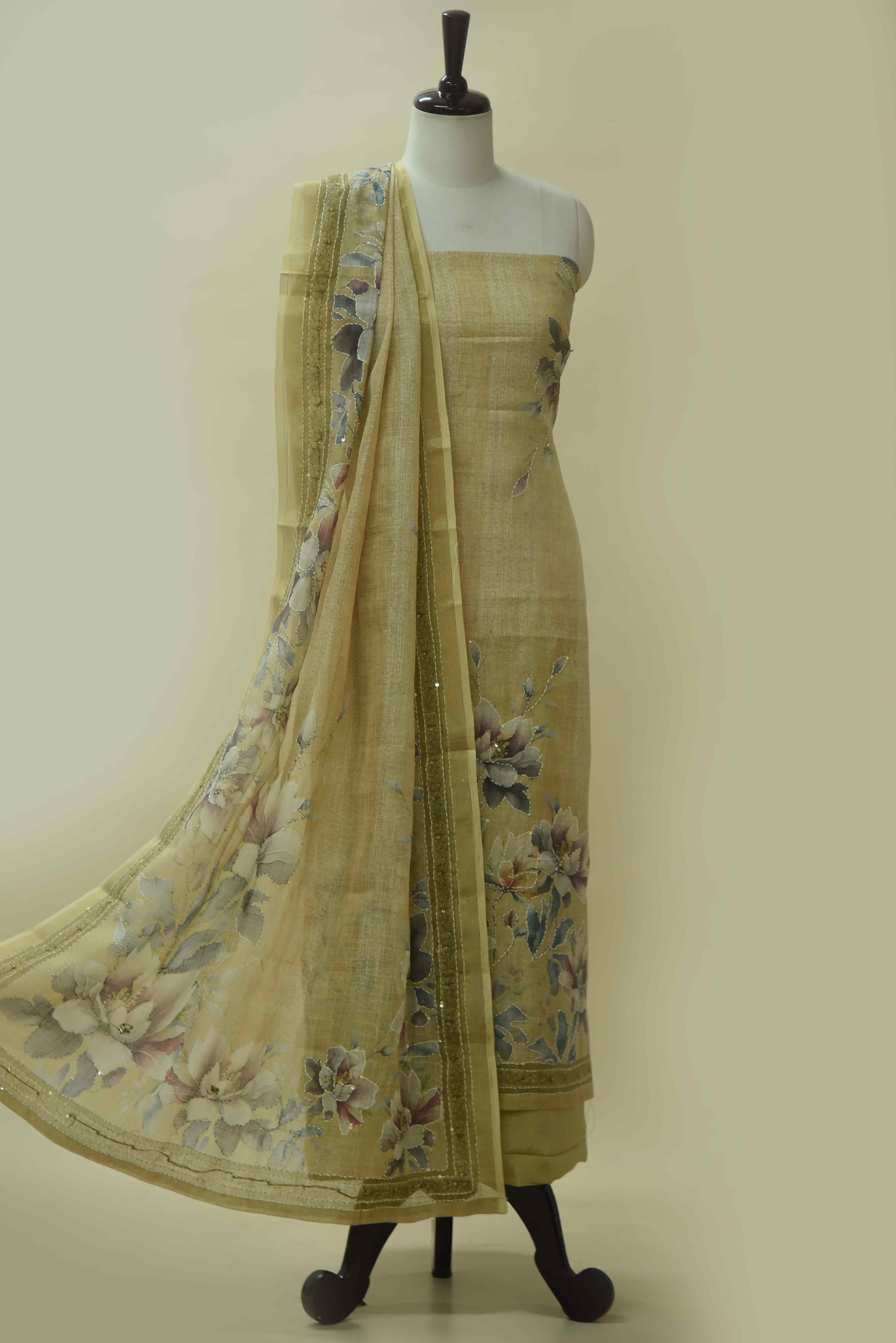 Yellow Linen Printed With Embroidered Unstitched Suit Fabric Set With Linen Embroidered Dupatta