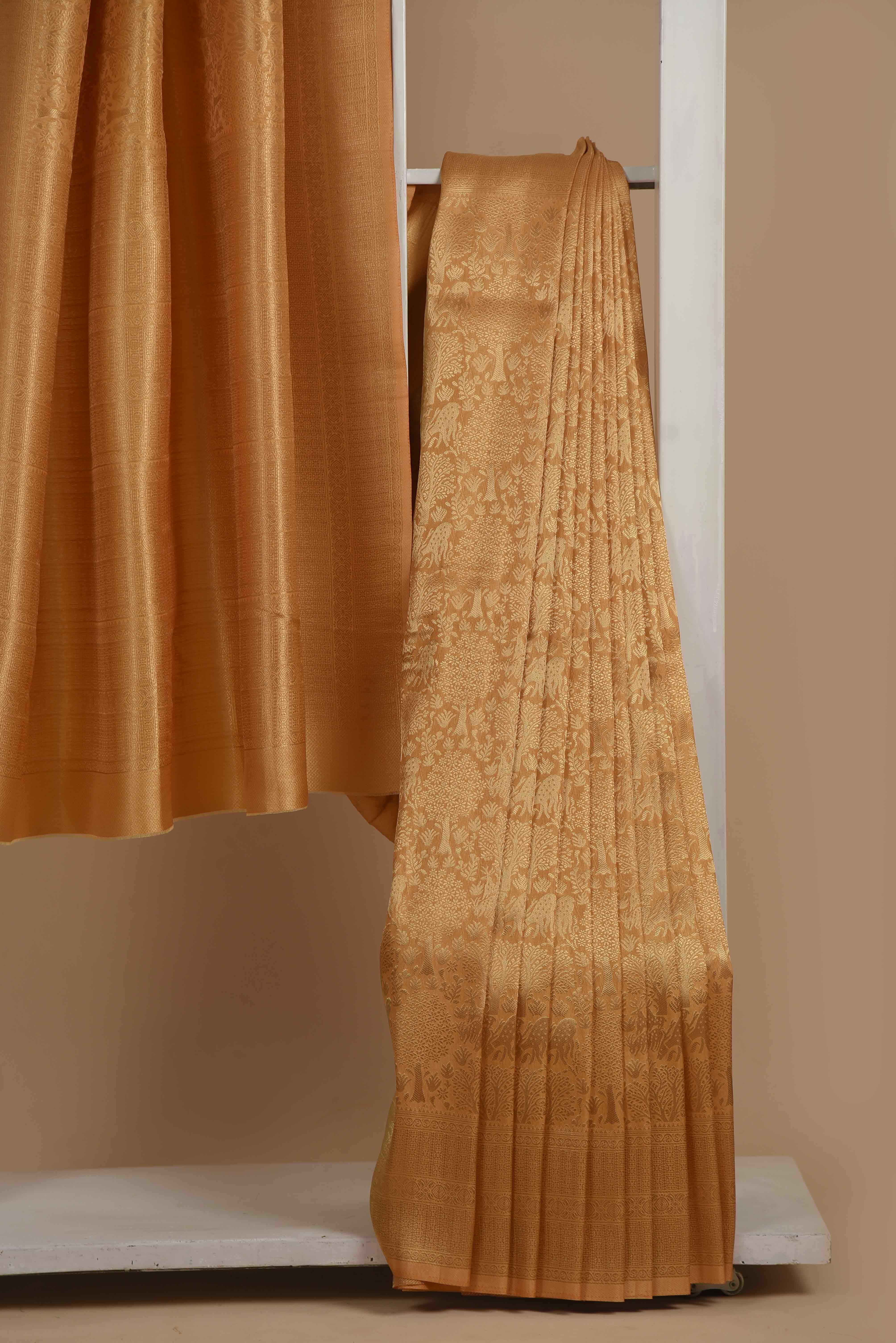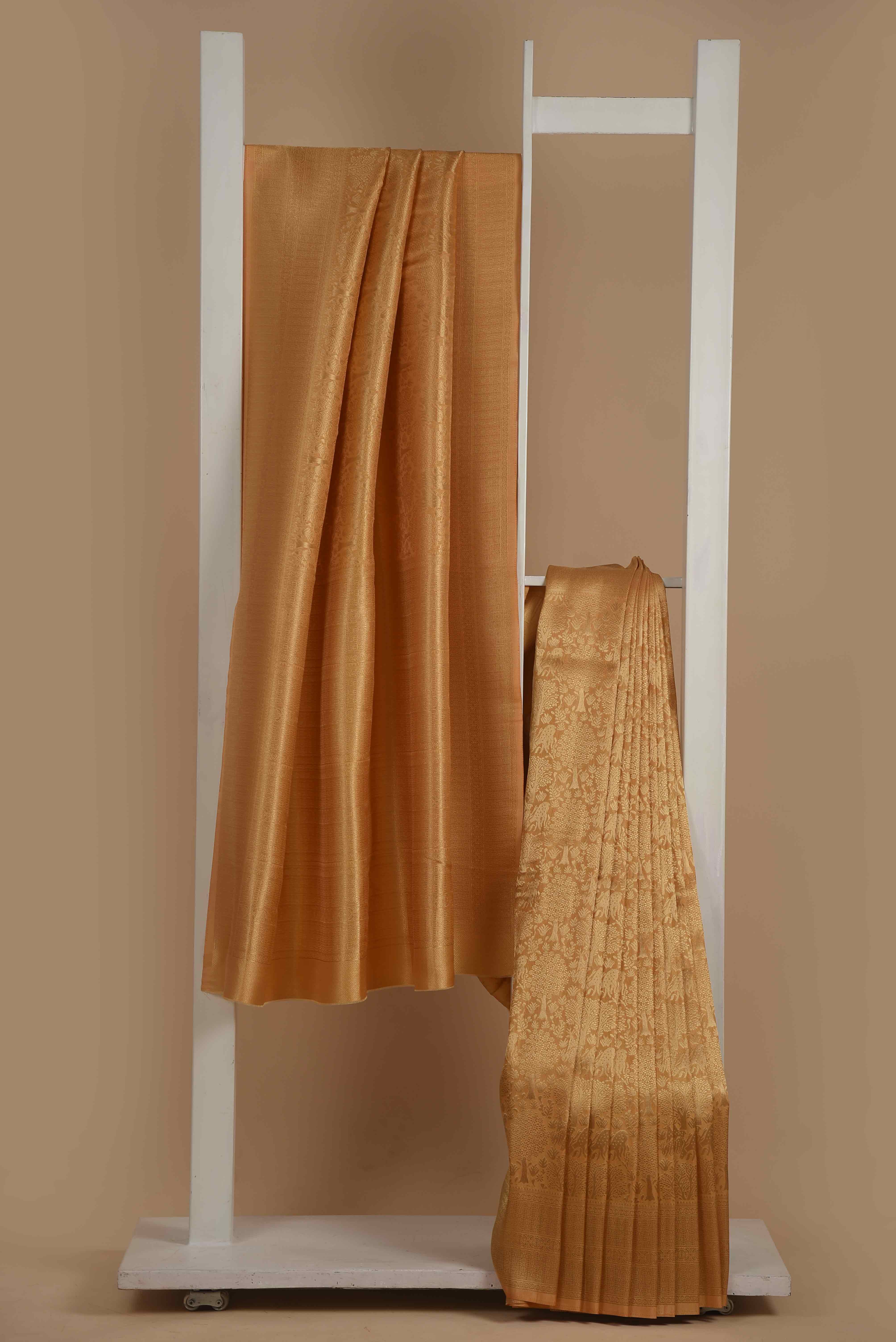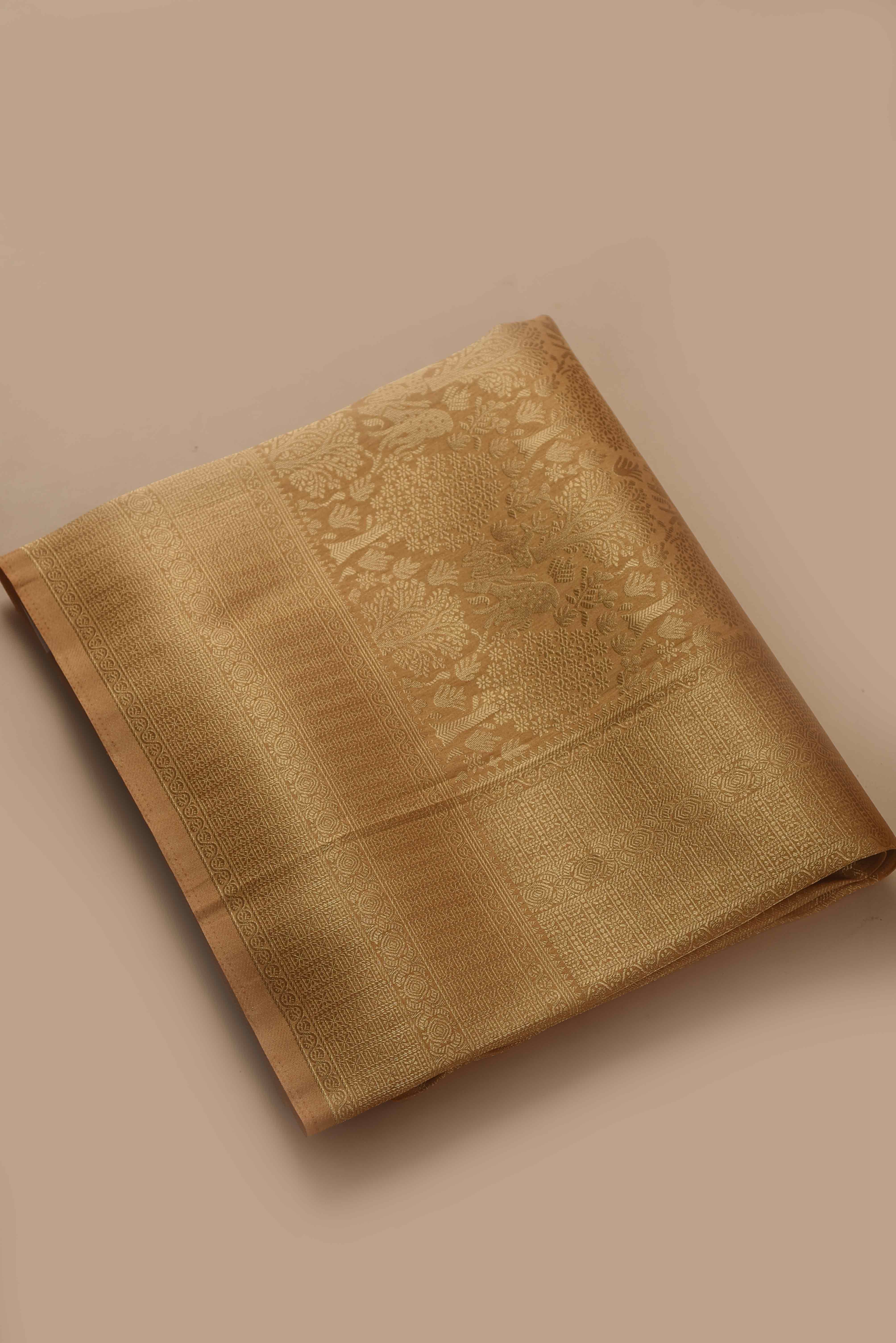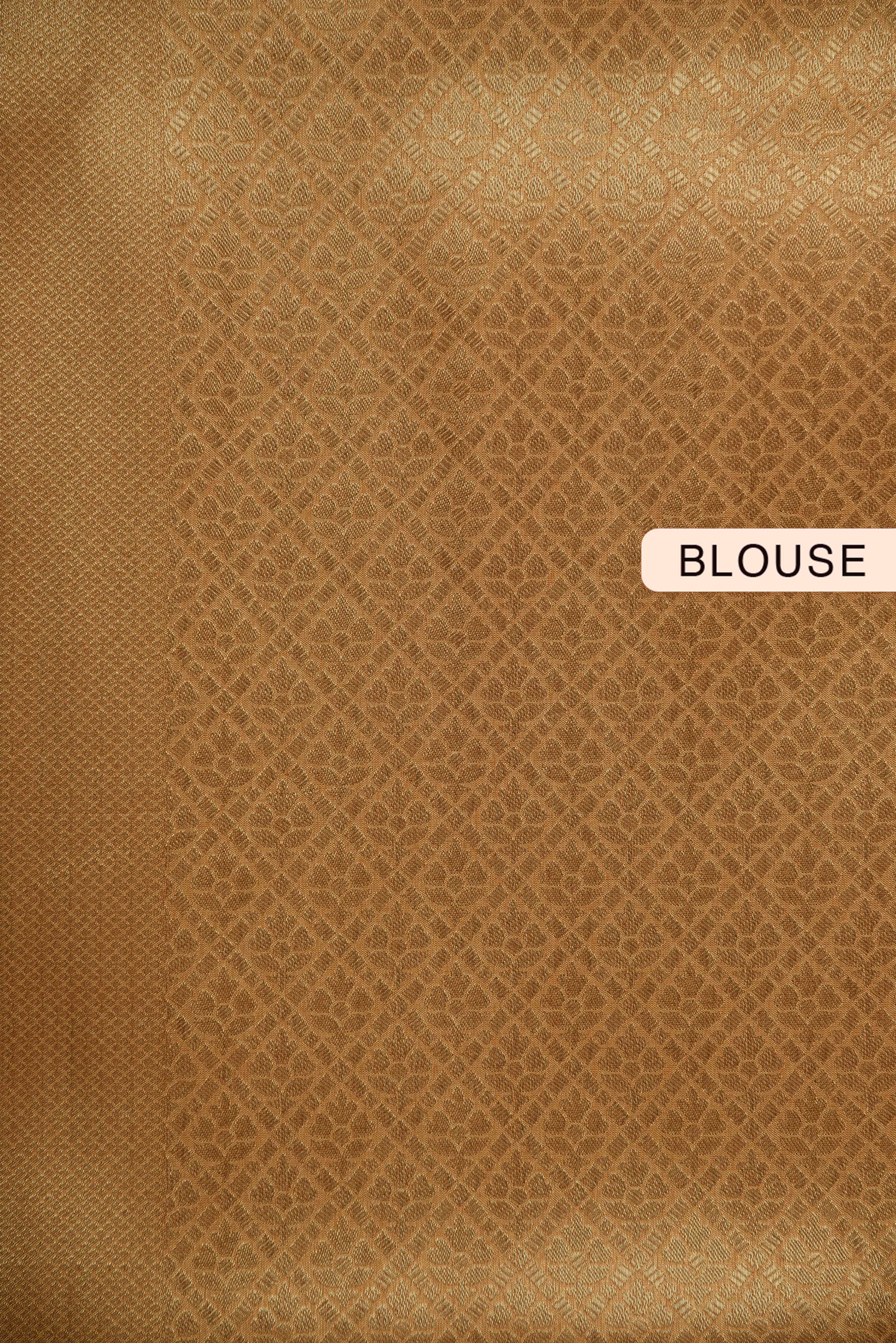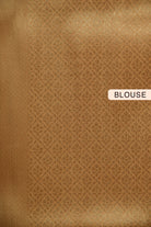 - The ensemble is completed with a matching silk blouse, finished with a golden woven border, offering endless possibilities for bespoke styling.